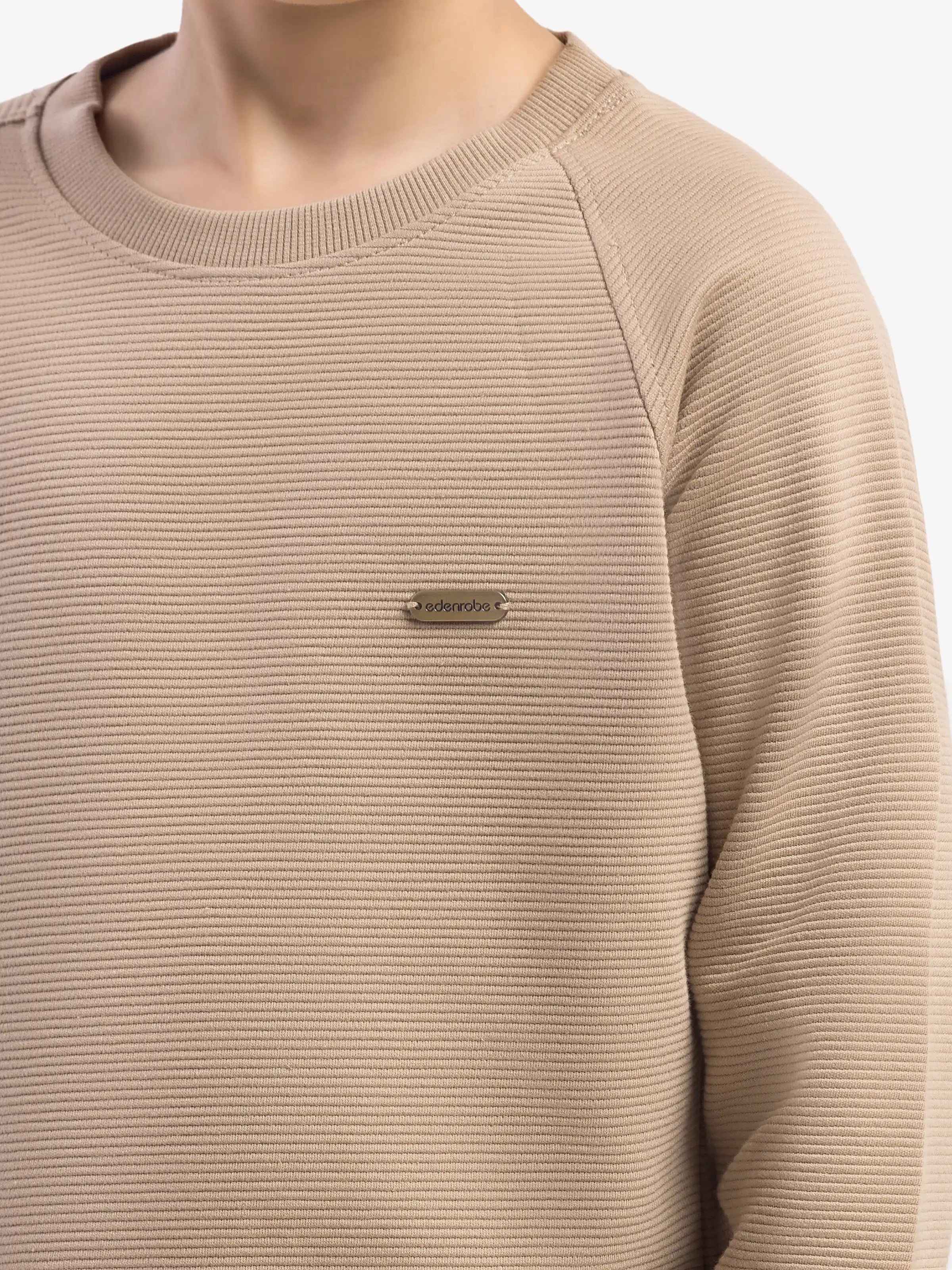 - Style: Textured Fabric Sweatshirt with Metal Label on Front