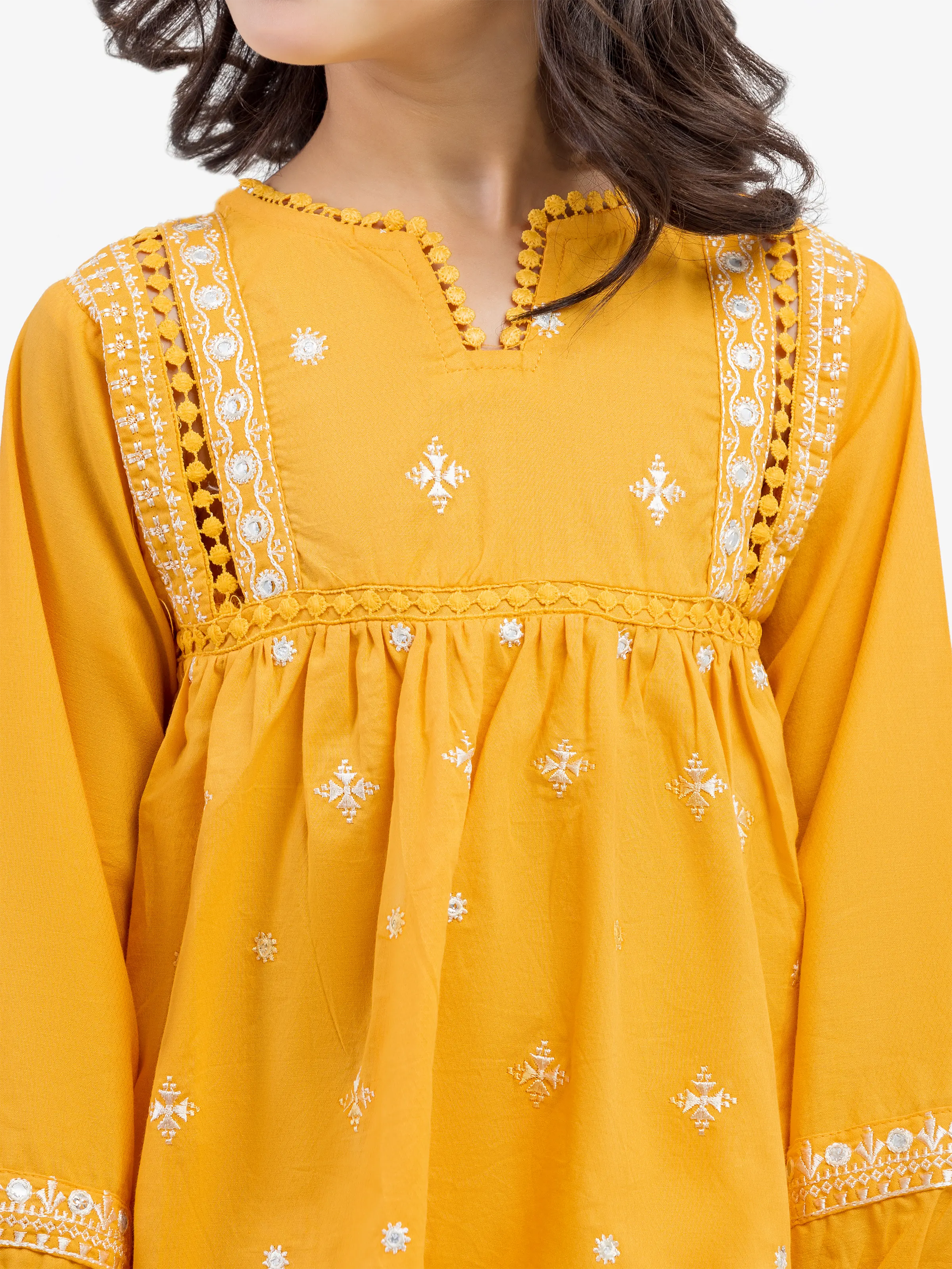 - Style: Embroidered Short Length Frock with Lace Work on Front & Rib on Sleeves