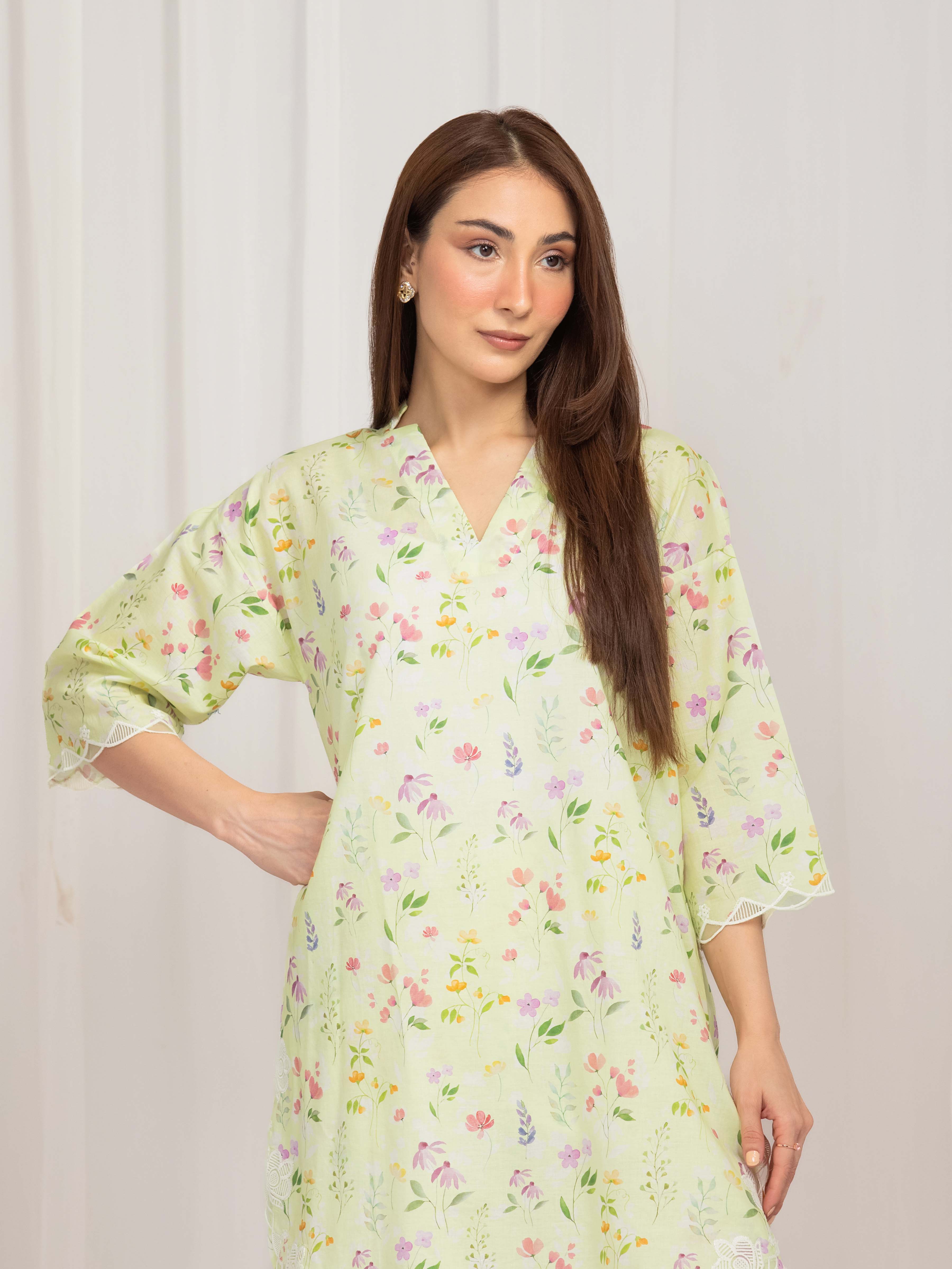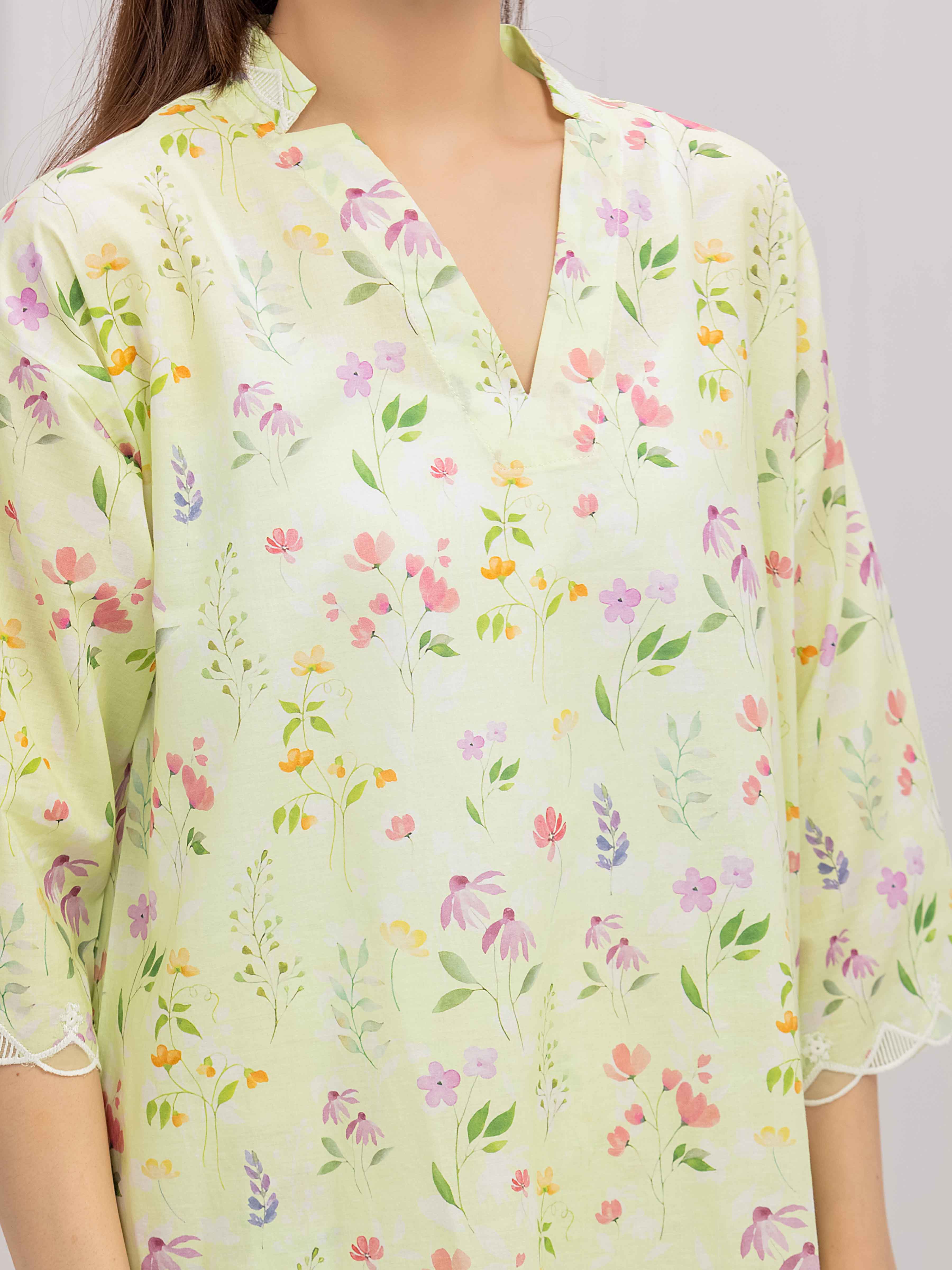 - Style: Floral Printed Short Length Kurti with Lace on Sleeves & Daman