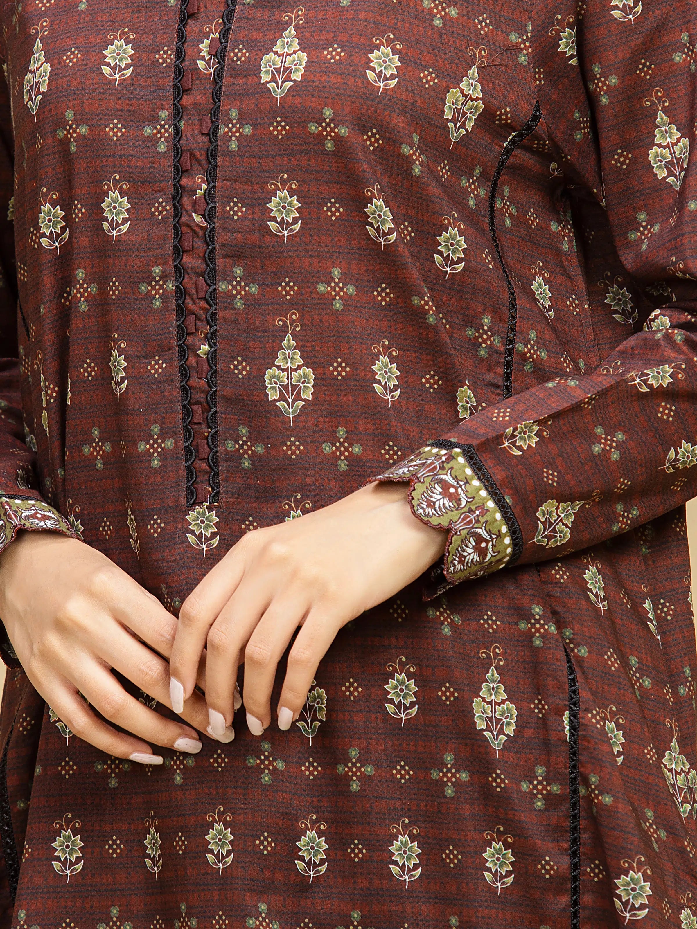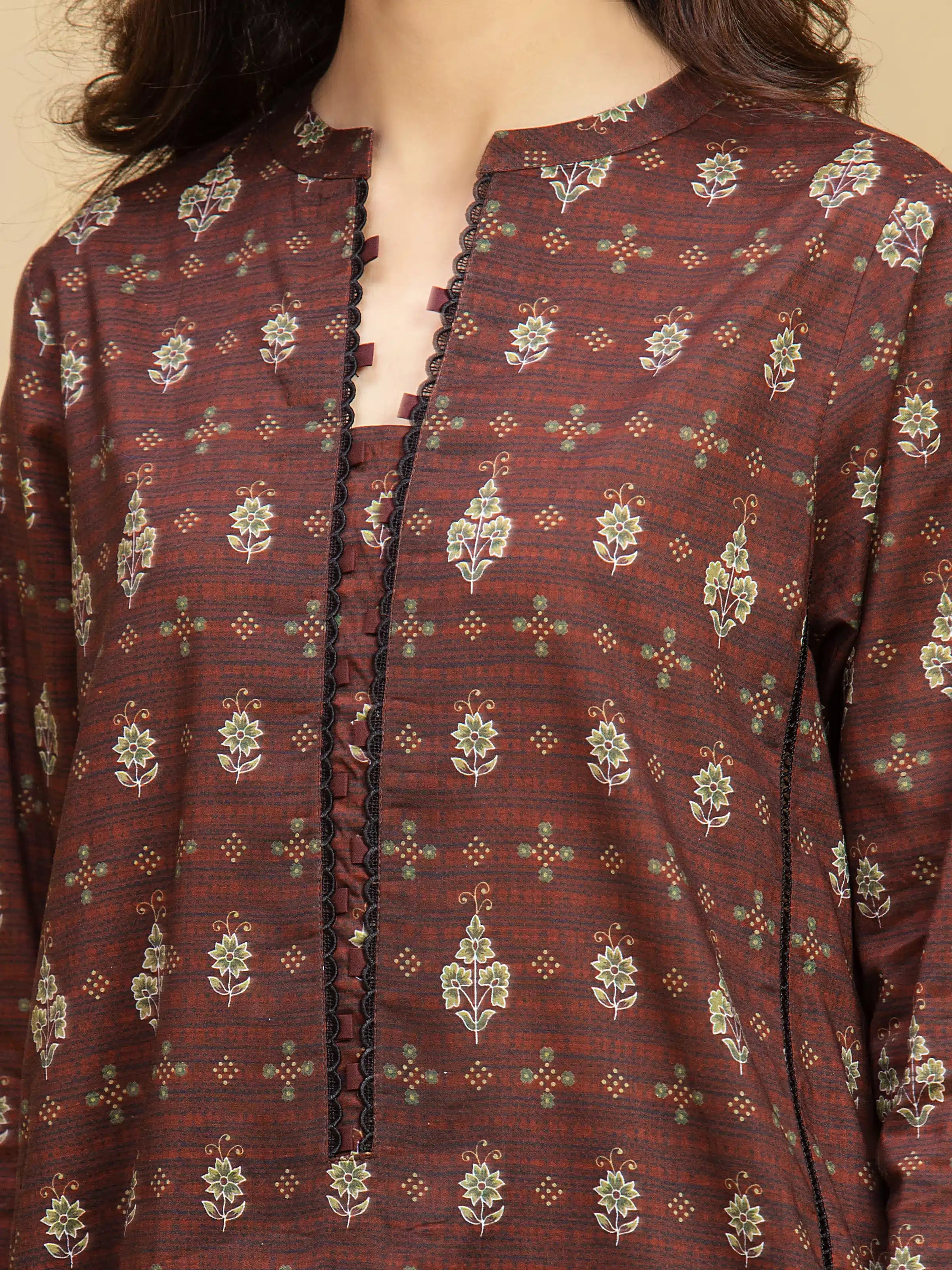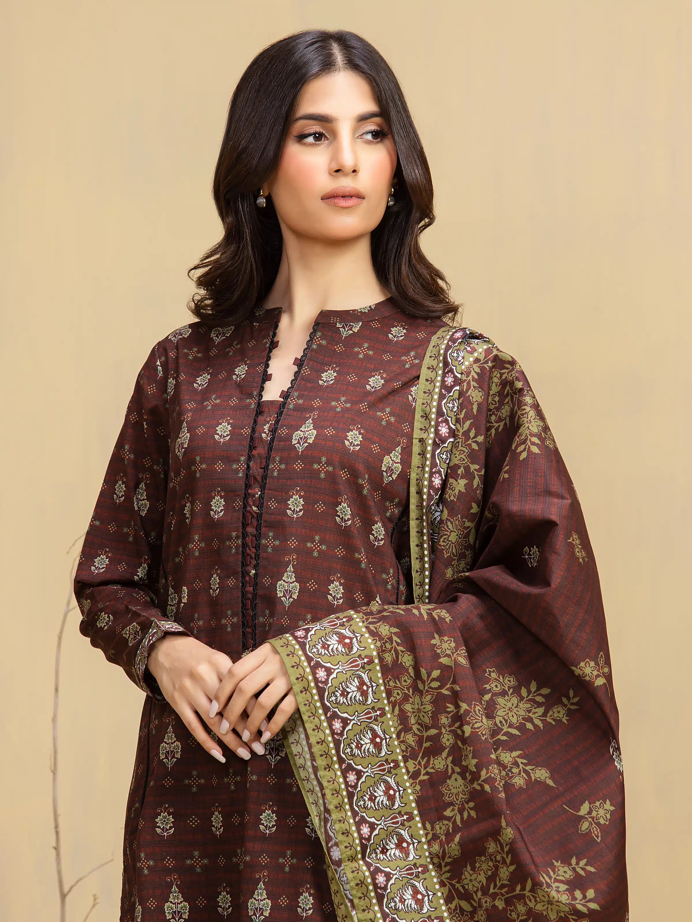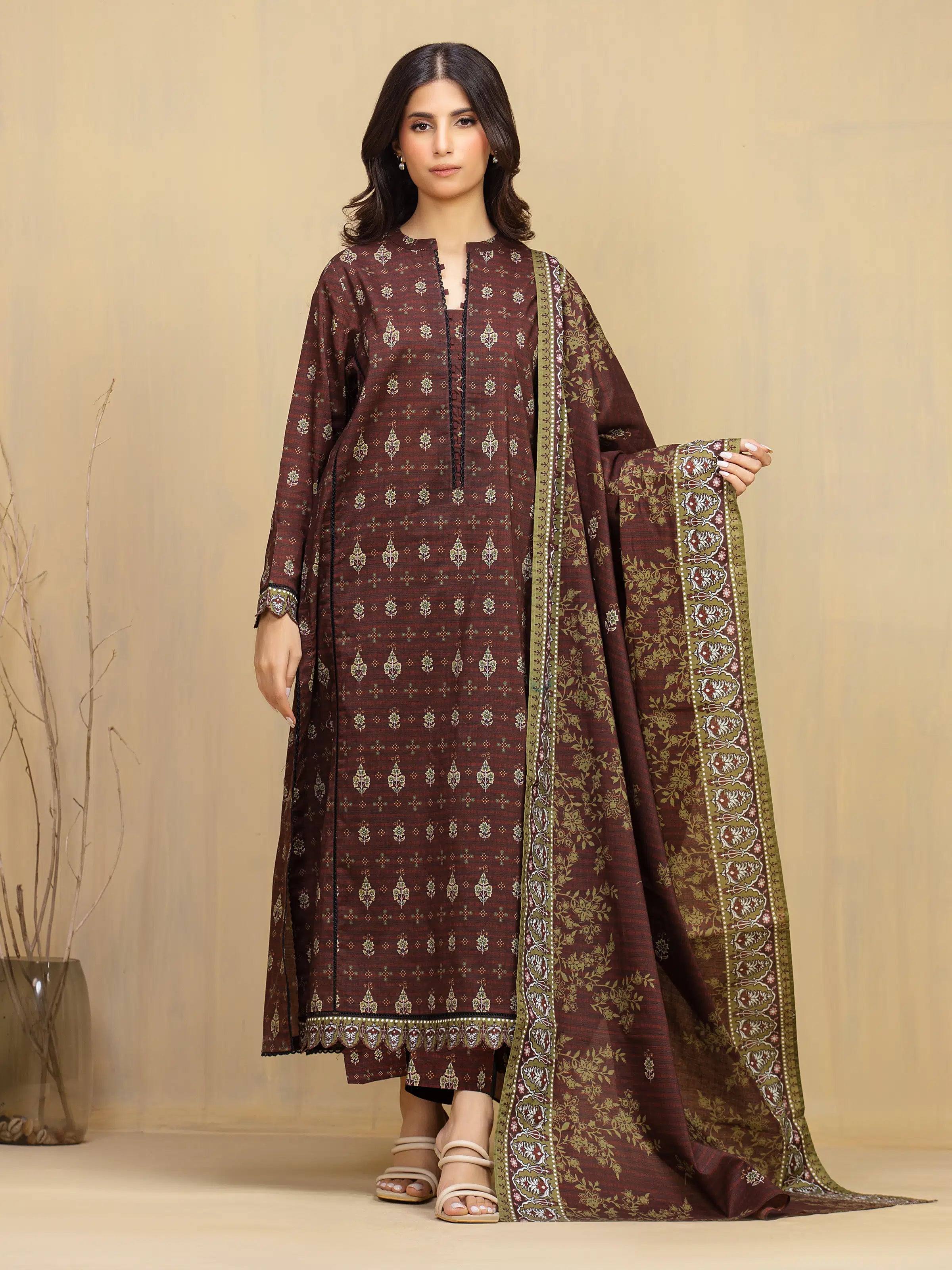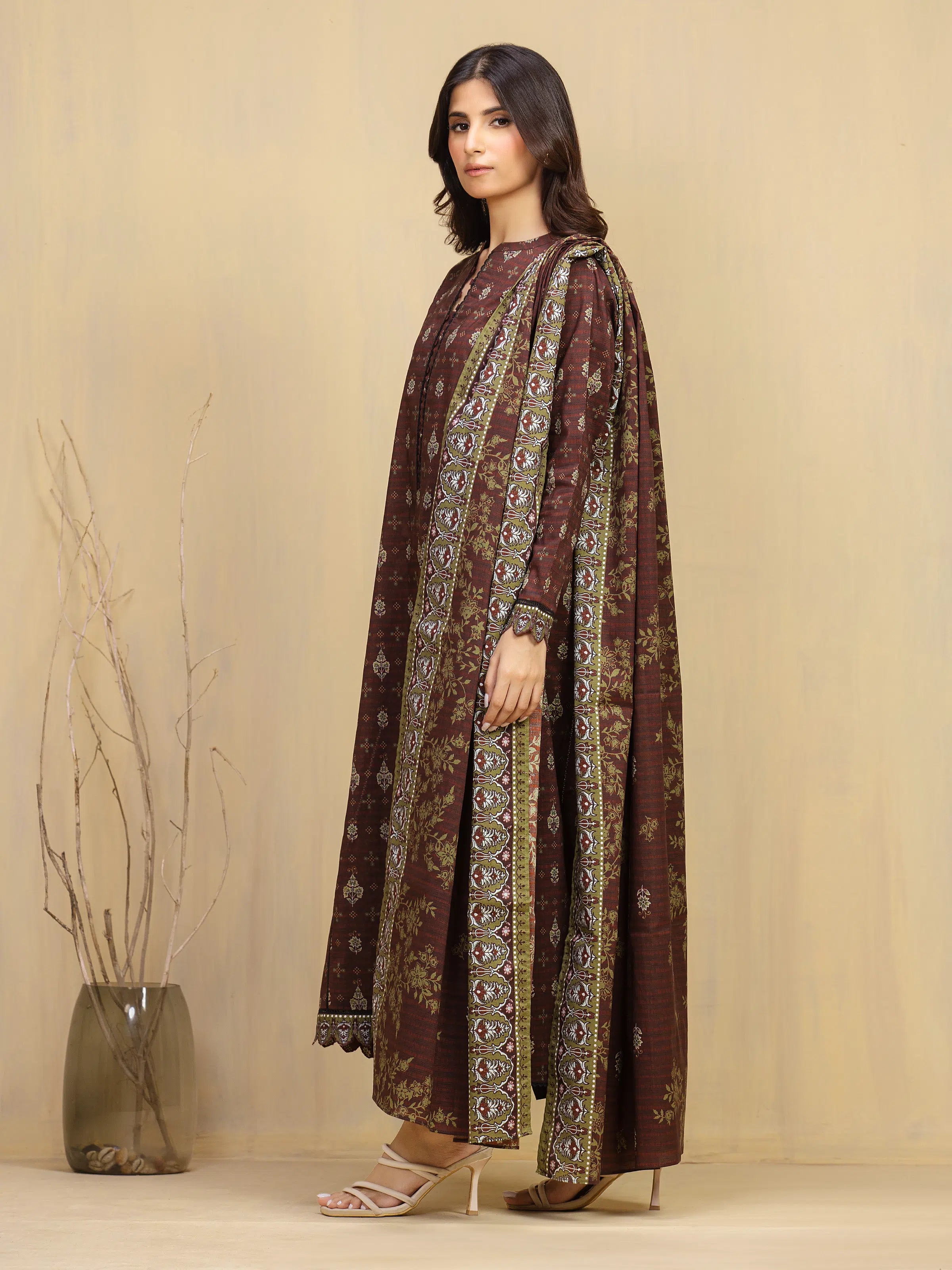 Unstitched Dark Brown Printed Khaddar 3 Piece