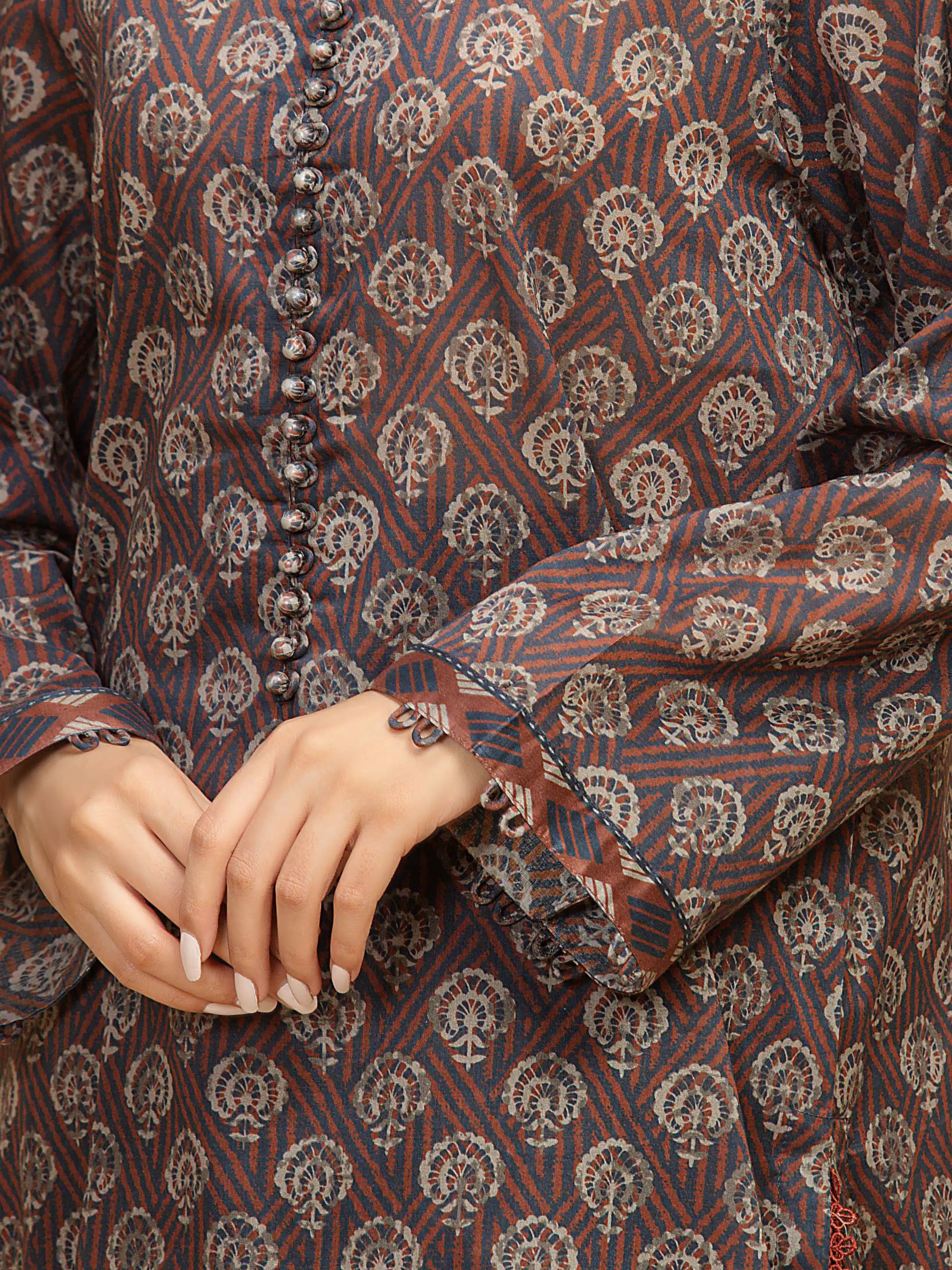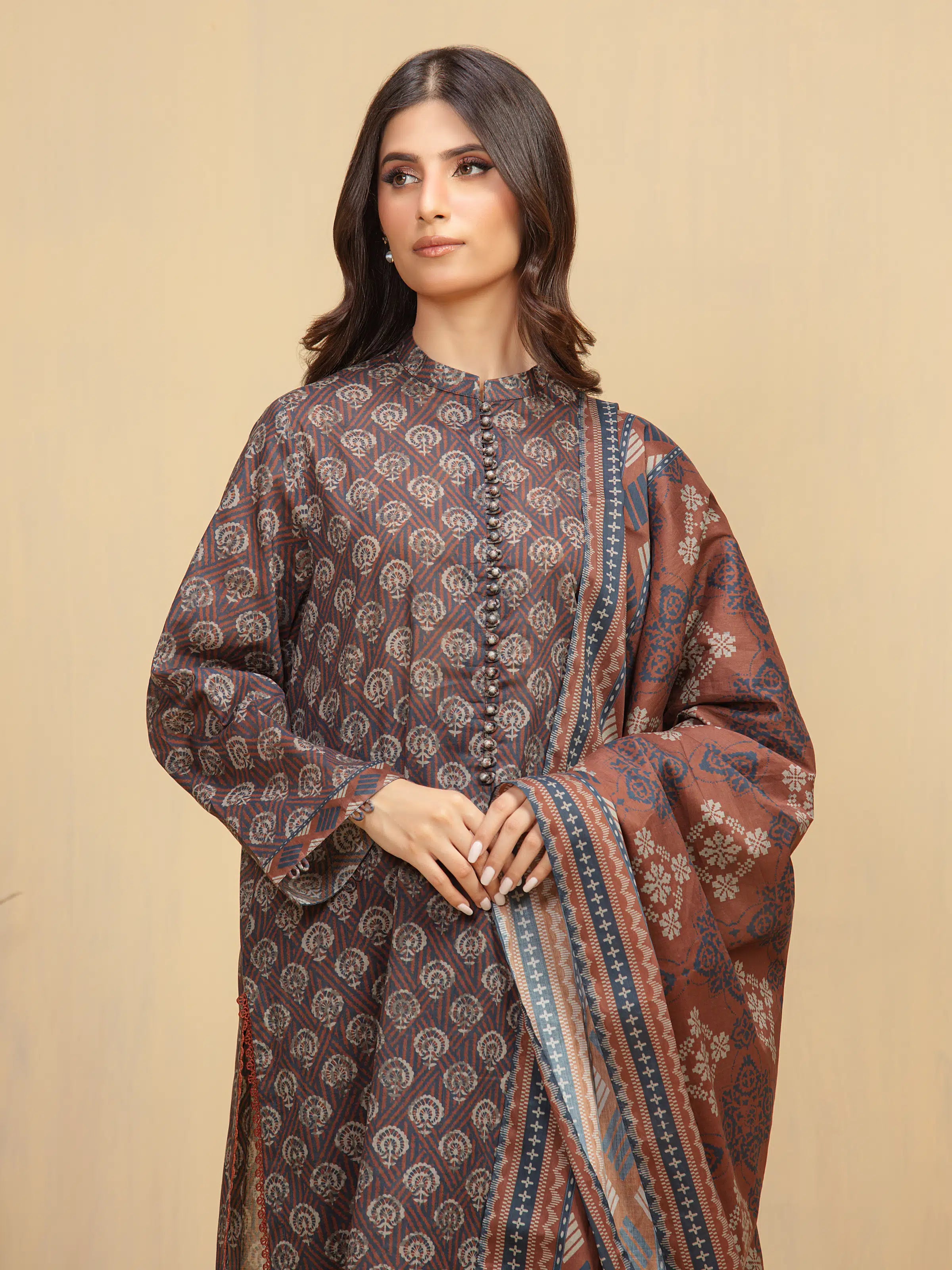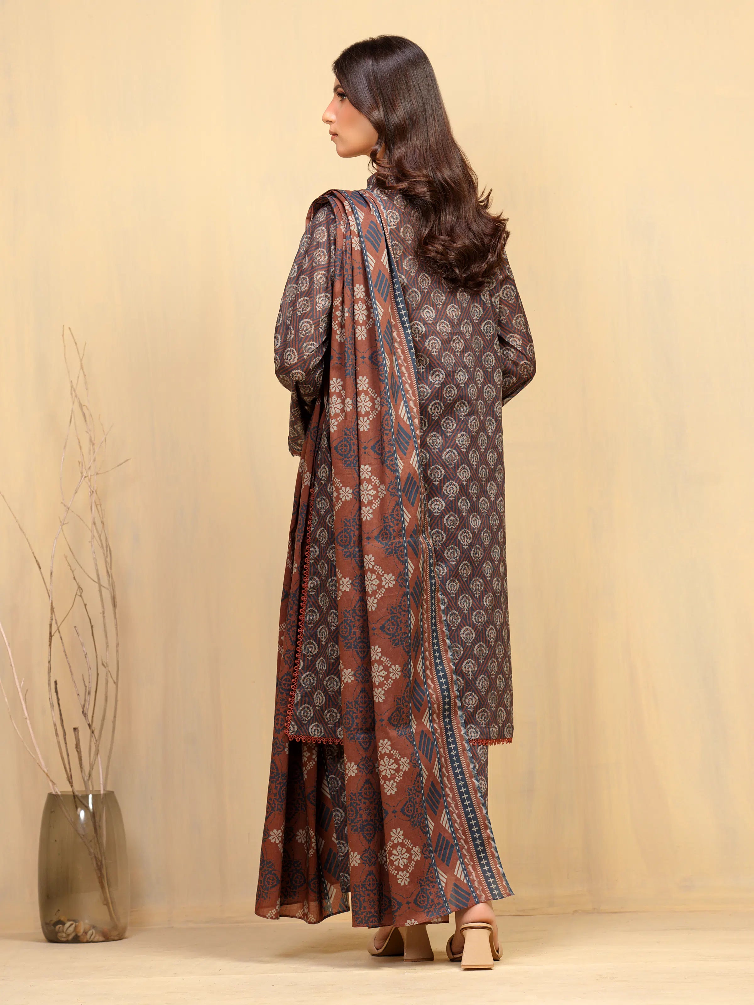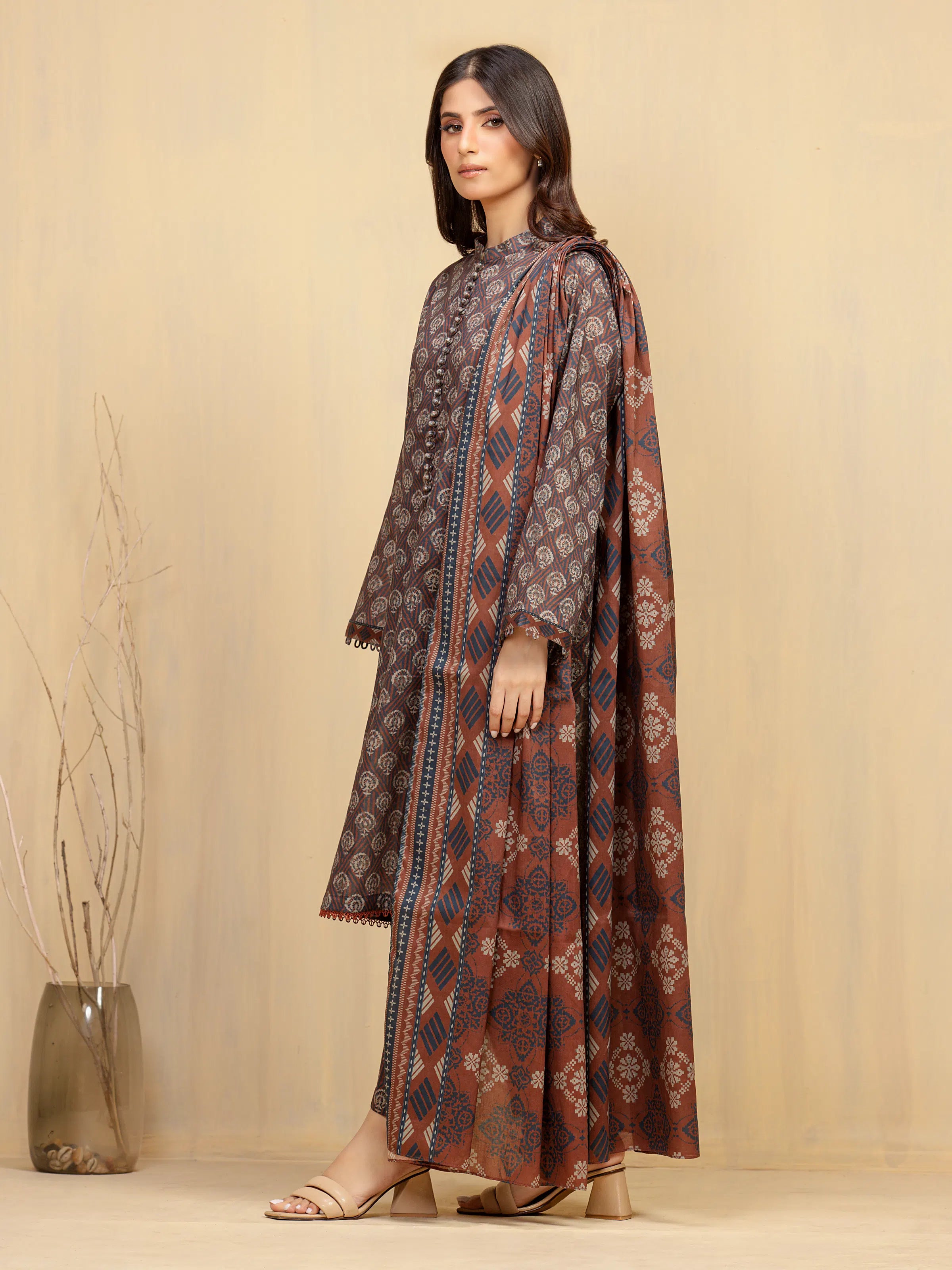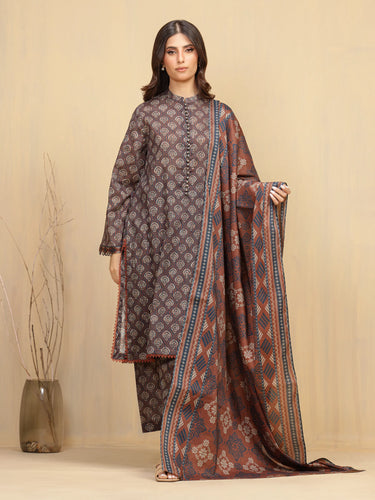 Unstitched Dark Brown Printed Khaddar 3 Piece