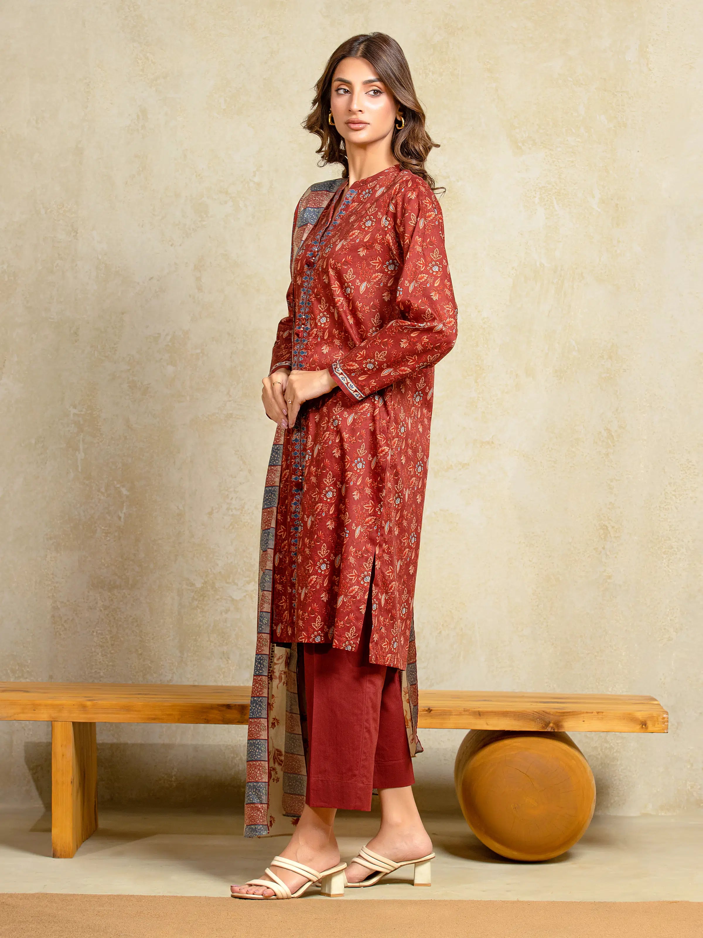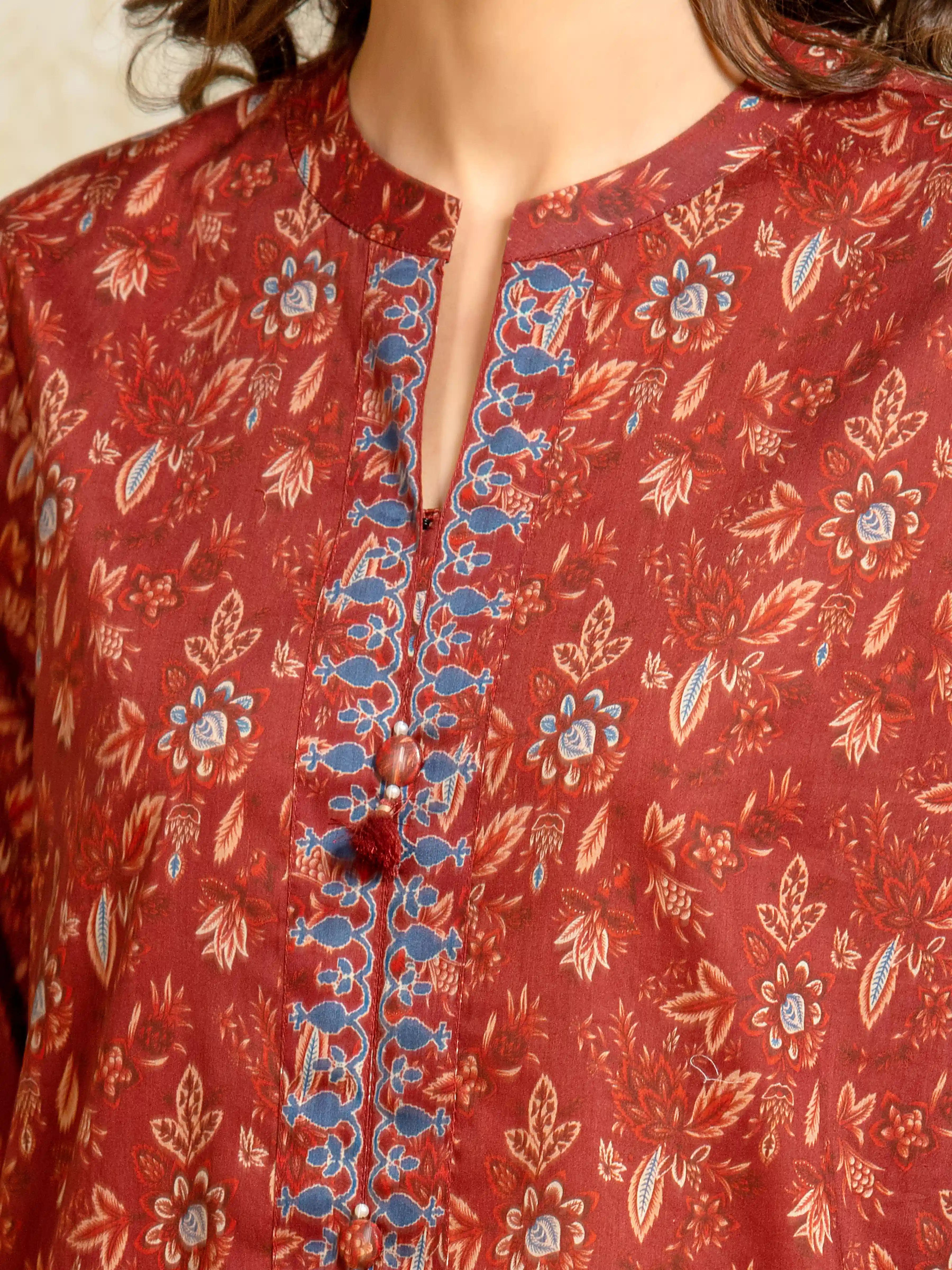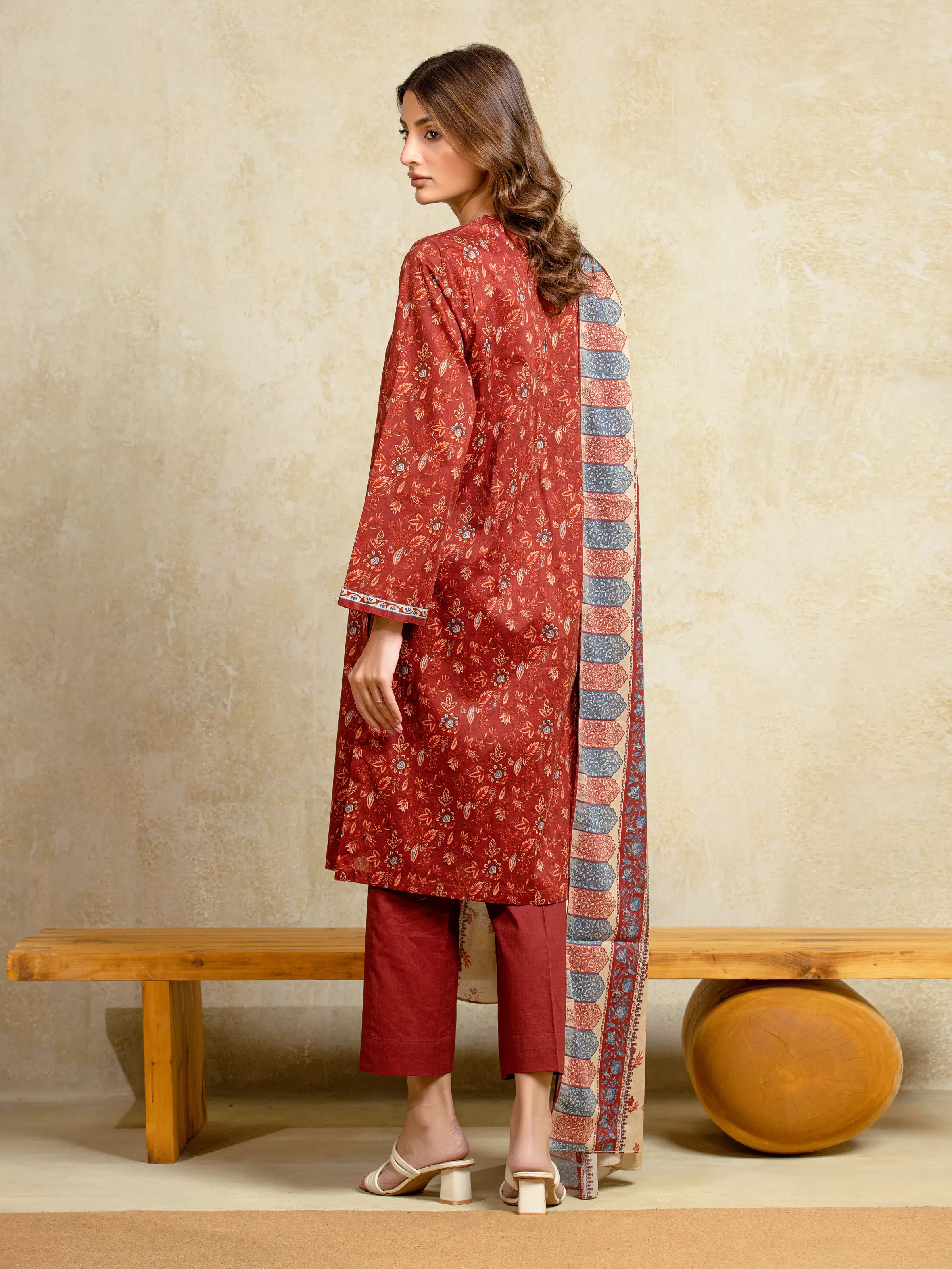 Unstitched Maroon Printed Khaddar 3 Piece