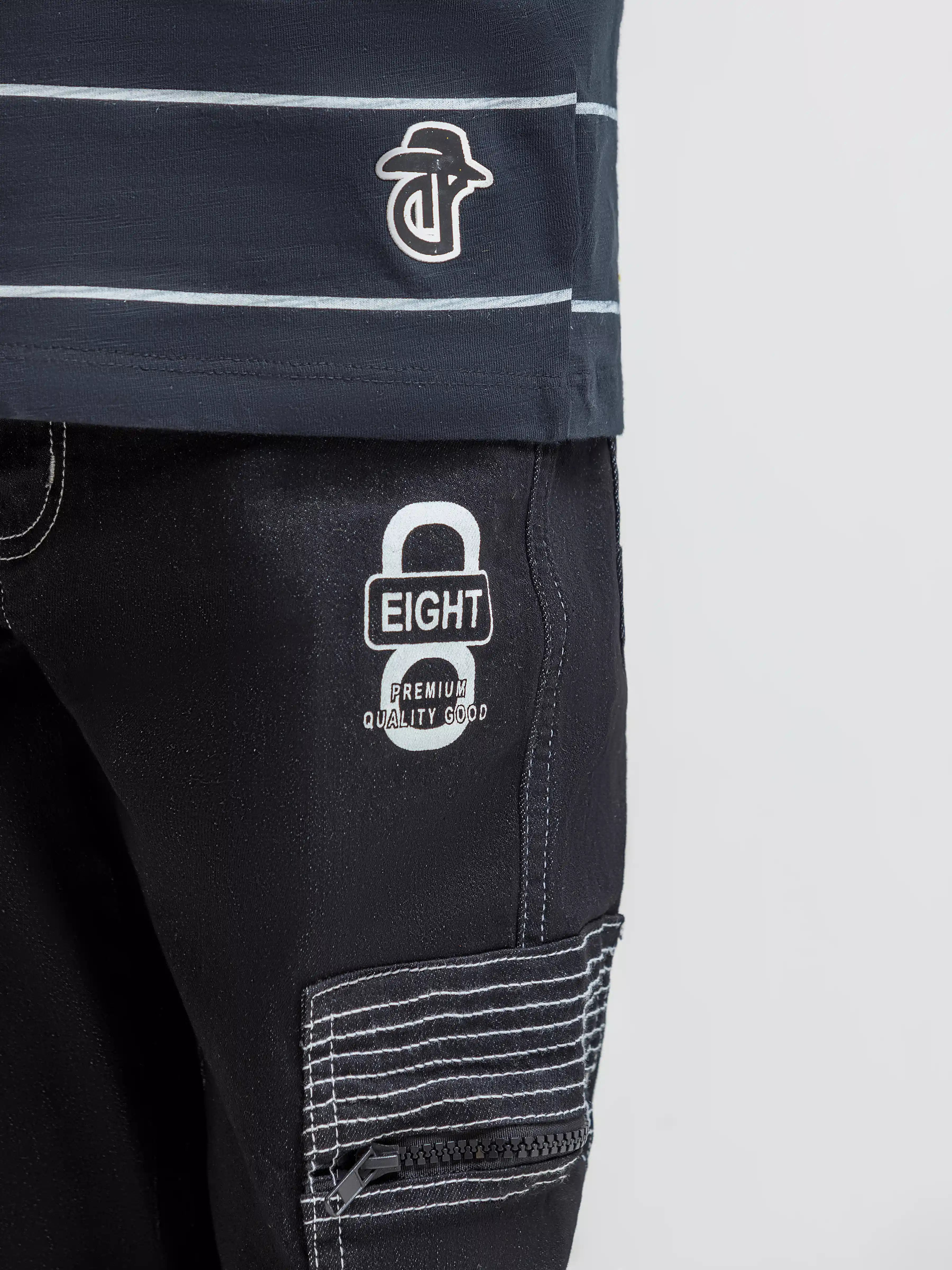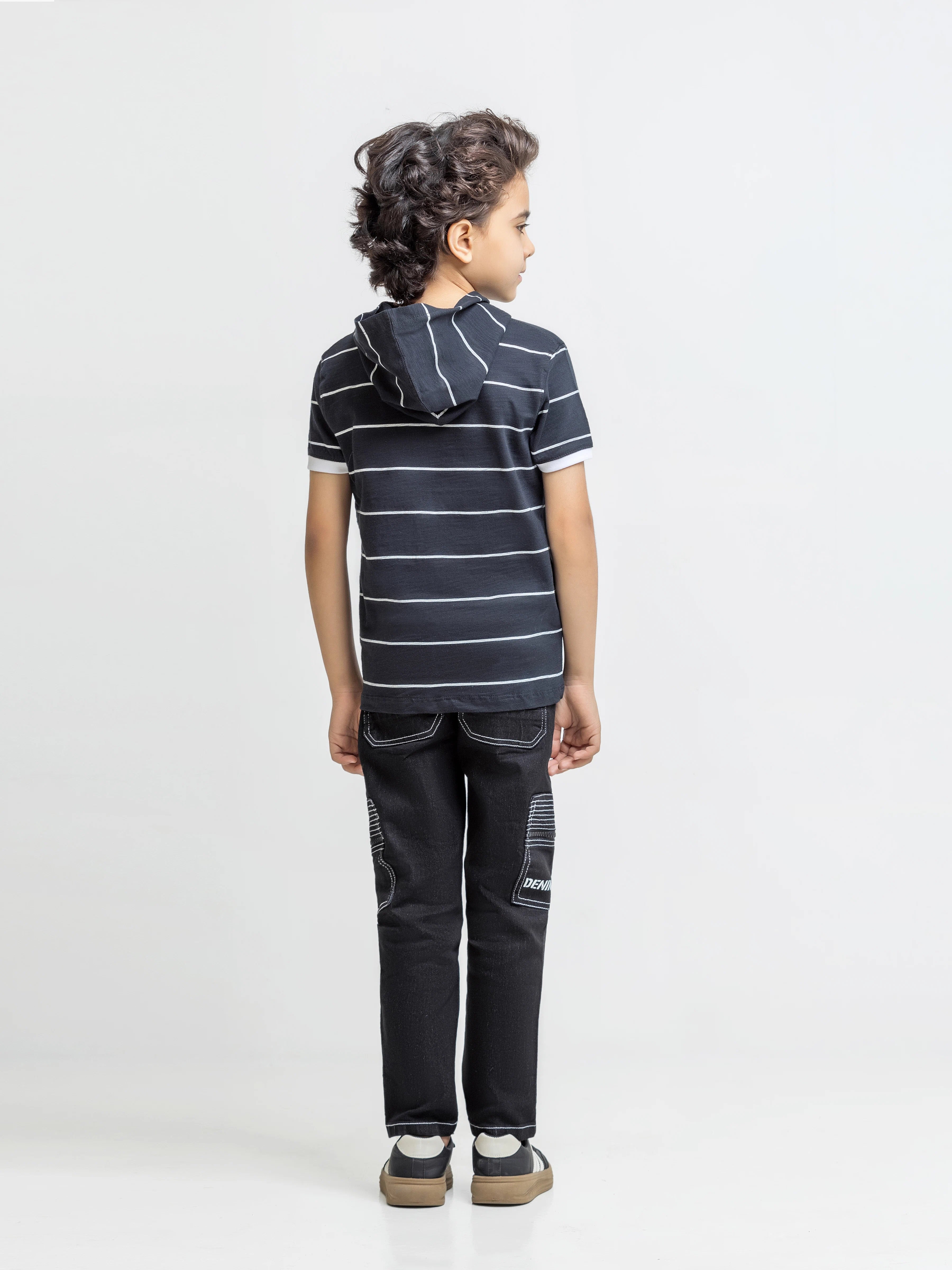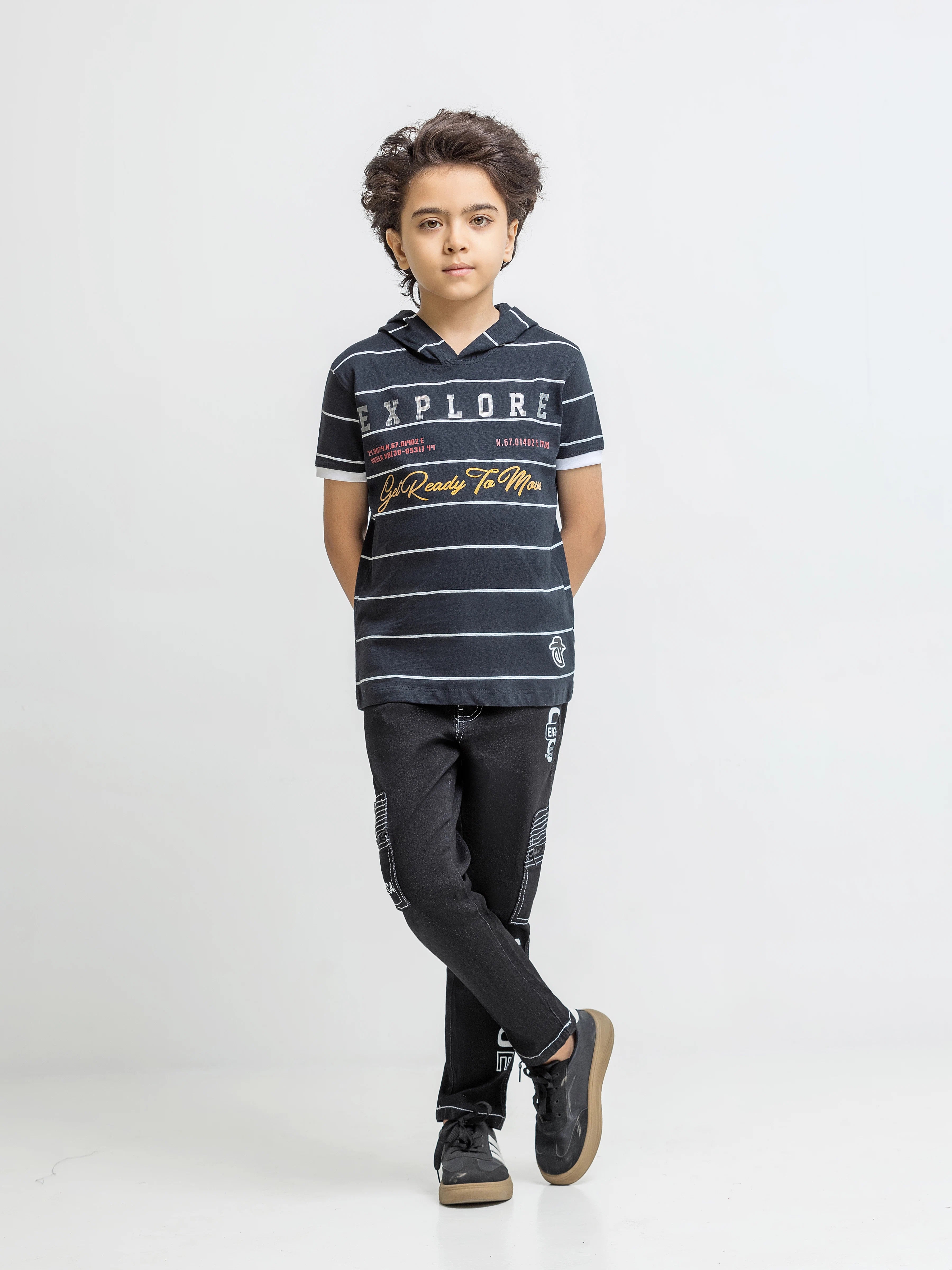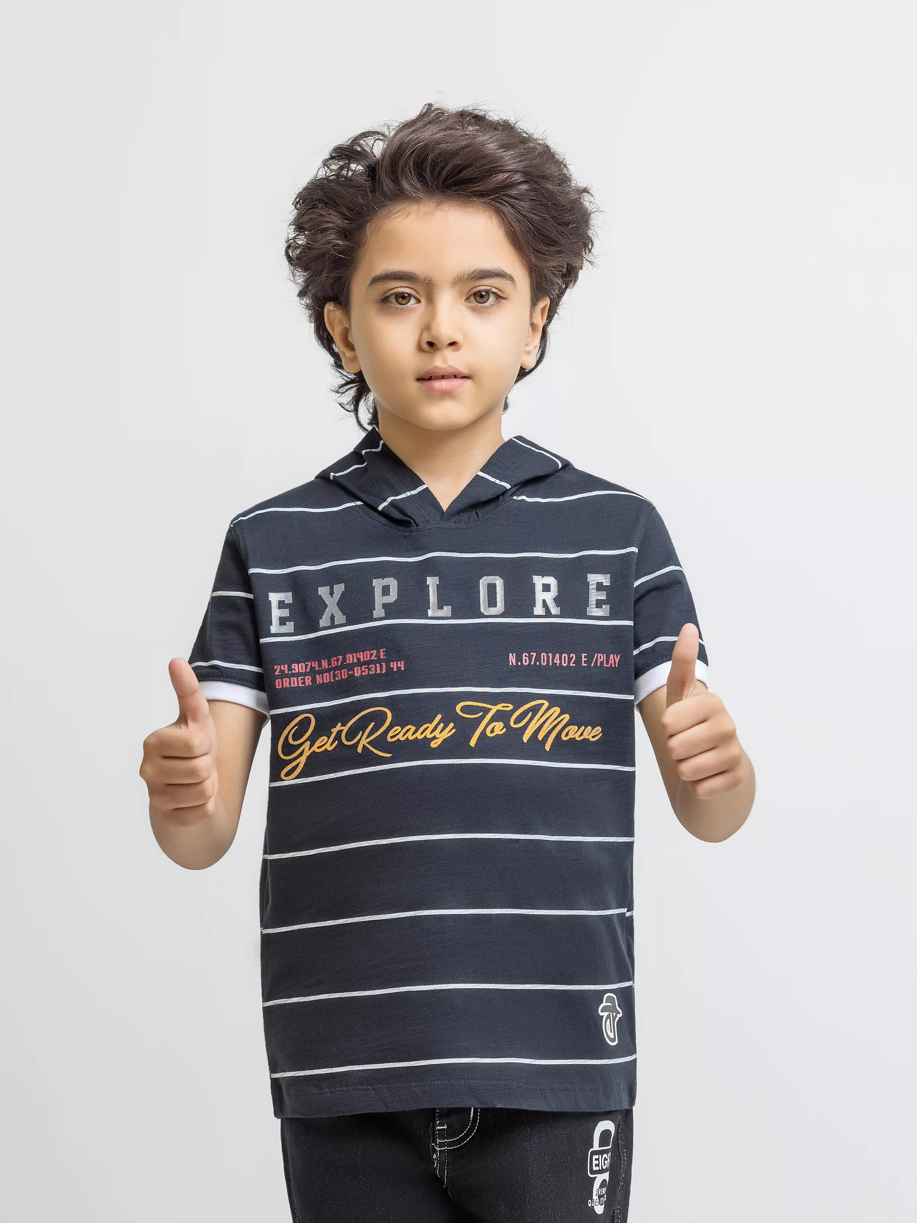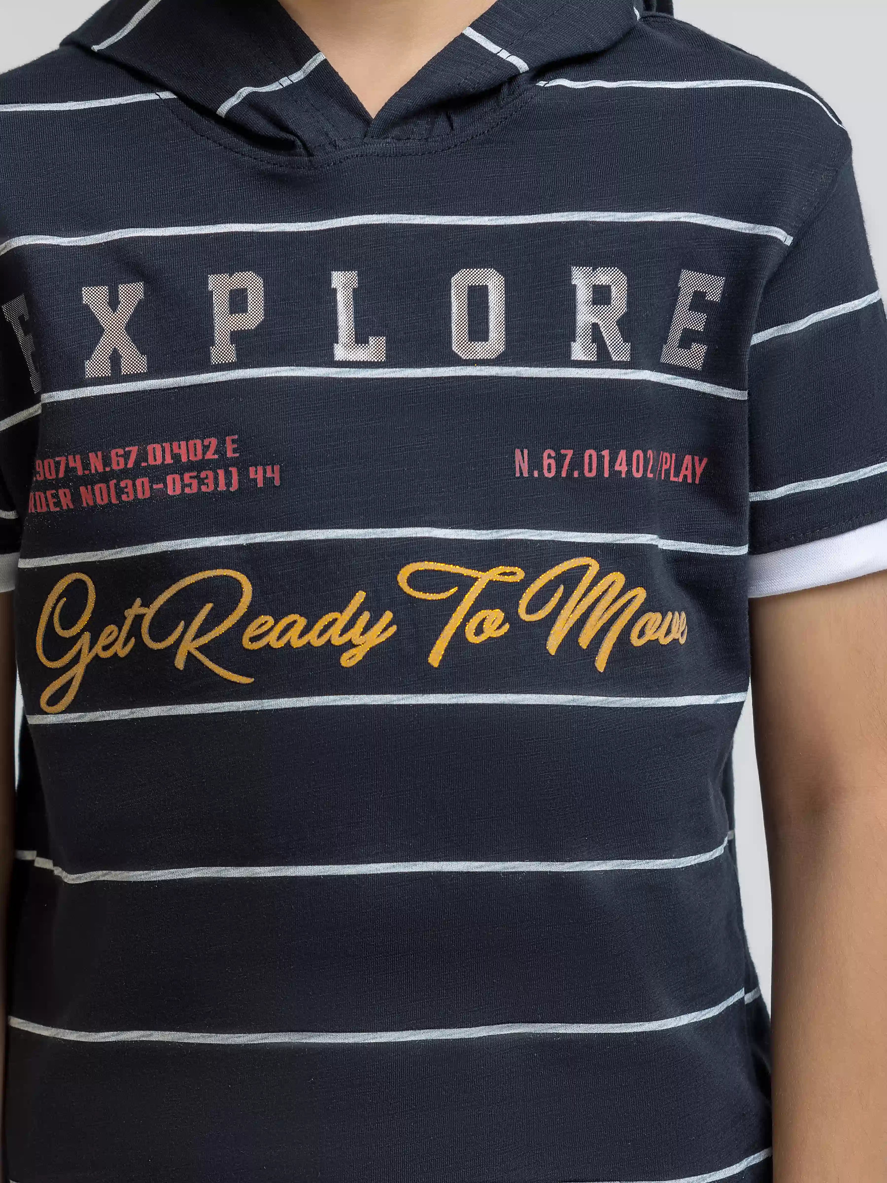 - Style: Stripped T-shirt with Hood & Printed Front