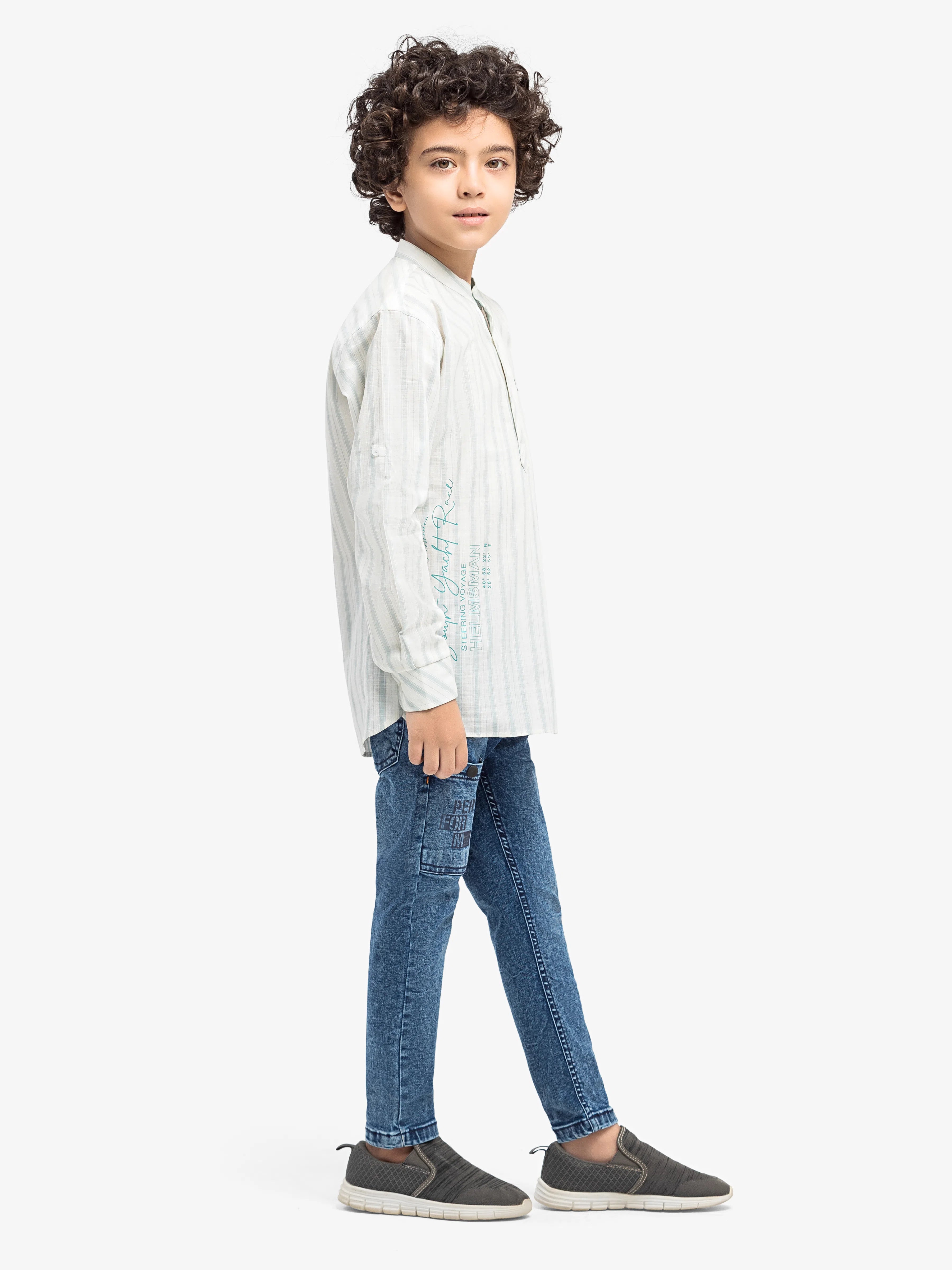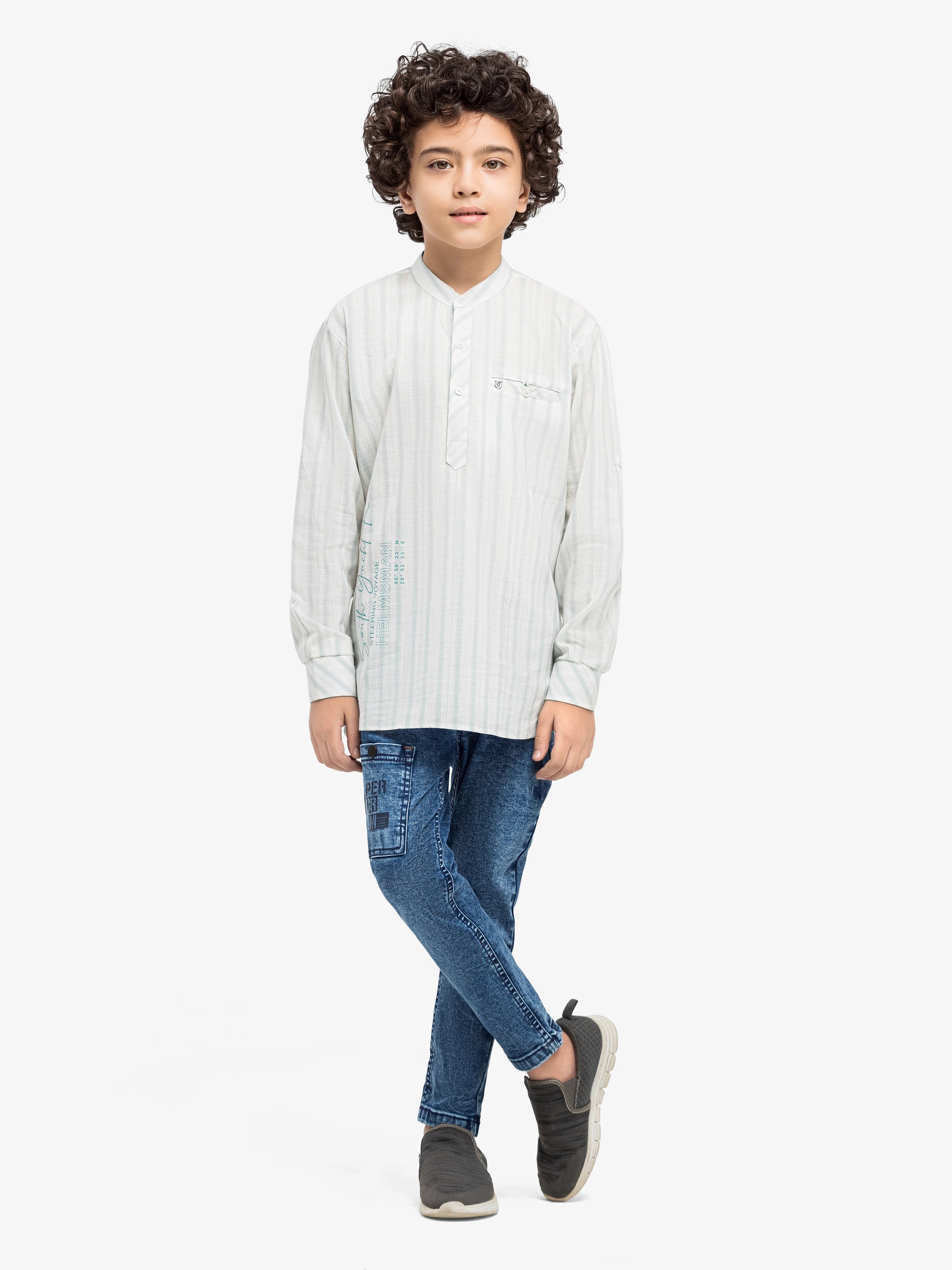 - Style: Stripped Kurti Style Shirt with Print and Brand Tab on Front