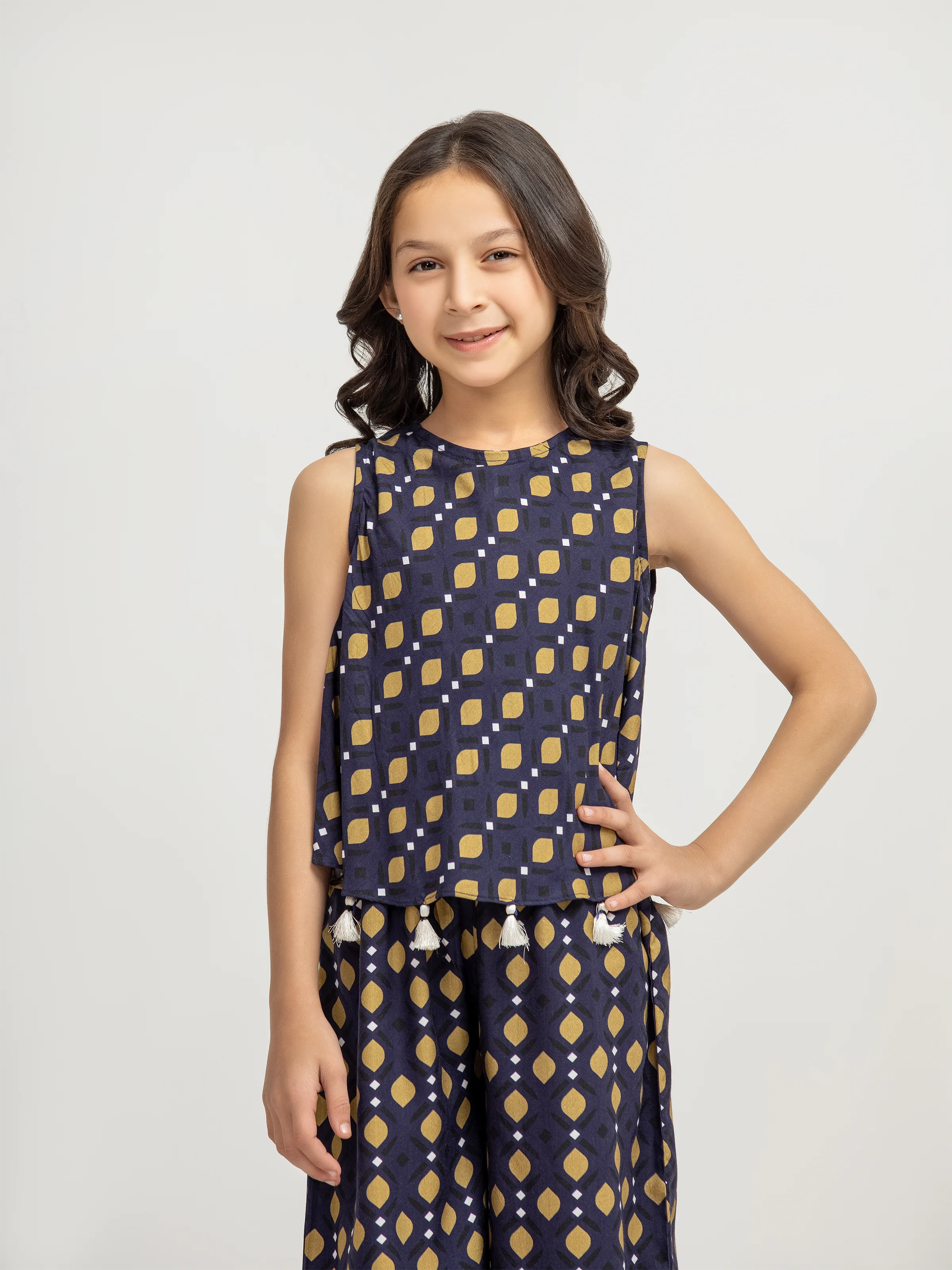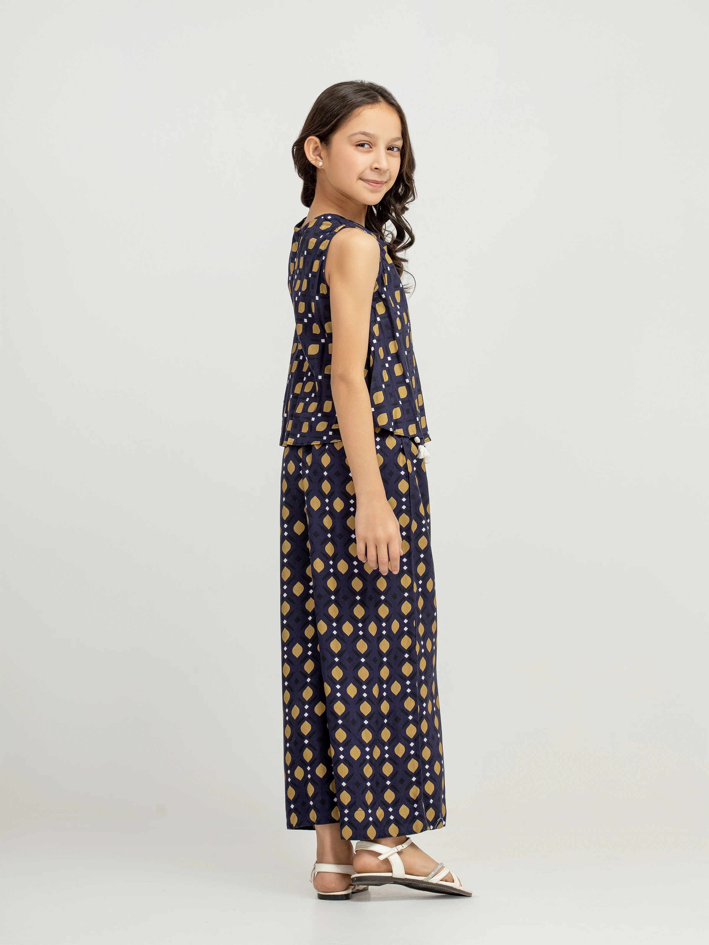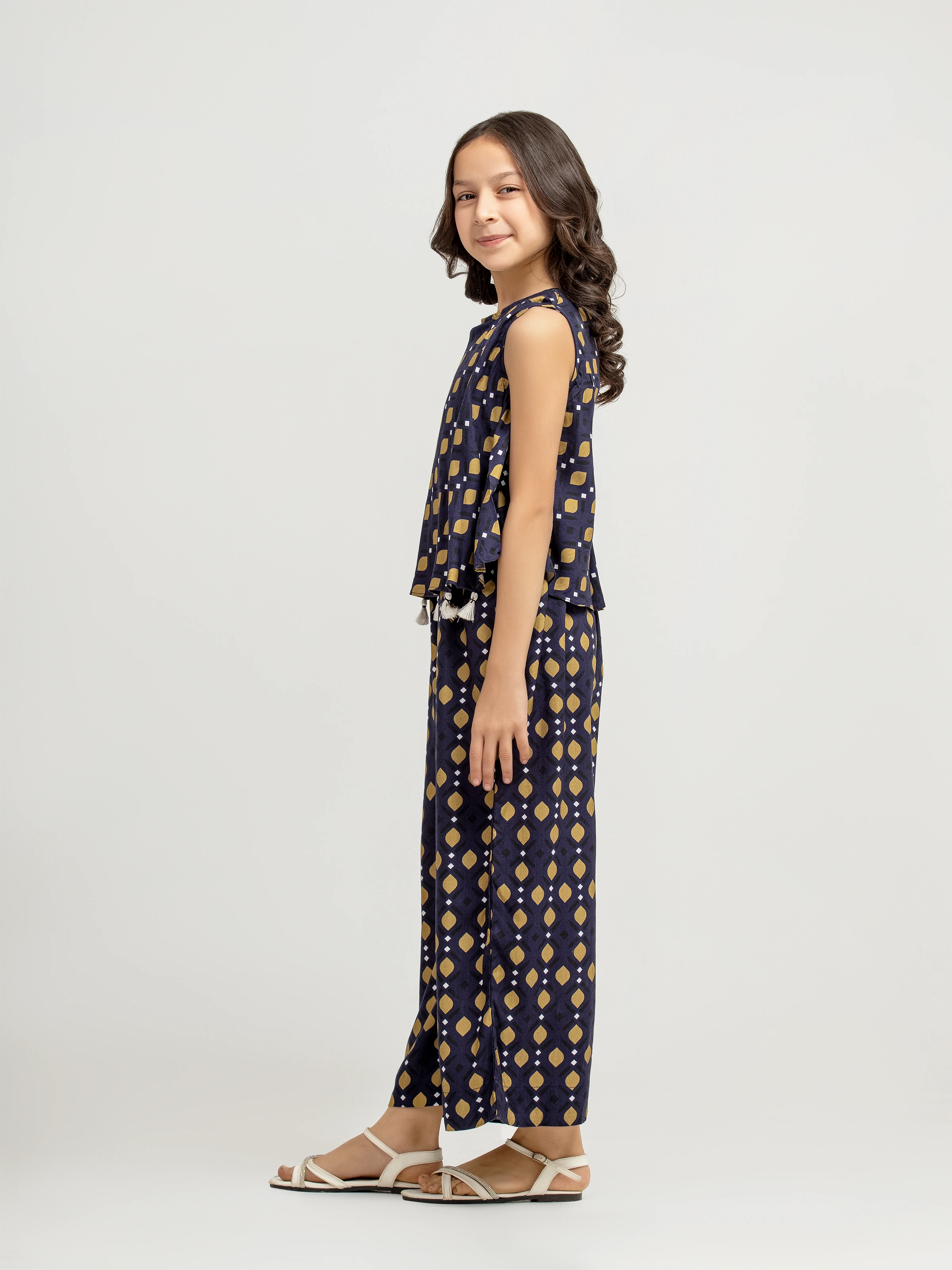 - Style: Printed Sleeveless Jumpsuit with Embellished Front