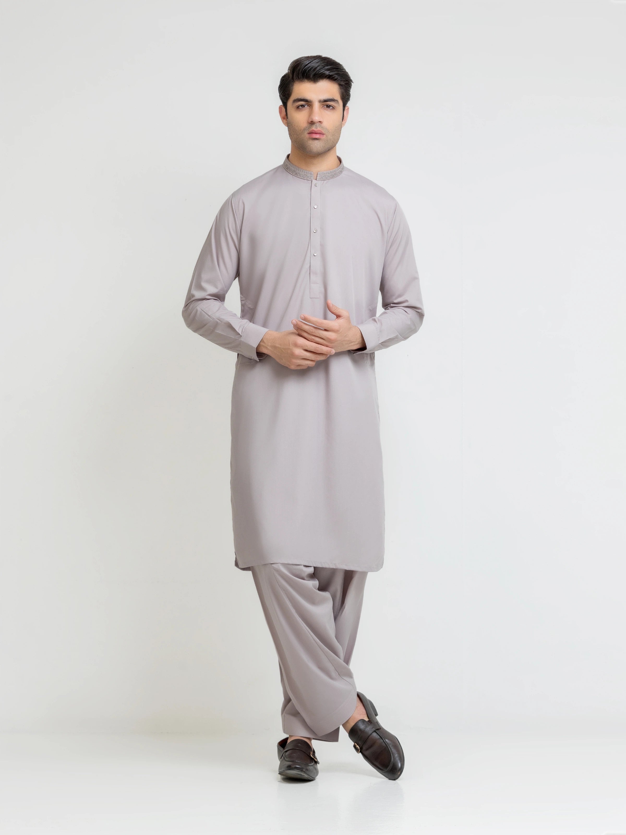 - Style: Plain Kurta with Embroidered Band Collar