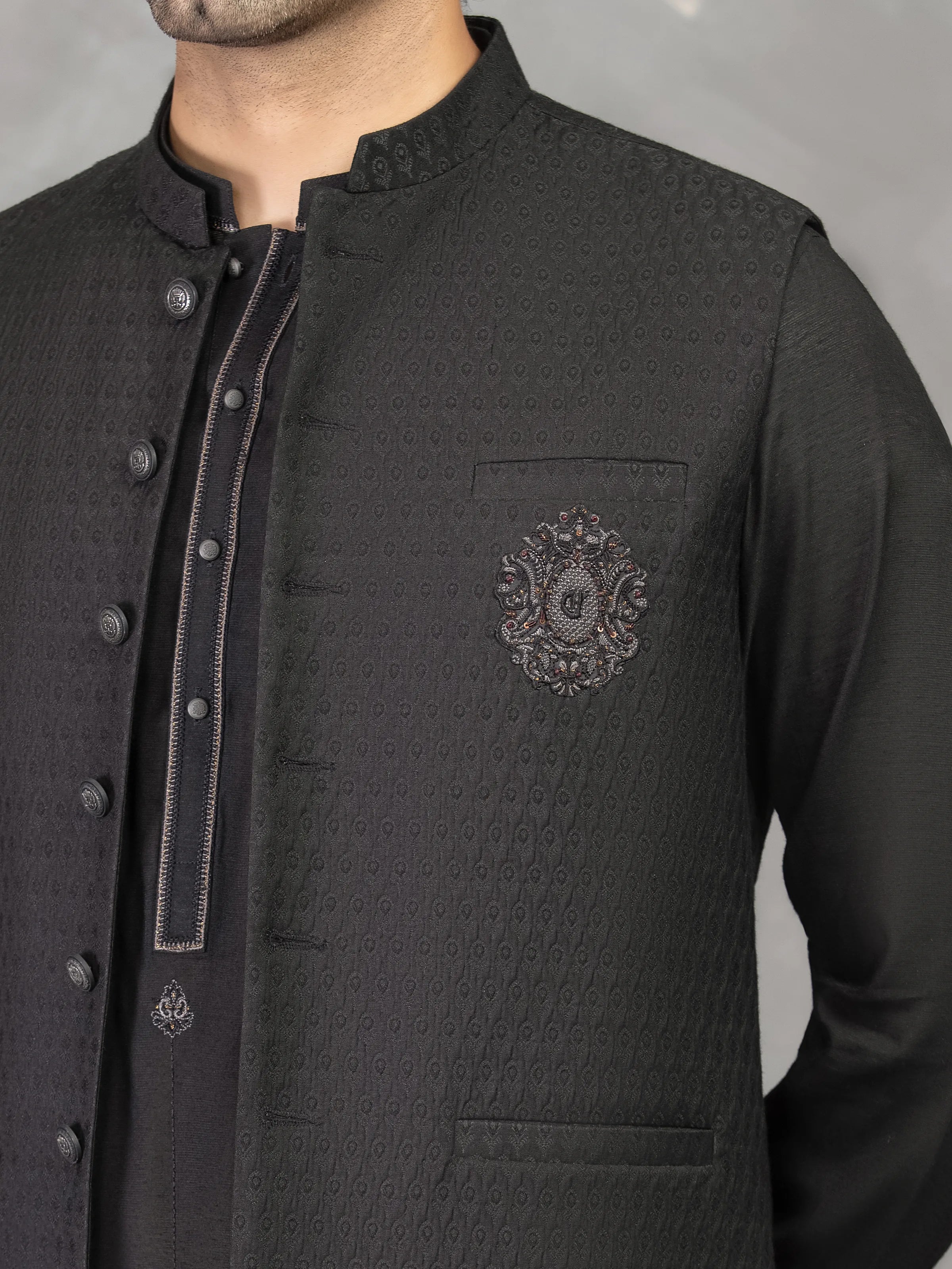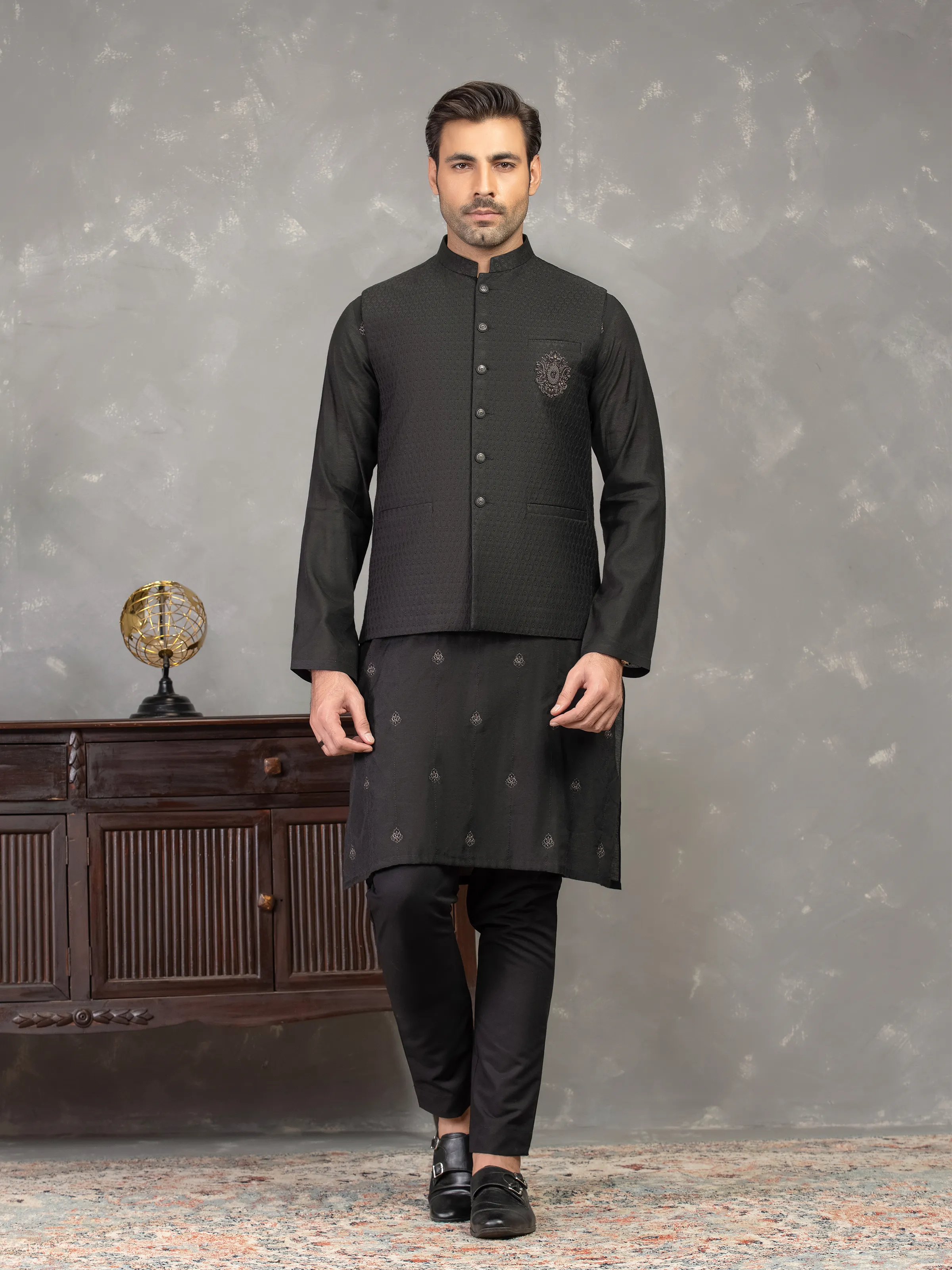- Style: Embroidered Kurta with Textured Waistcoat having Fine Embroidery in Front