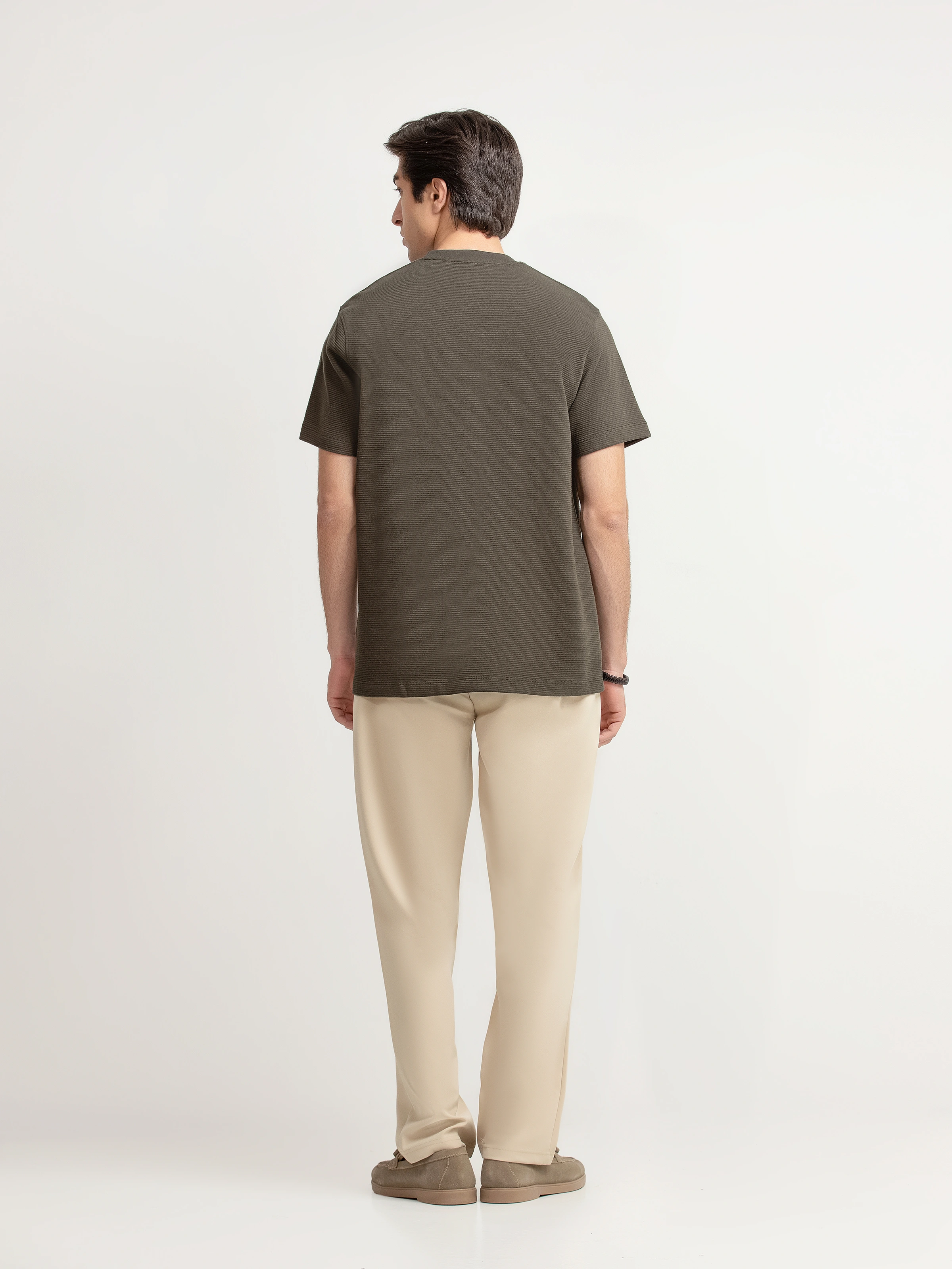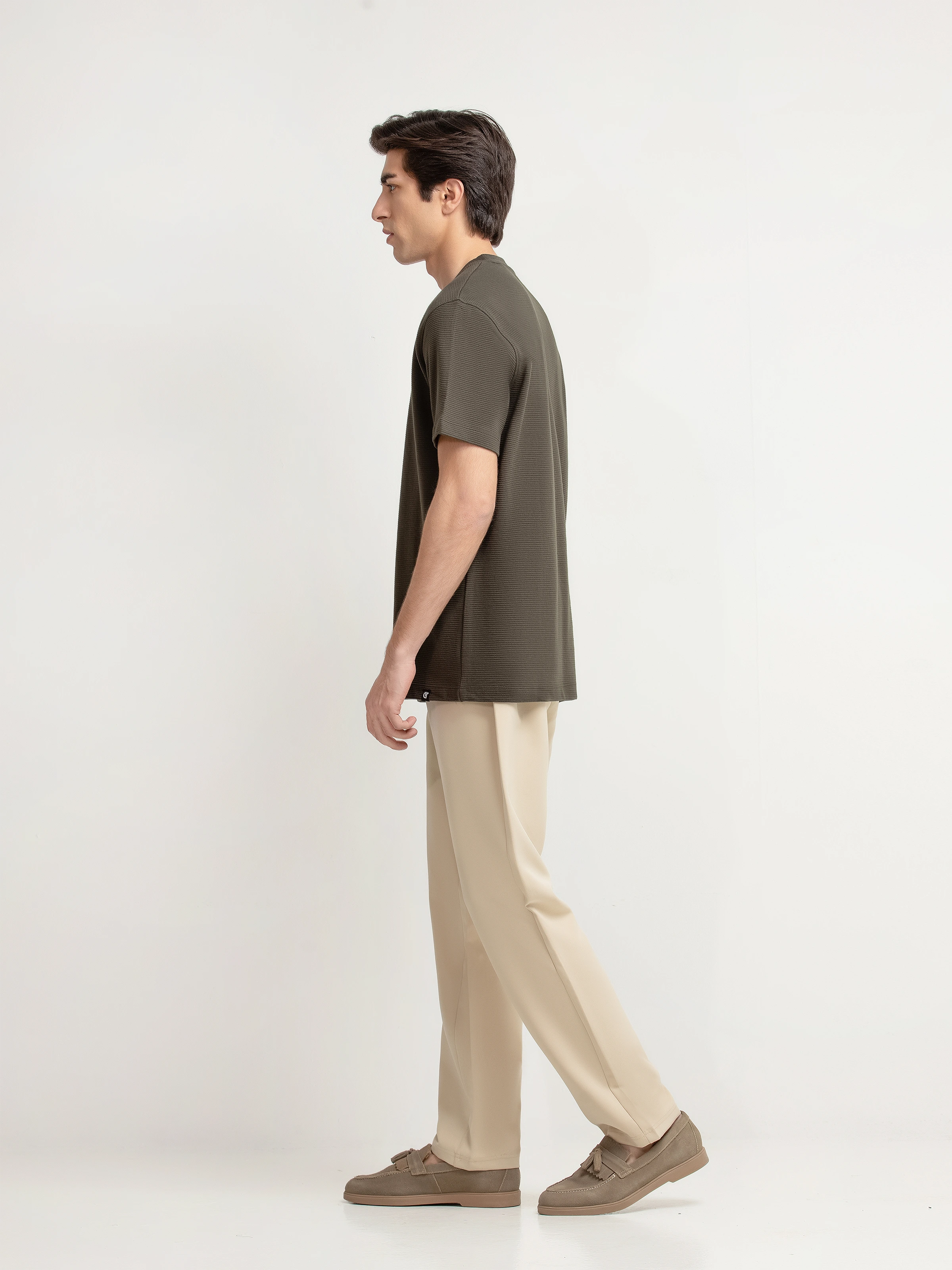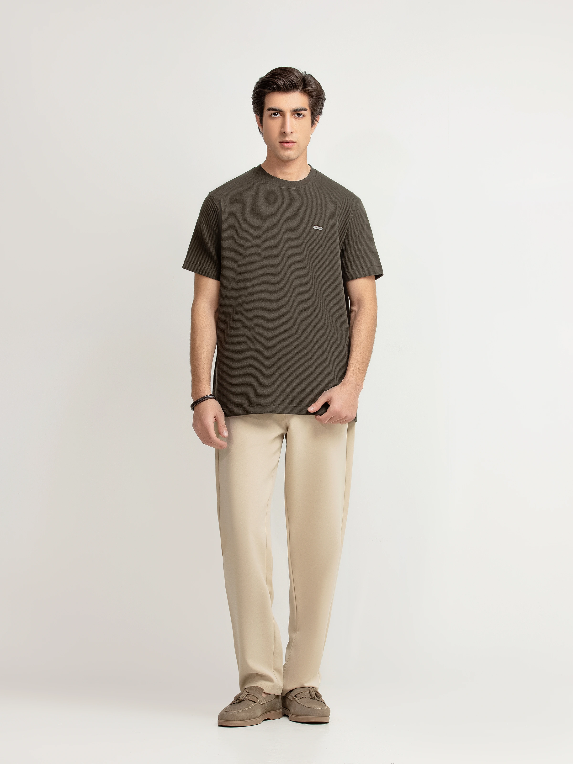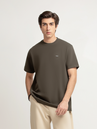 - Style: Textured T-shirt with Brand Named Metal Tab on Front
