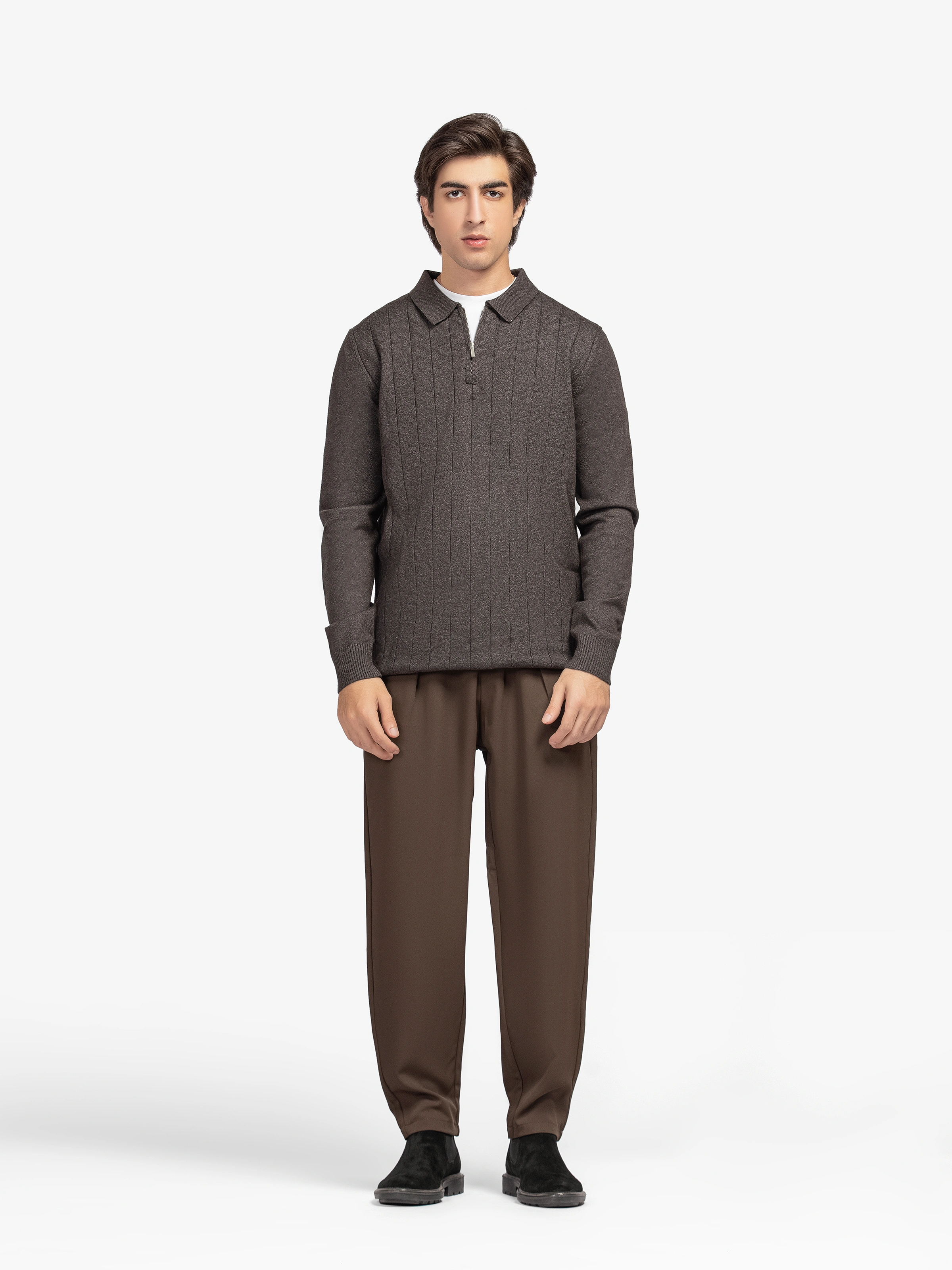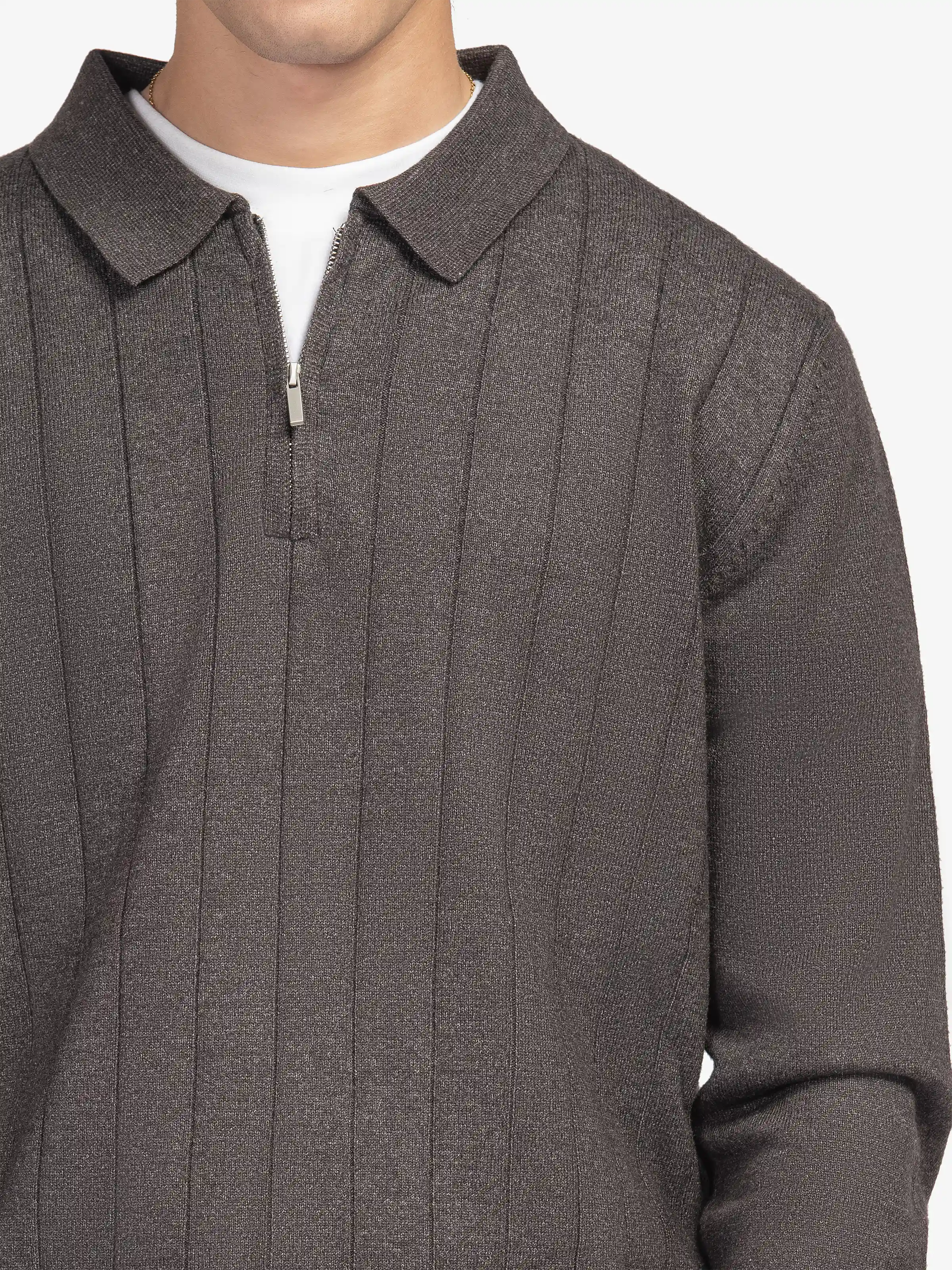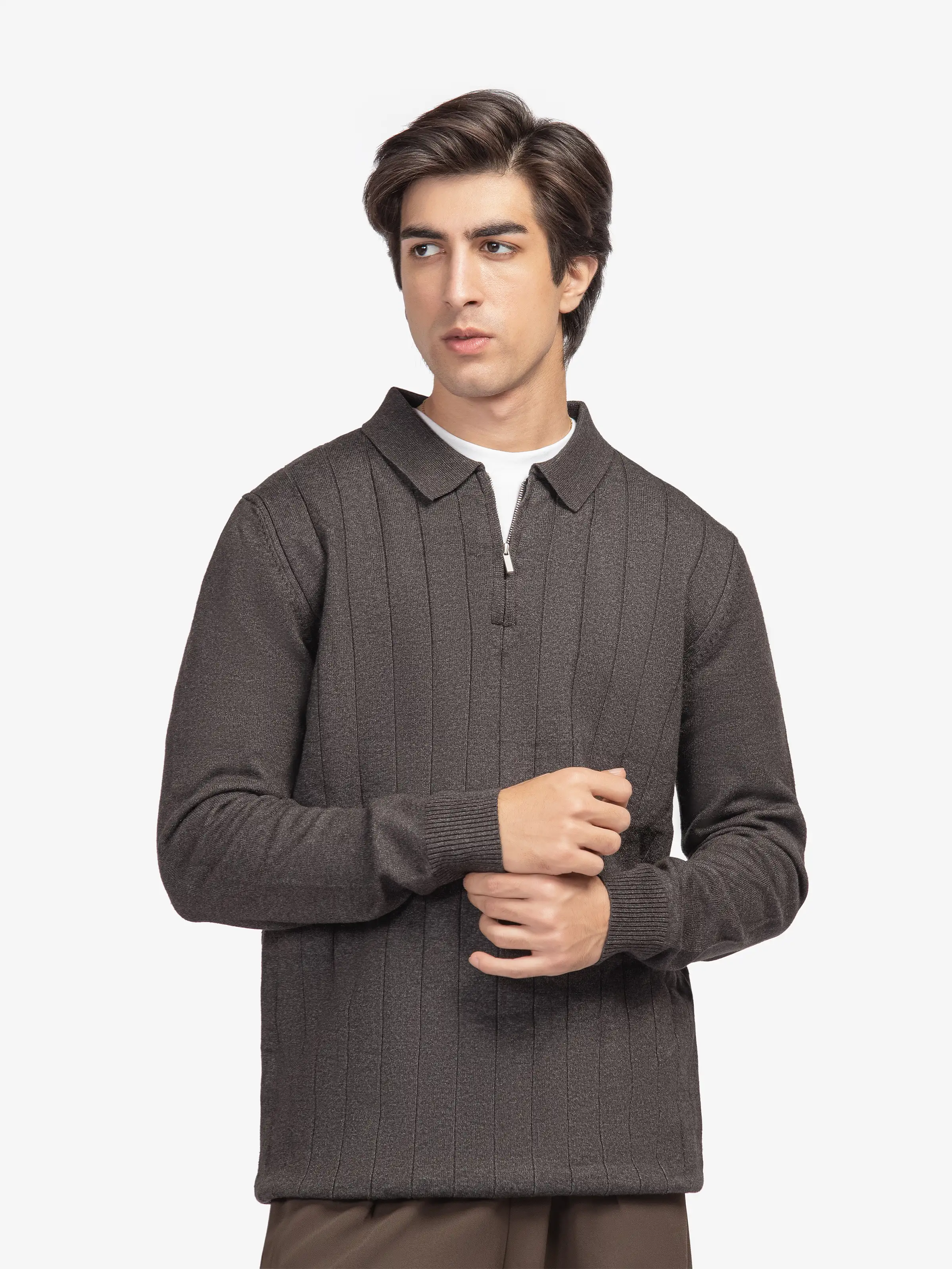 - Style: Full Sleeves Sweater with Drop Needle Pattern, Polo Collar, & Zip on Front