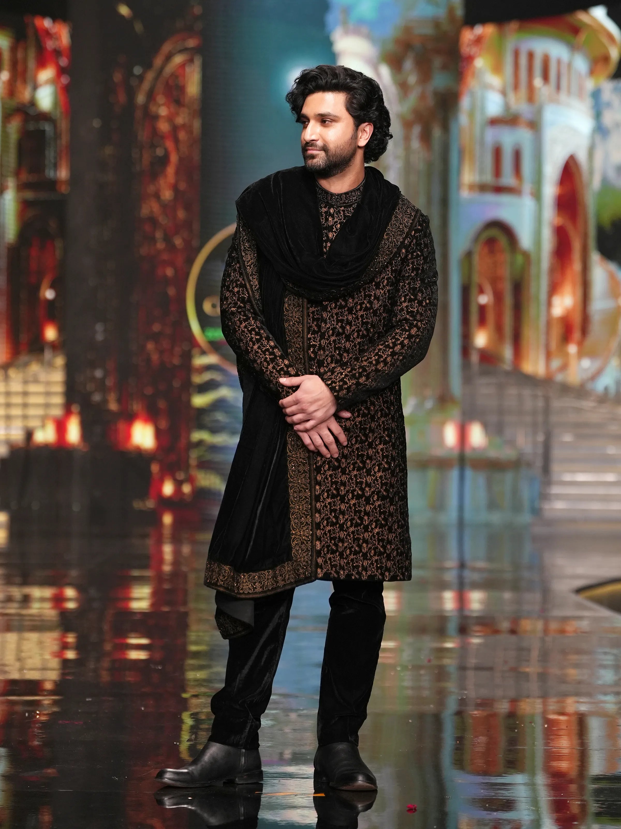 - Style: Kasab Embroidered Sherwani Enhanced with Sequin Work & Paired with Raw Silk Pajama