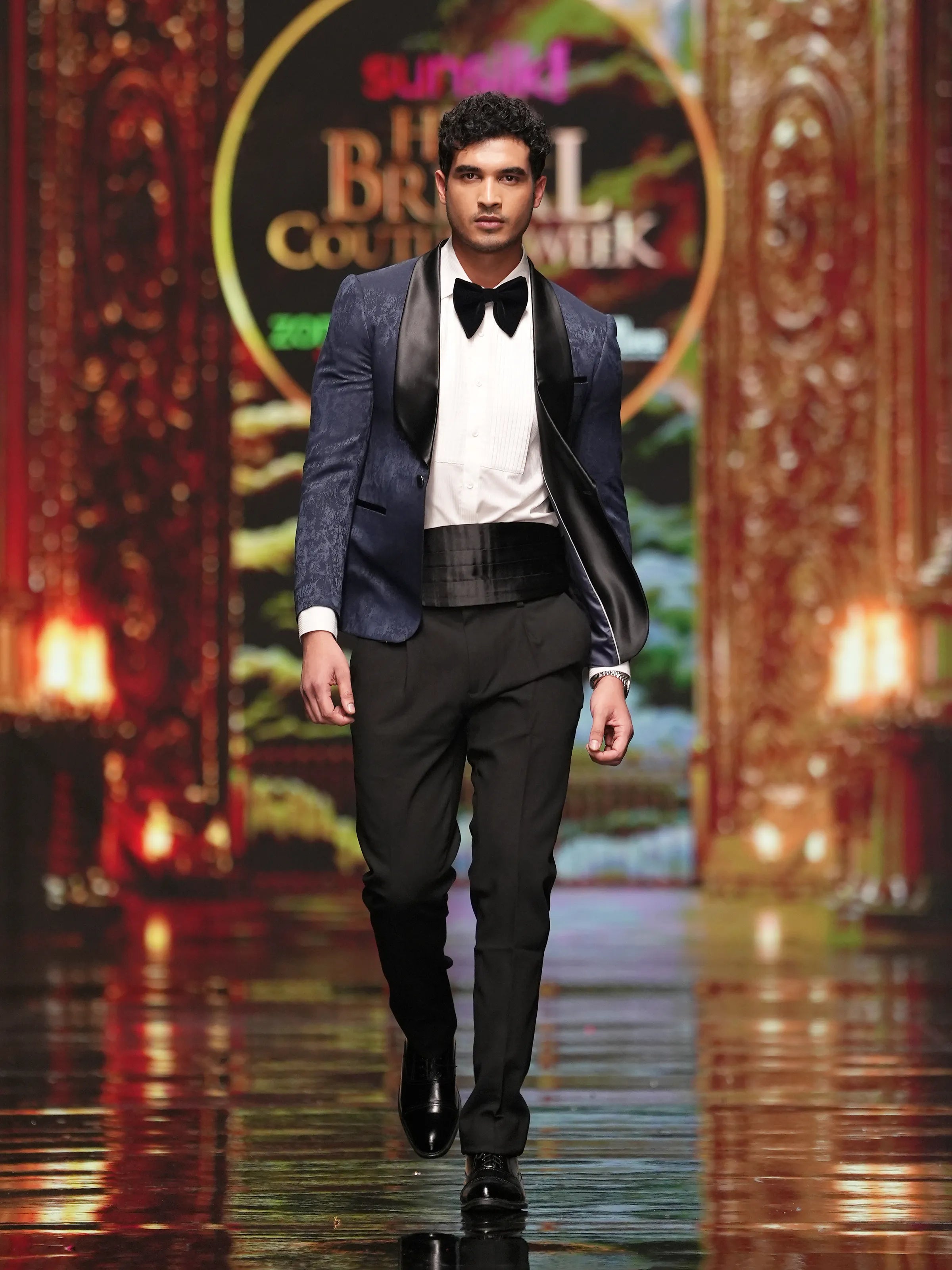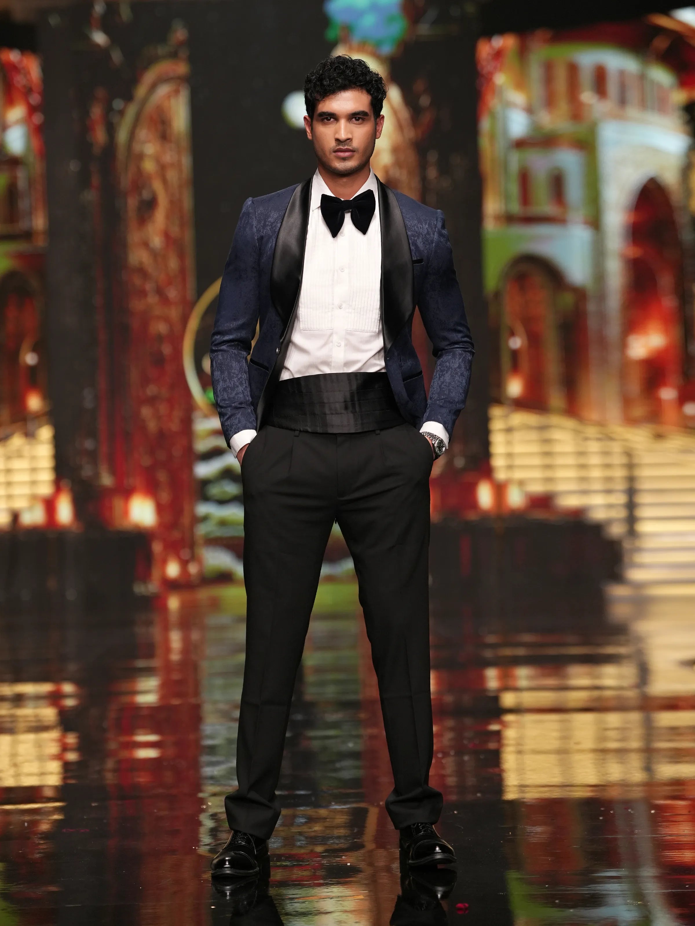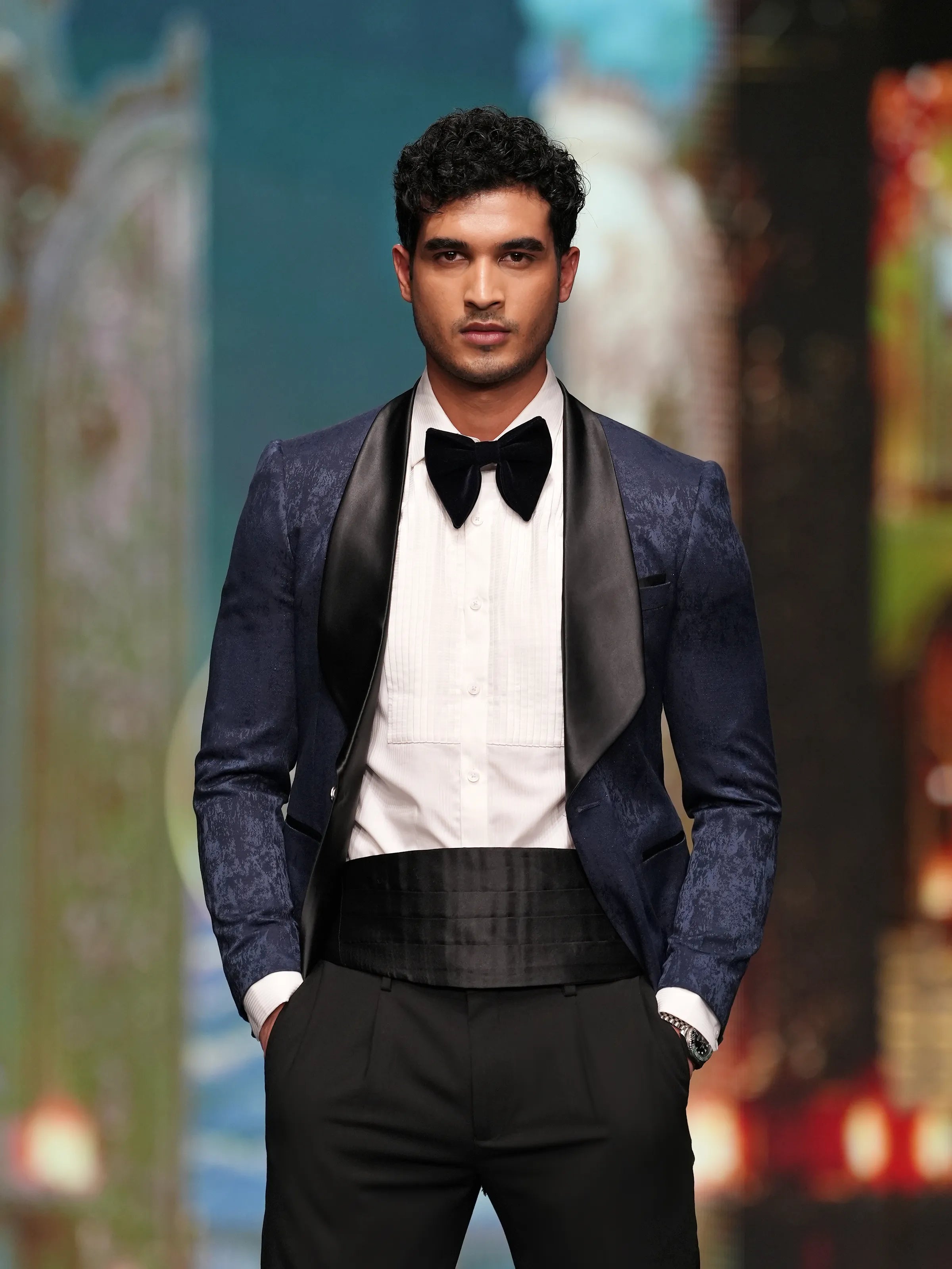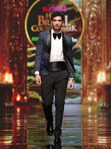 - Tuxedo: Cross shawl collar tuxedo featuring a textured brocade surface with a paisley pattern, offering depth and a striking visual character.