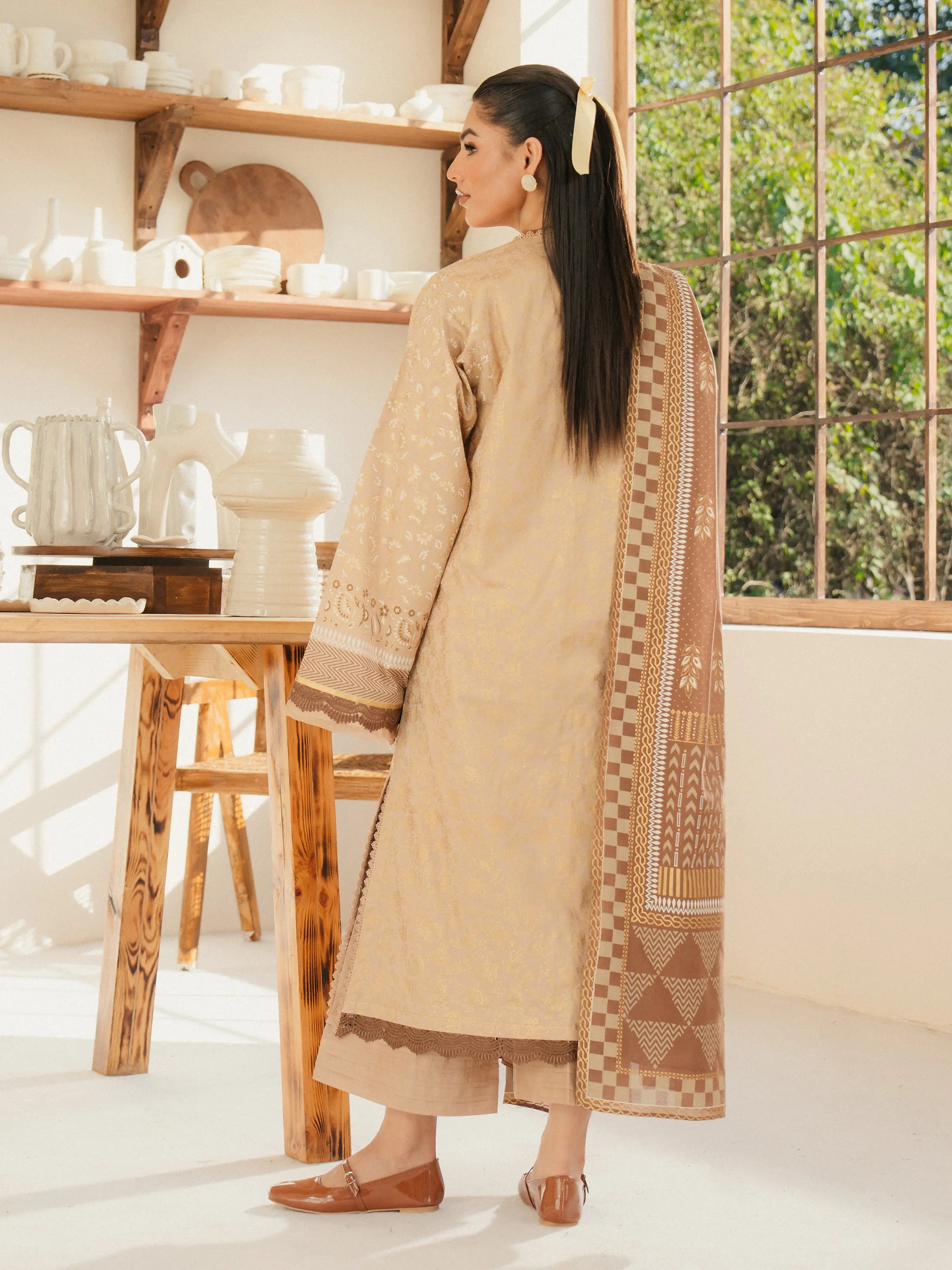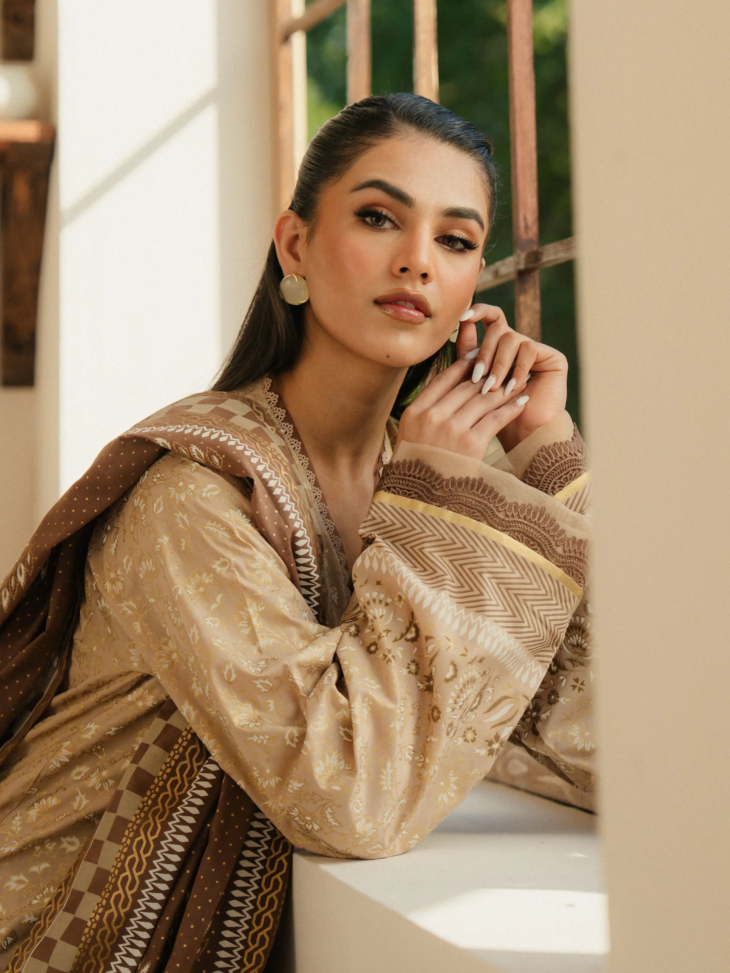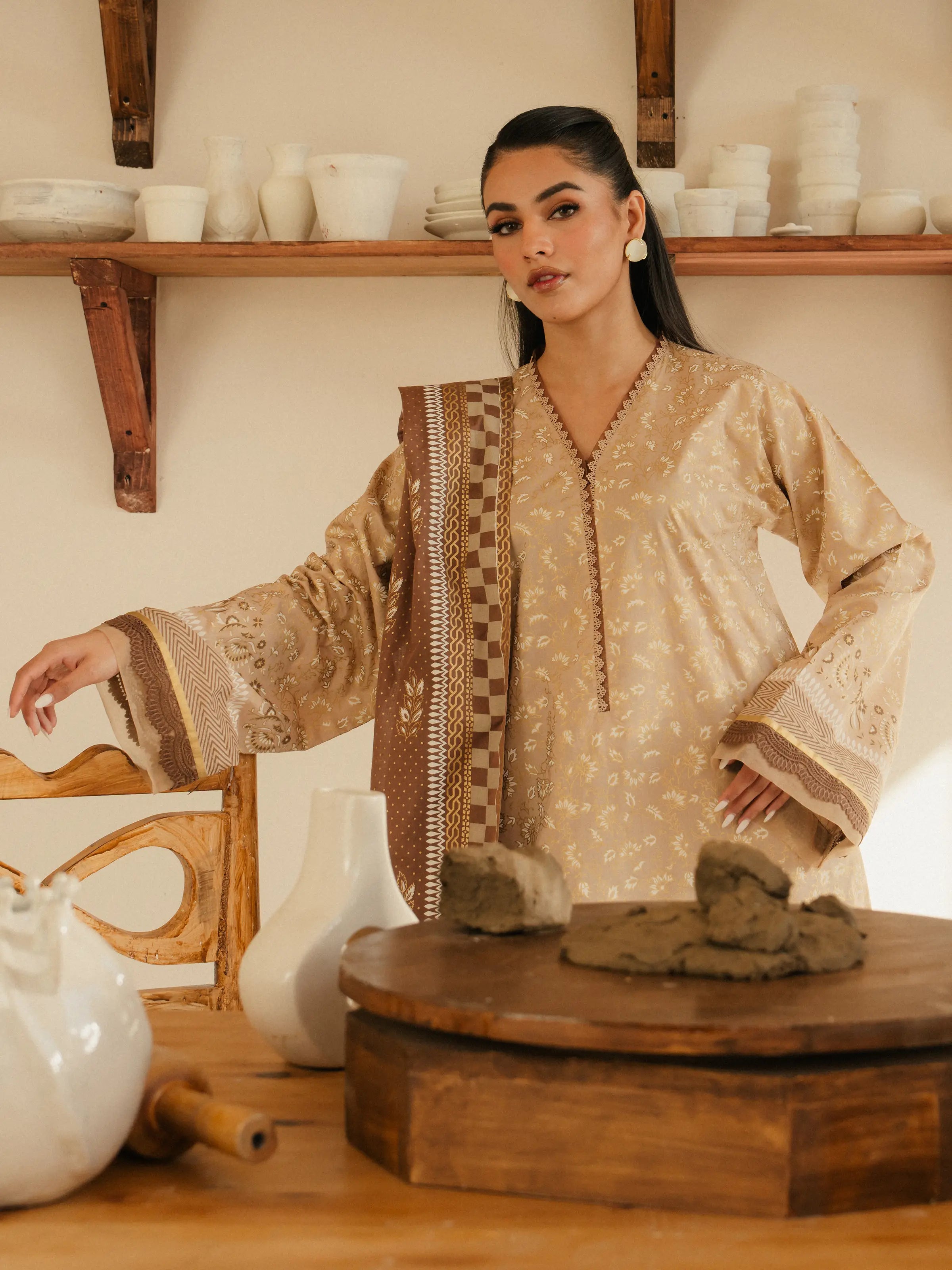 Unstitched Beige Block Print Cambric 2 Piece