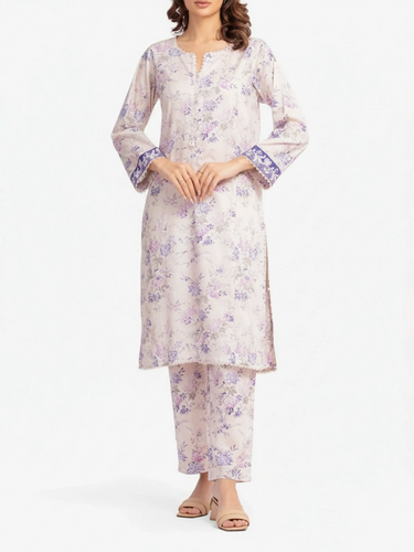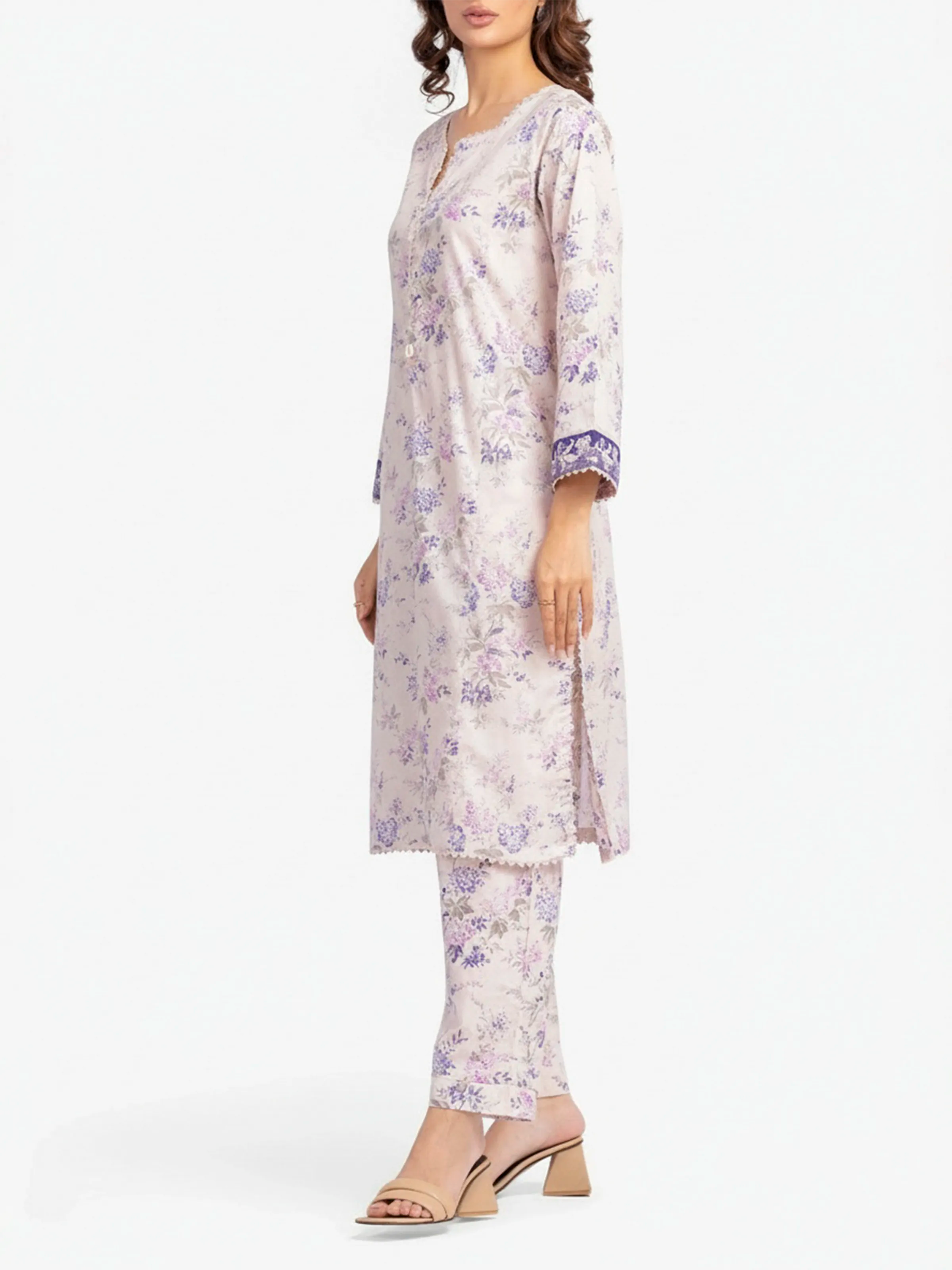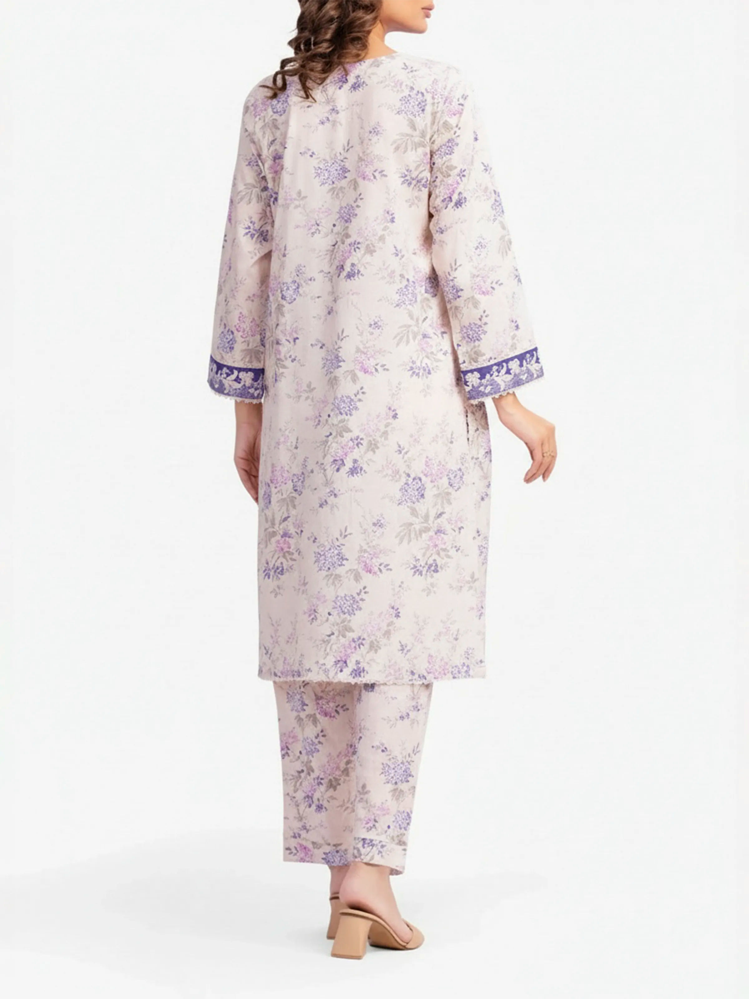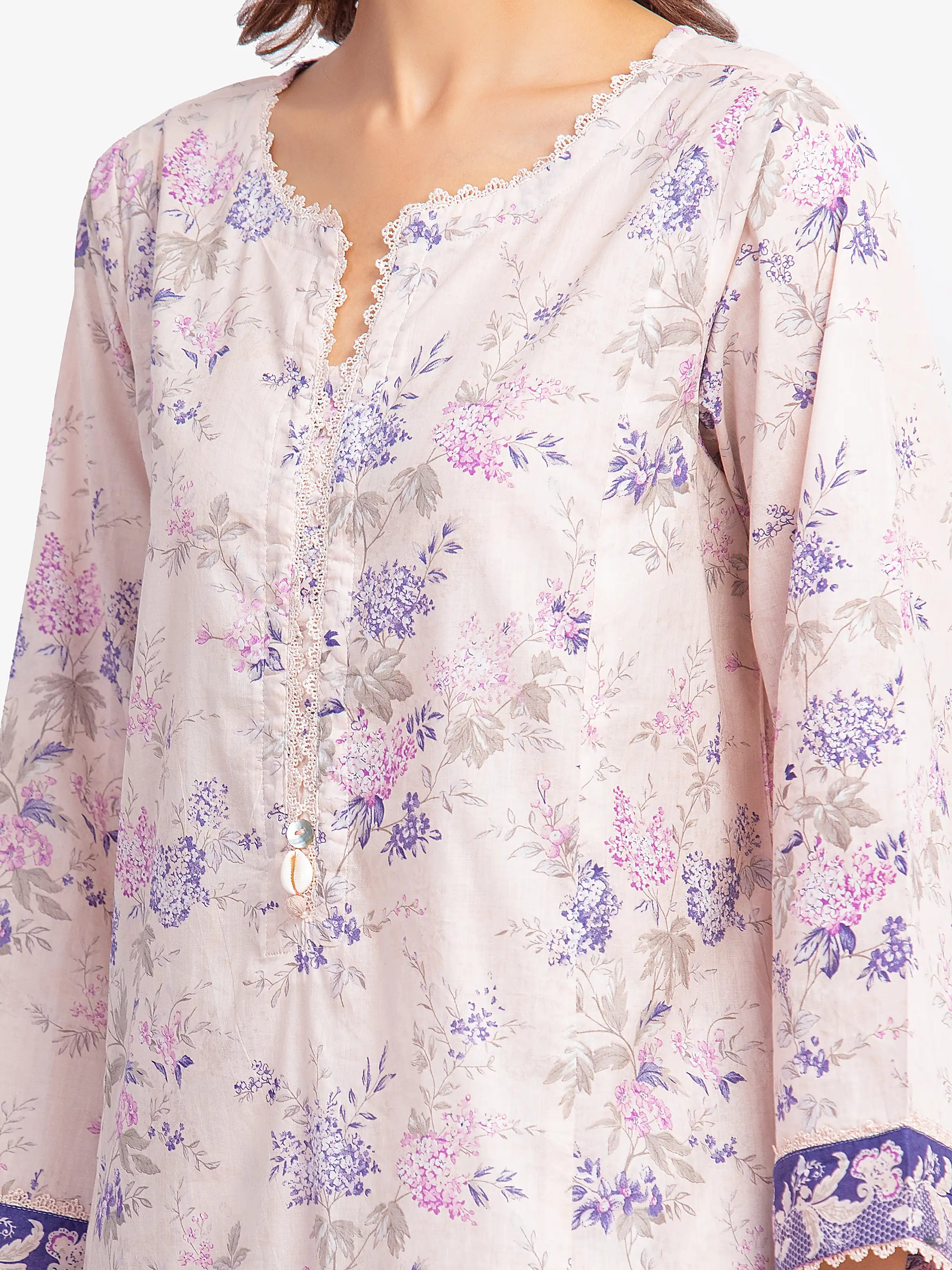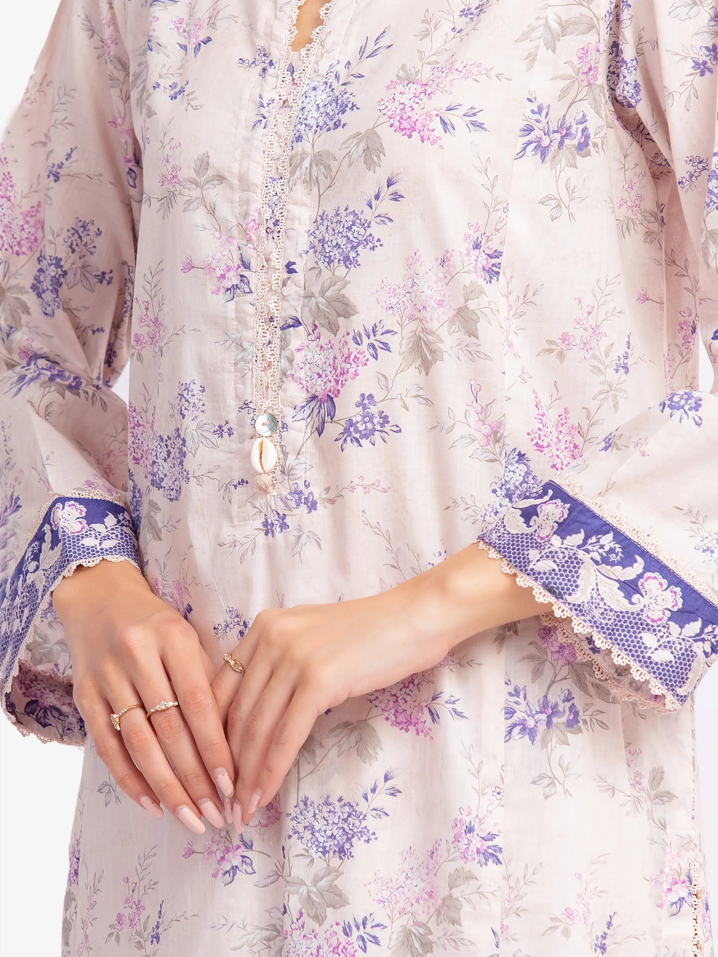 Style: Floral Shirt with Lace on Neck, Placket, Sleeves, Chalk, & Daman & Embellished Placket
