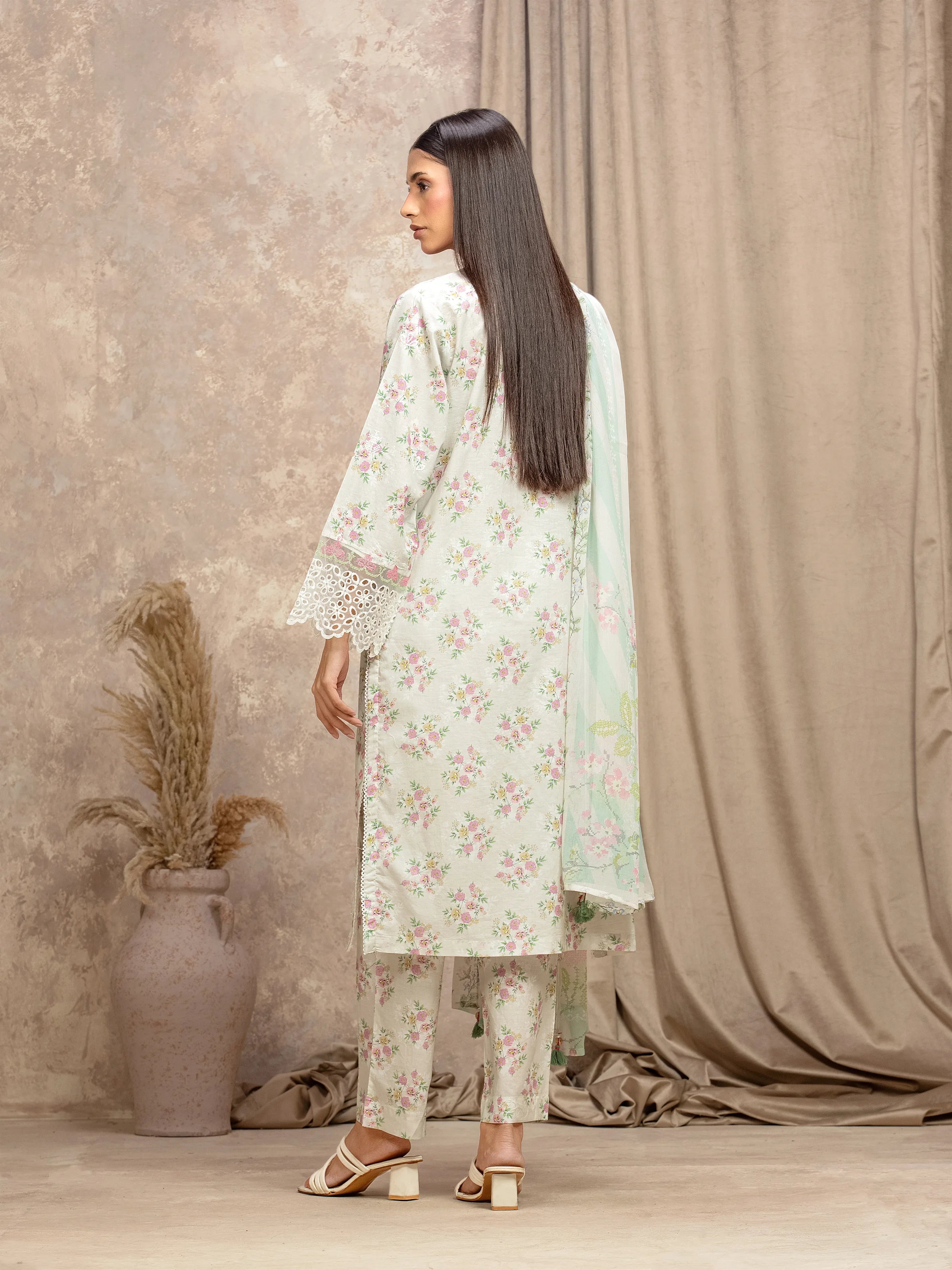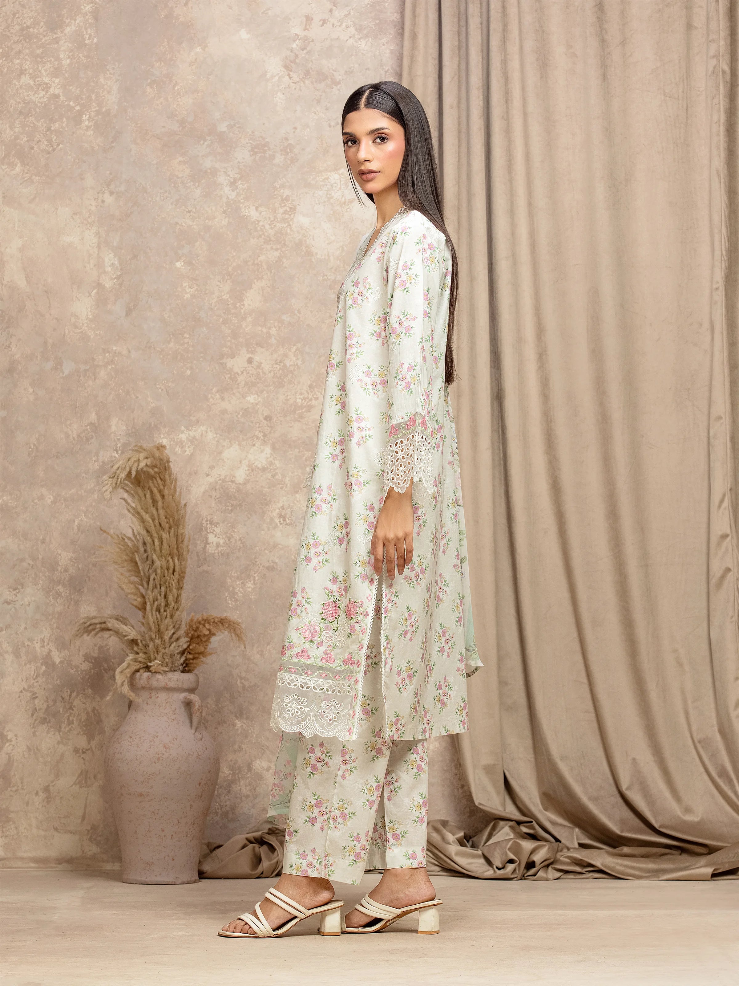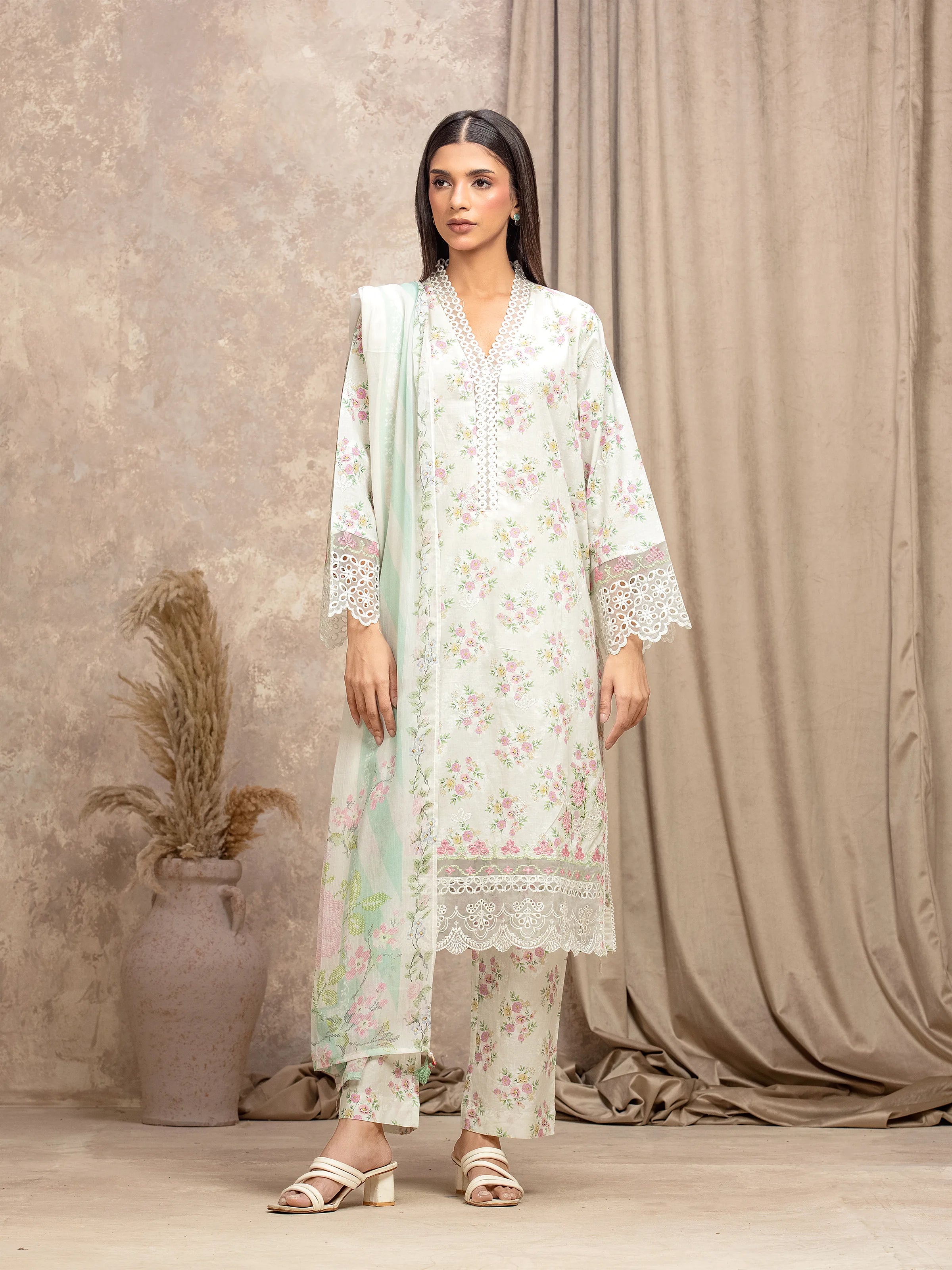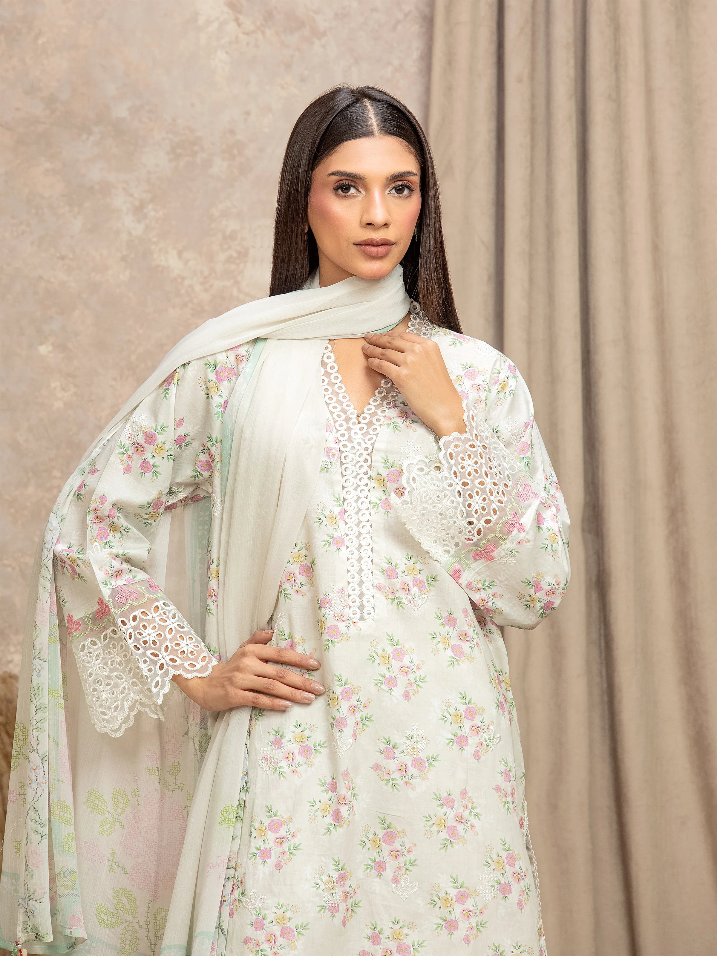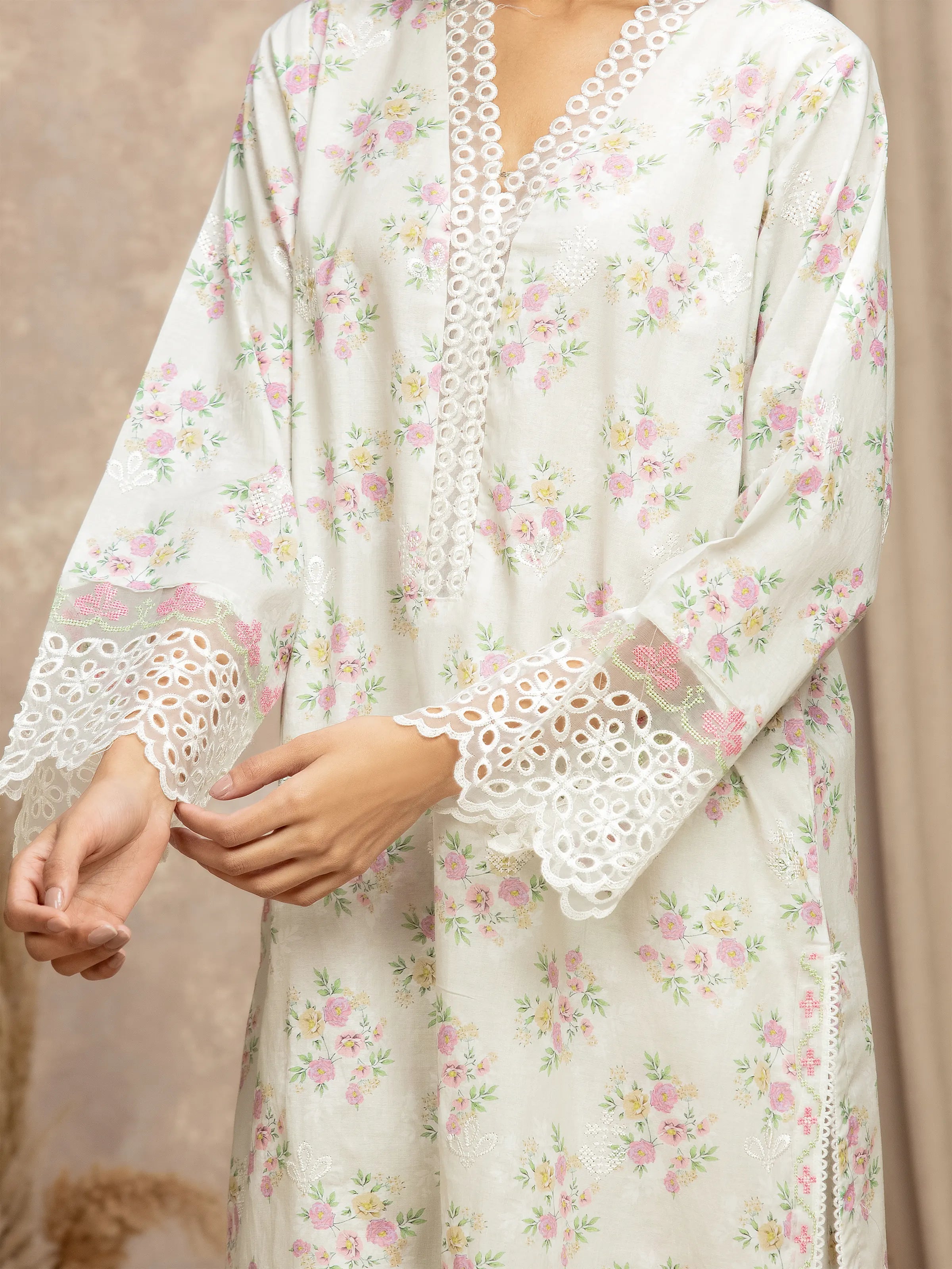 Style: Floral Printed Shirt with Organza Embroidered Trims on Neckline, Sleeves, & Daman, and Lace on Chalk