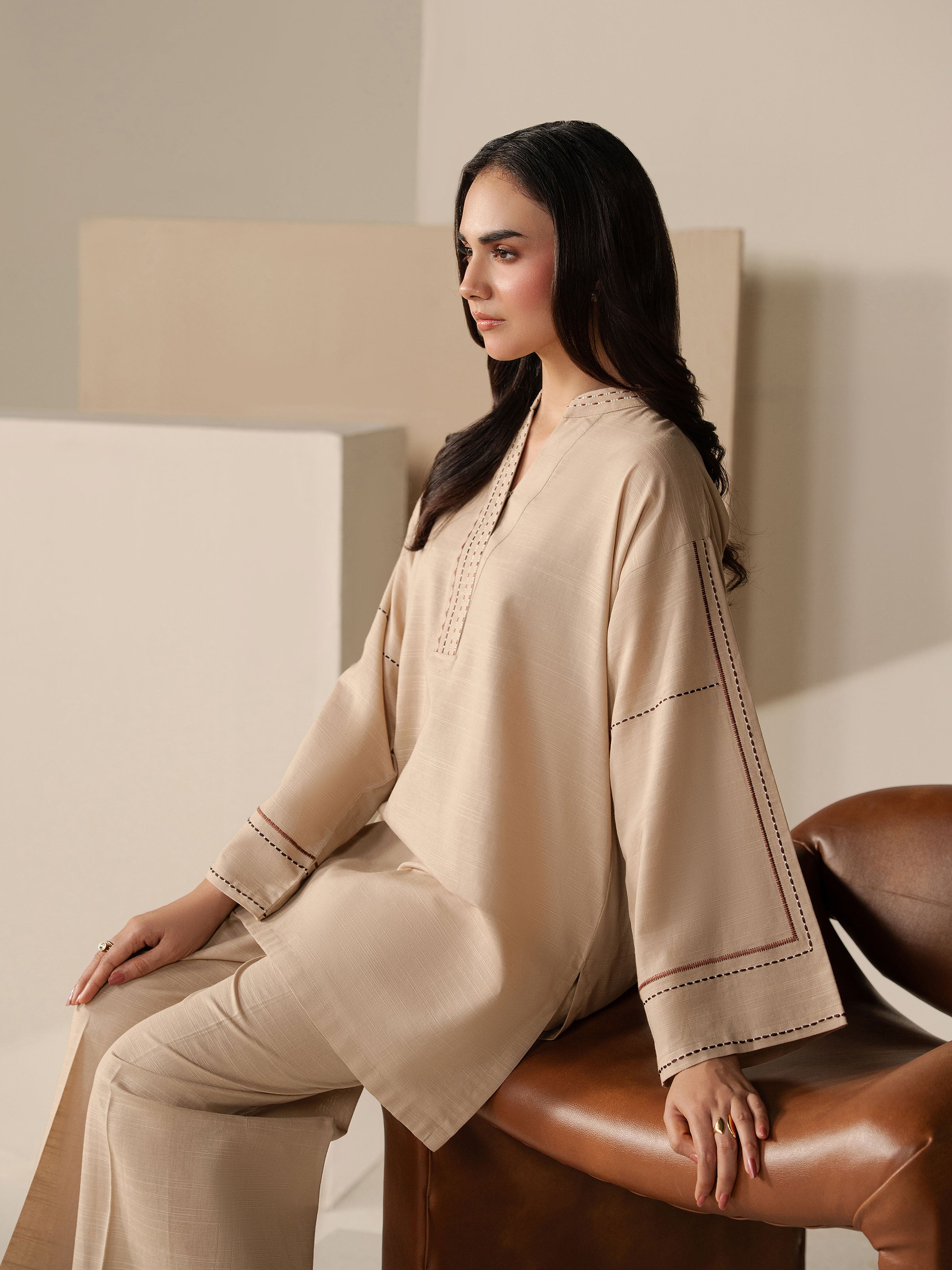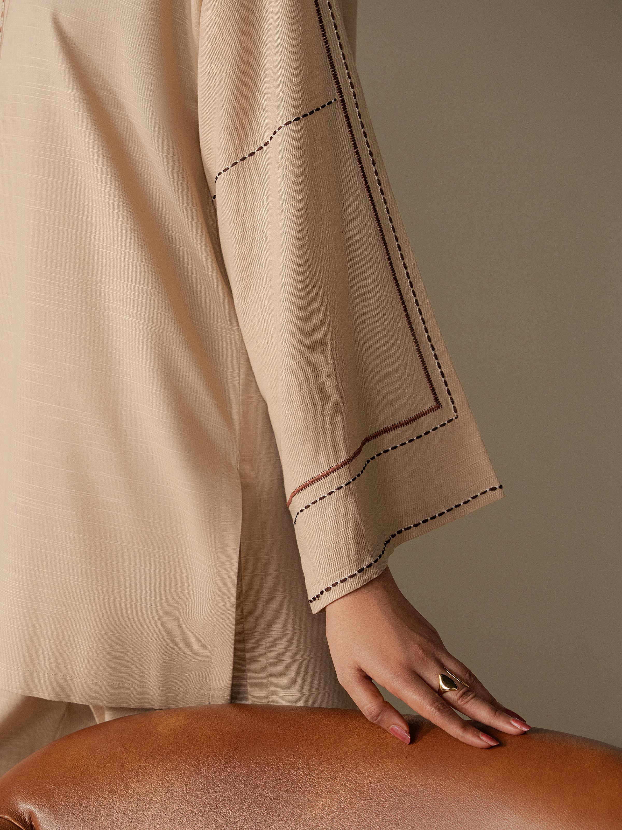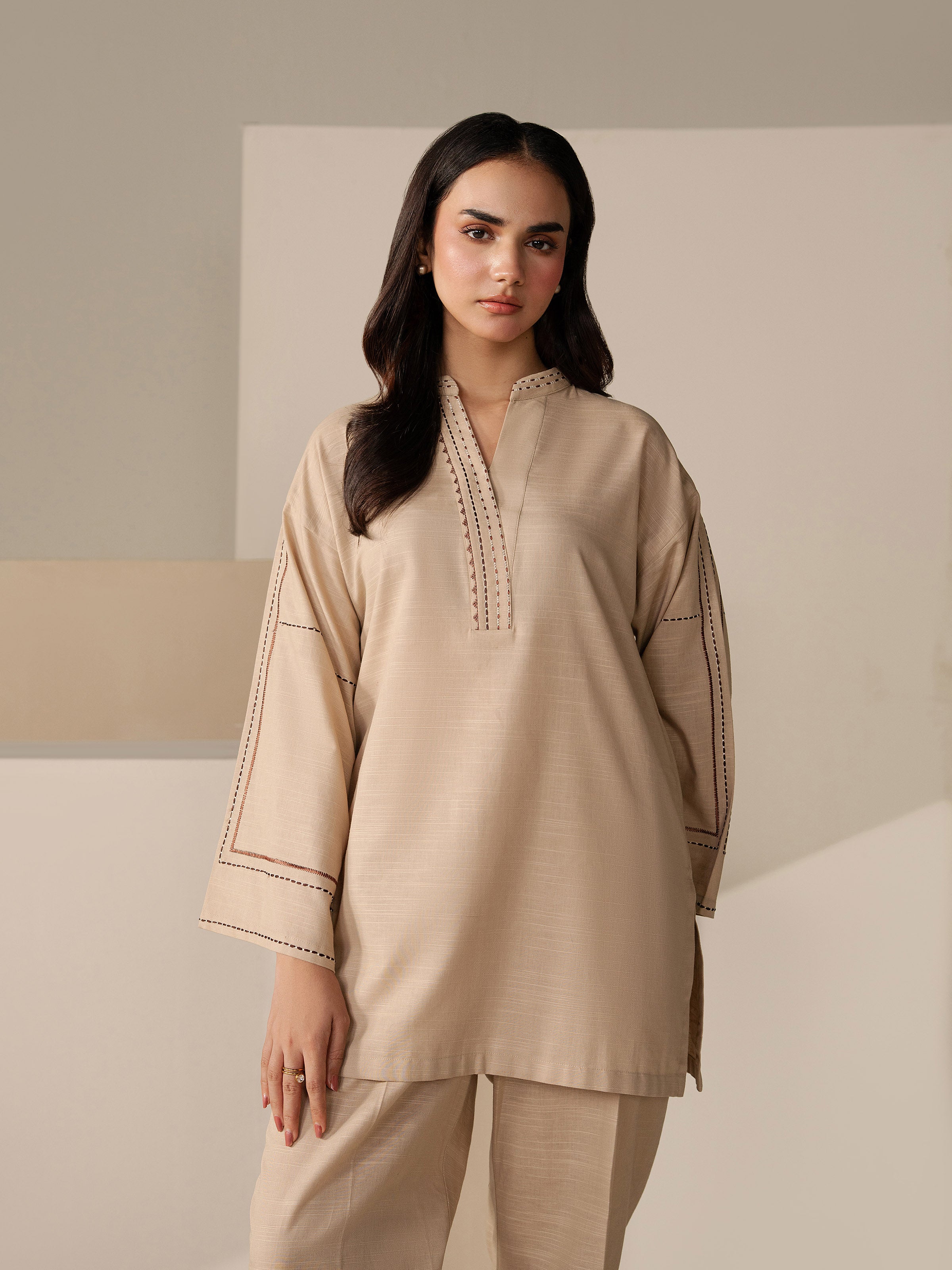 - Style: Plain Short Length Shirt with Thread Work Embroidery on Neck, Placket & Sleeves