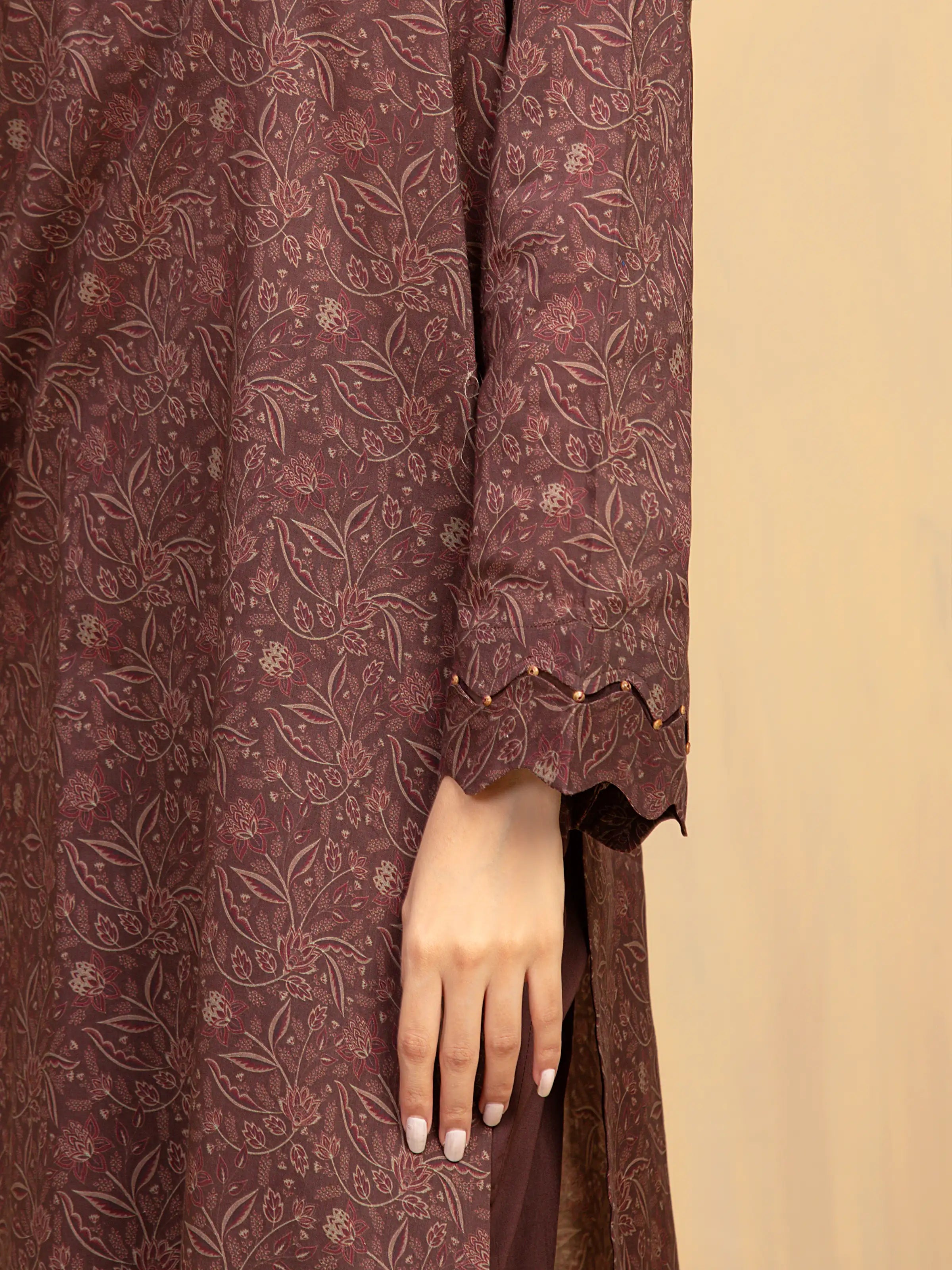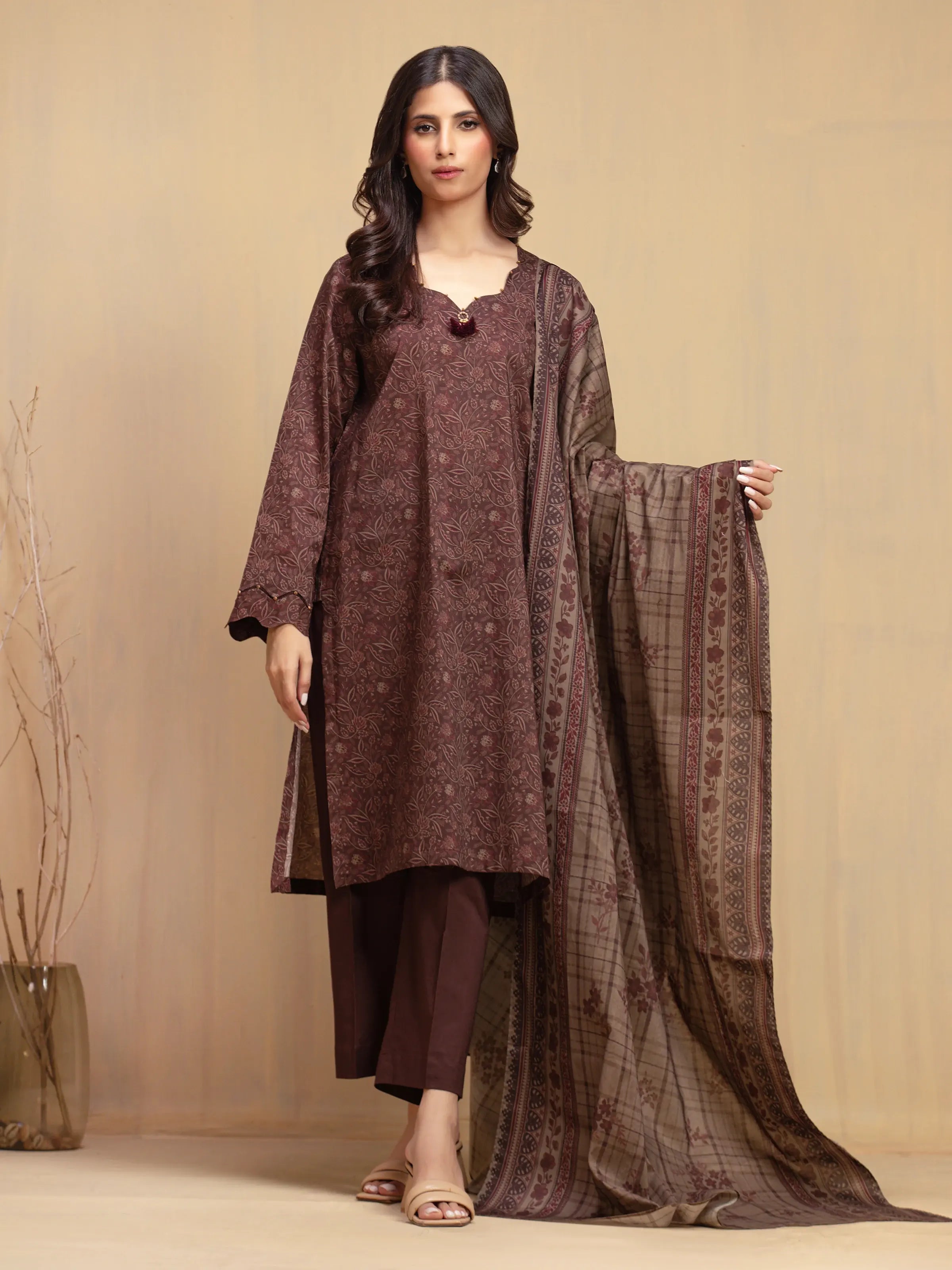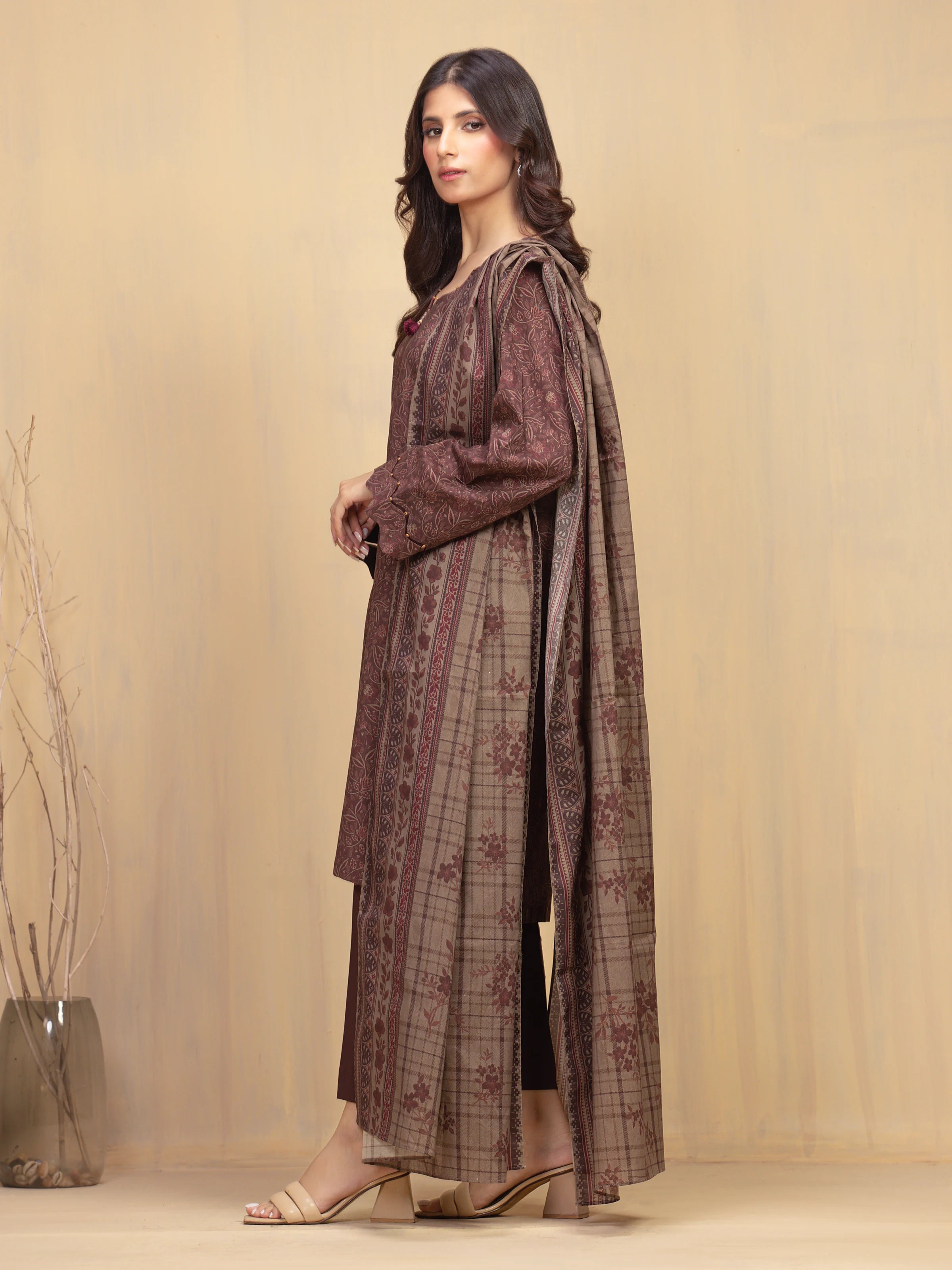 Unstitched Dark Brown Printed Khaddar 3 Piece