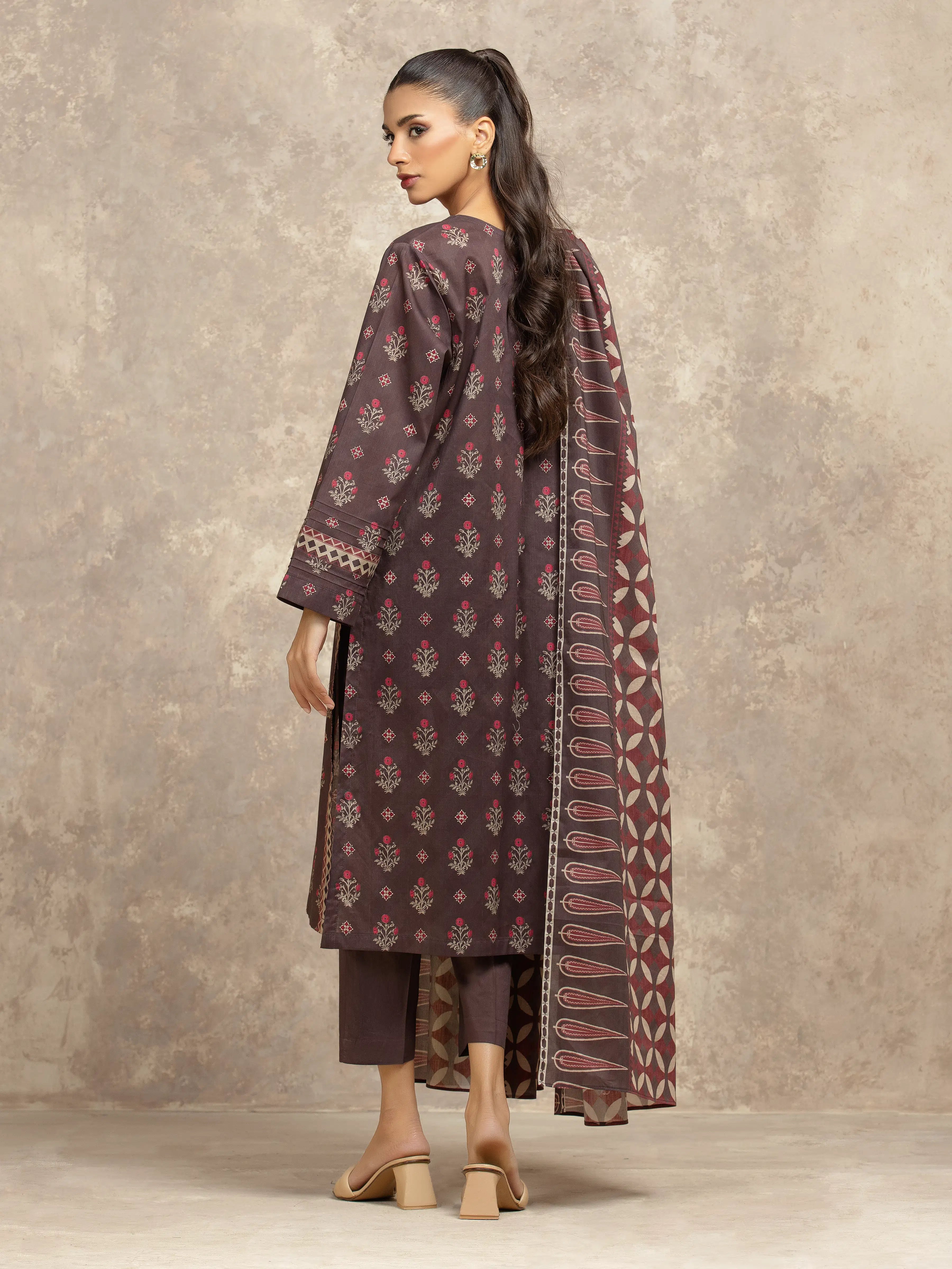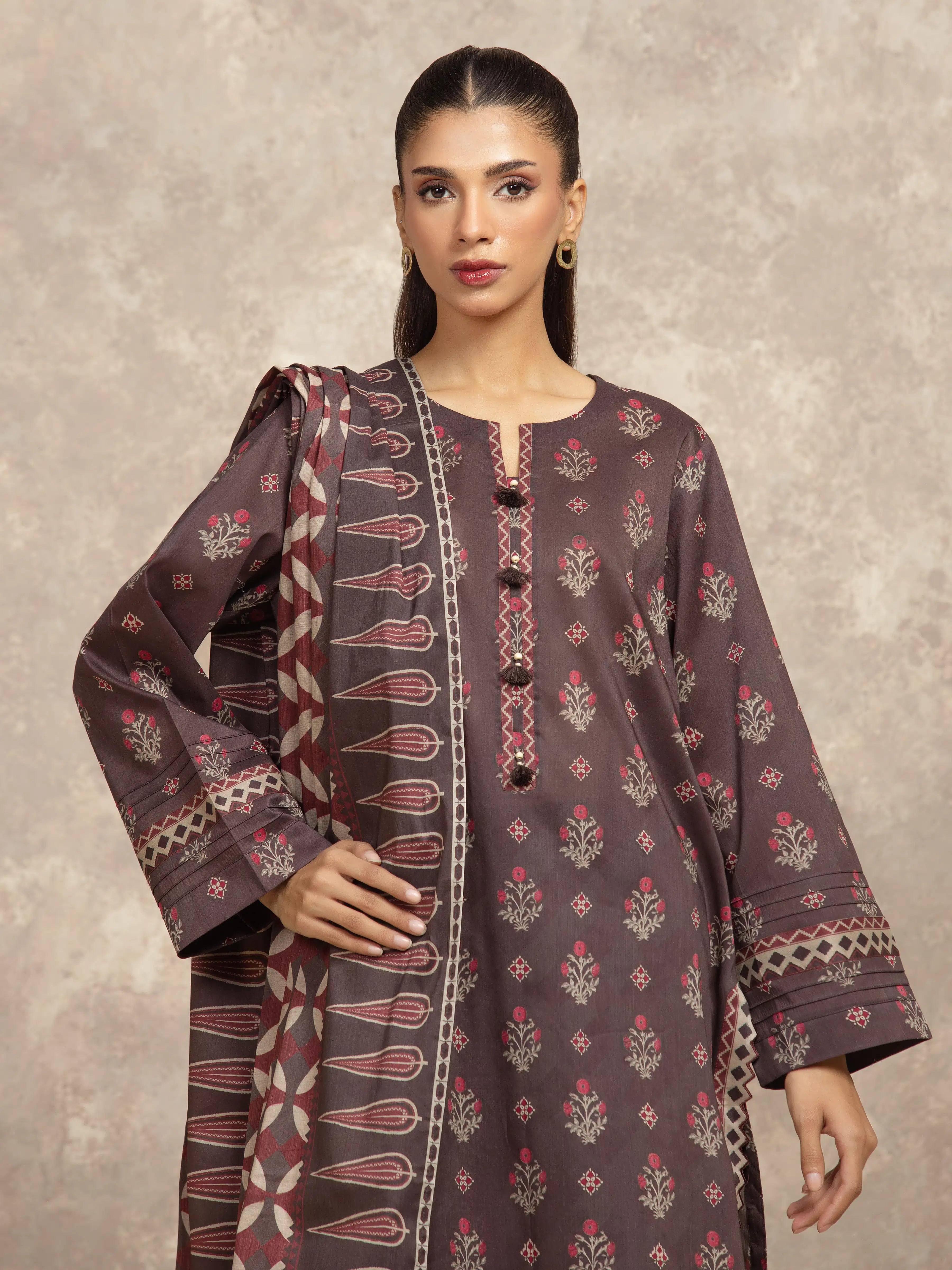 Unstitched Dark Brown Printed Khaddar 3 Piece