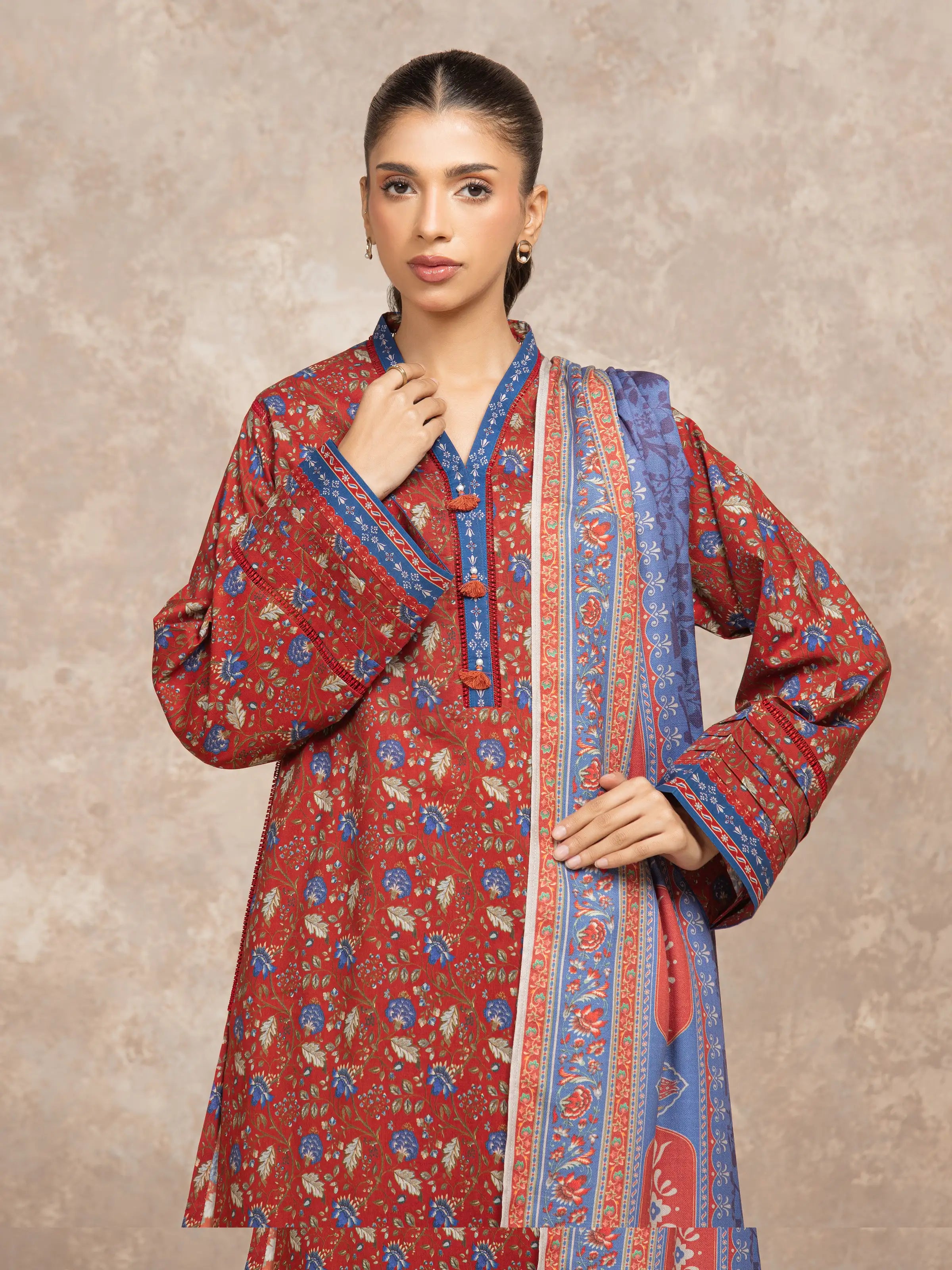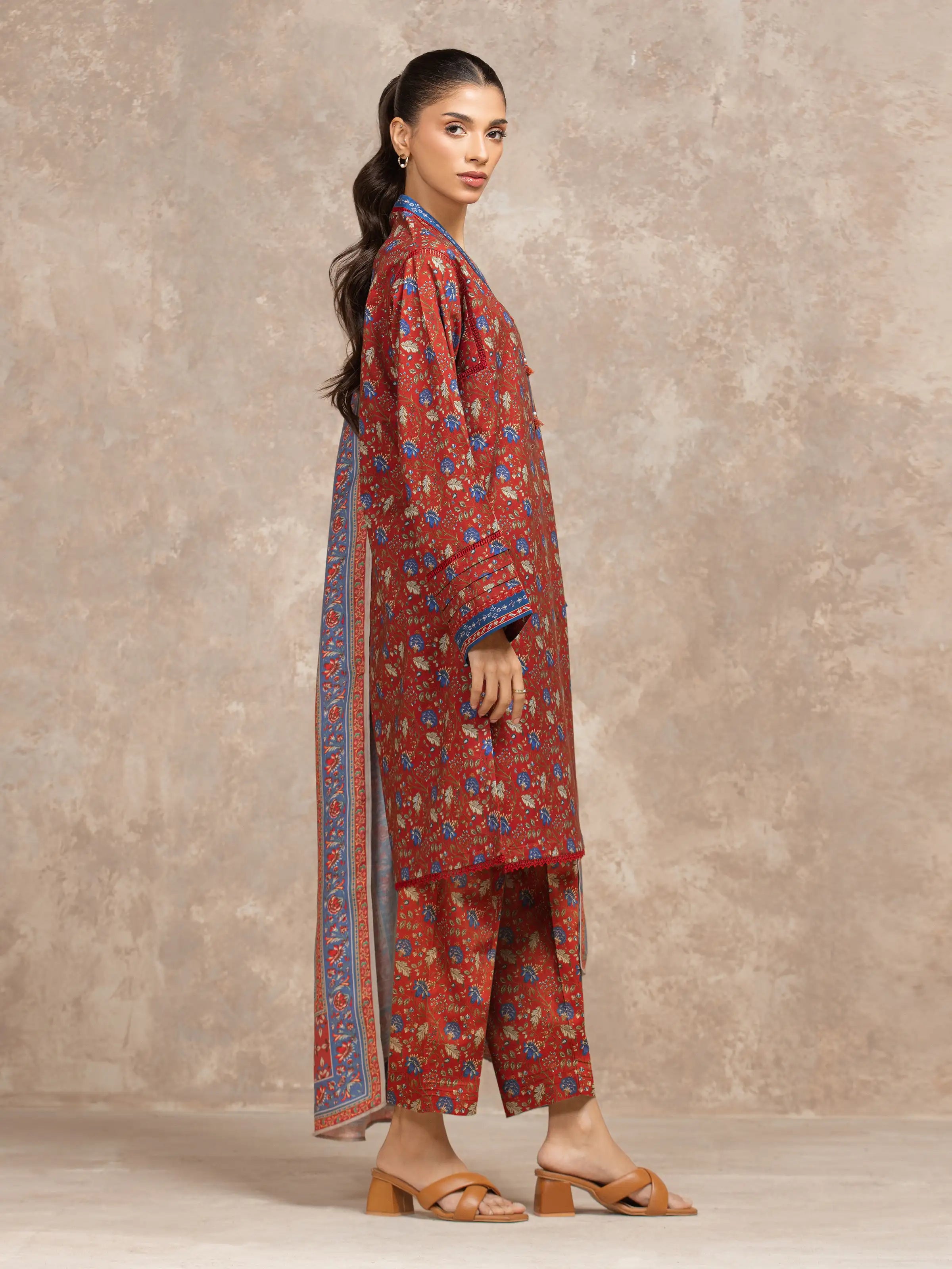 Unstitched Dark Rust Printed Khaddar 3 Piece