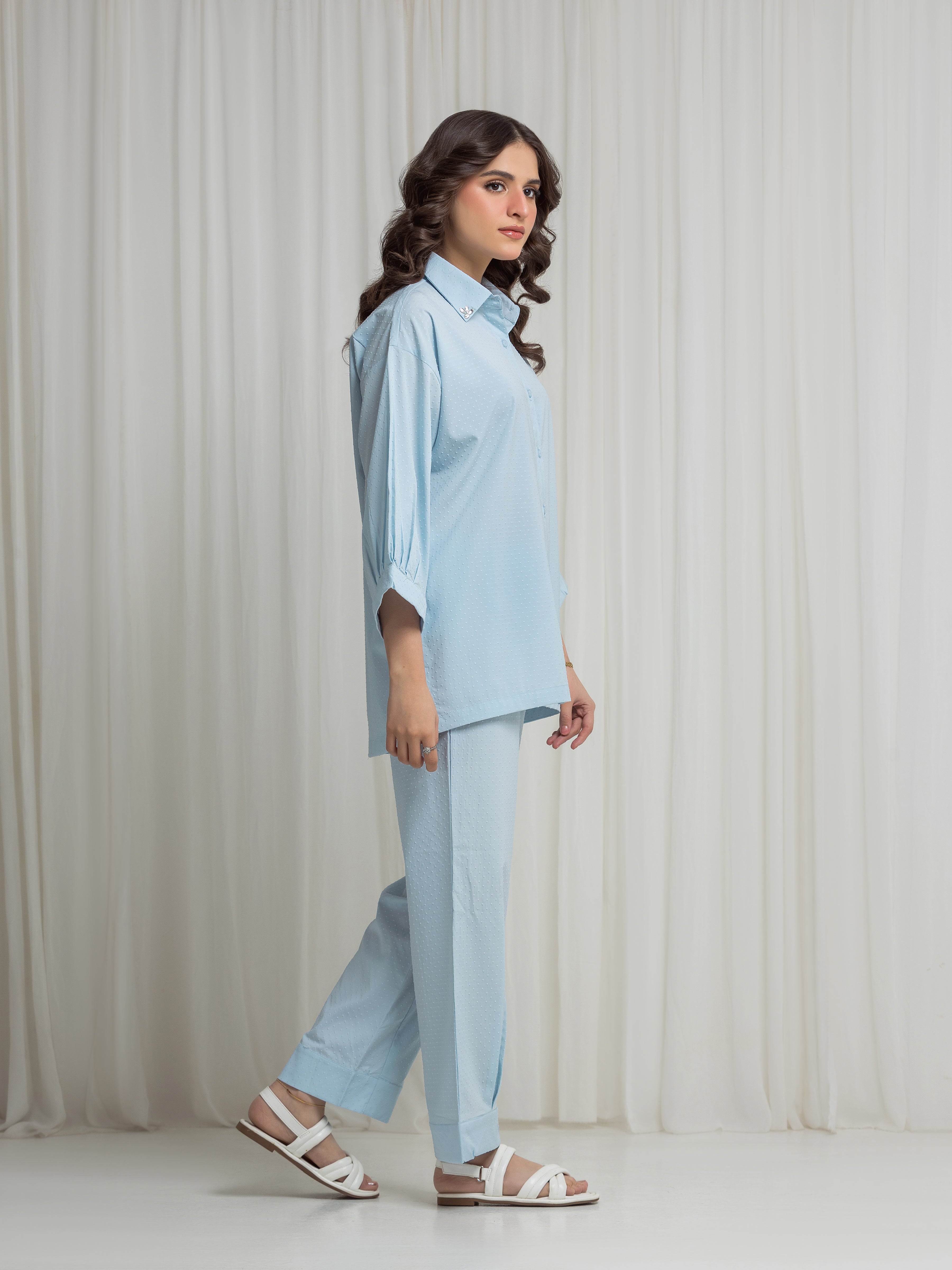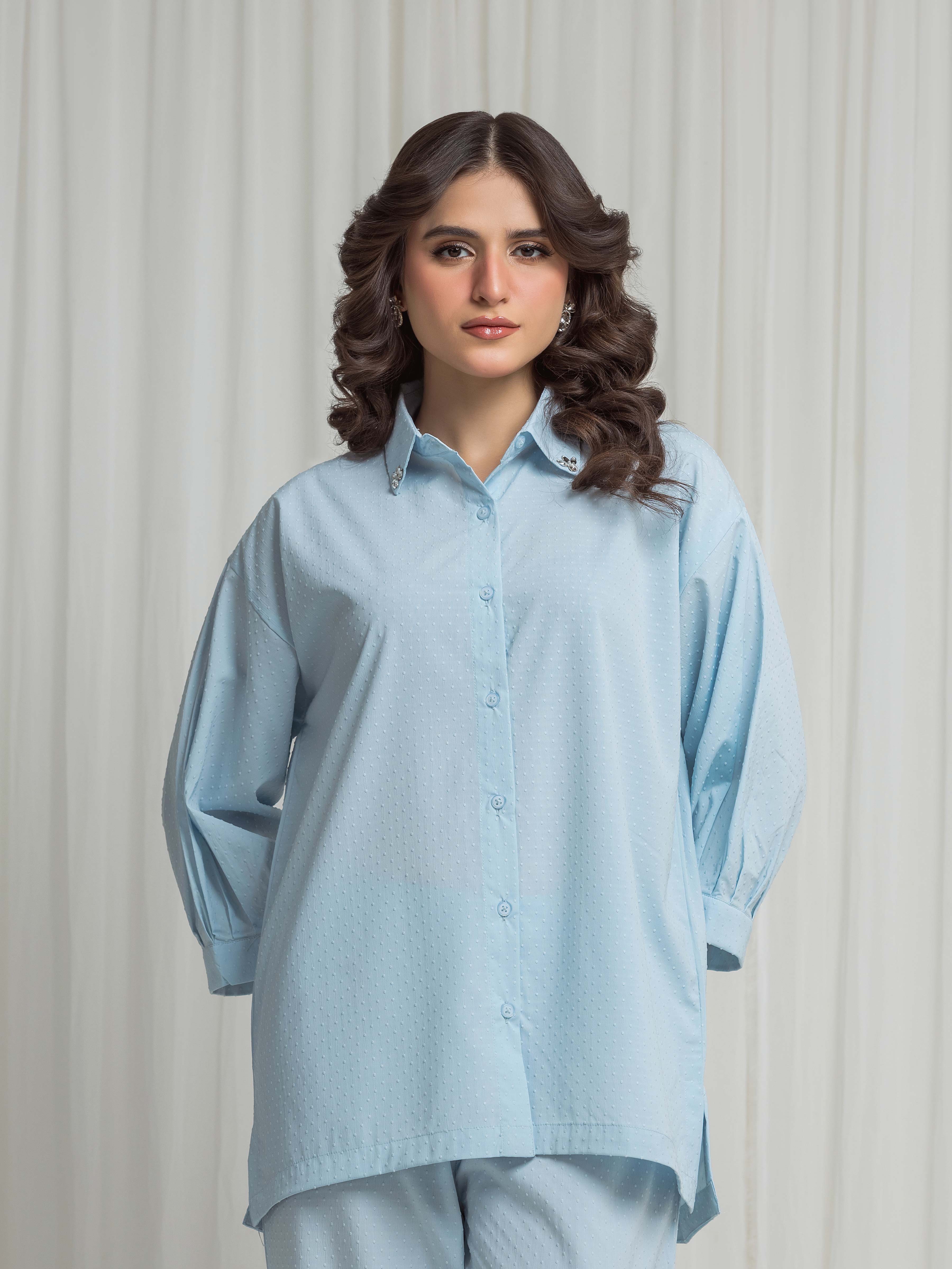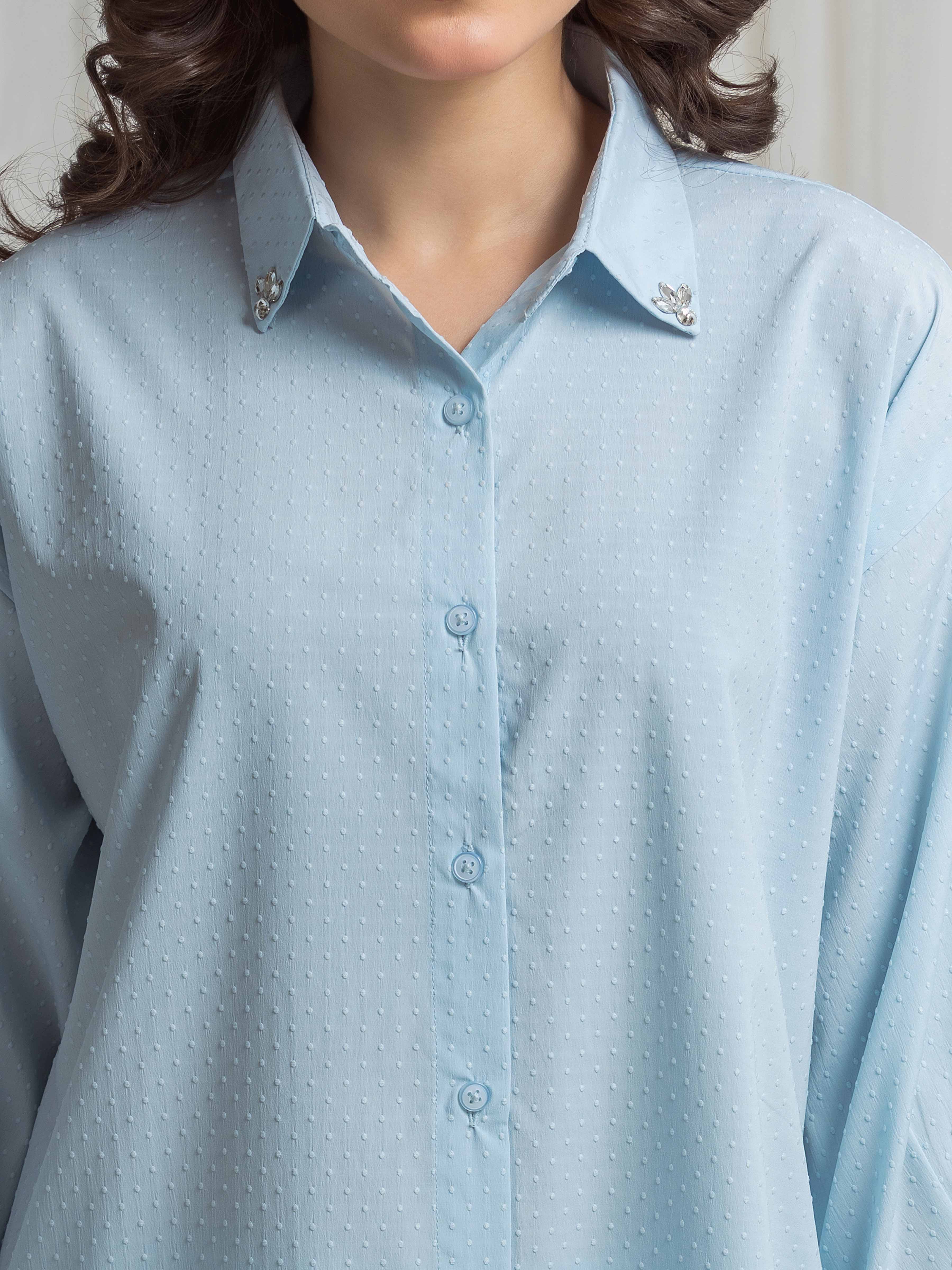 Style: Textured Short Length Shirt with Buttons on Front & Detailing on Collar