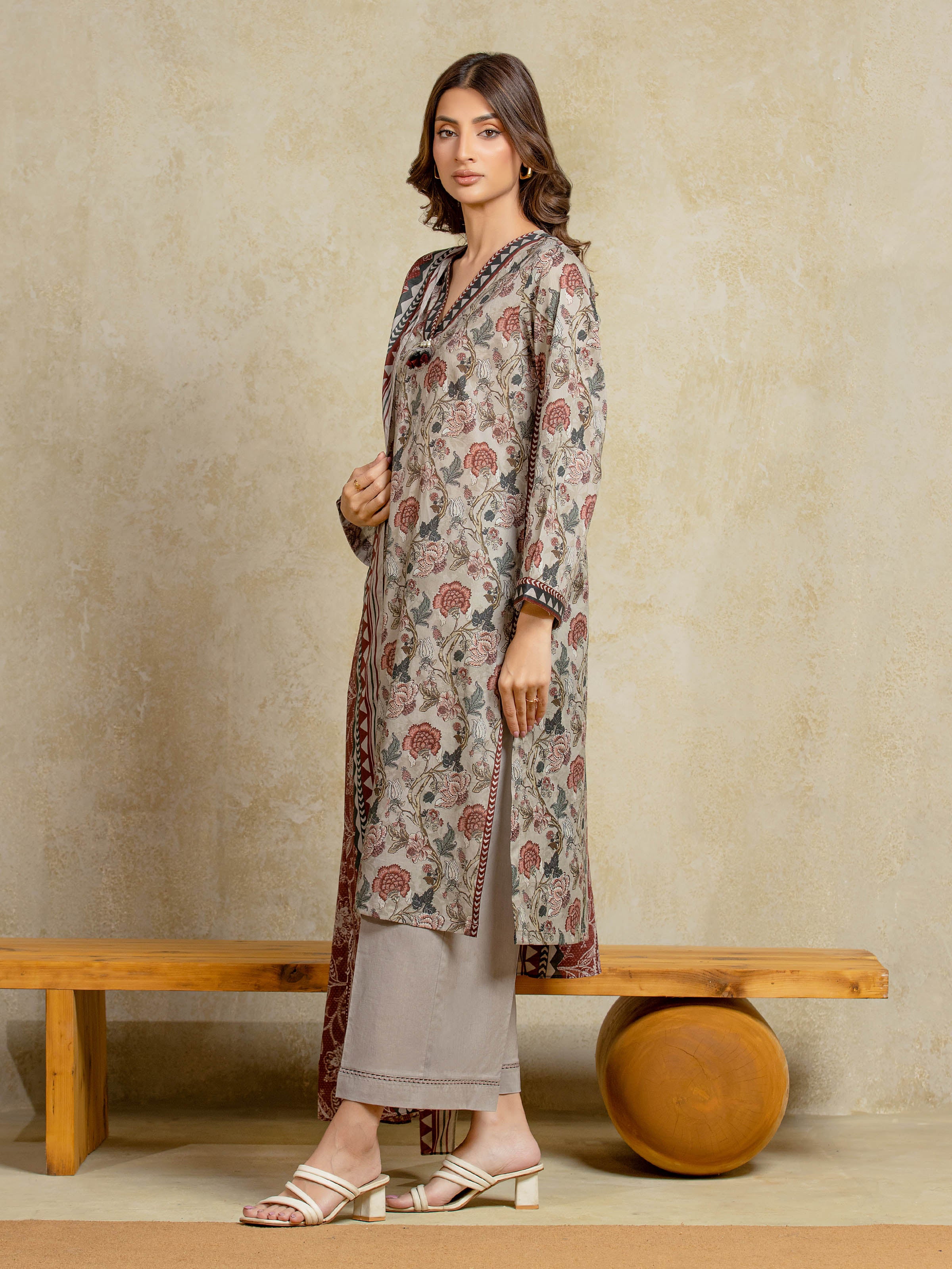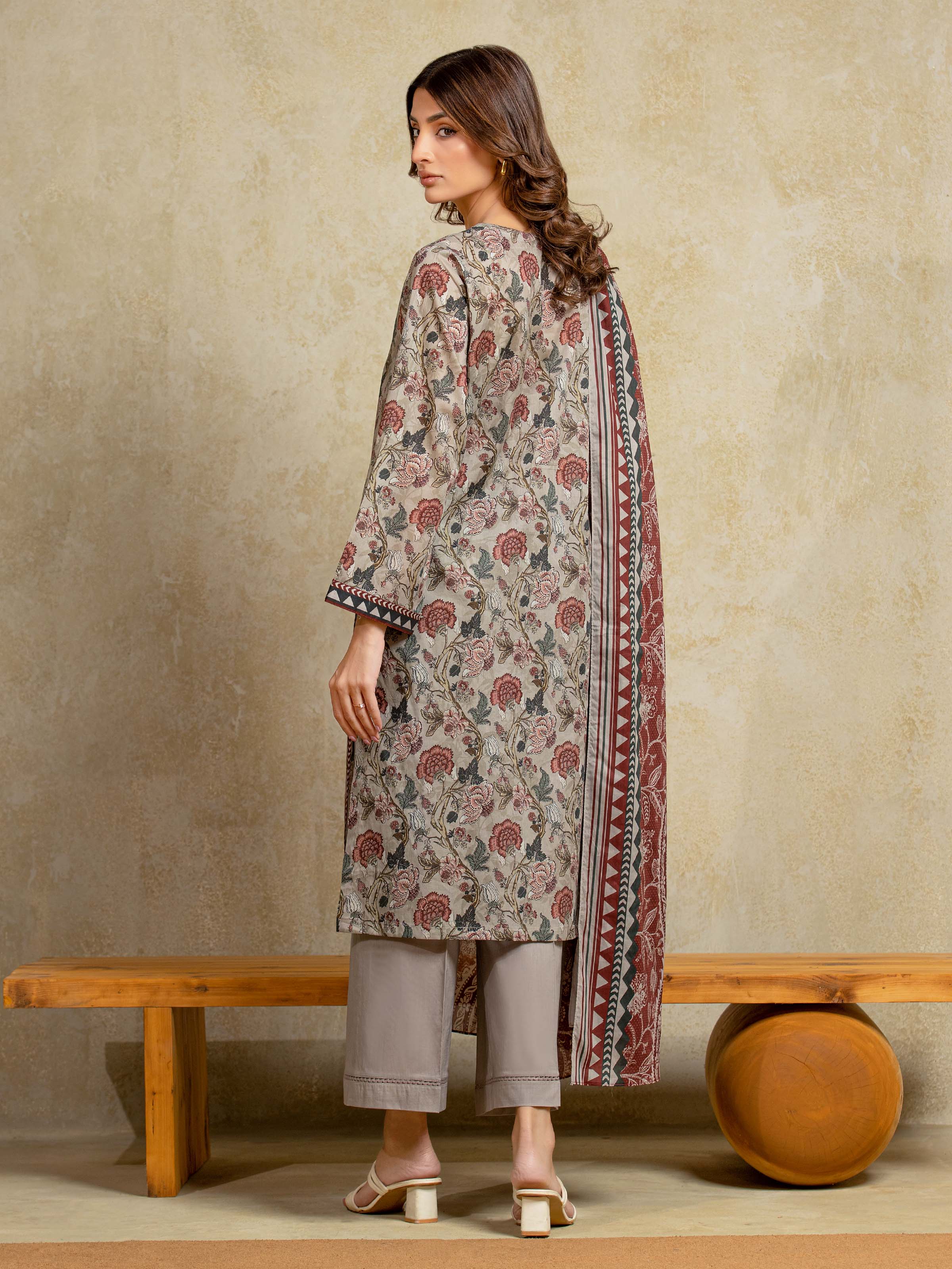 Unstitched Dark Beige Printed Khaddar 3 Piece