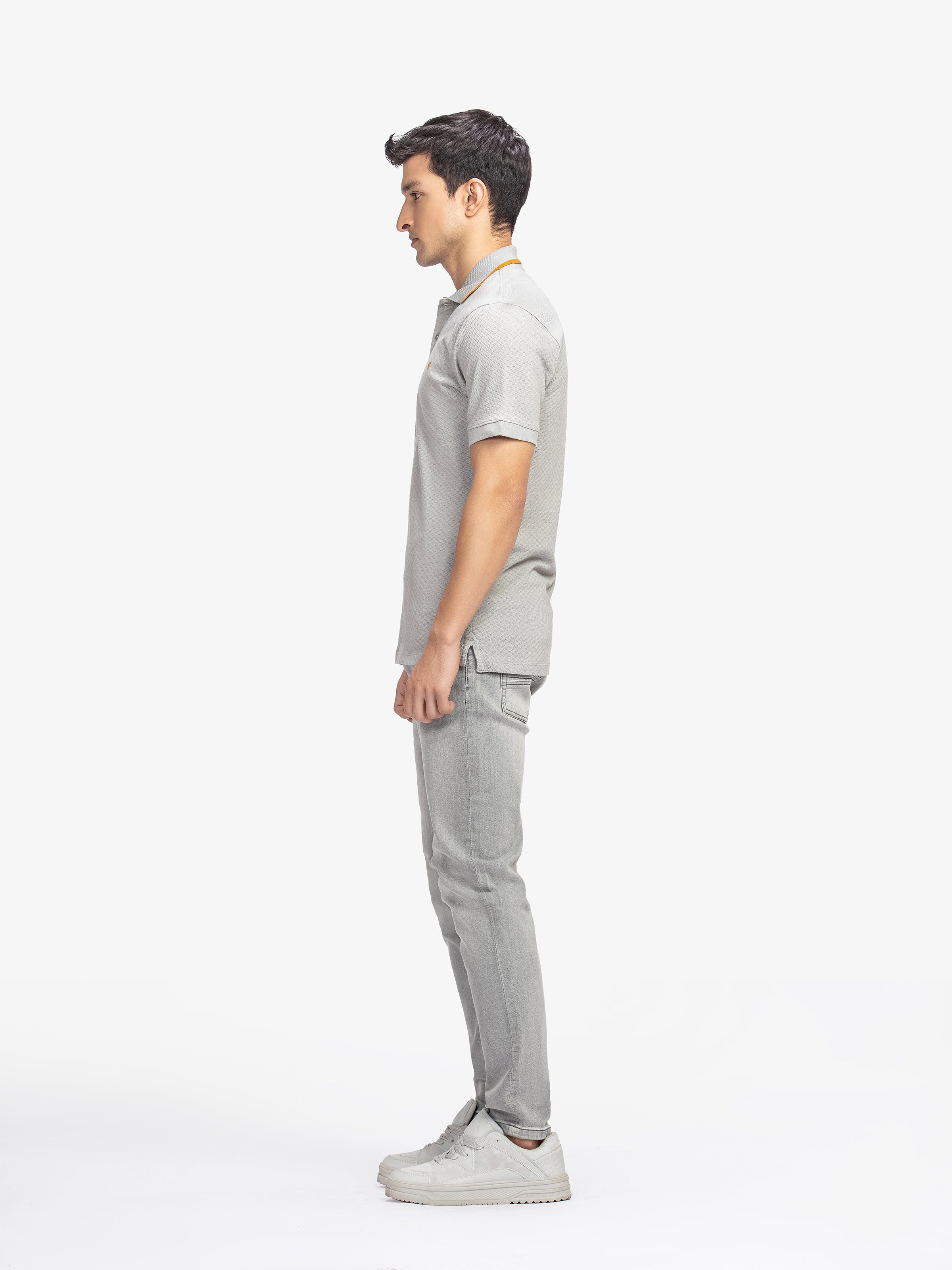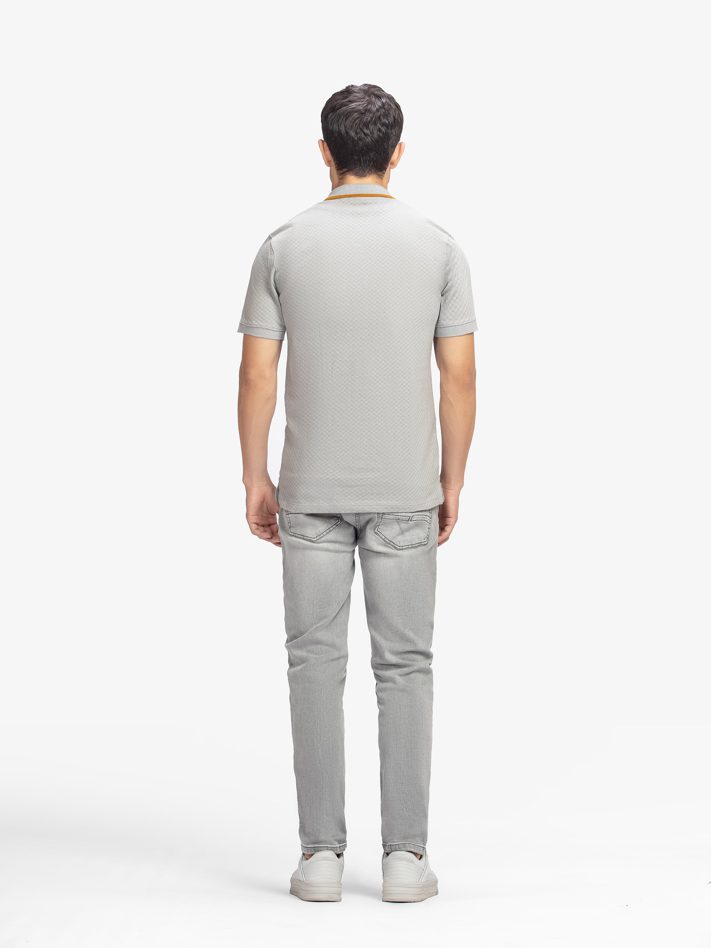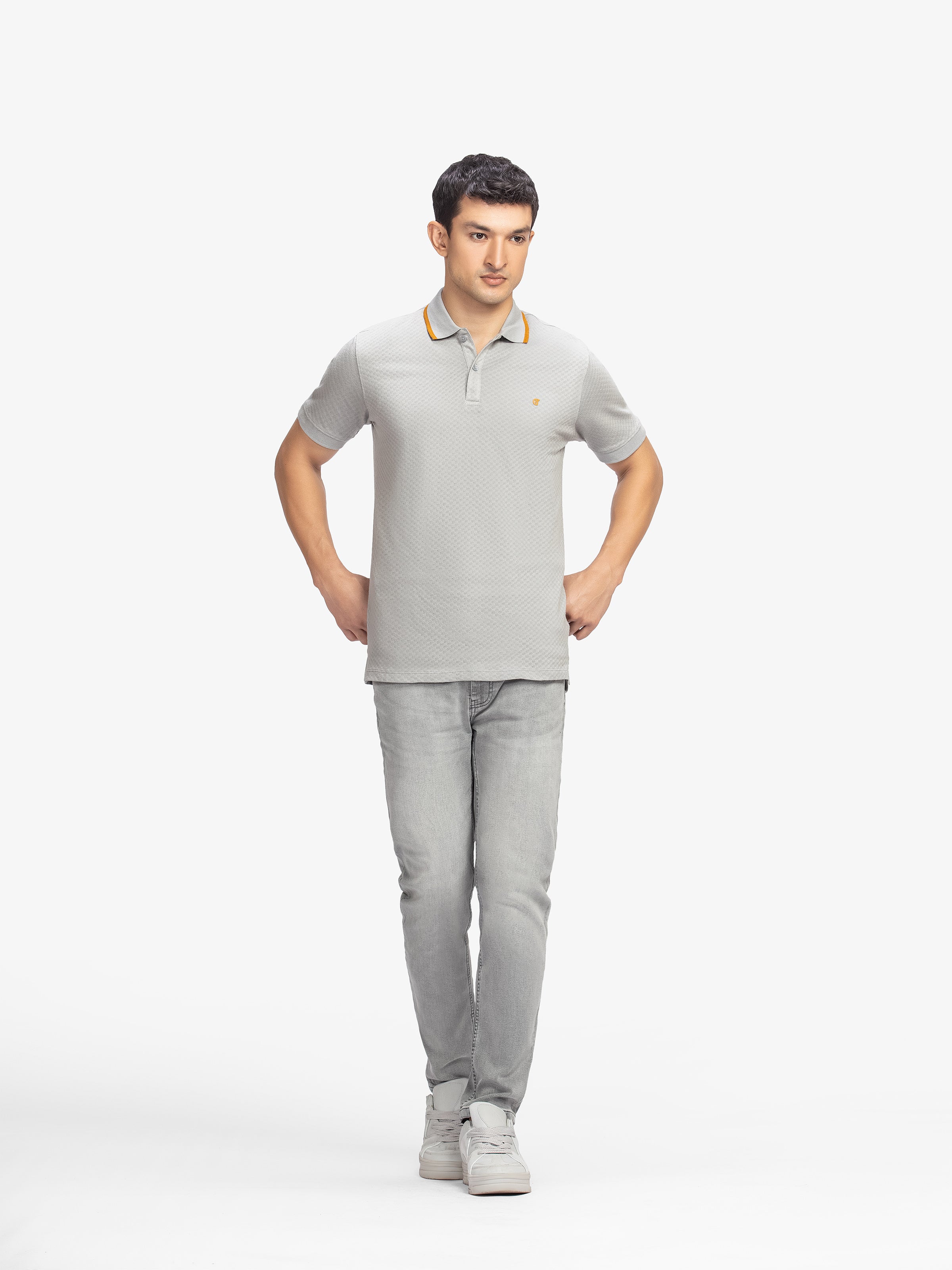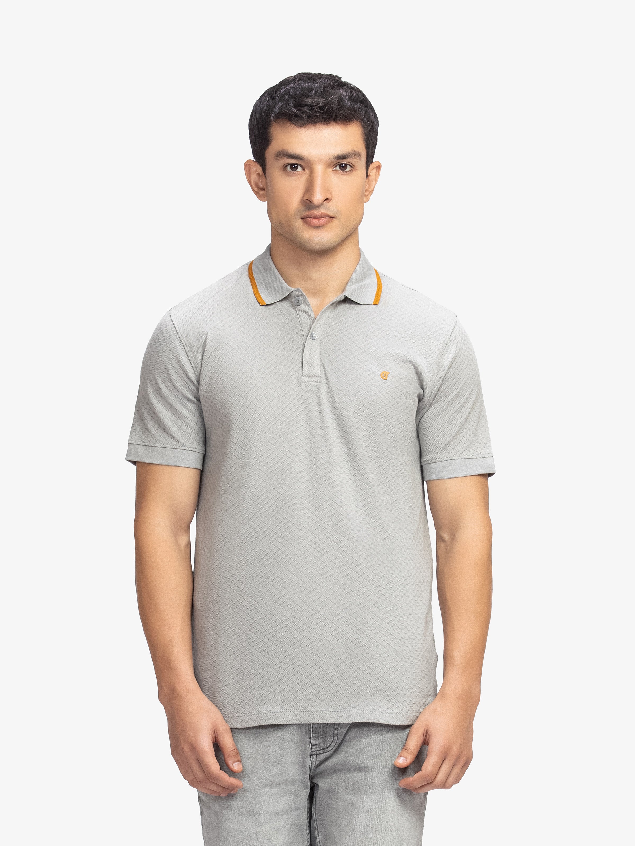 - Style: Textured Polo Shirt with Printed Collar & Brand Logo on Front