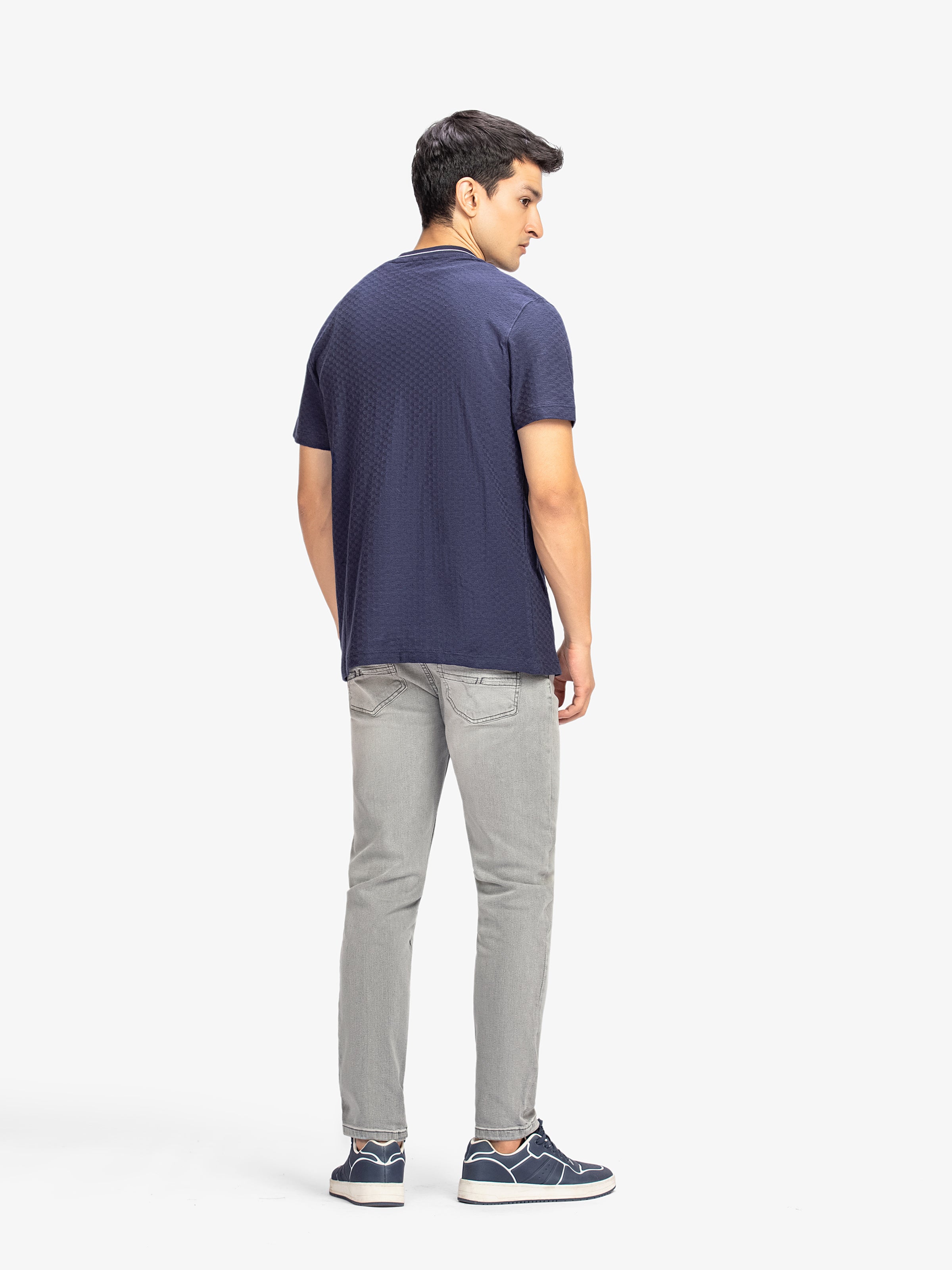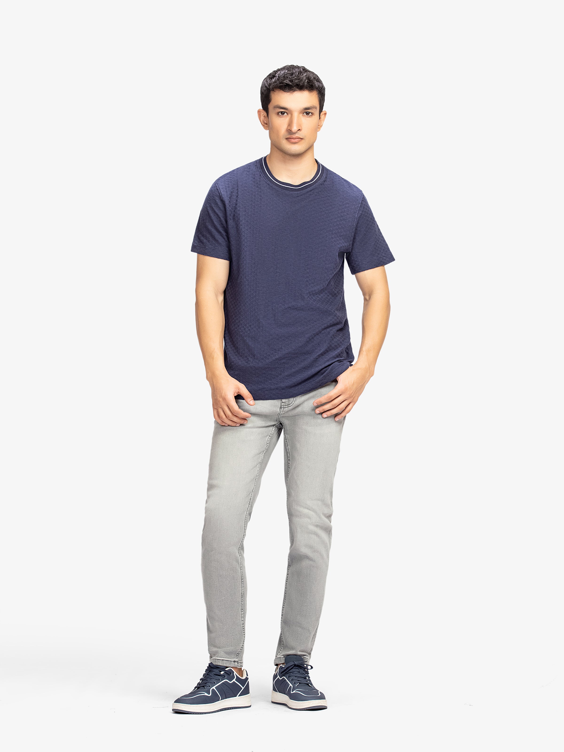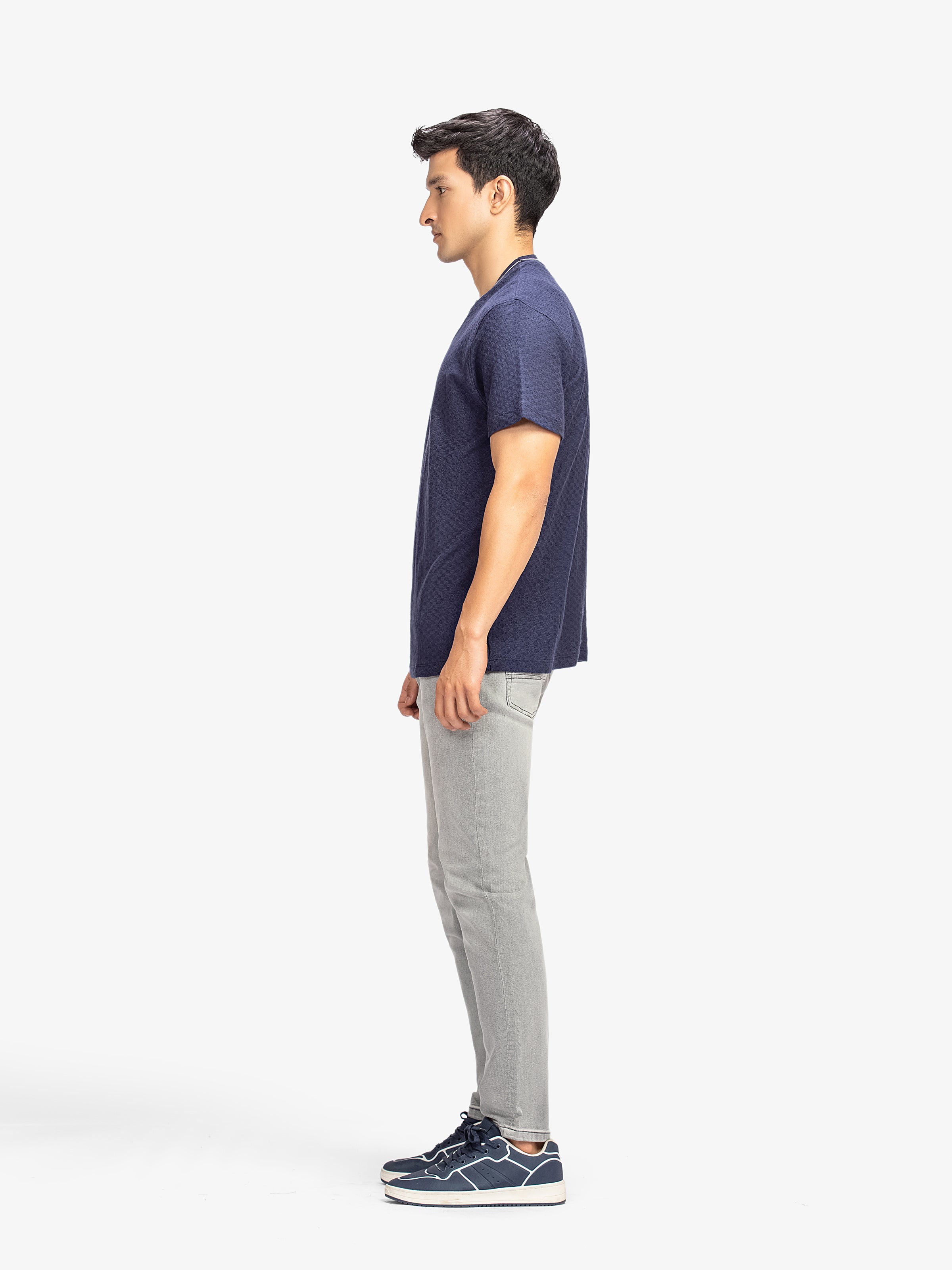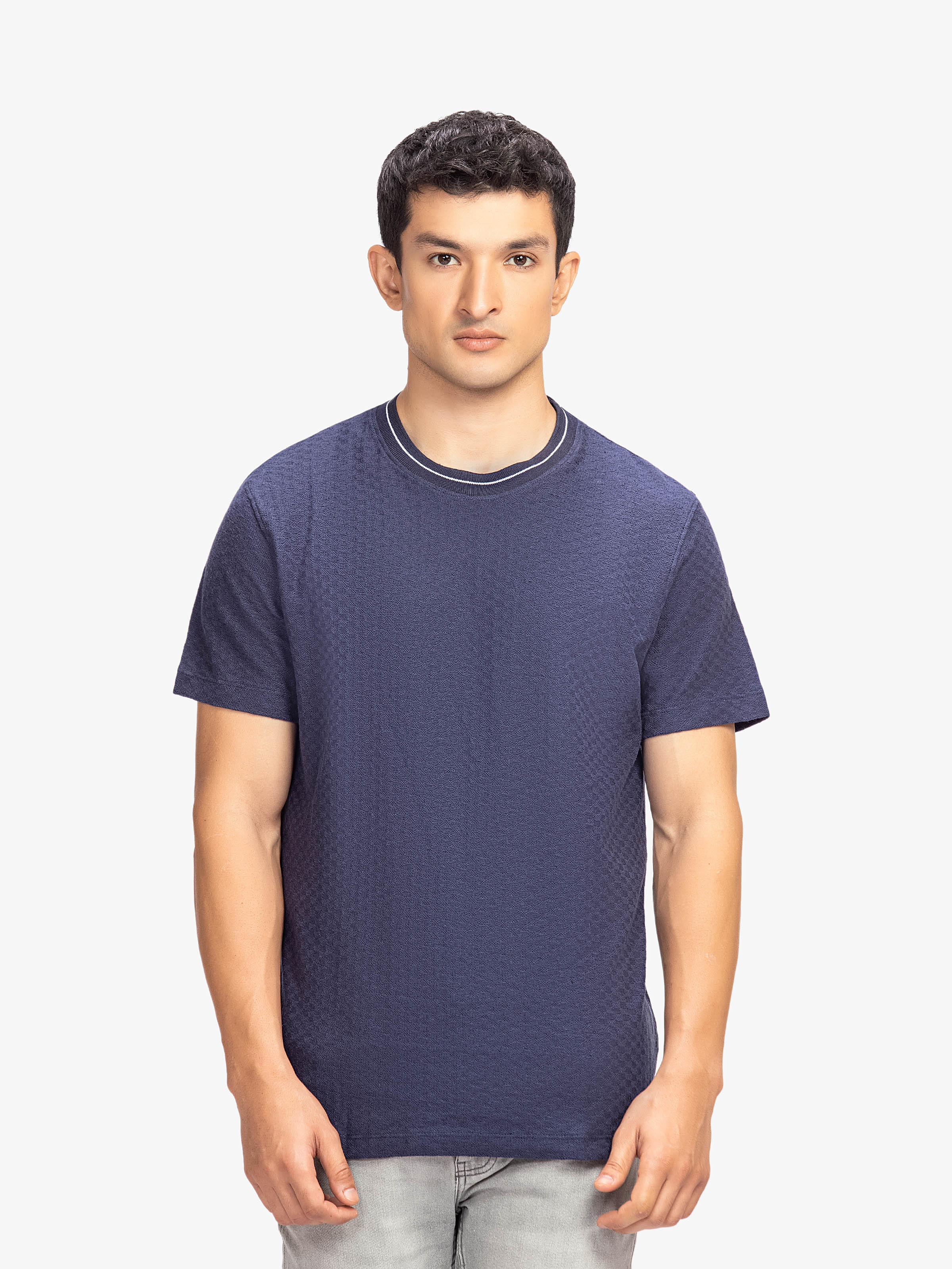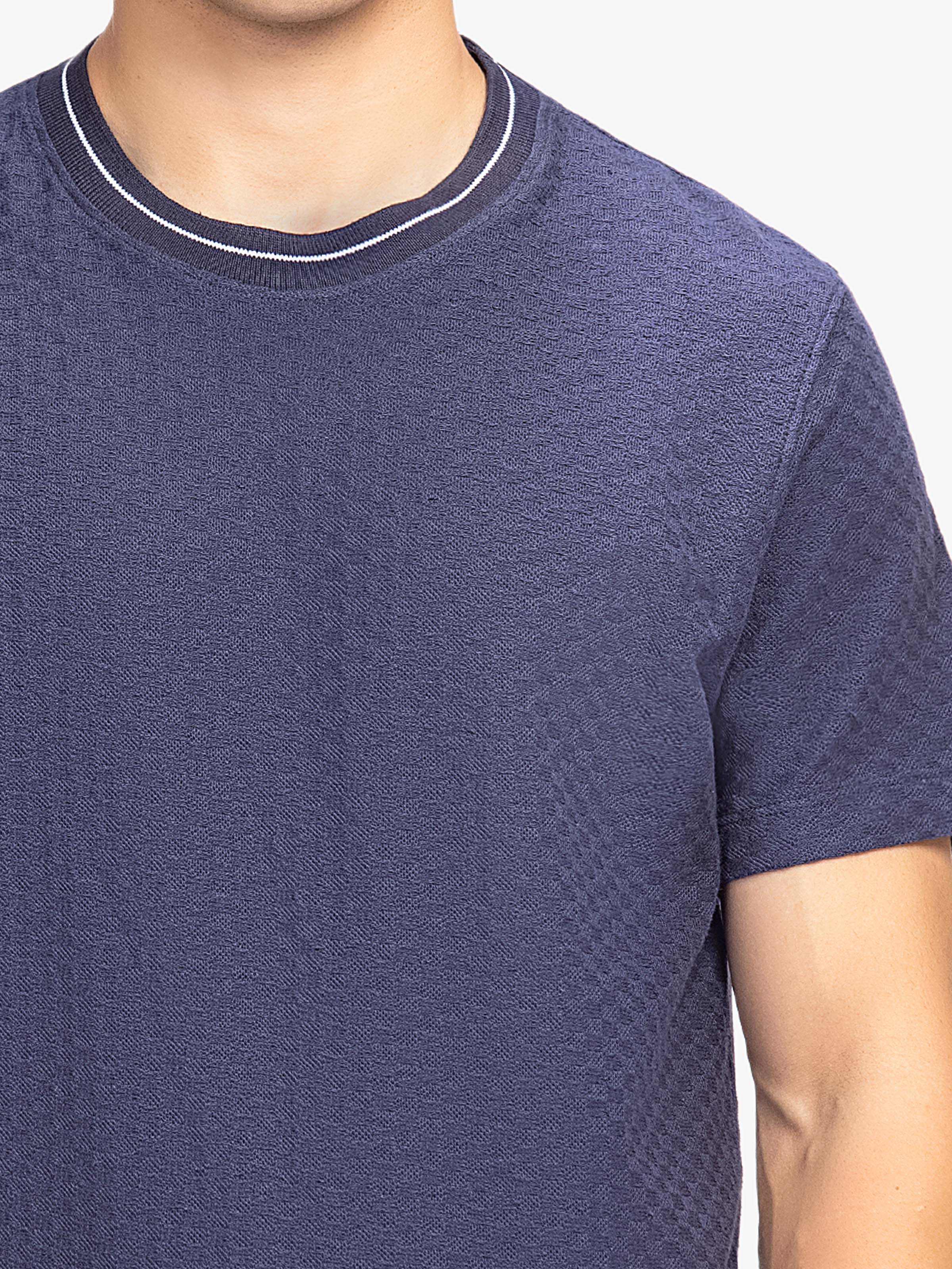 - Style: Textured T-shirt with Ribbed Neck