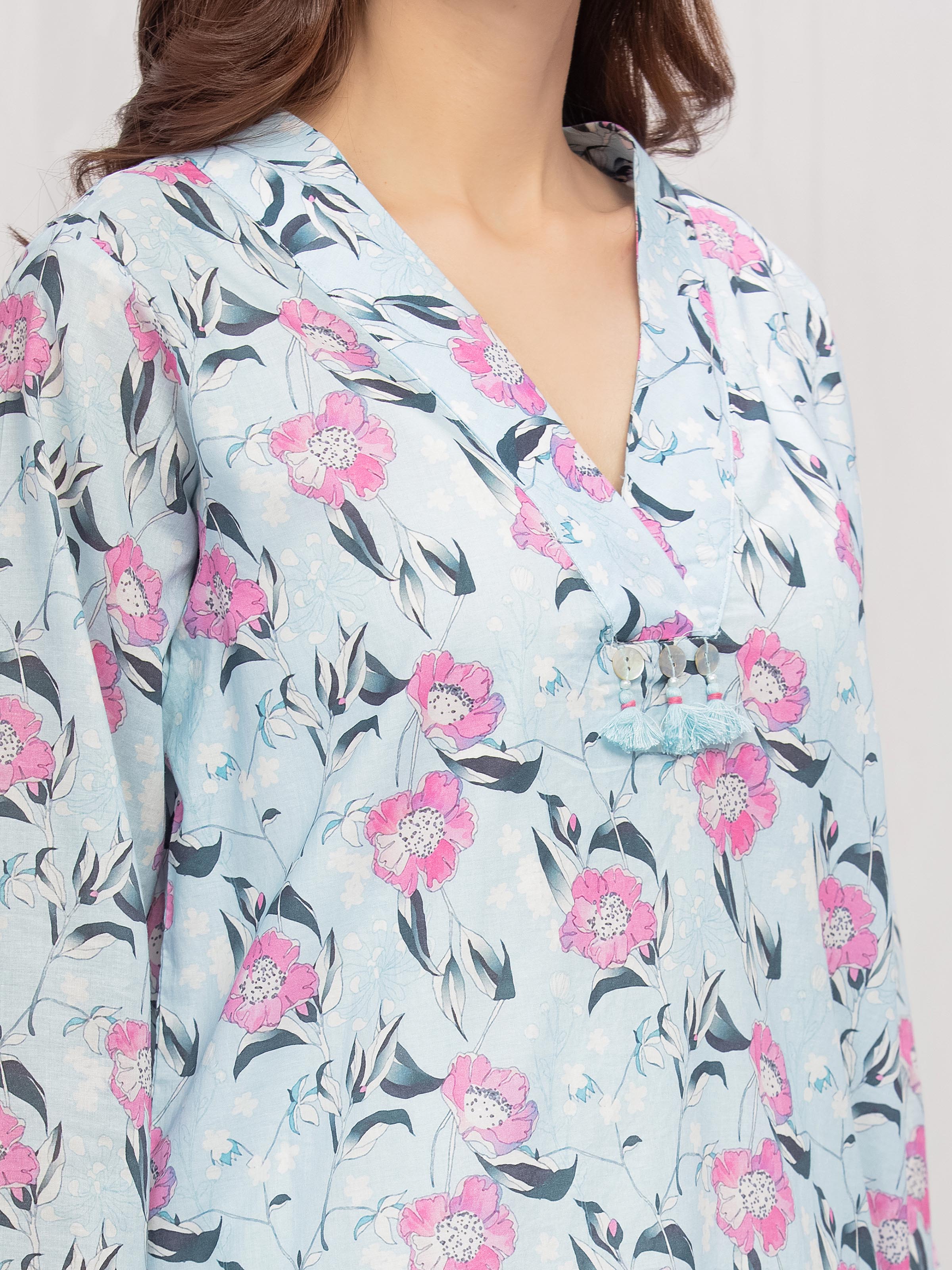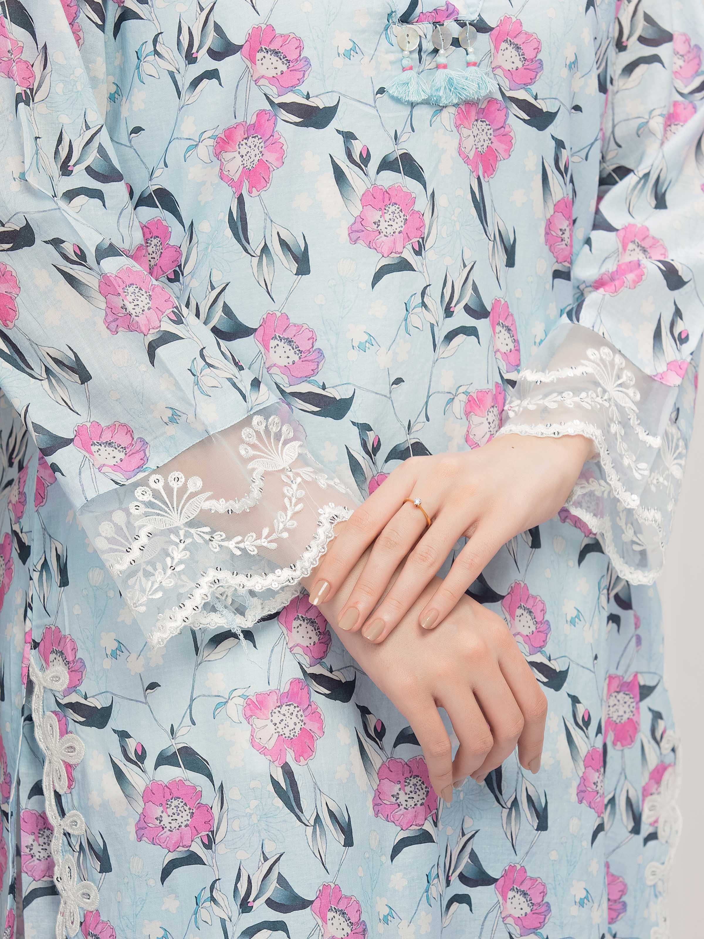Style: Printed Straight Short Length Shirt, Embroidered Organza Trims & Hand Embellishment On Placket