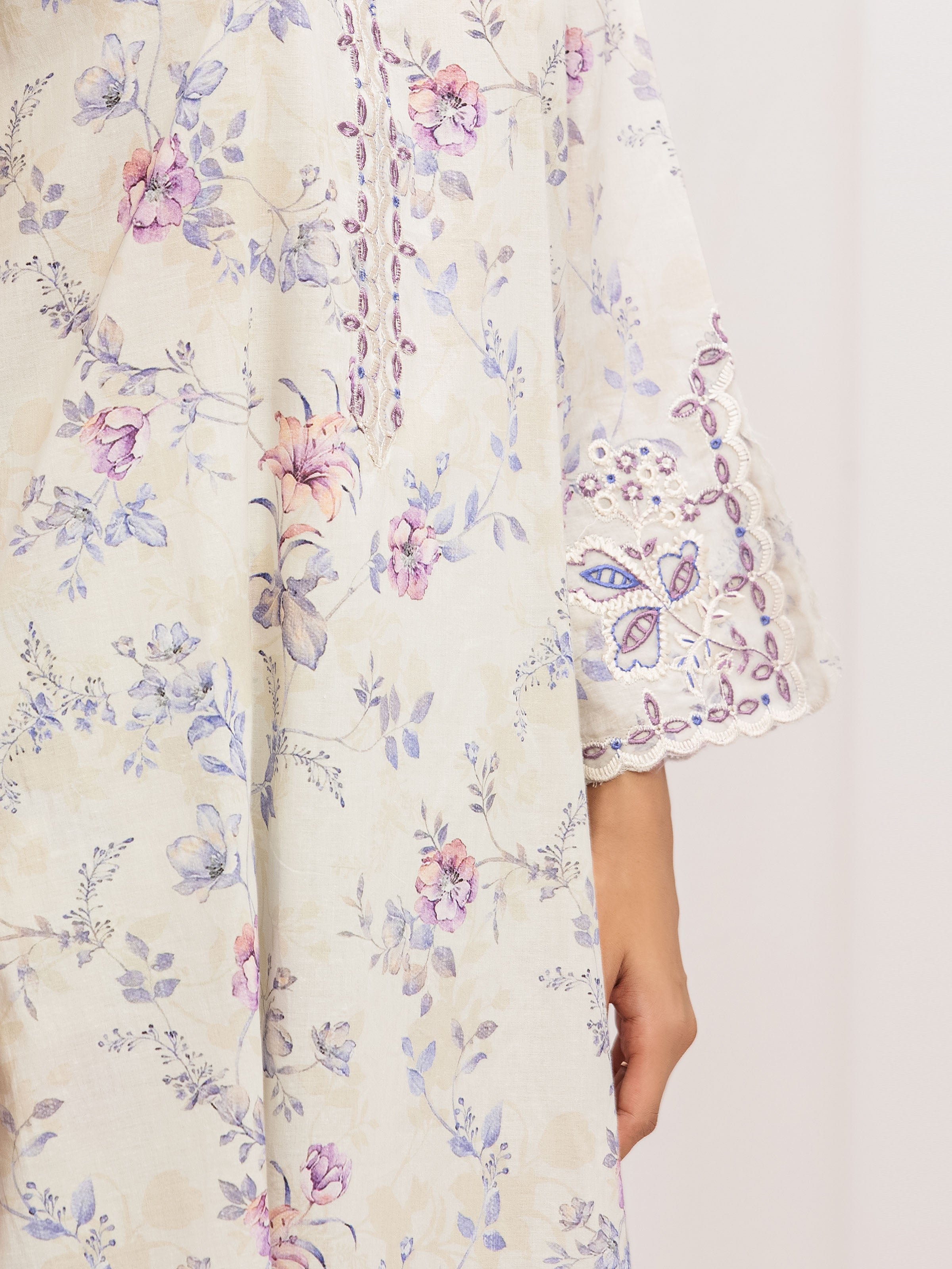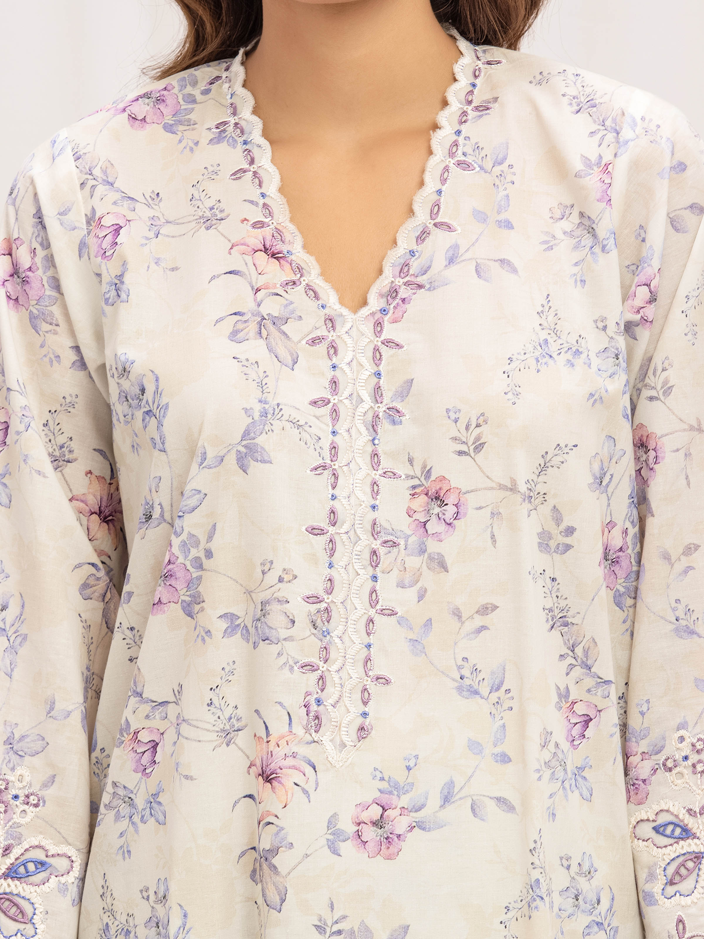 - Style: Floral Printed Shirt Embroidered Placket & Sleeves, and Organza Embroidered Border on Daman