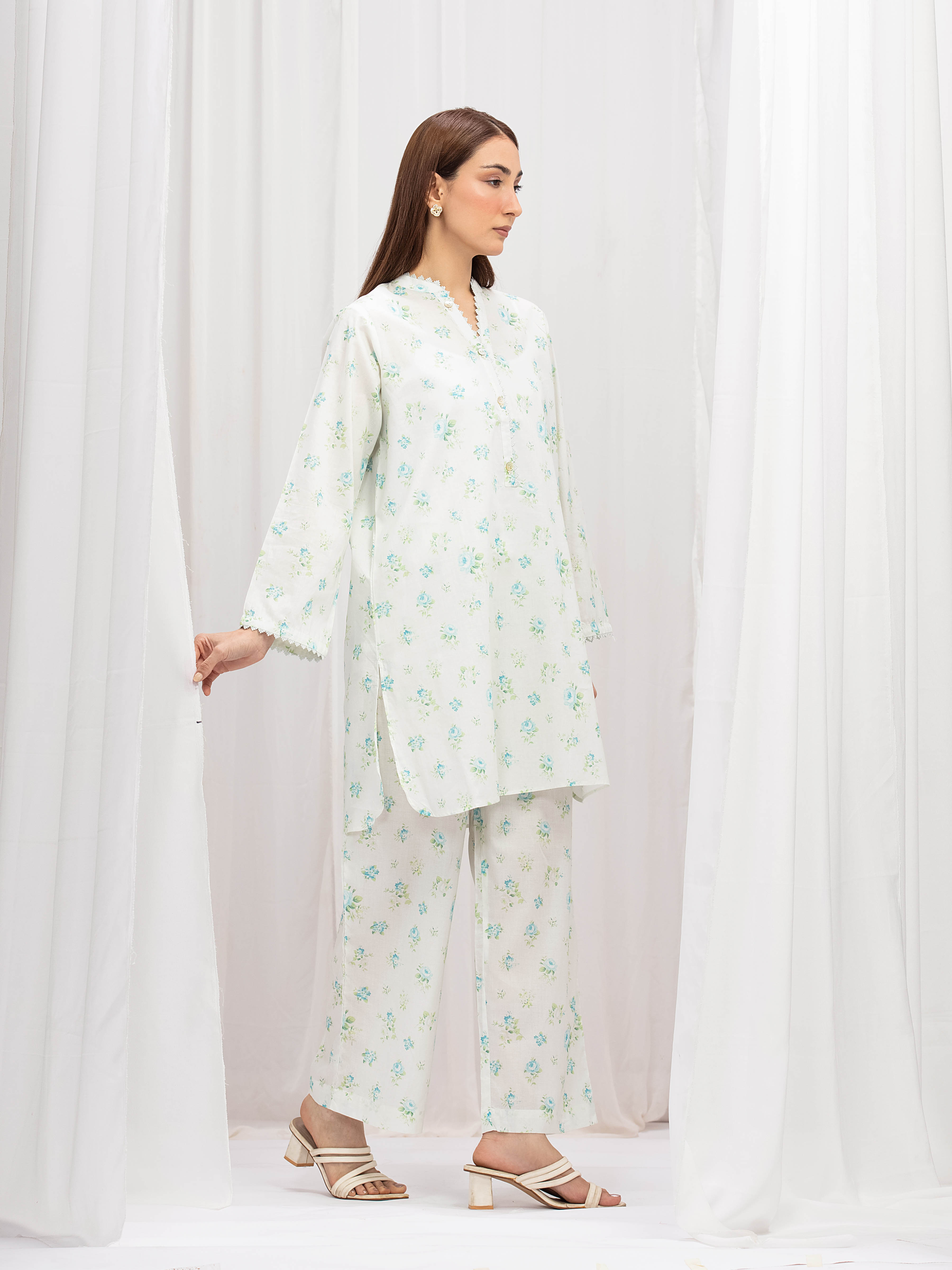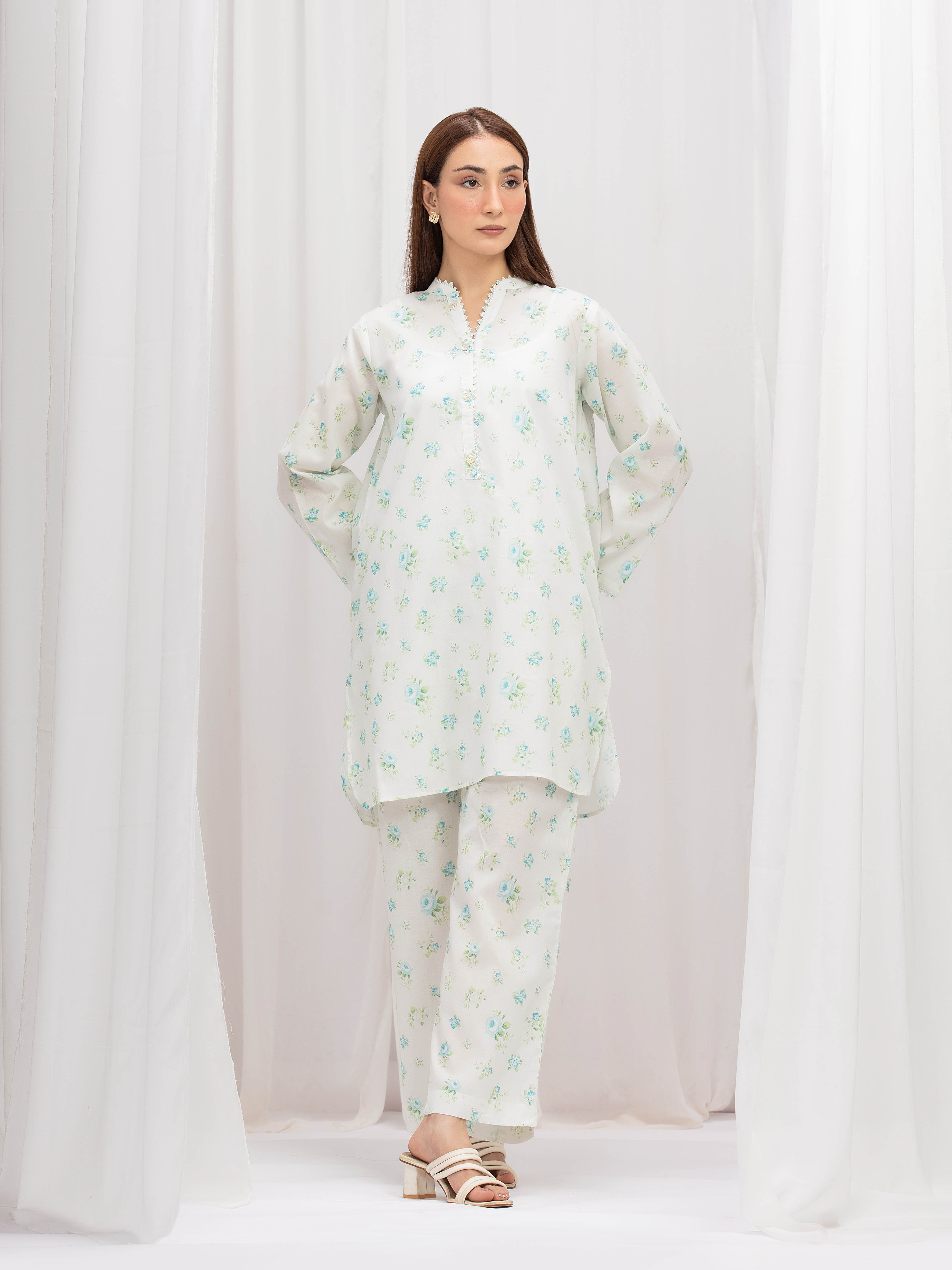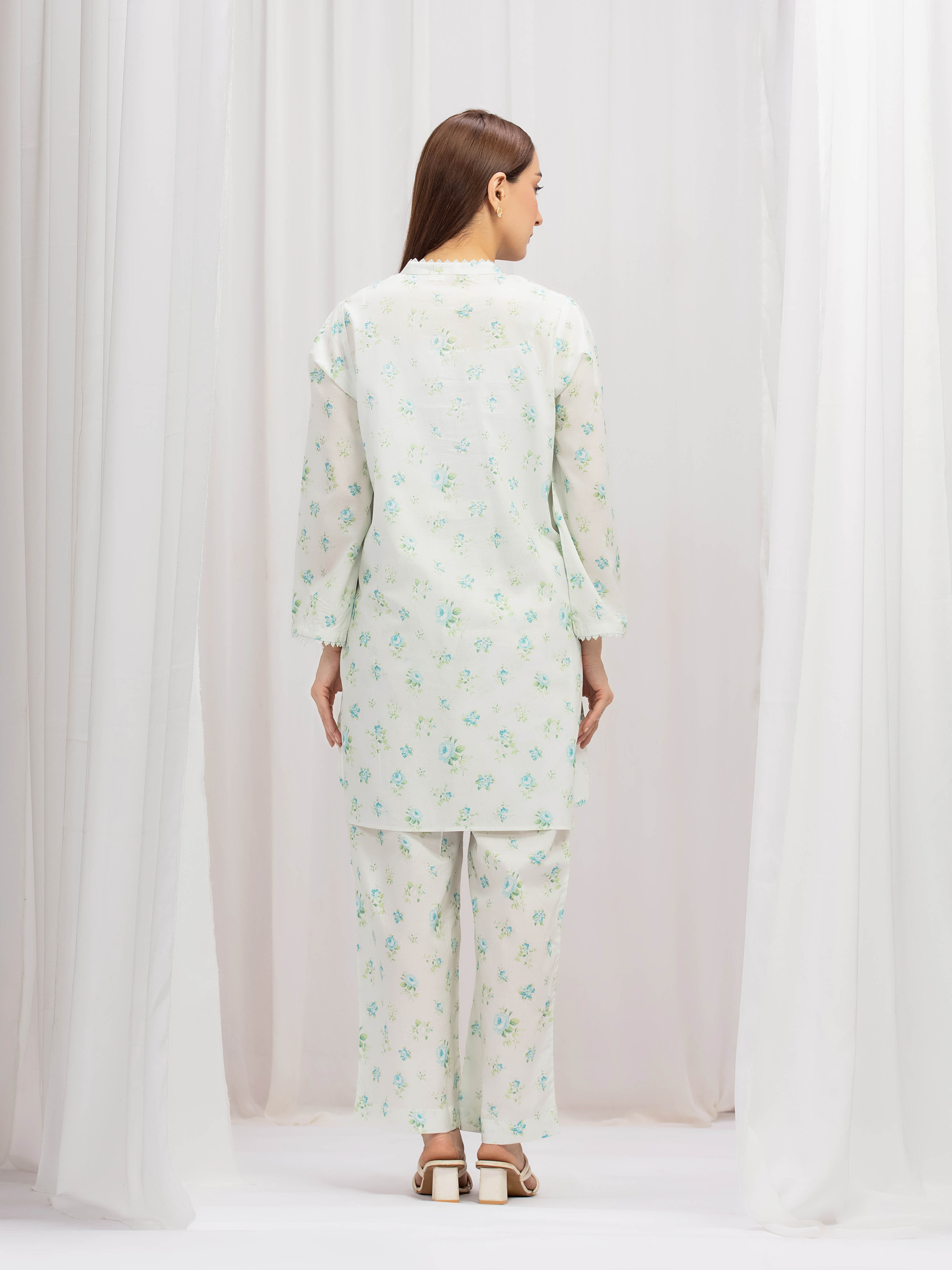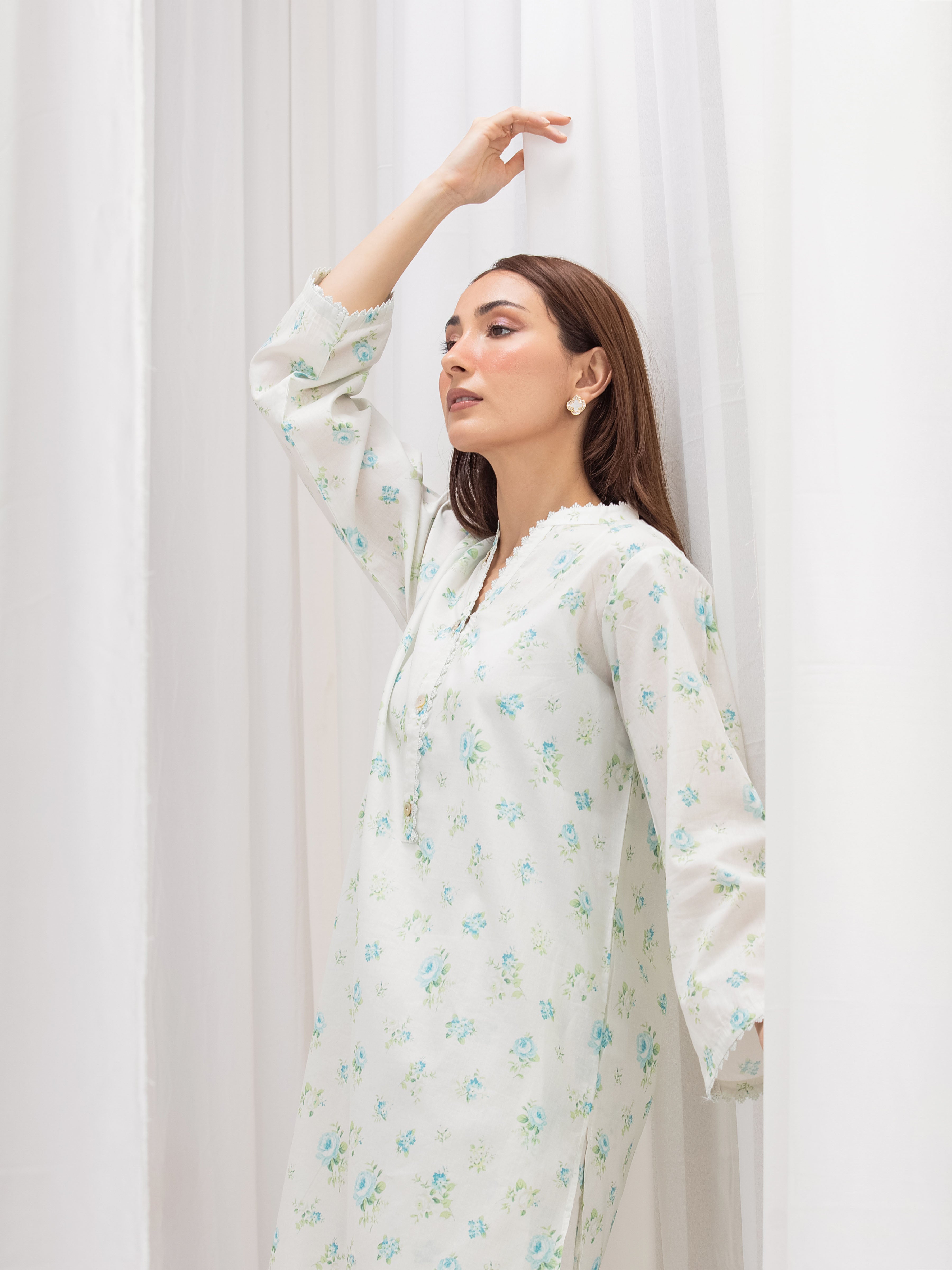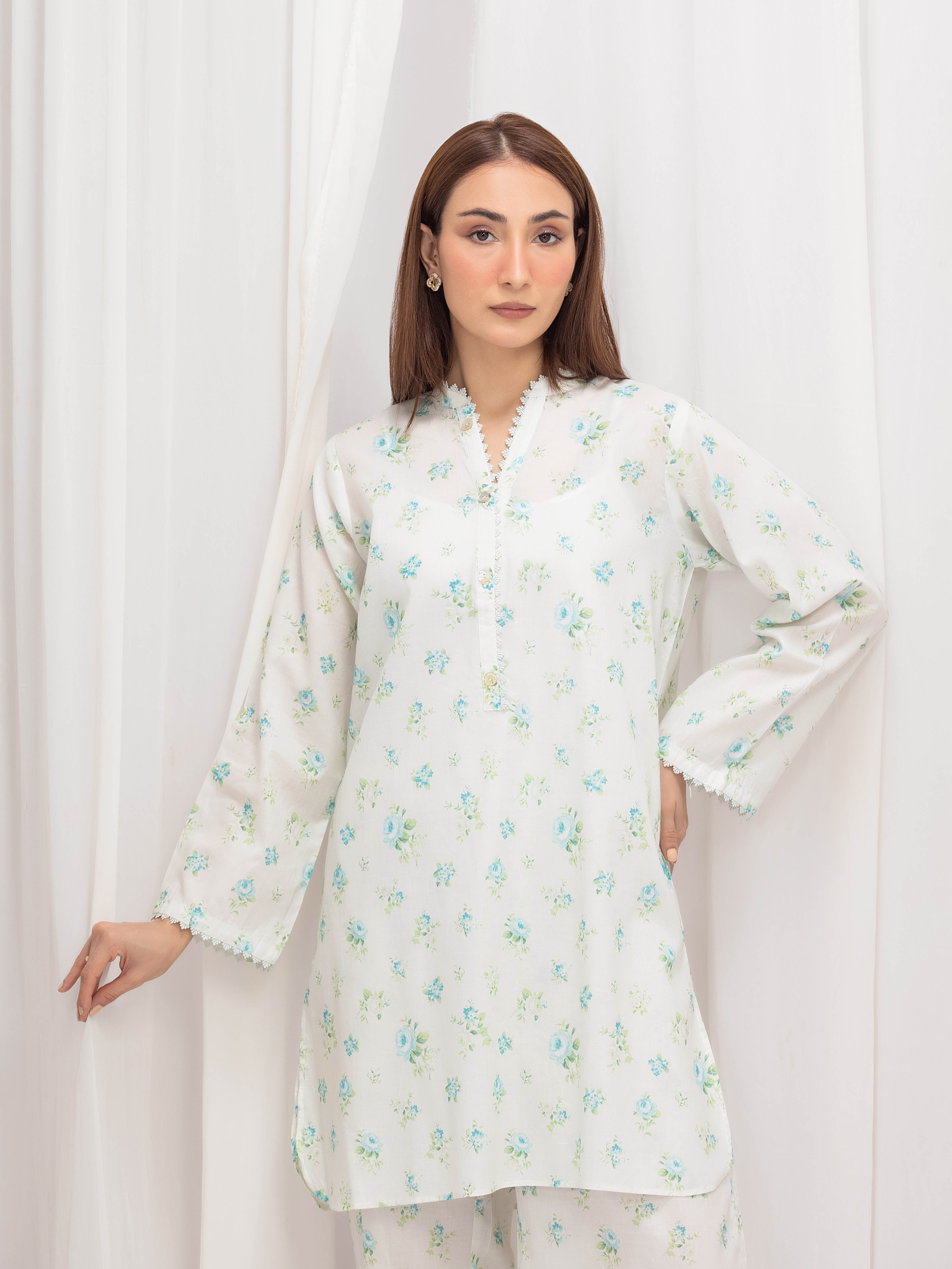 - Style: Floral Printed Shirt with Embellished Placket & Lace Sleeves