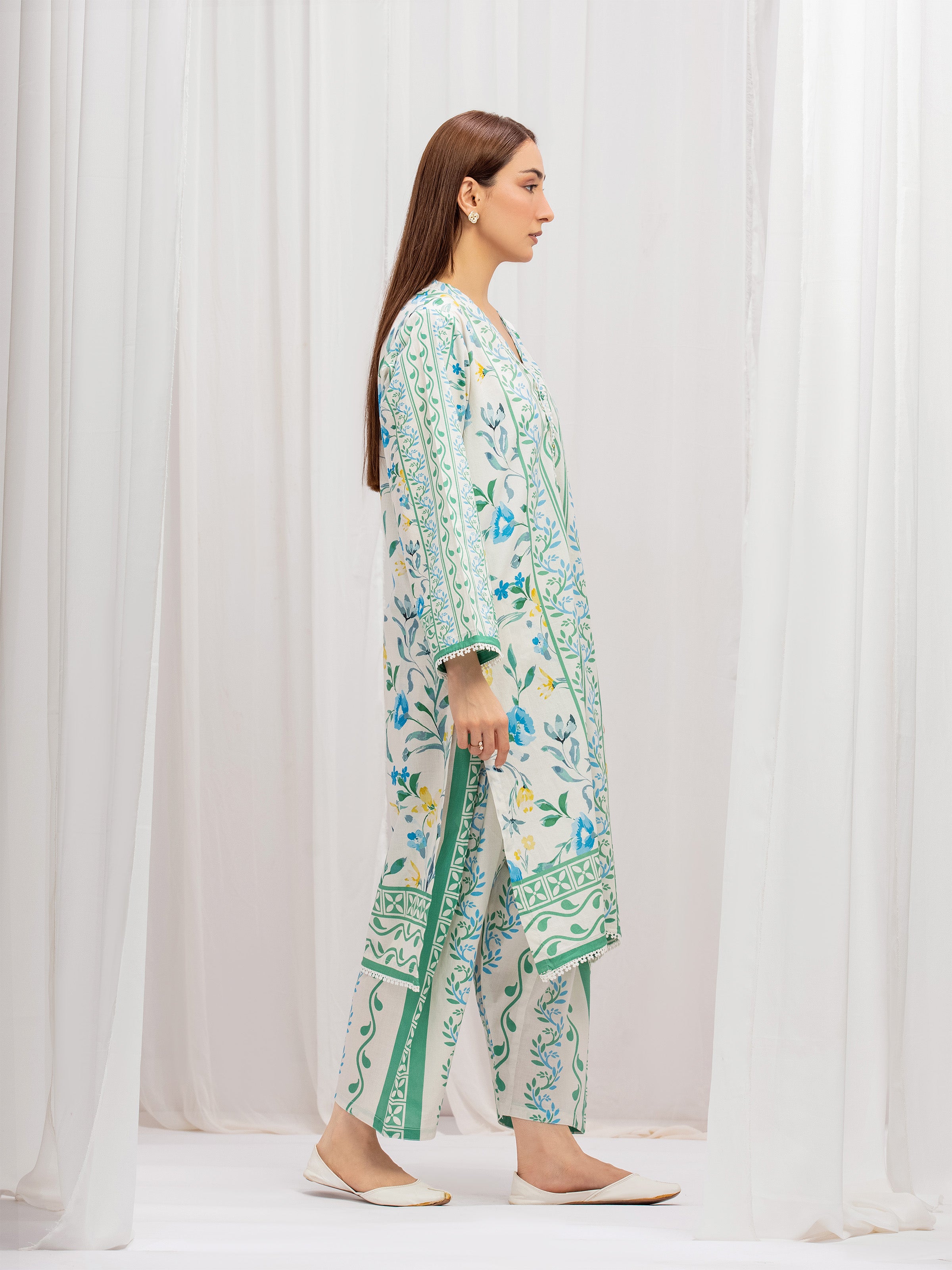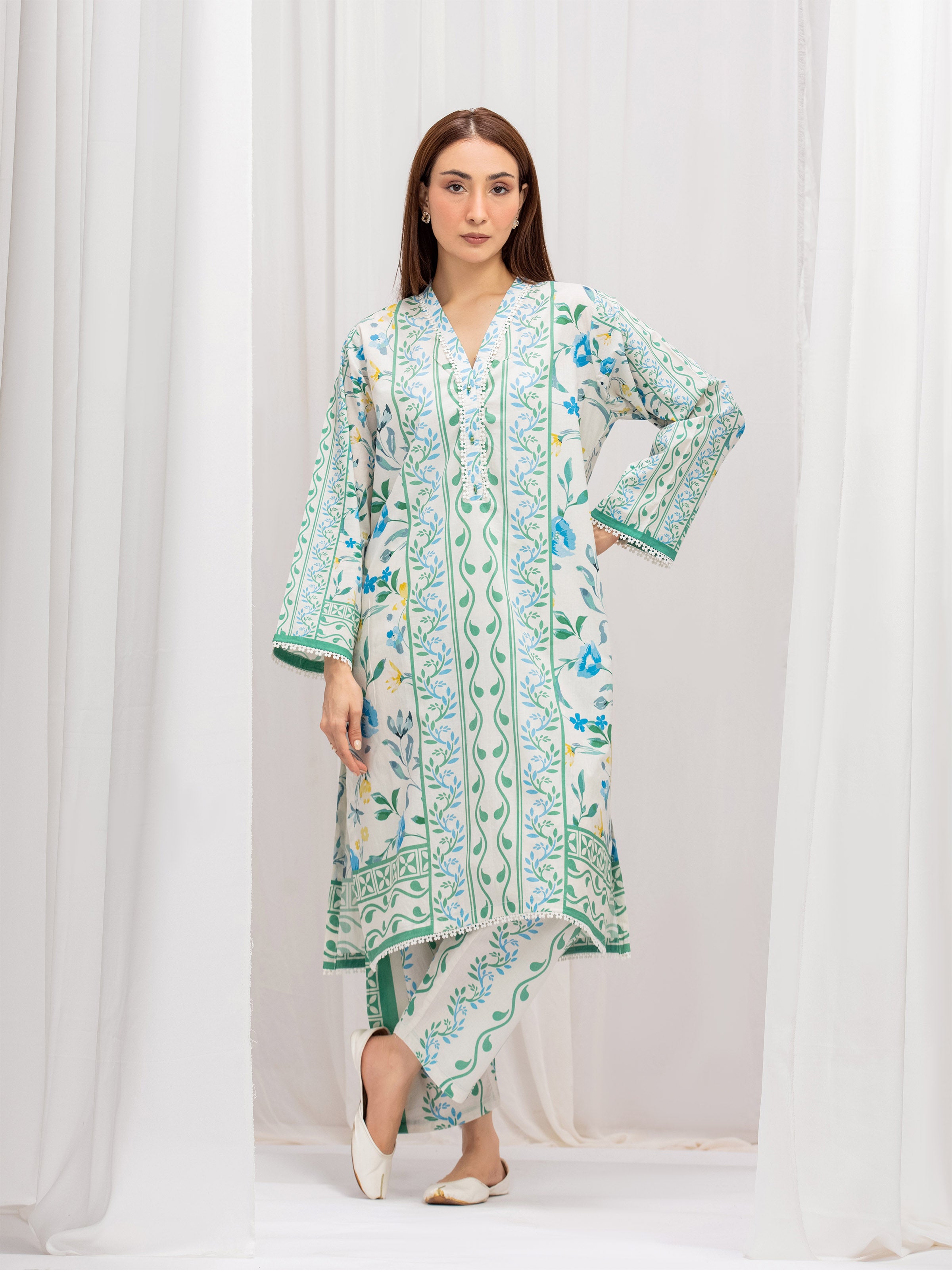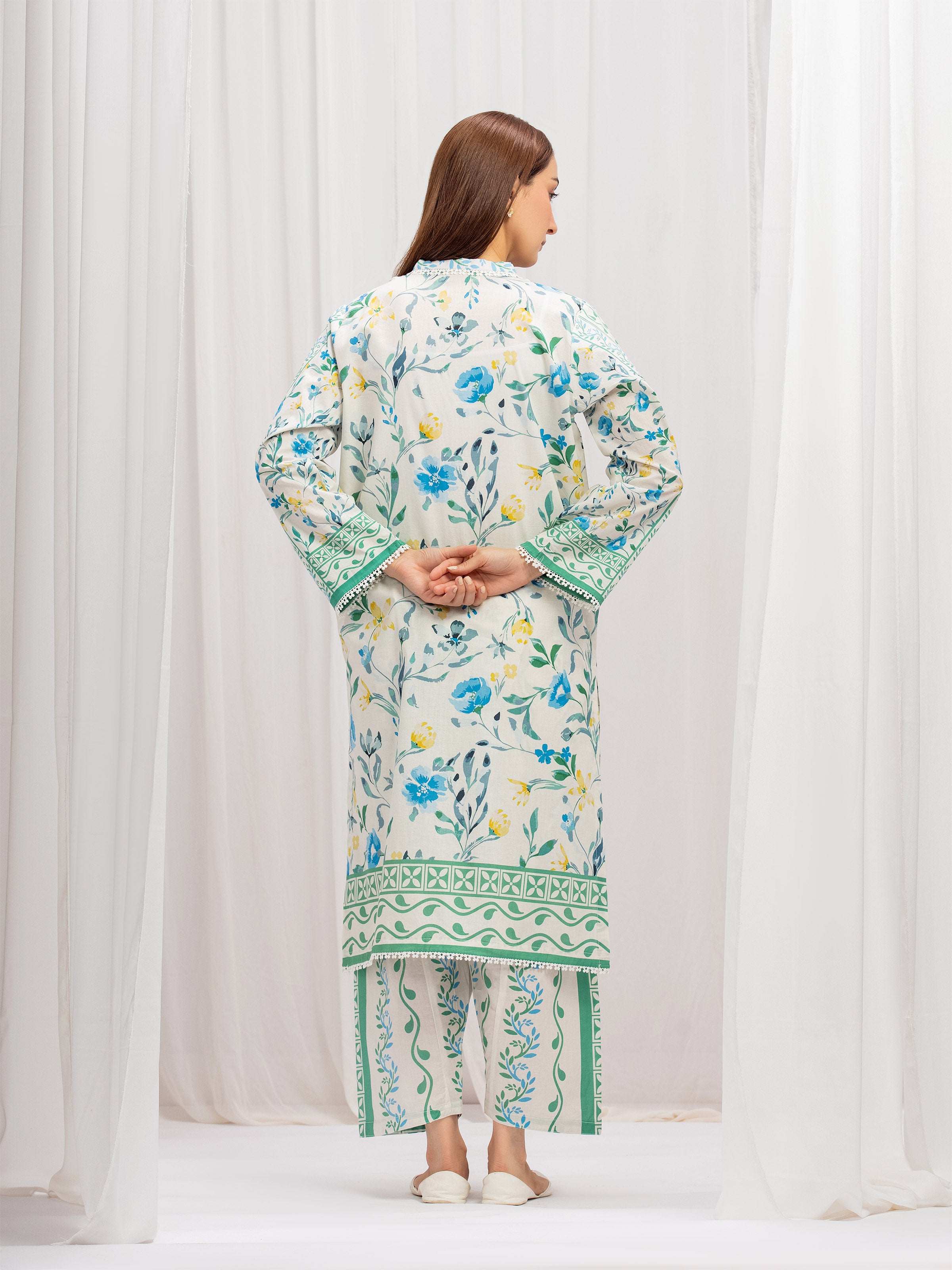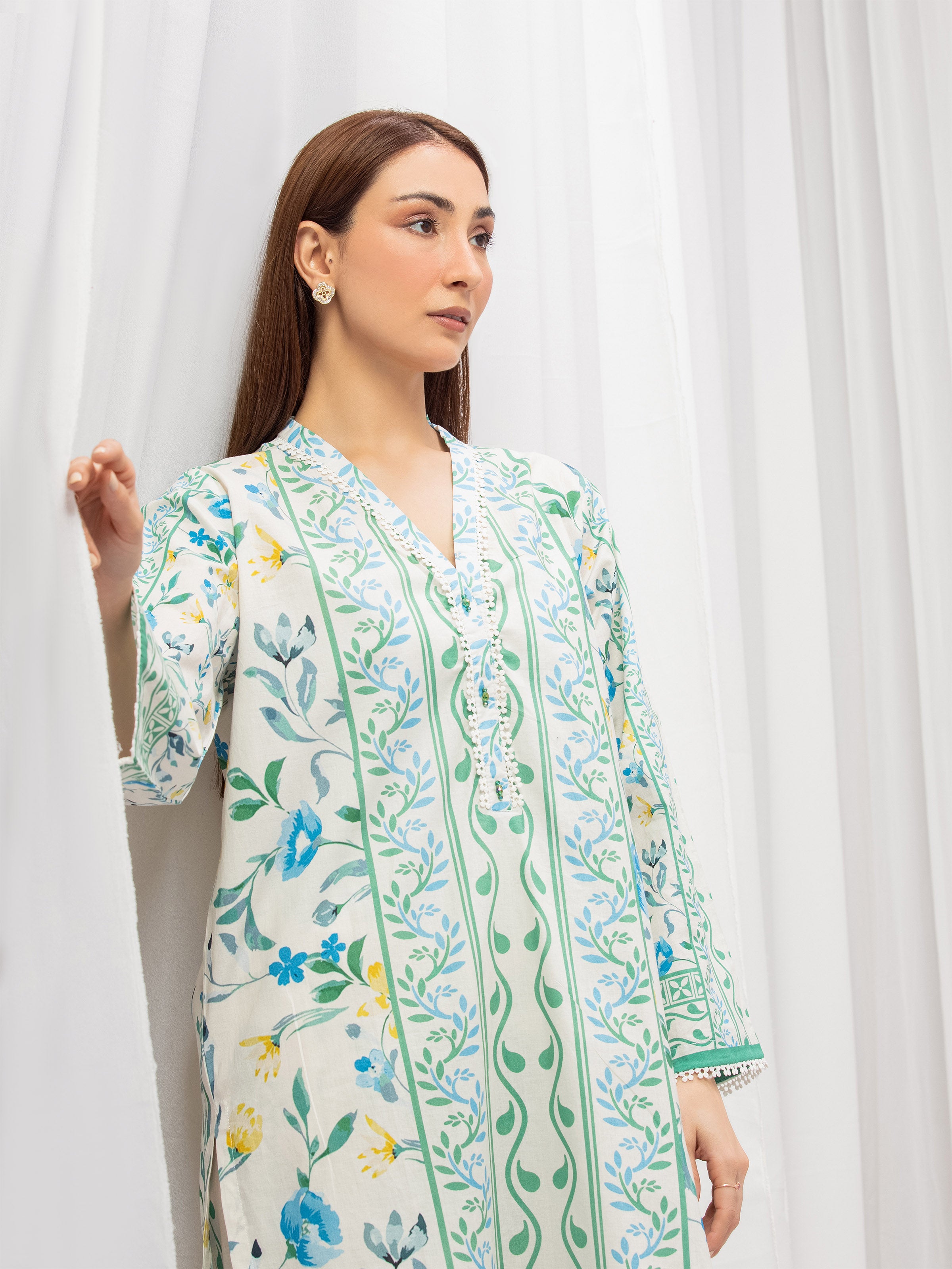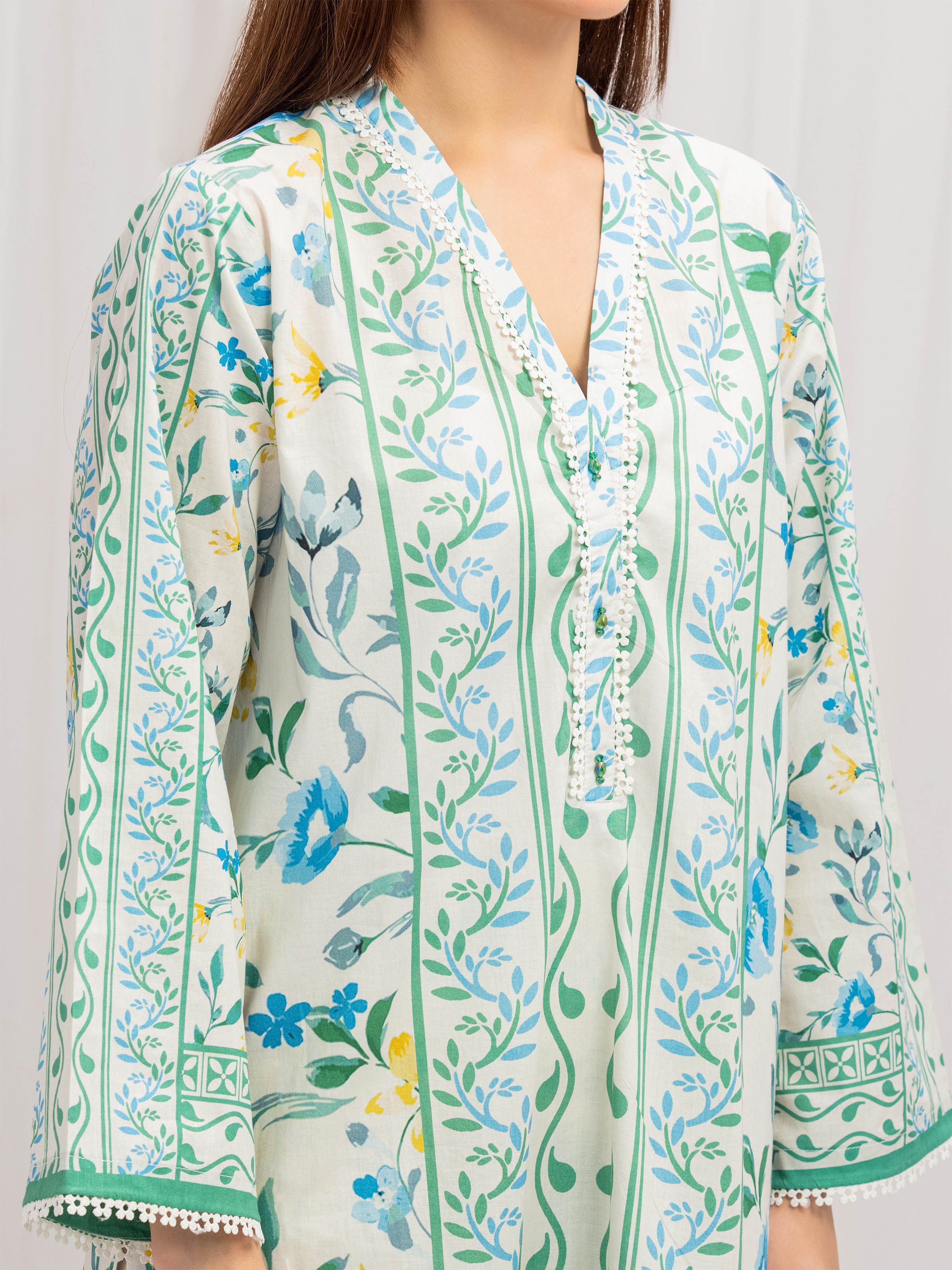 Style: Printed Kurti with Embellished Placket, and Lace on Neckline, Sleeves, & Chalk