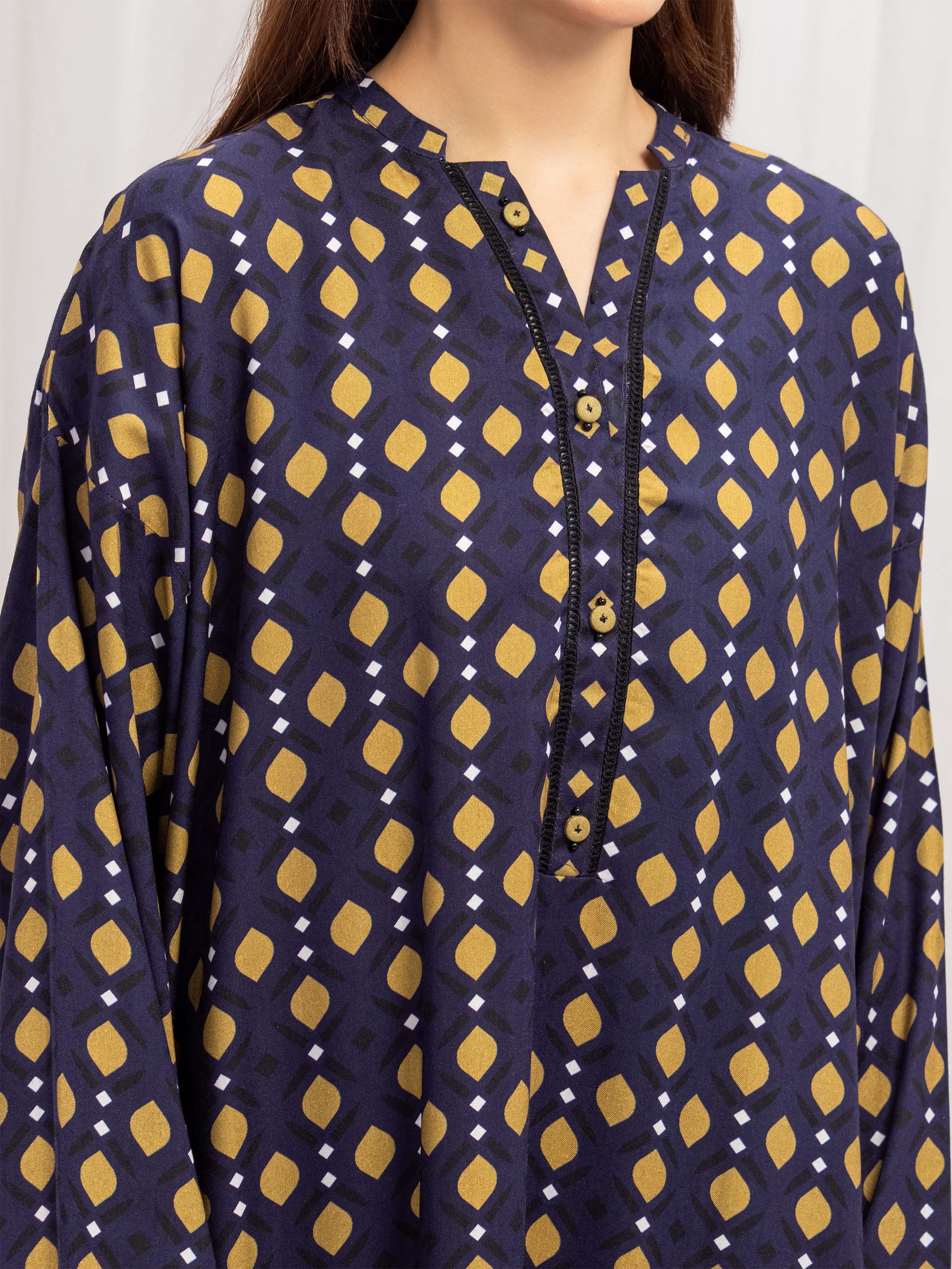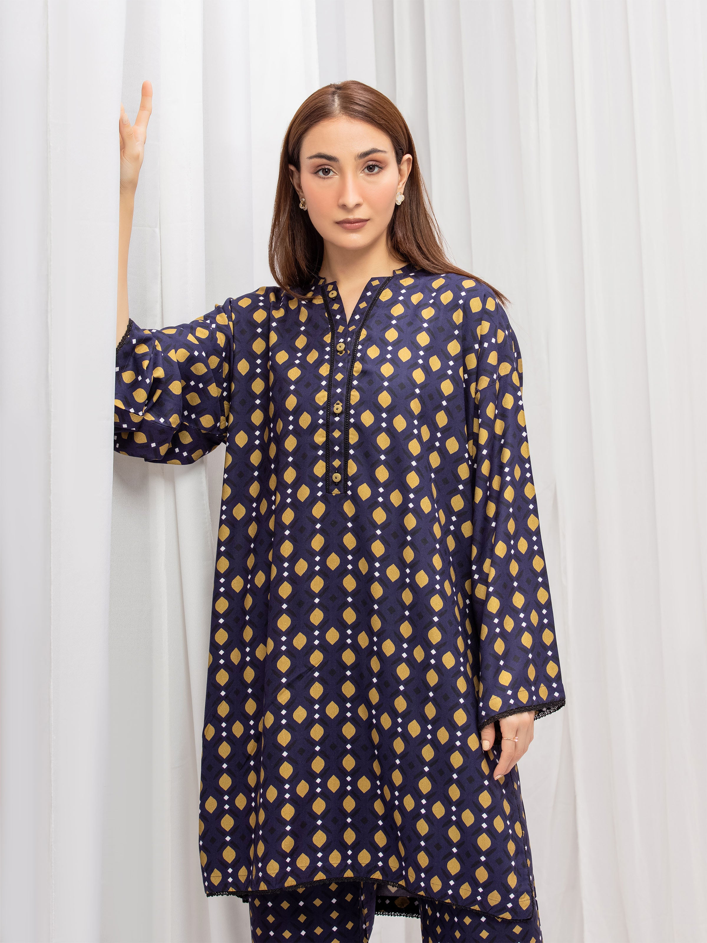 - Style: Printed Shirt with Embellished Placket & Lace on Placket, Sleeves, Daman, & Chalk