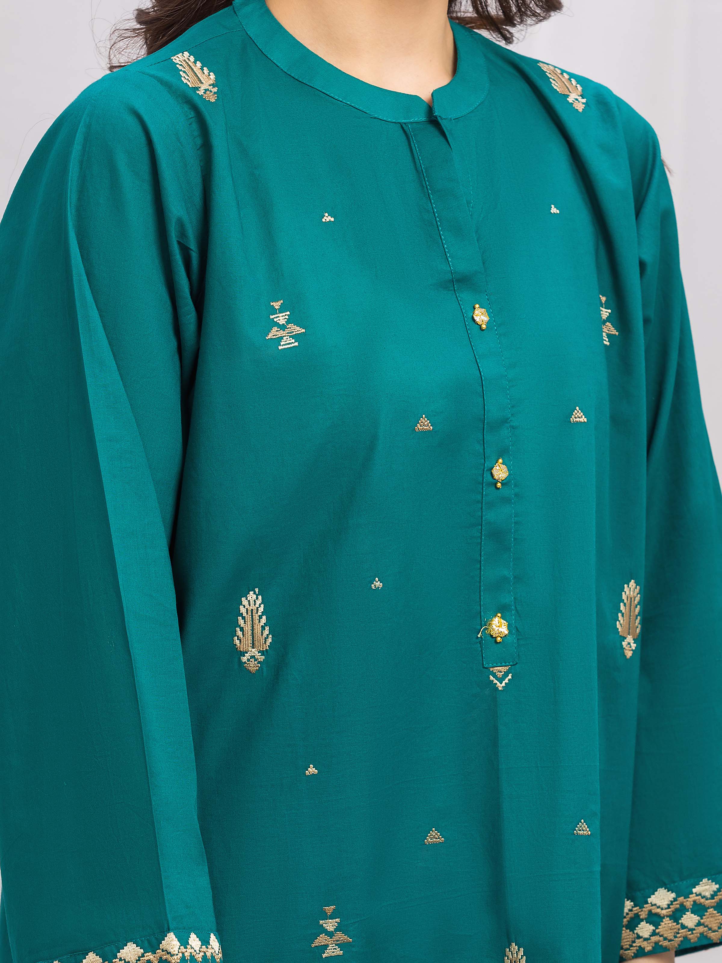 Style: Dyed Cambric Straight Kurti, Embroidered On Front & Sleeves Cuff, Tassel Hand Embellished On Placket