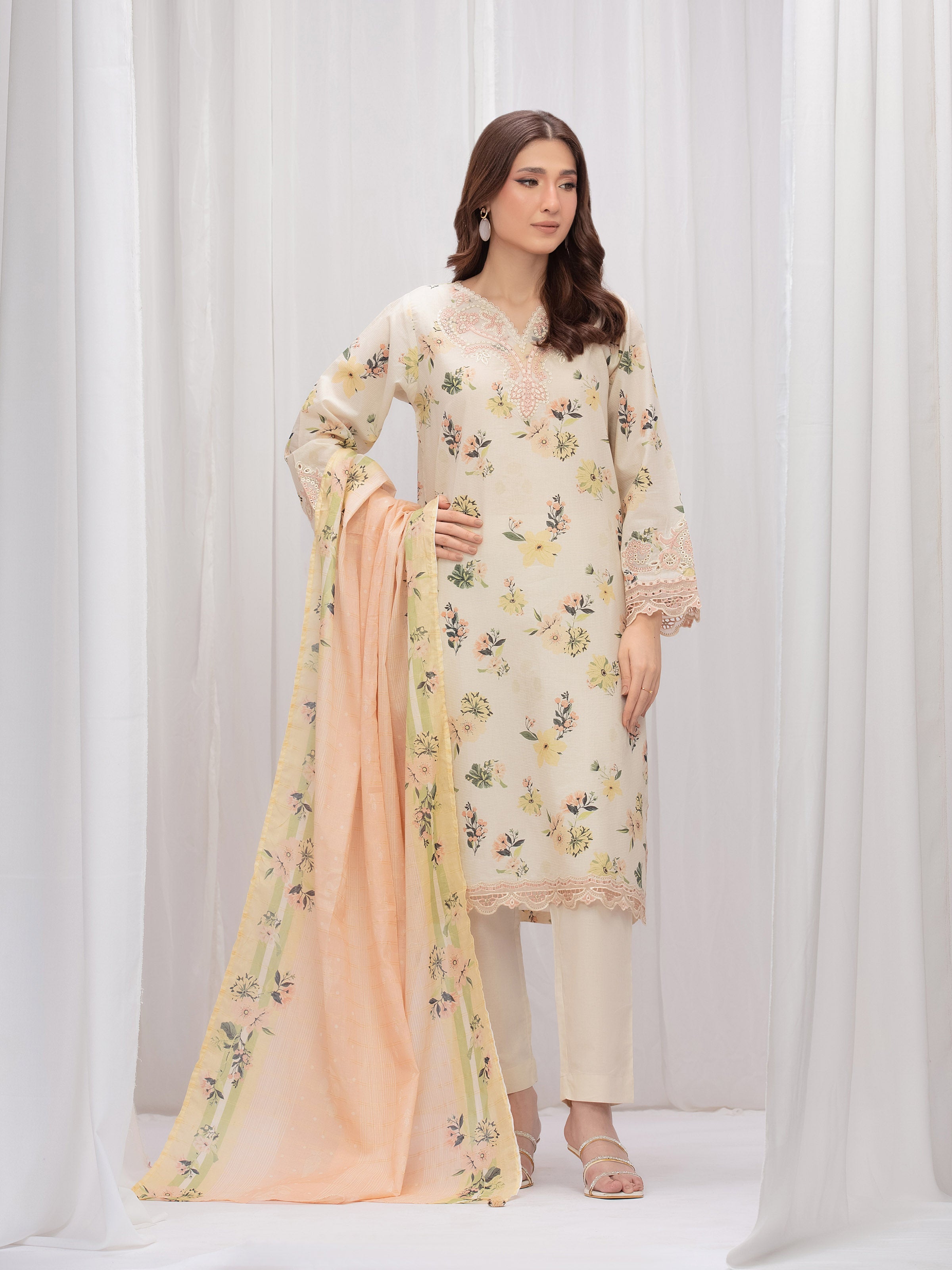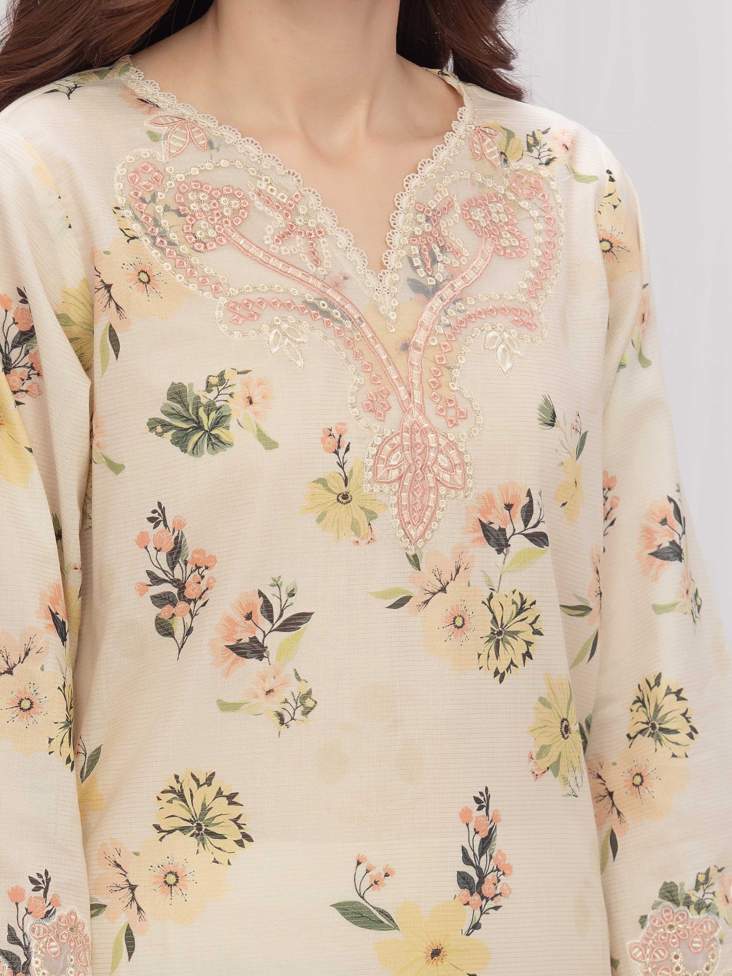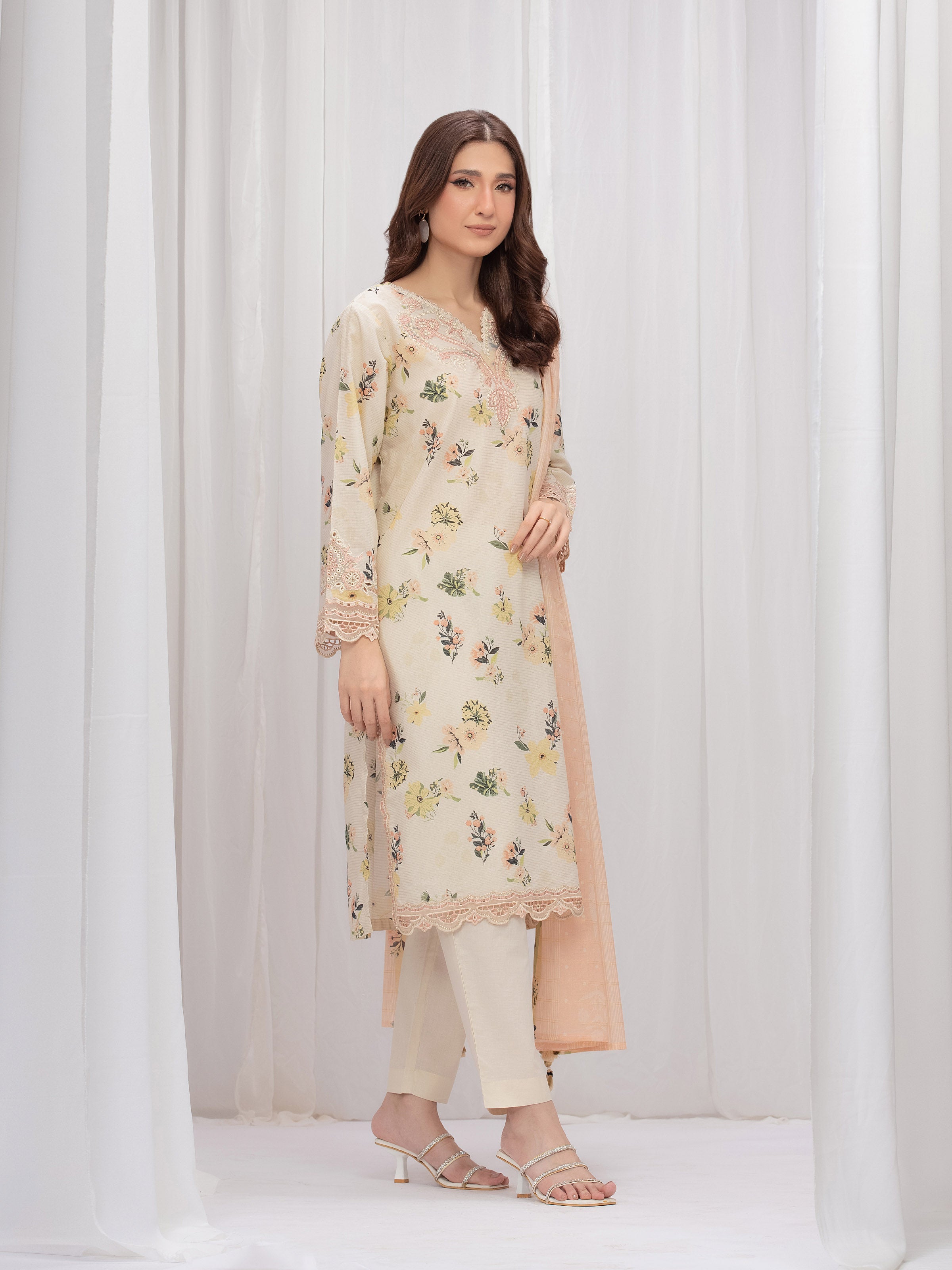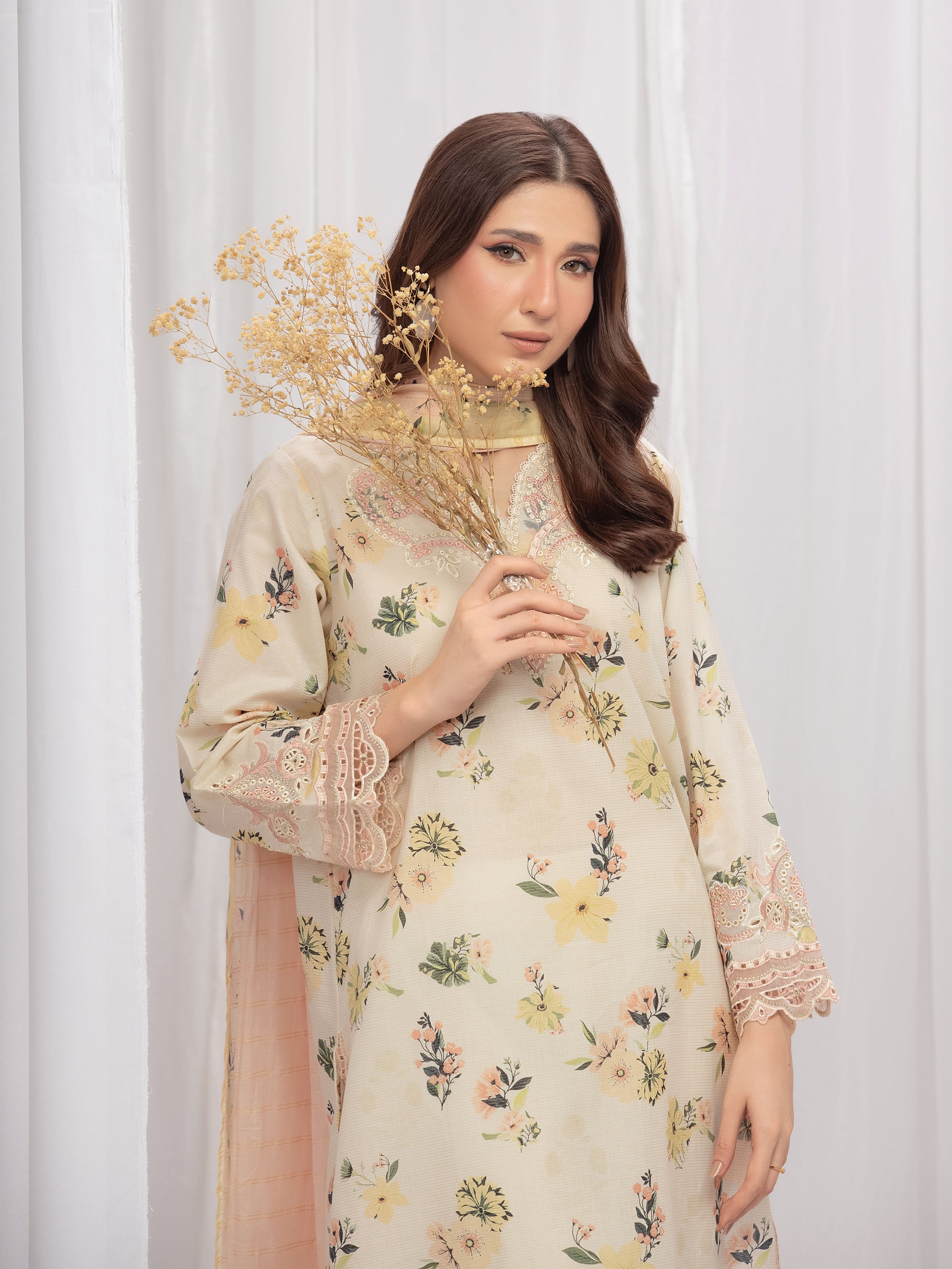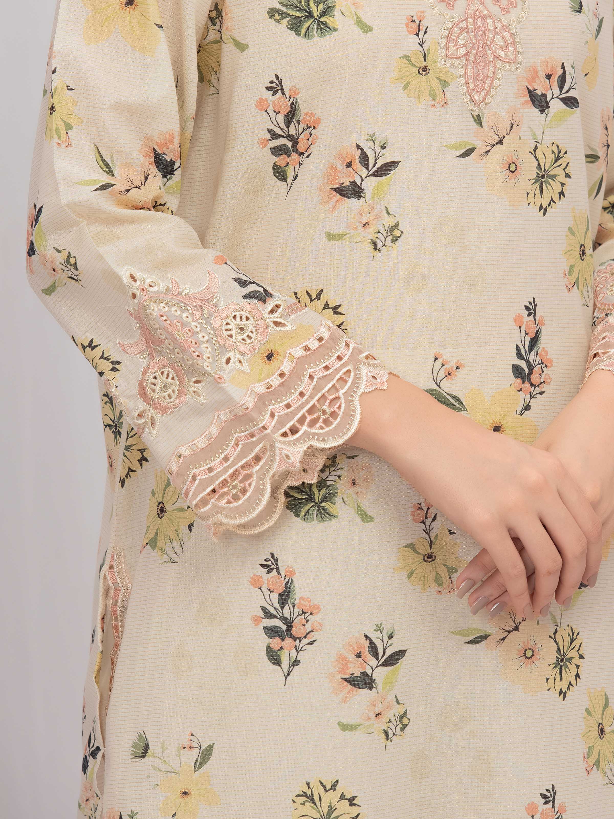 Style: Floral Printed Shirt with Embroidered Neck, Sleeves, & Daman and Lace on Chalk