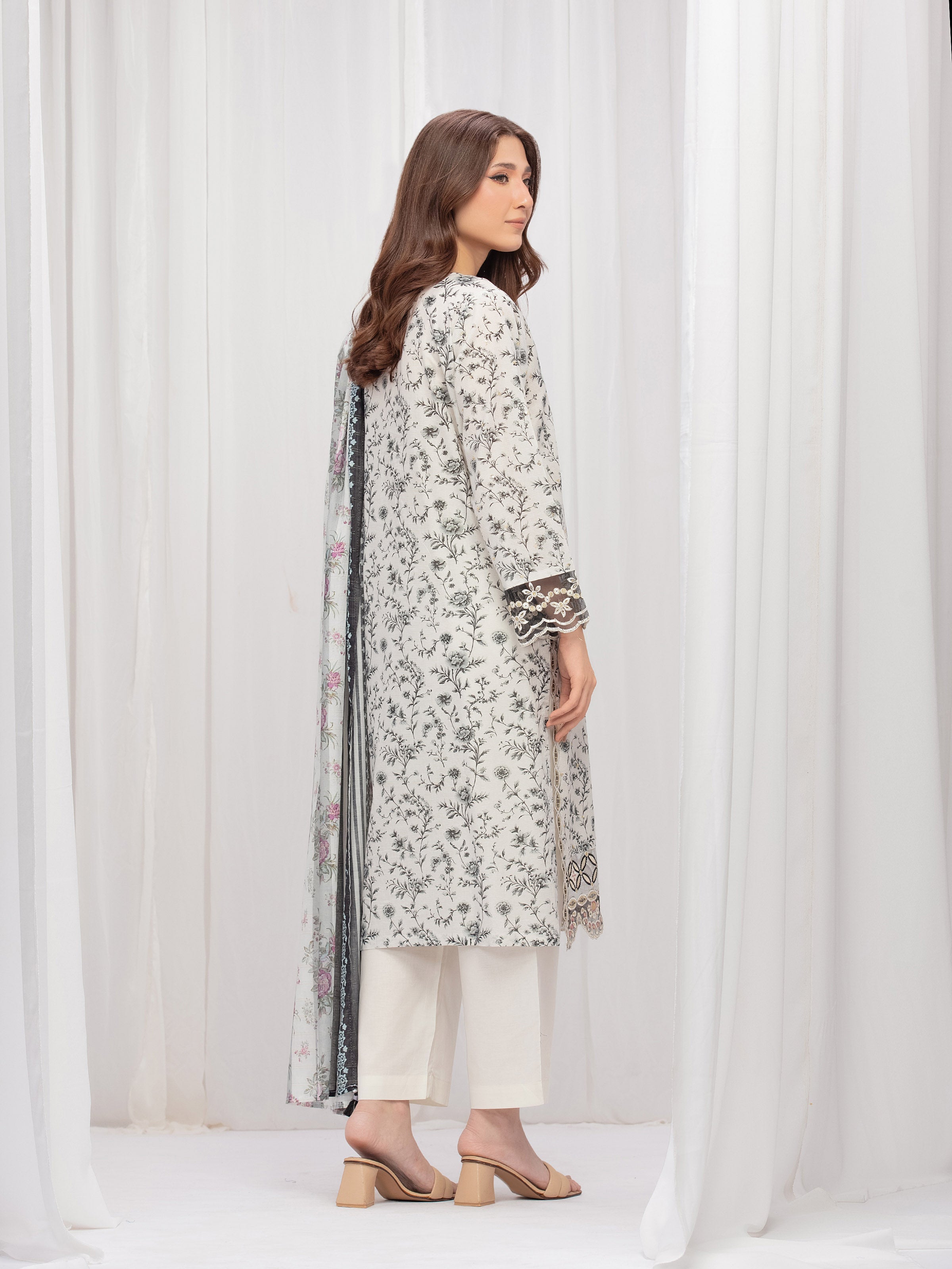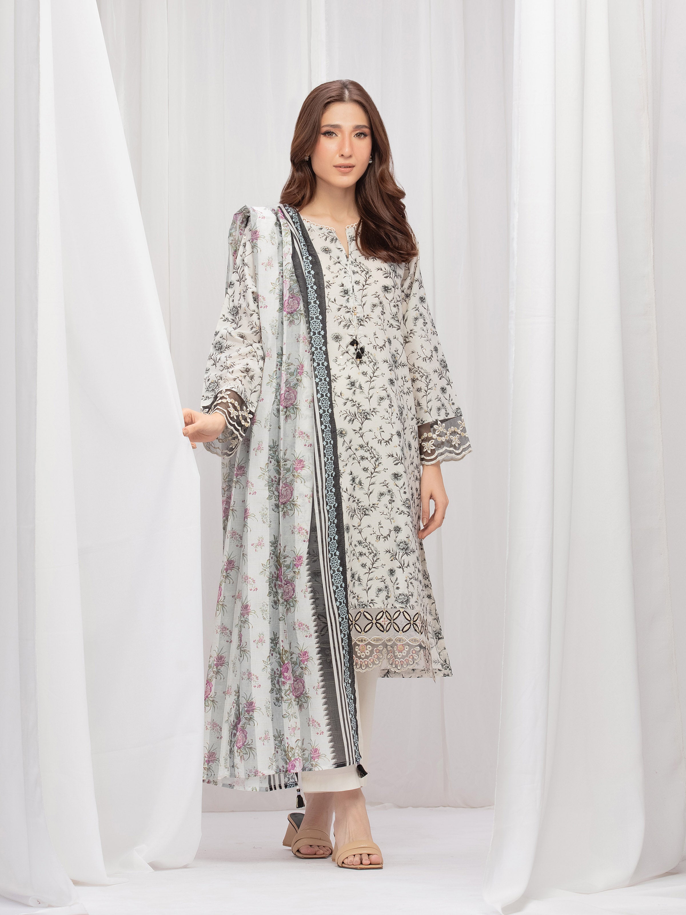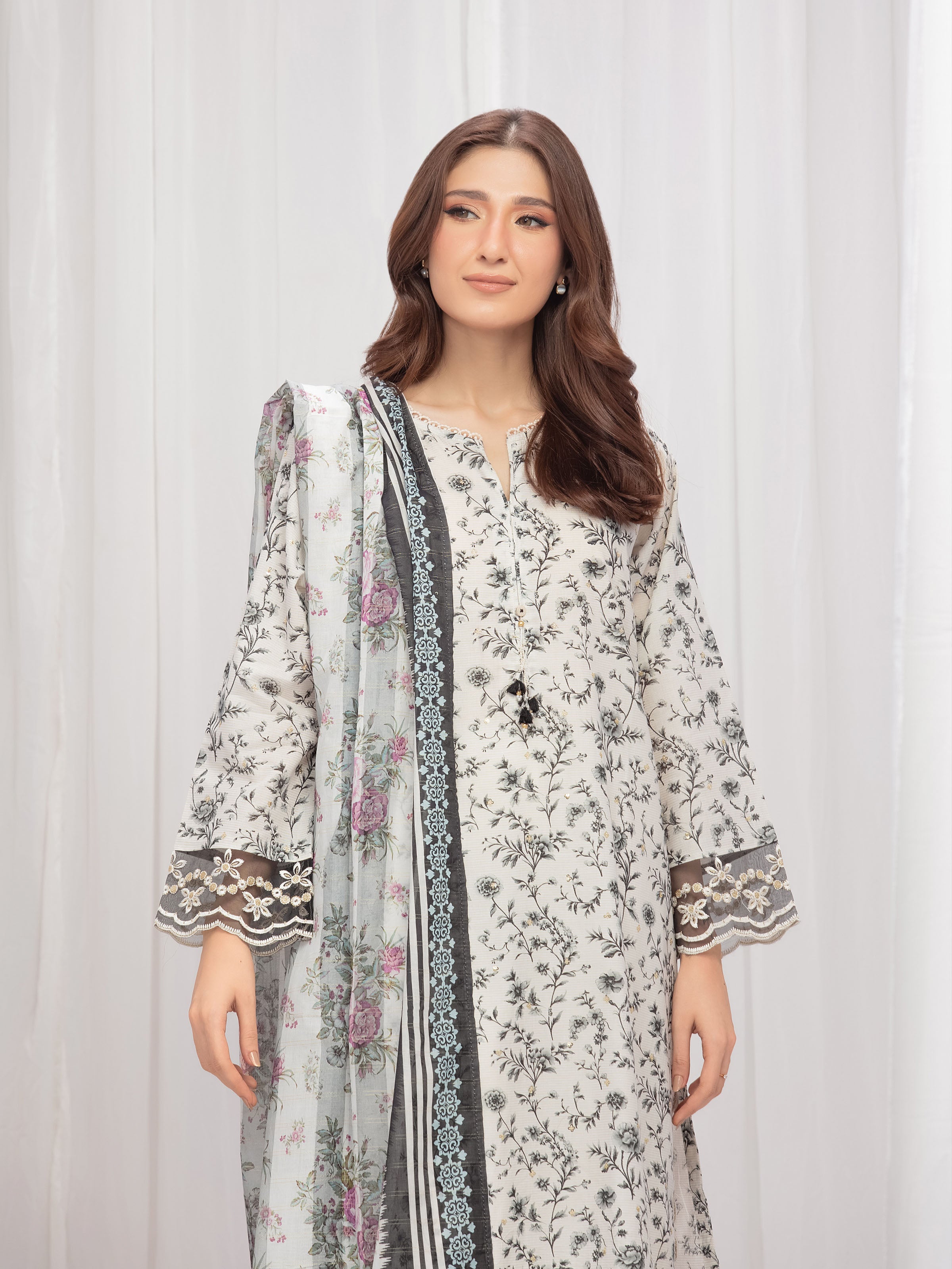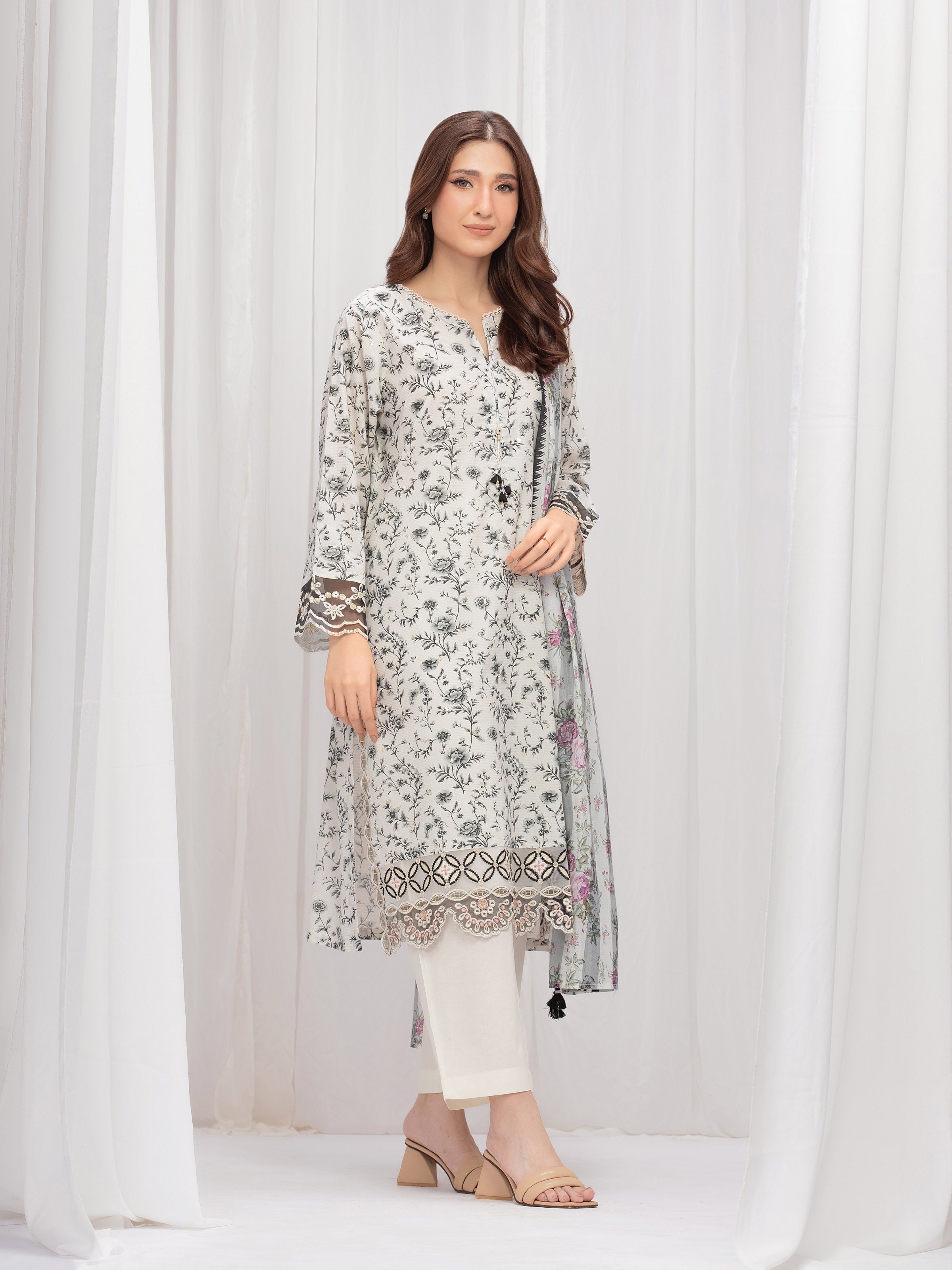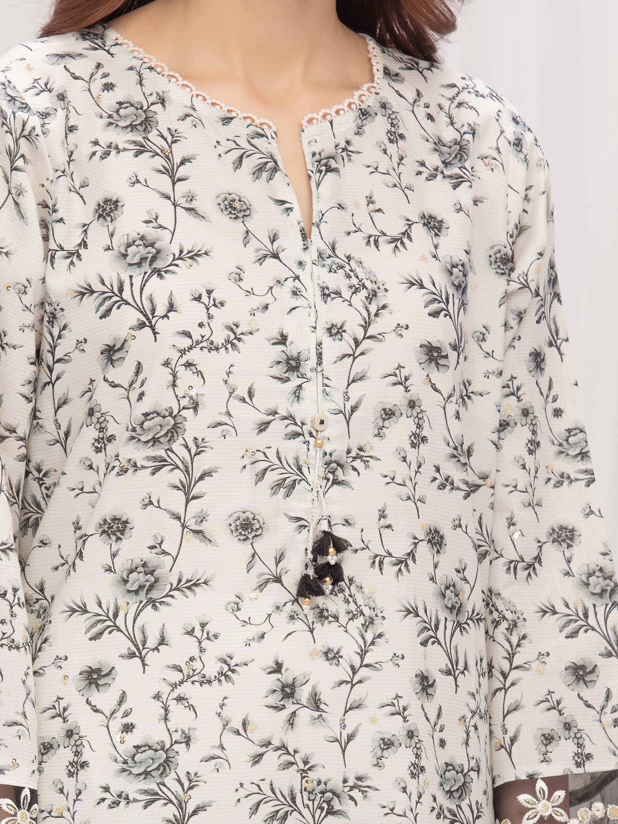 Style: Floral Printed Shirt with Lace on Neck, Embellished Placket and Organza Embroidered Border Sleeves & Daman