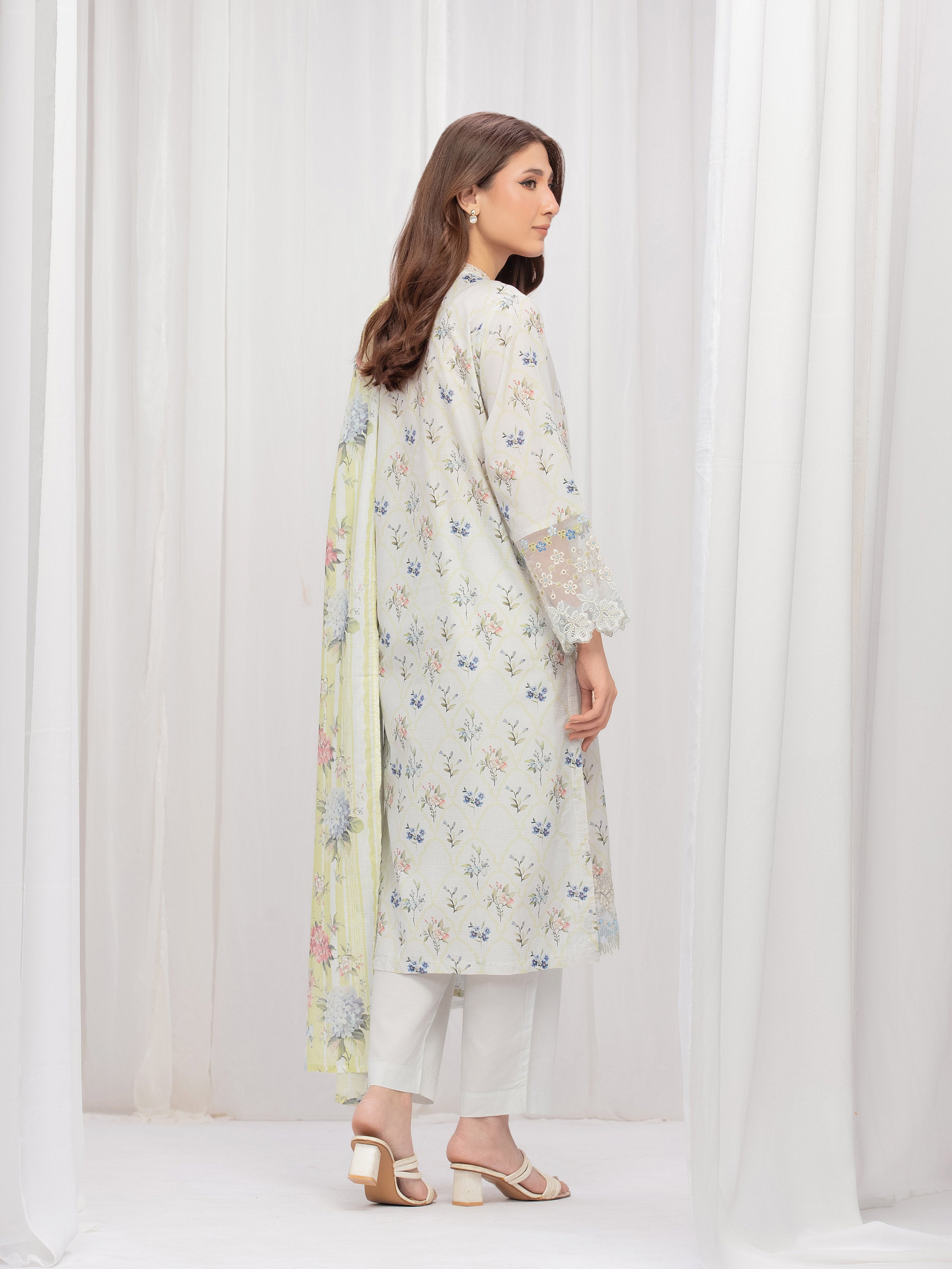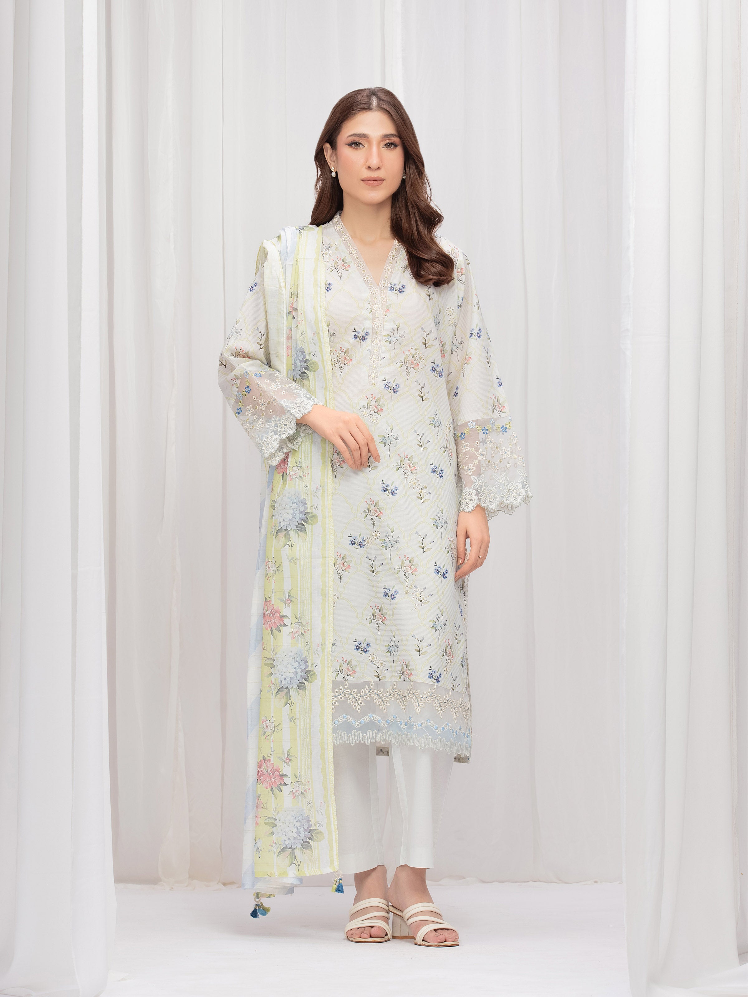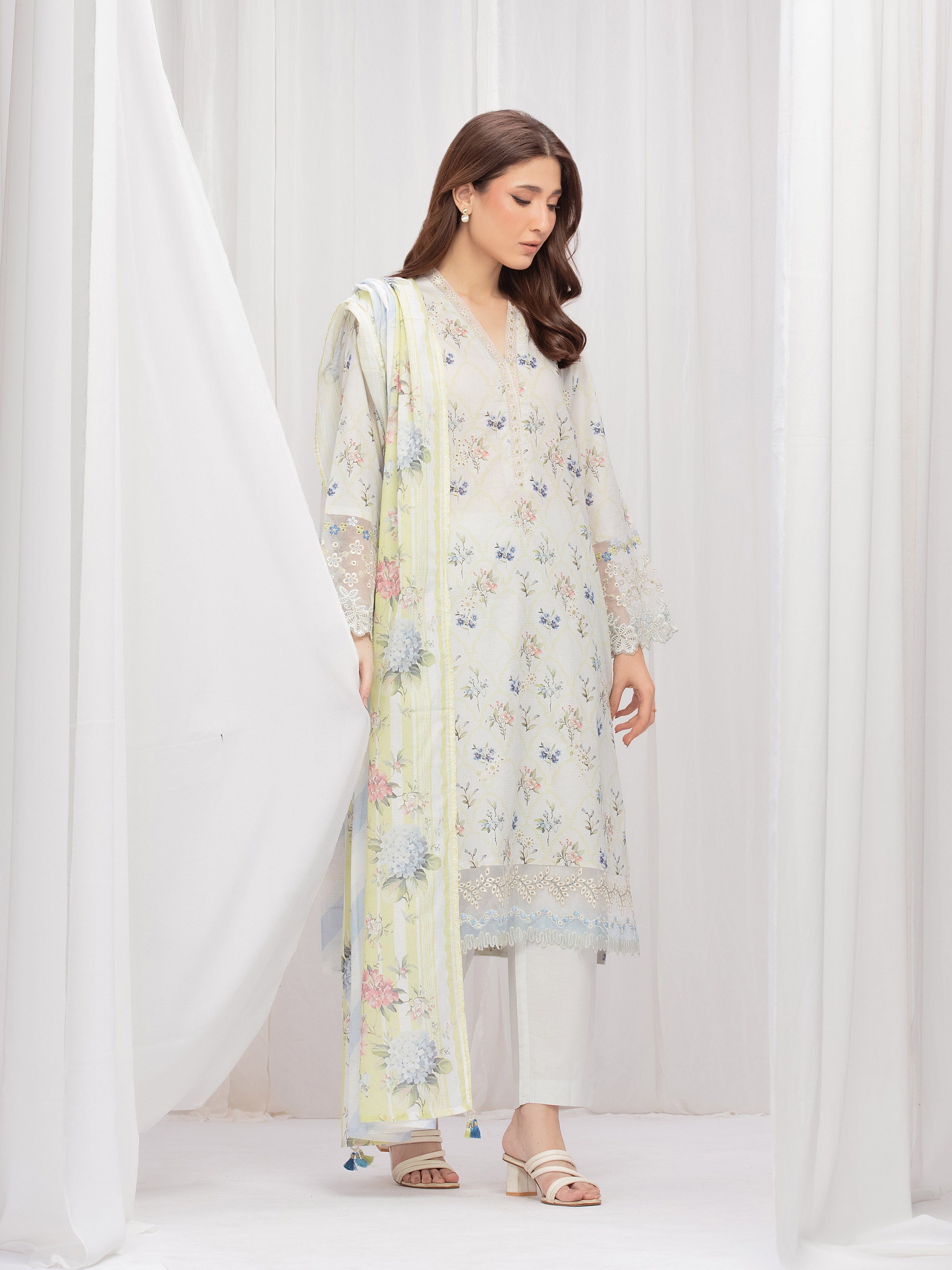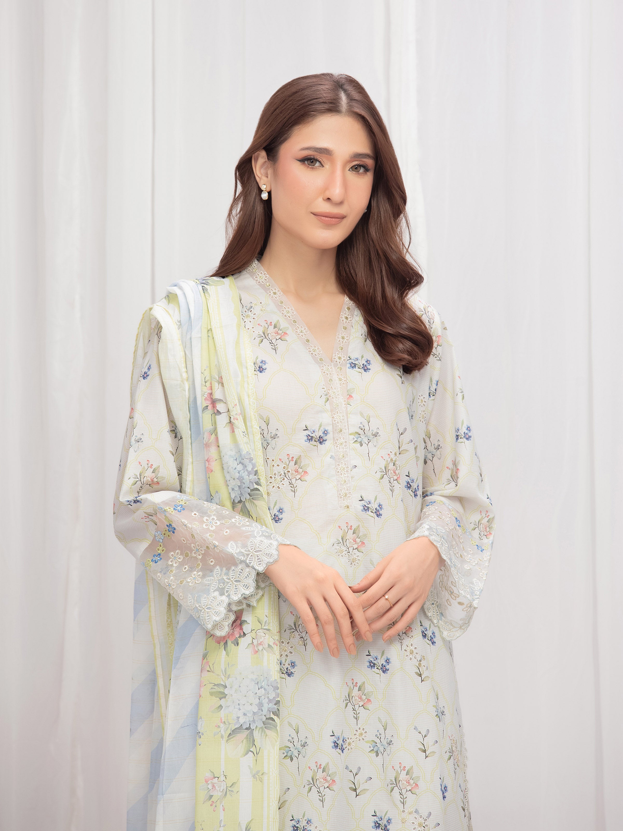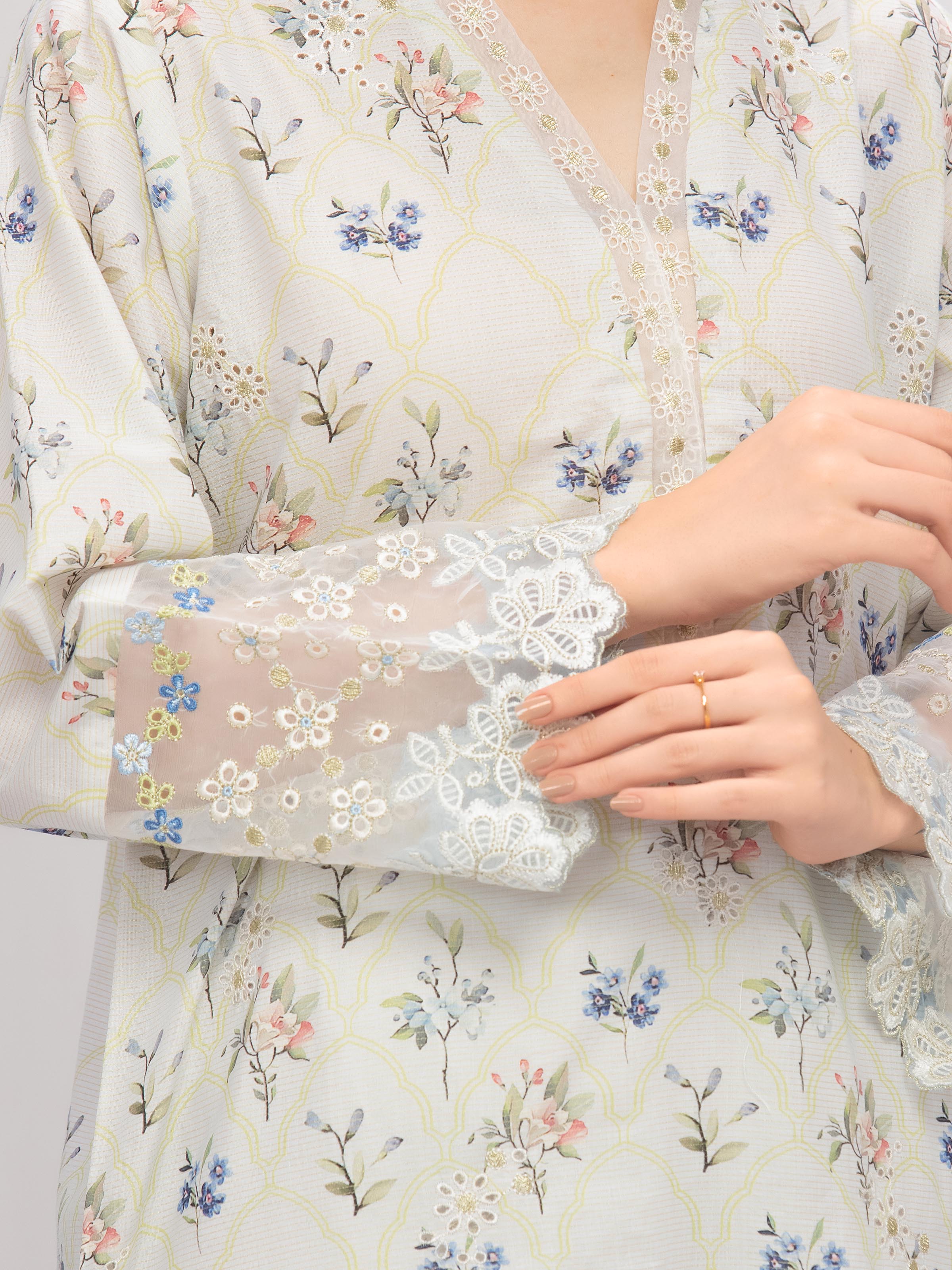 Style: Floral Printed Shirt with Organza Embroidered Border on Neckline, Sleeves, & Daman and Lace on Chalk