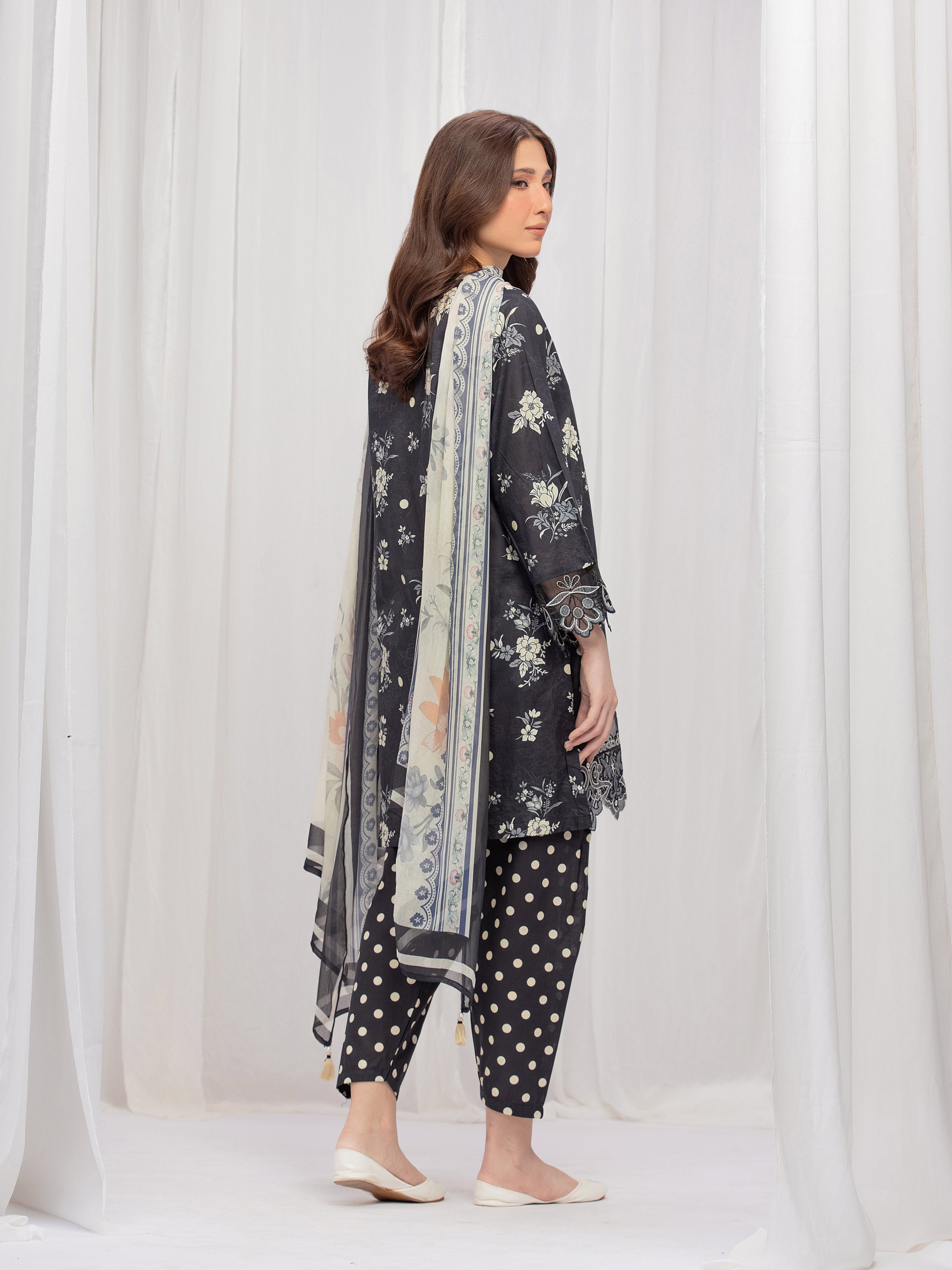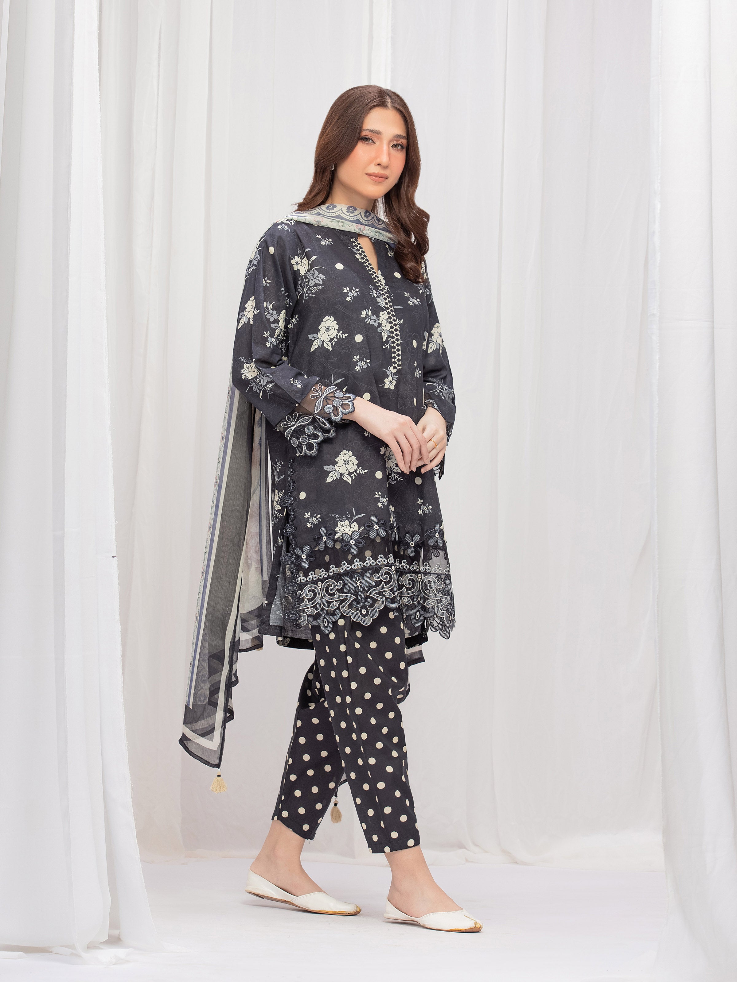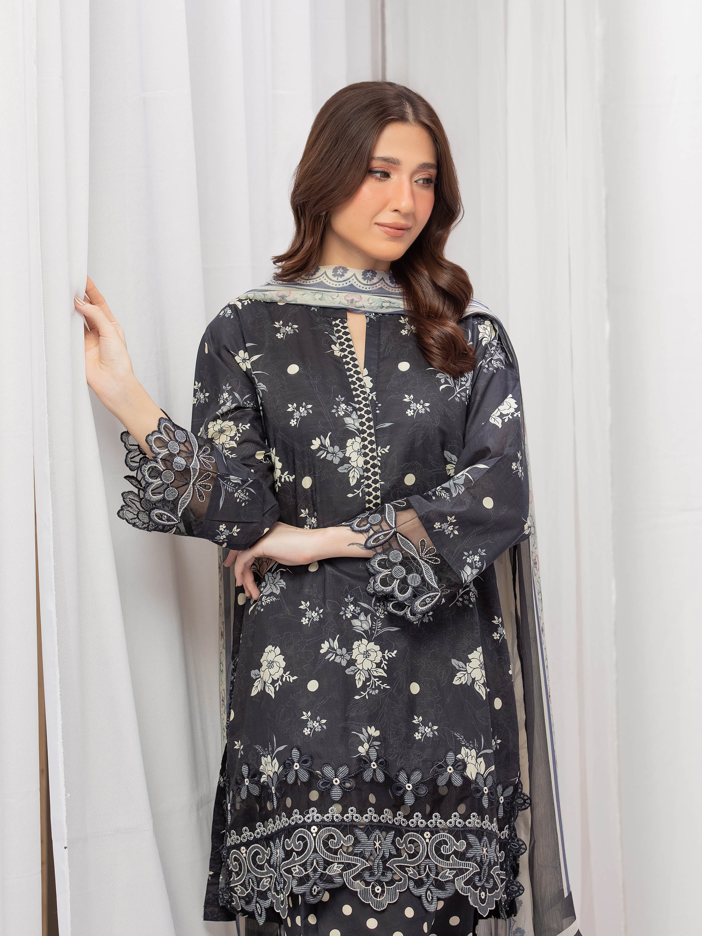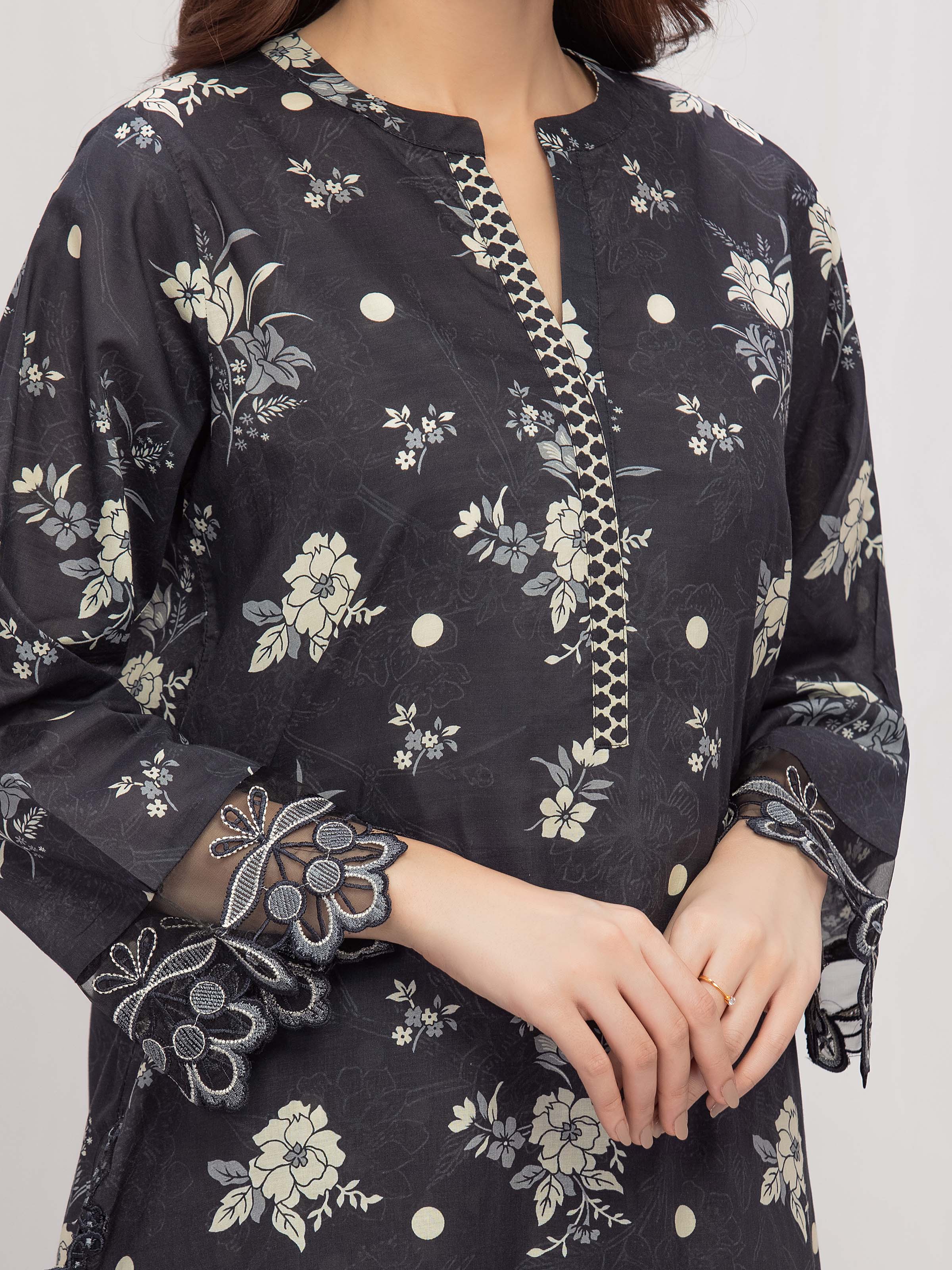 Style: Printed Lawn Short Length Kurti, Organza Embroidered on Sleeves Cuff, Daman & Chalk Patti