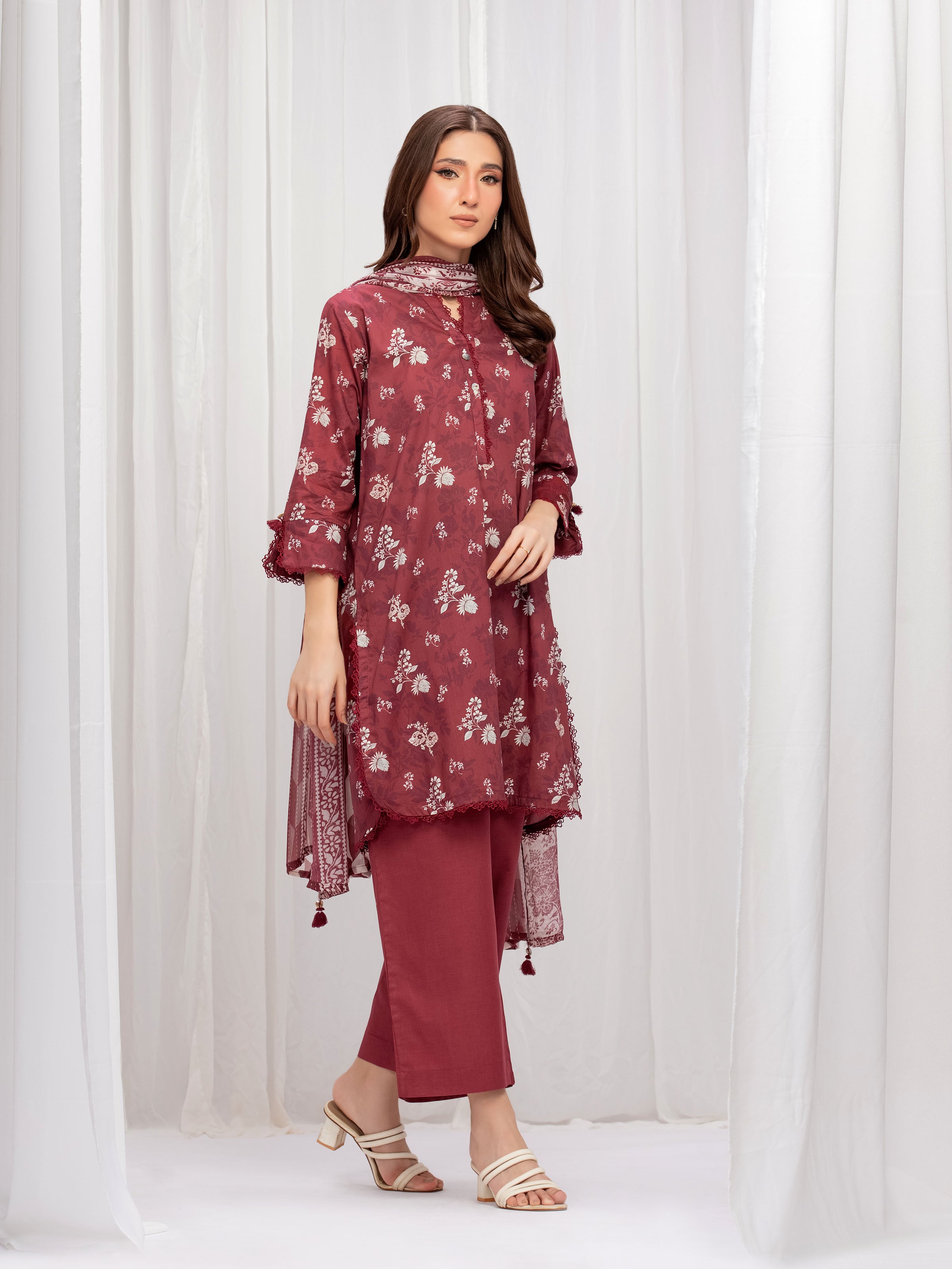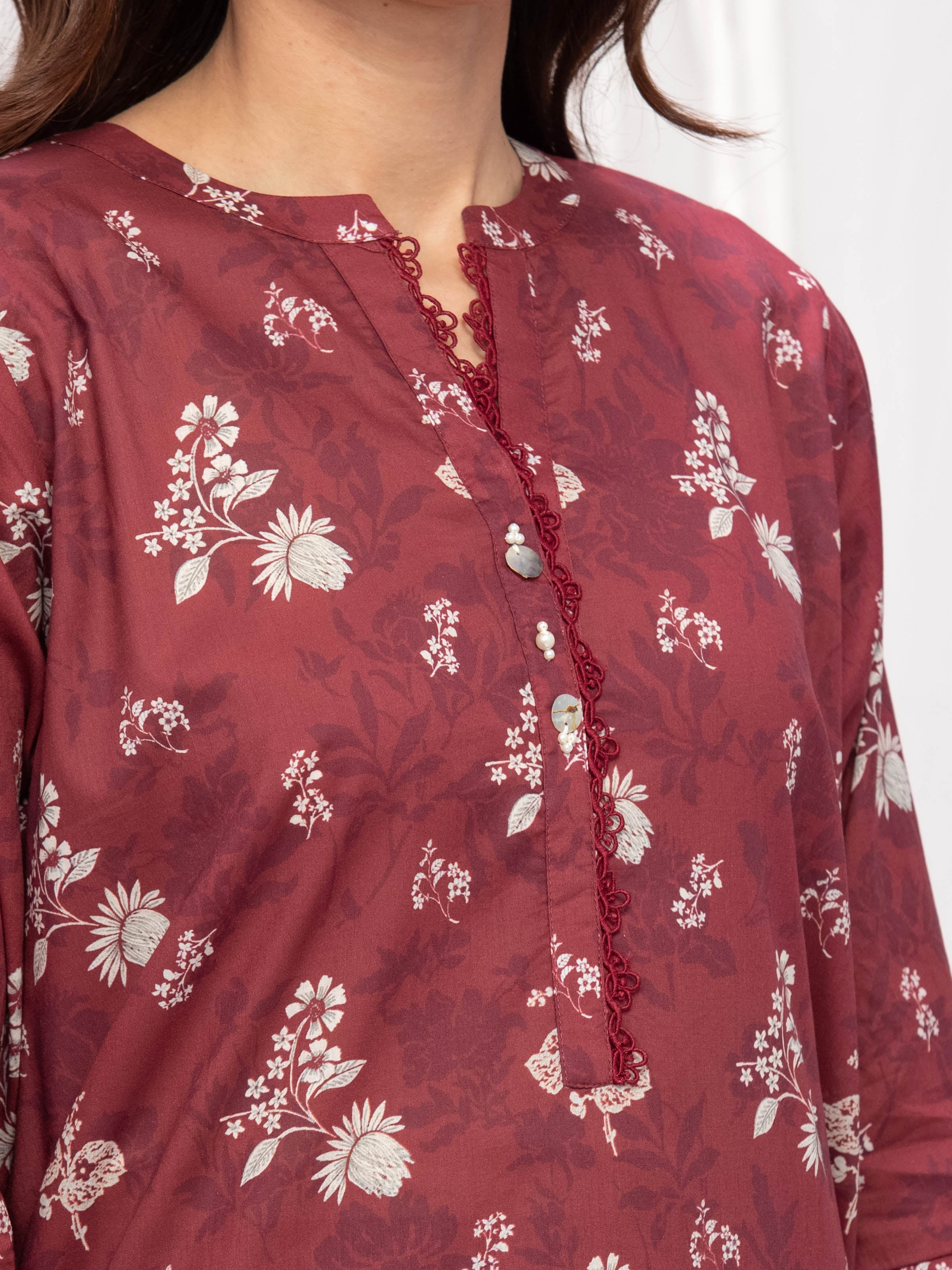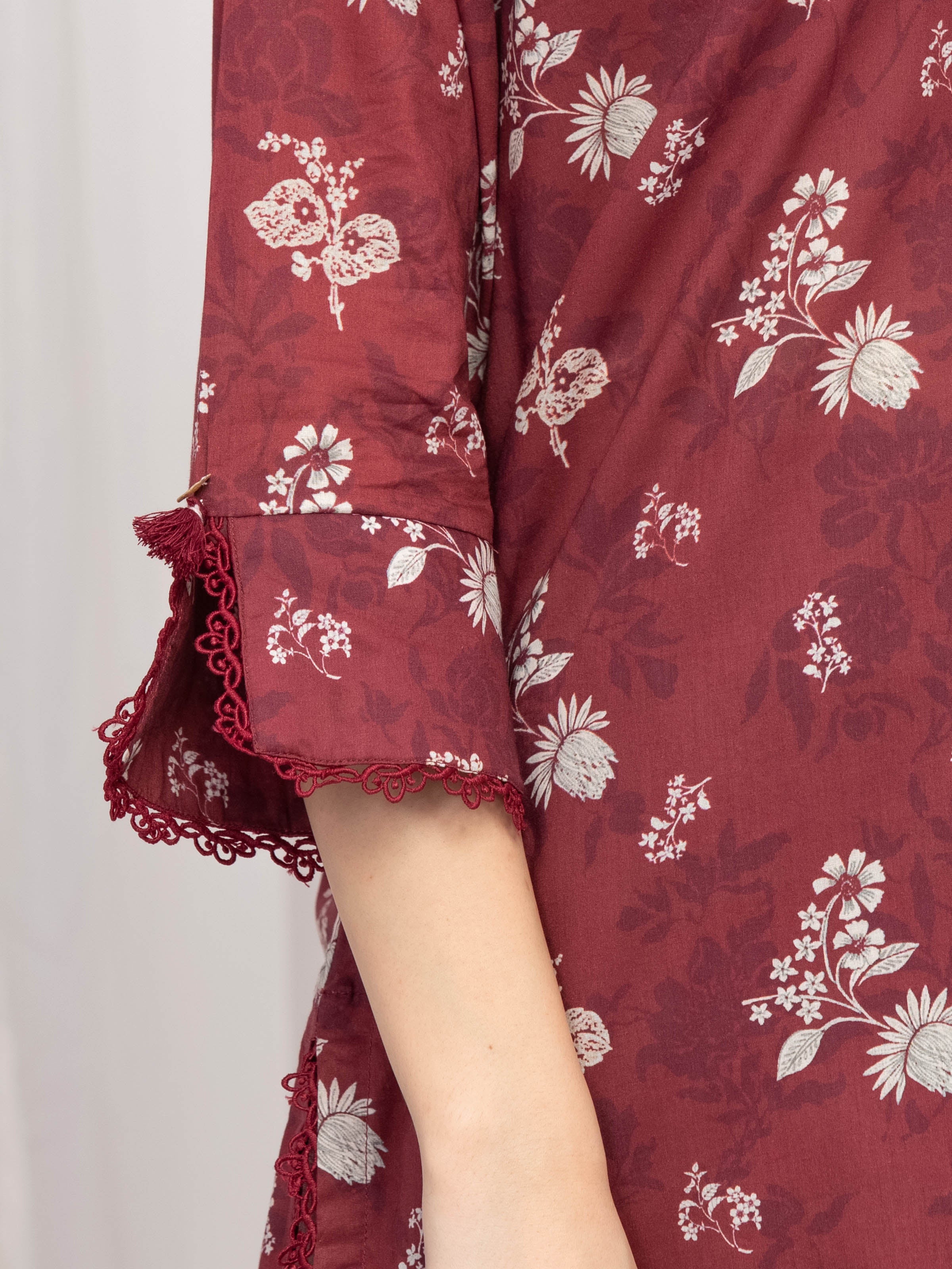 Style: Floral Printed Short Length Kurti with Lace in Placket, Sleeves, & Daman
