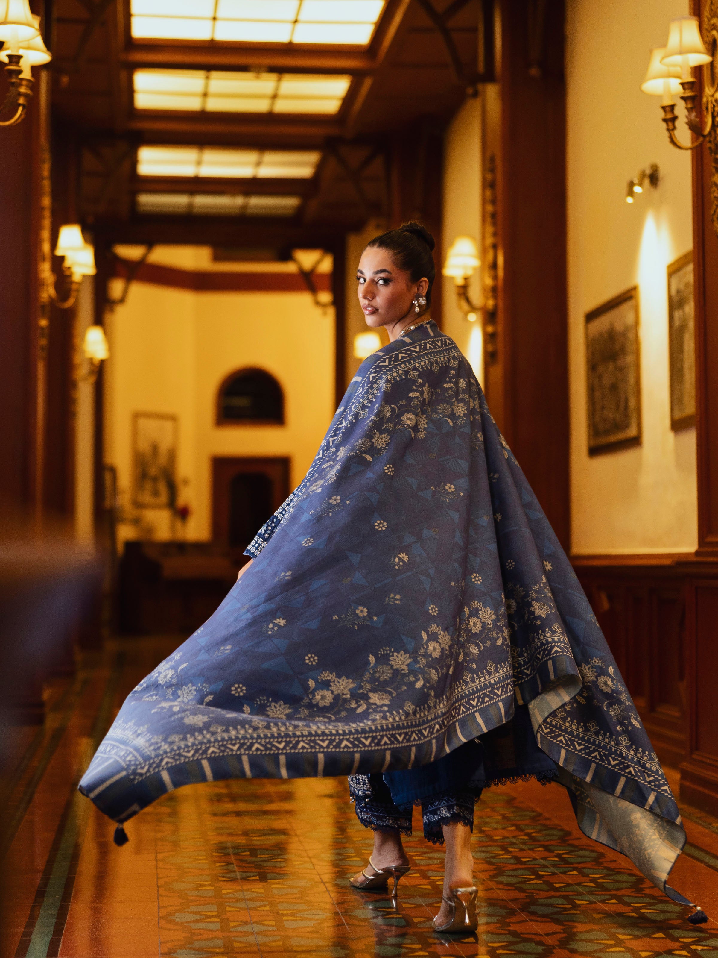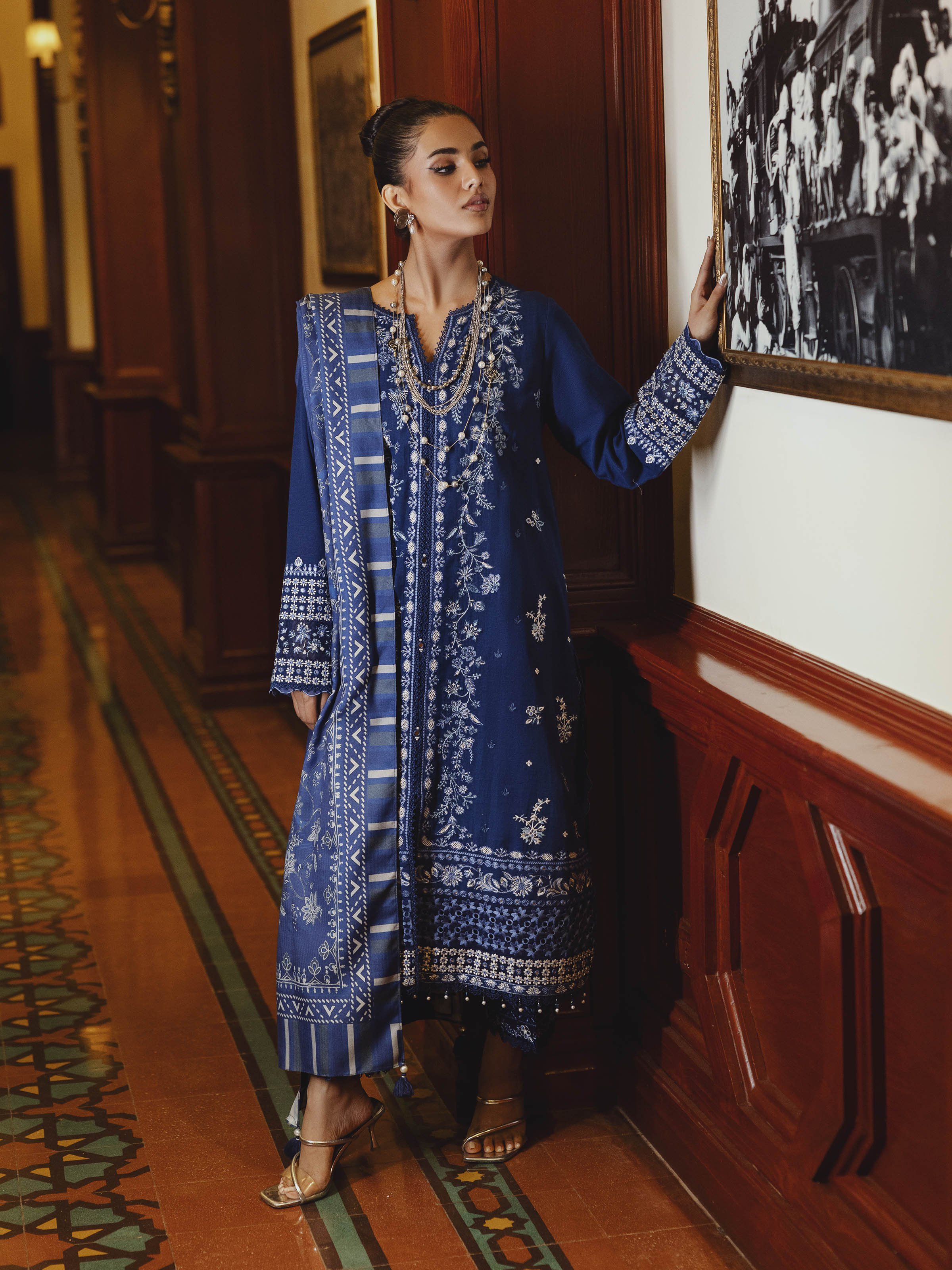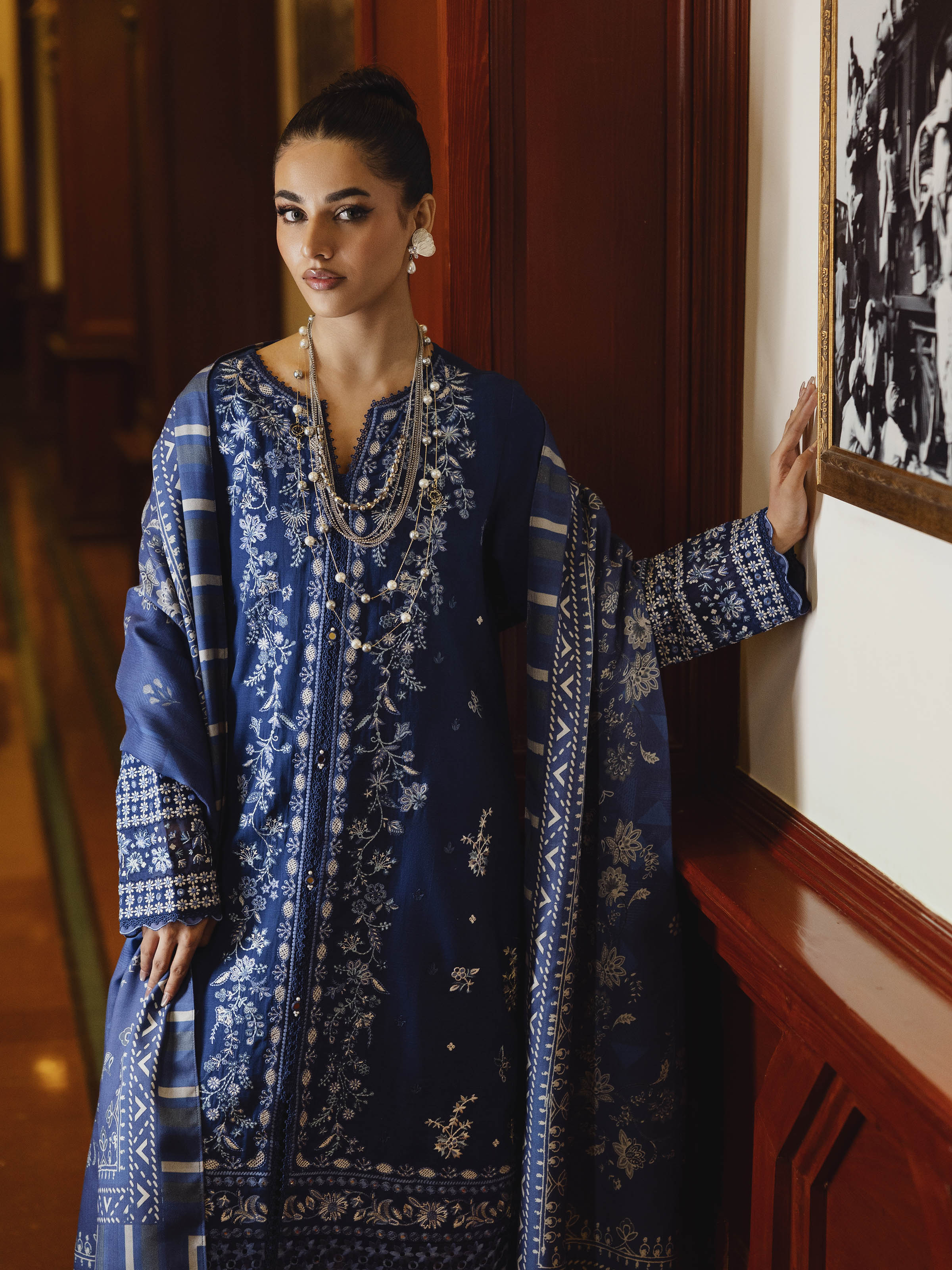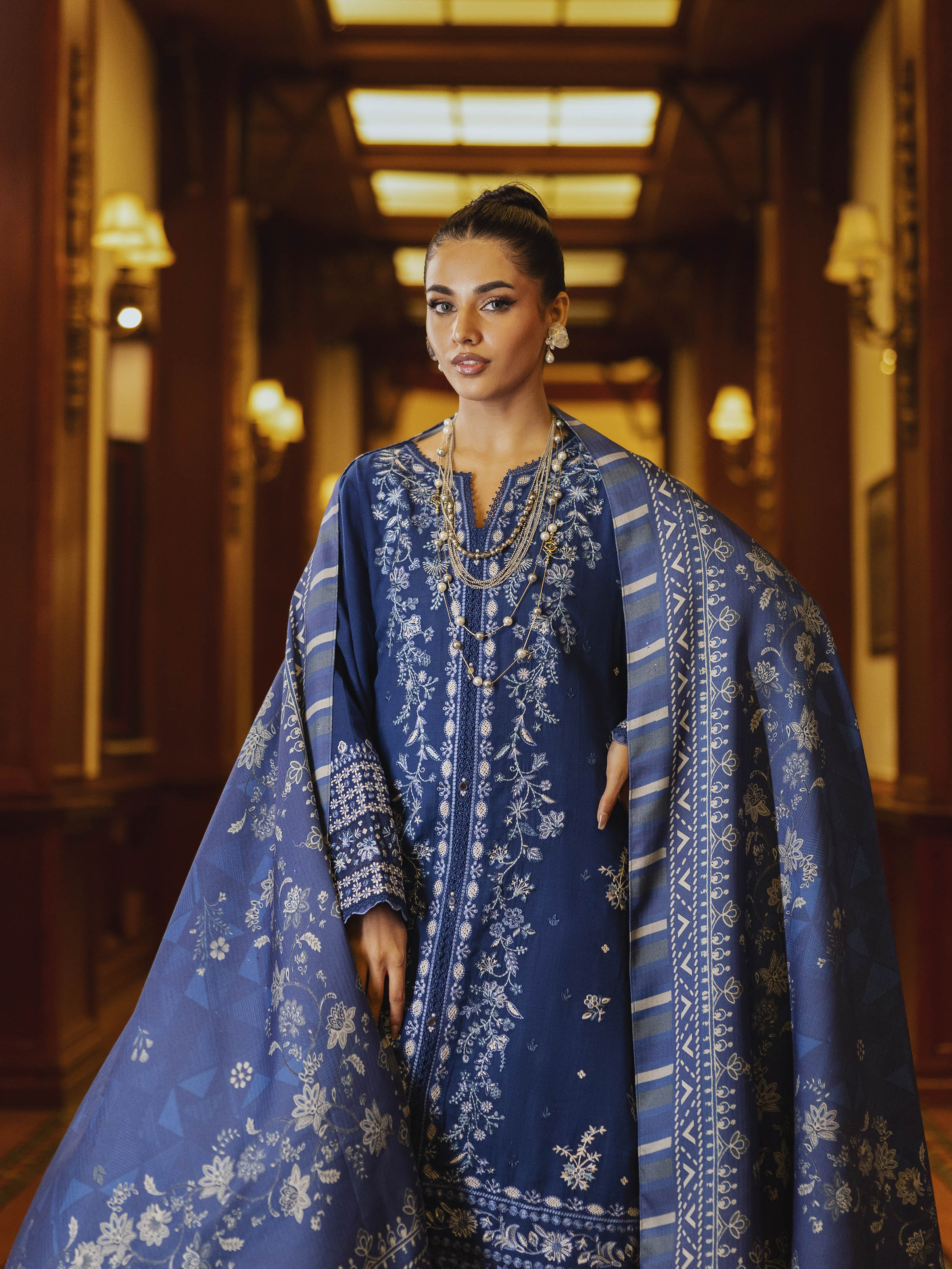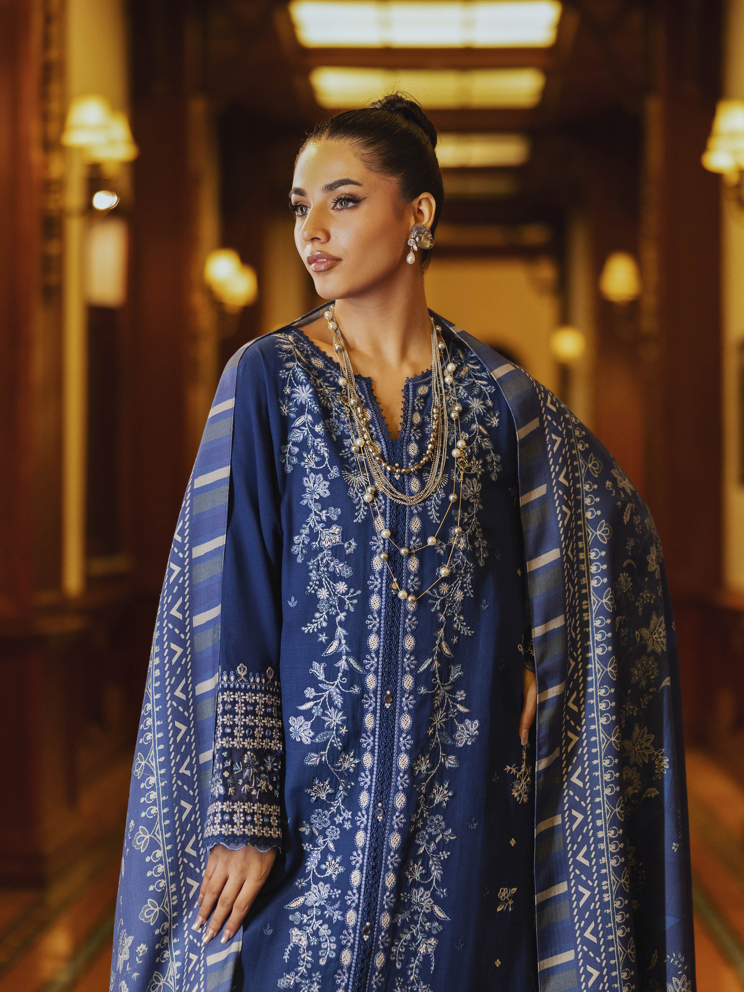 Unstitched Blue Embroidered Khaddar 3 Piece