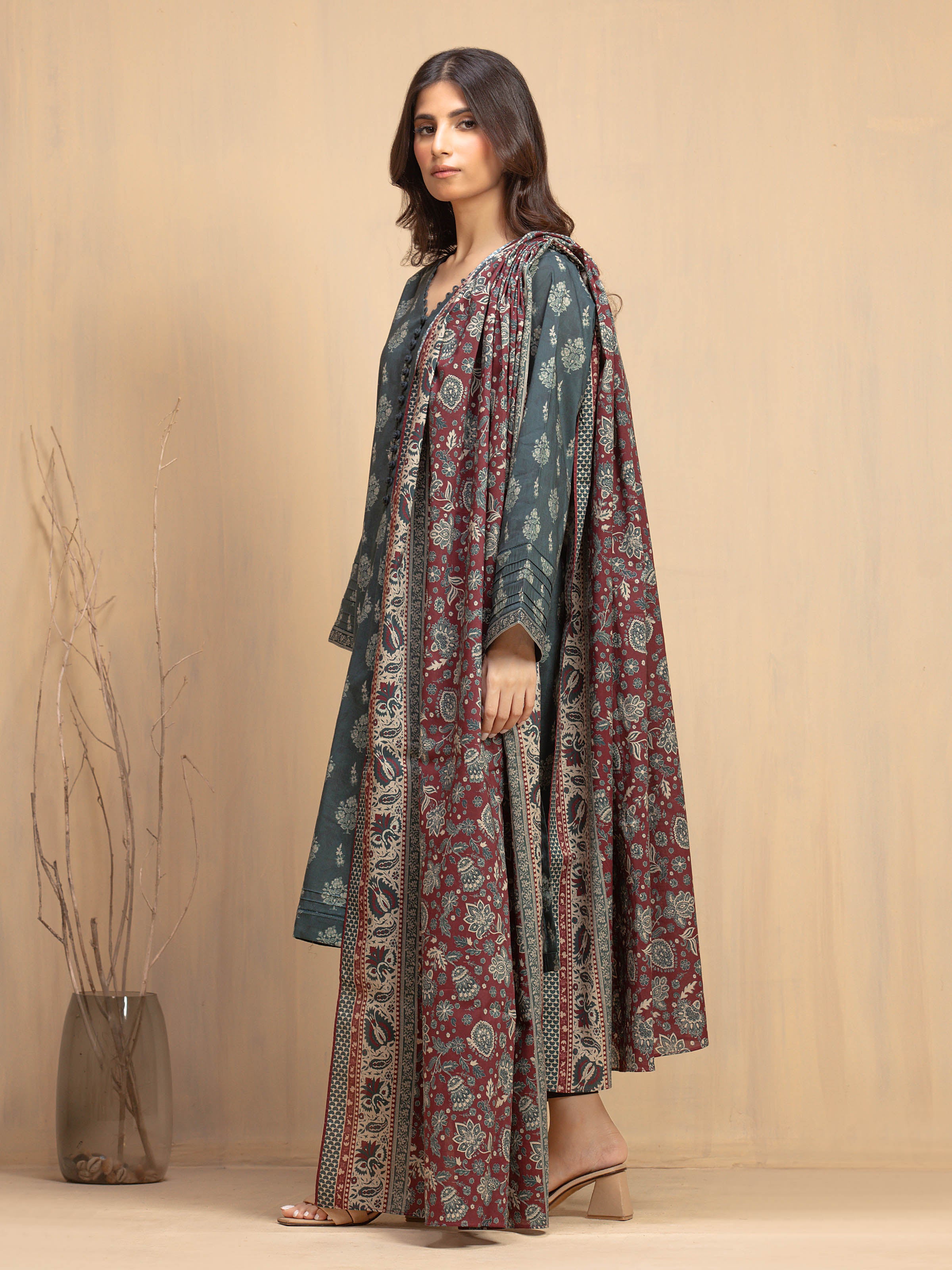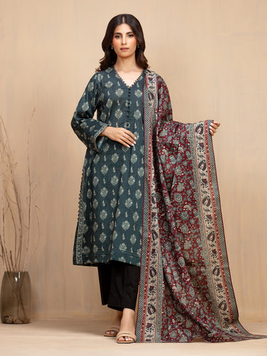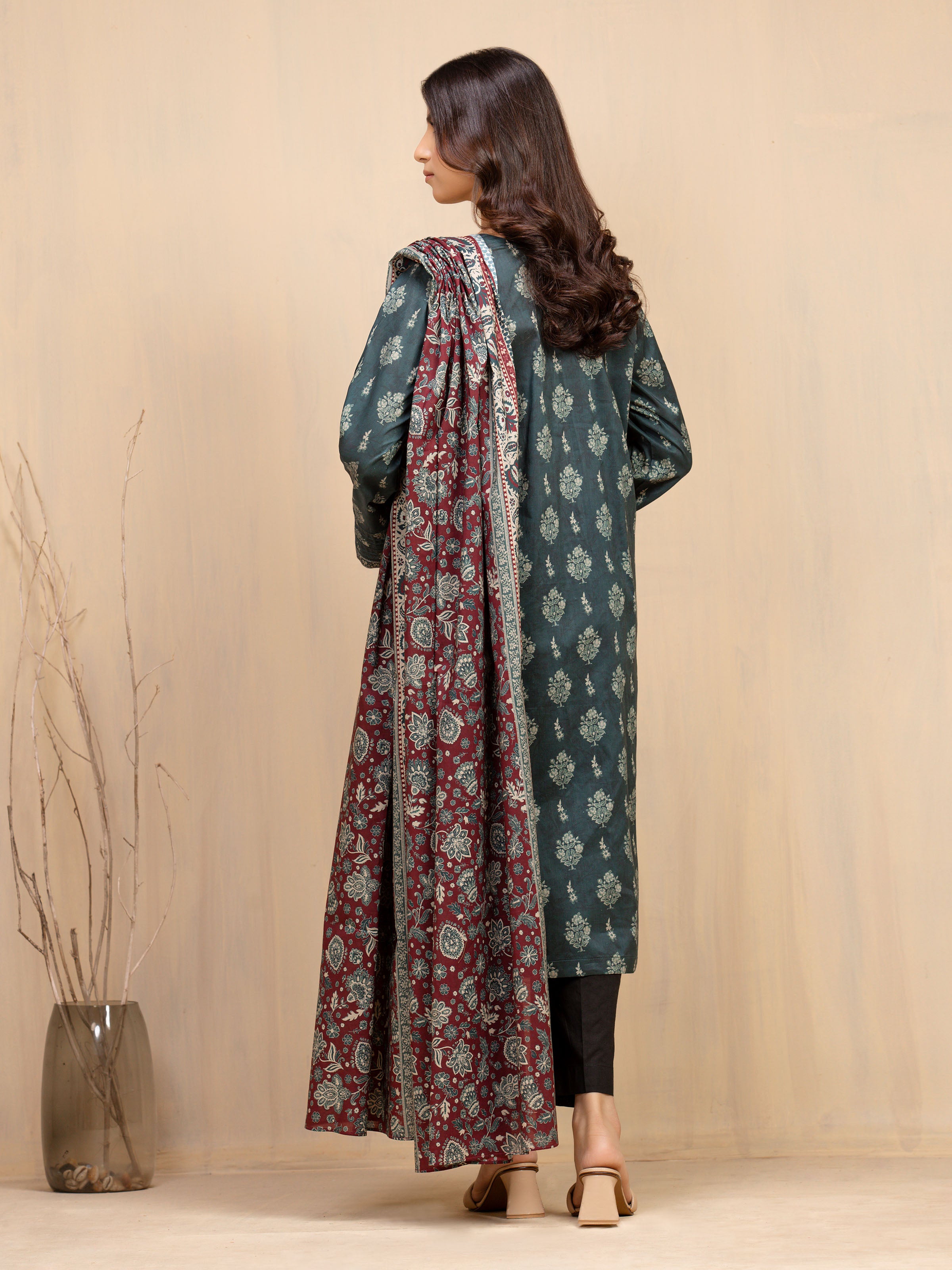 Unstitched Bottle Green Printed Khaddar 3 Piece