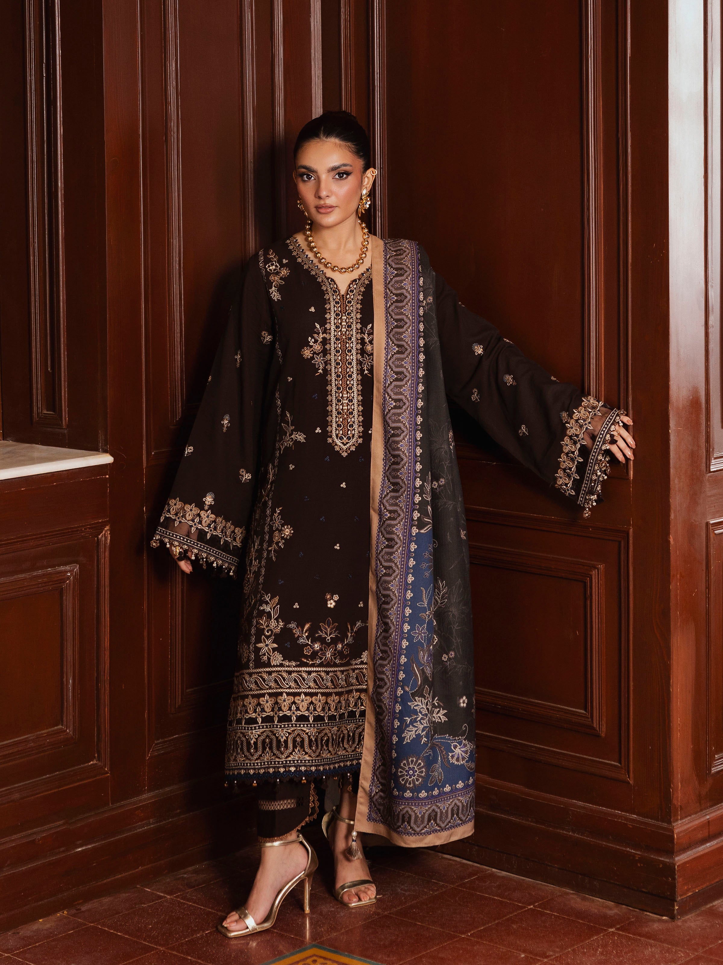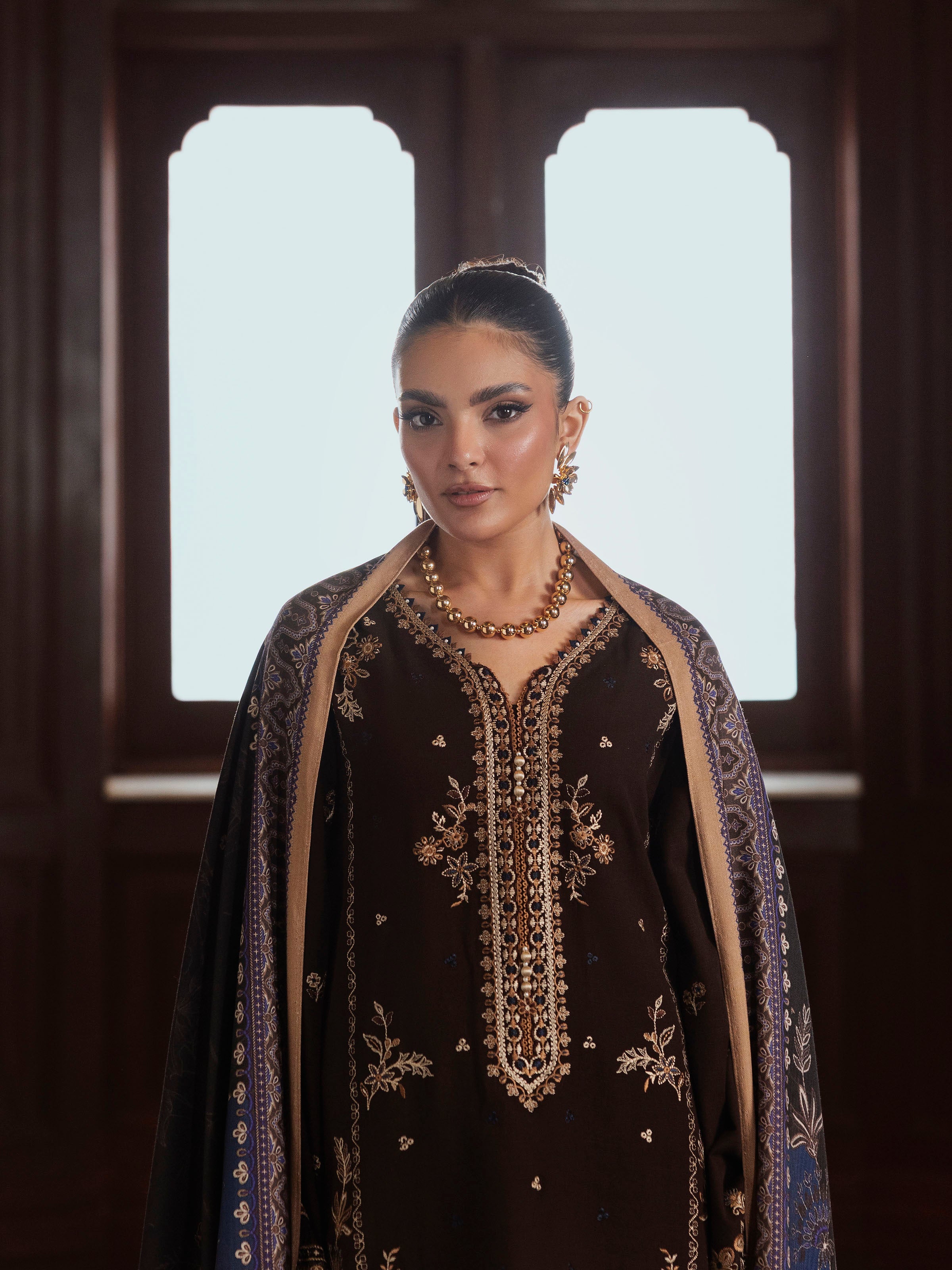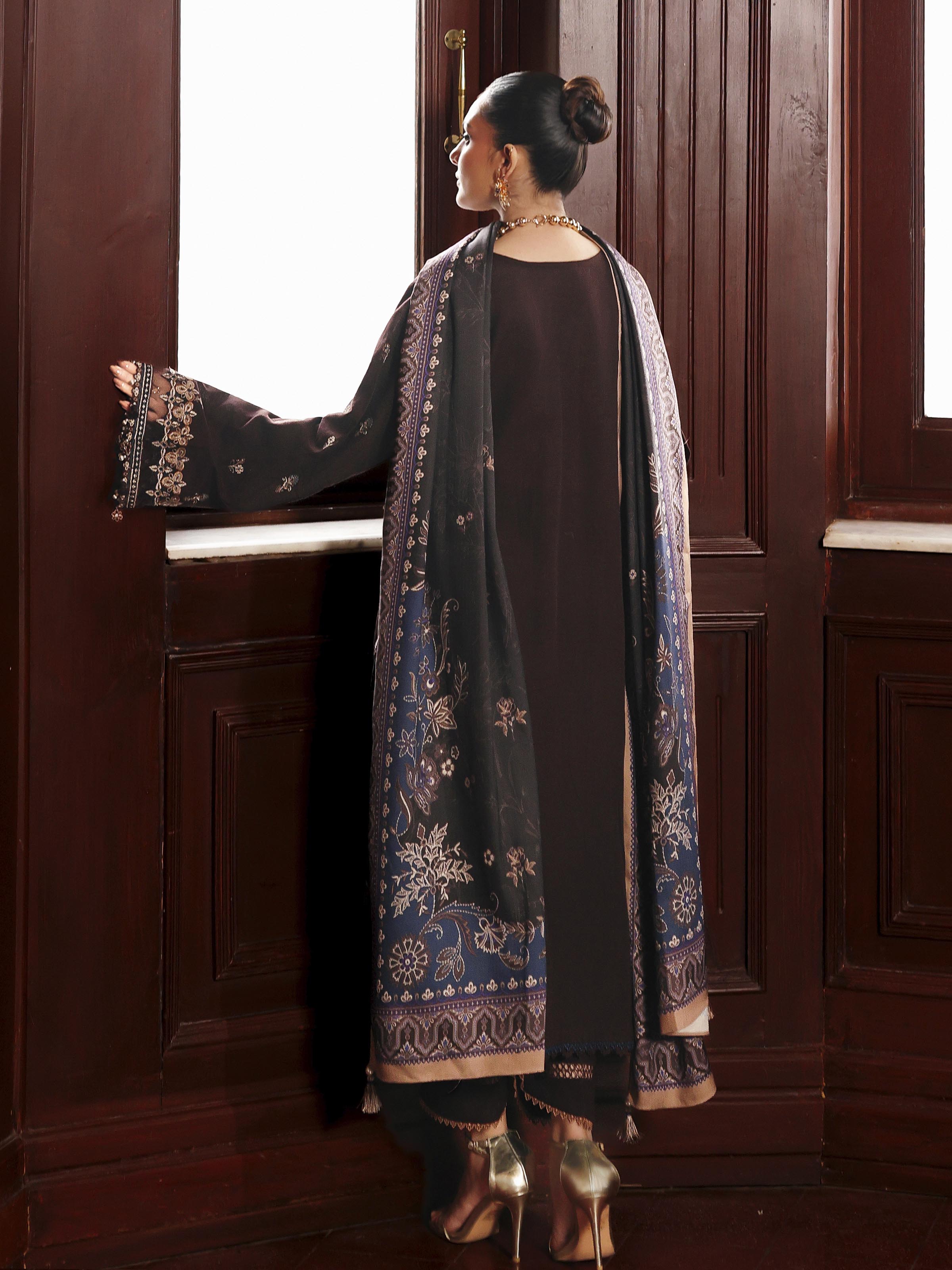 Unstitched Dark Brown Embroidered Khaddar 3 Piece