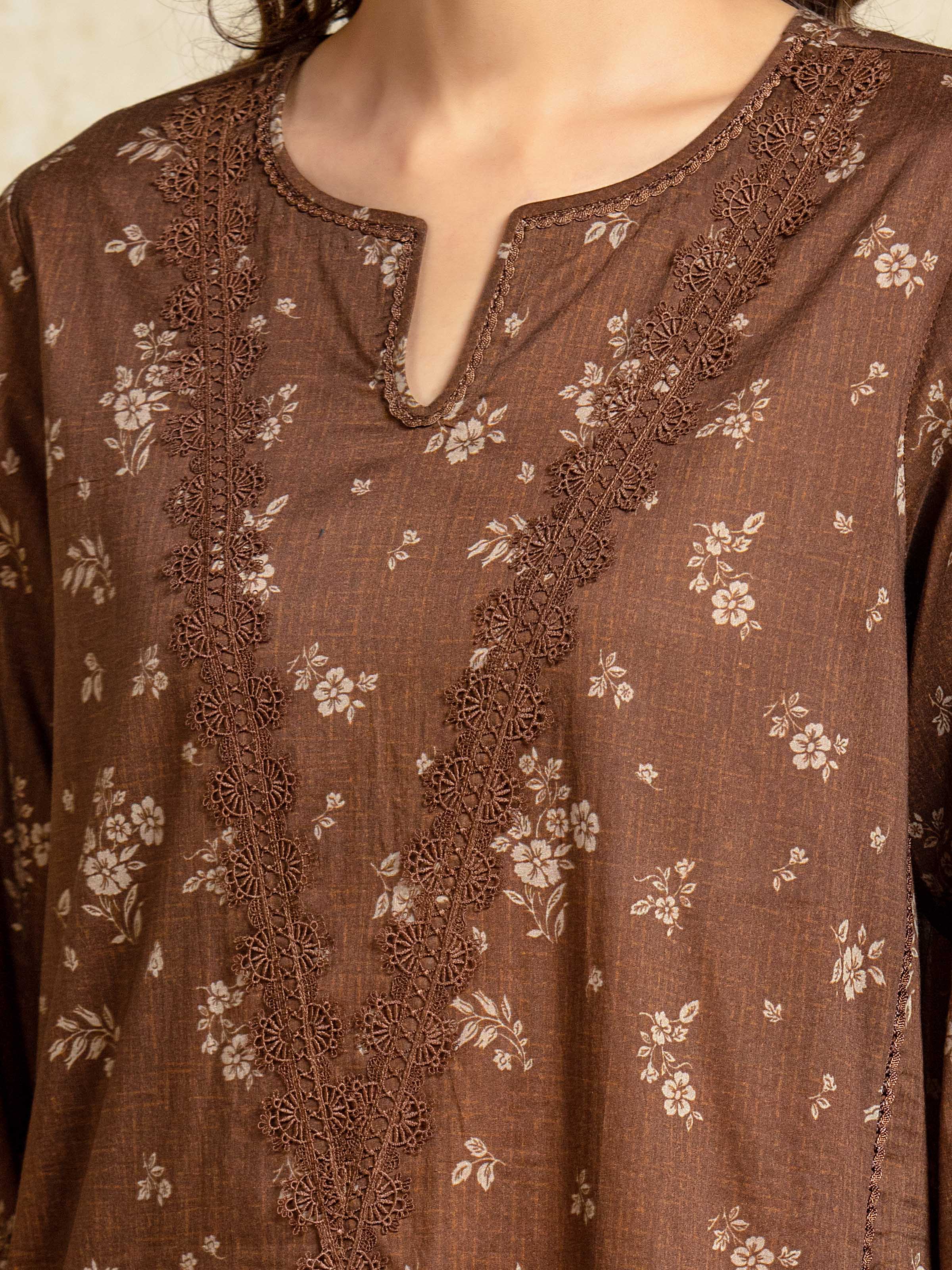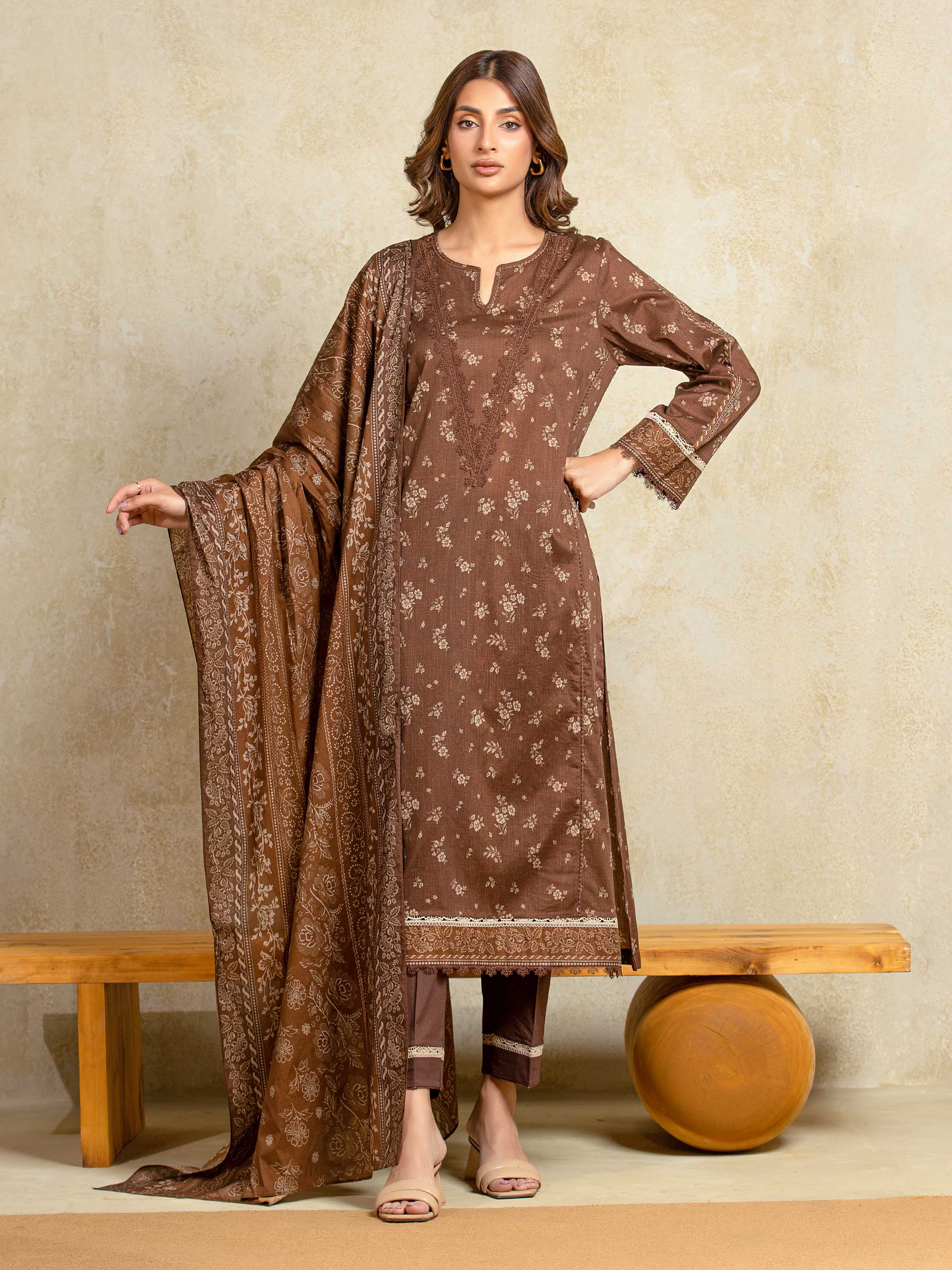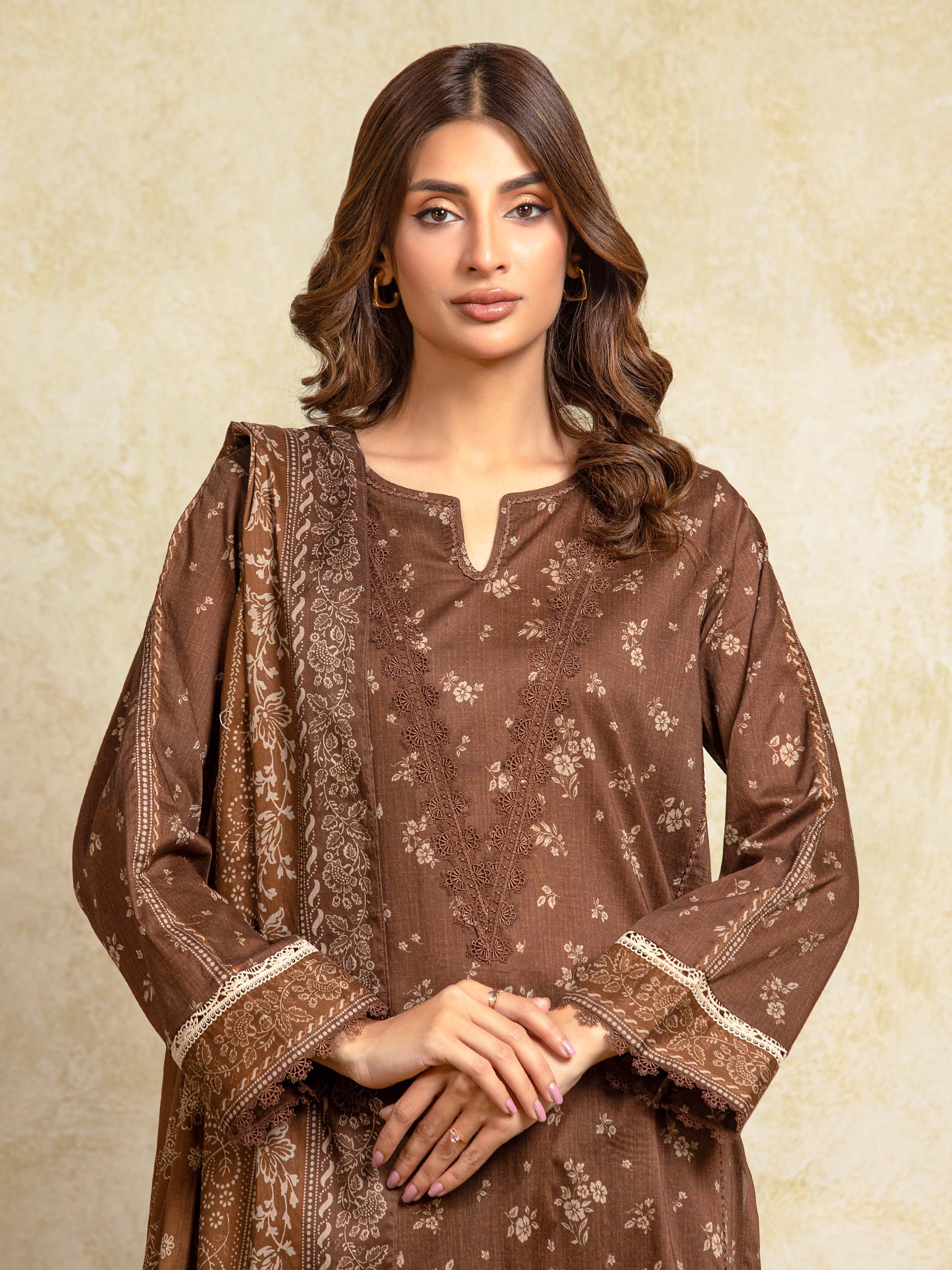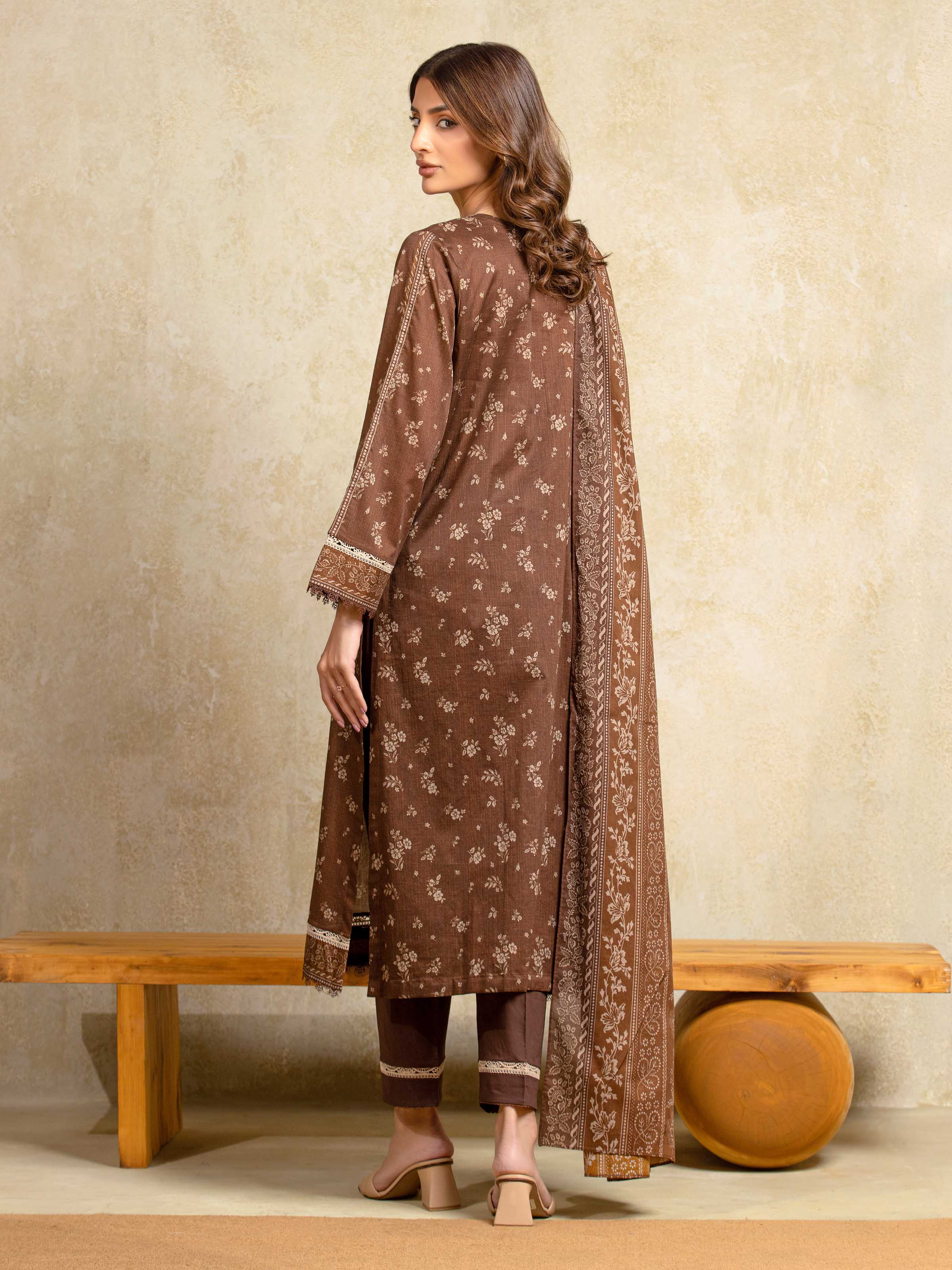 Unstitched Dark Brown Printed Khaddar 3 Piece