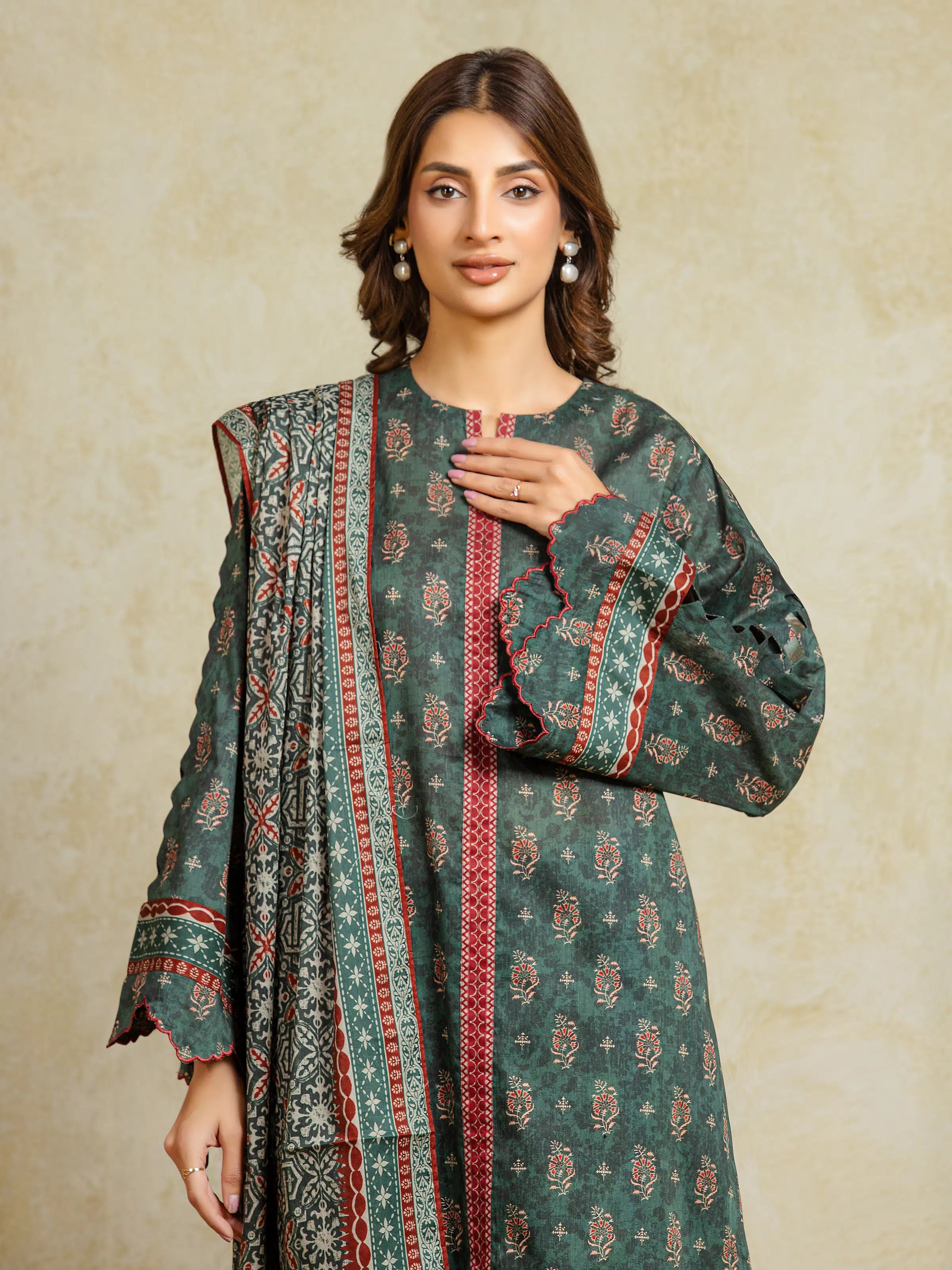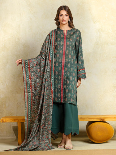 Unstitched Dark Green Printed Khaddar 3 Piece