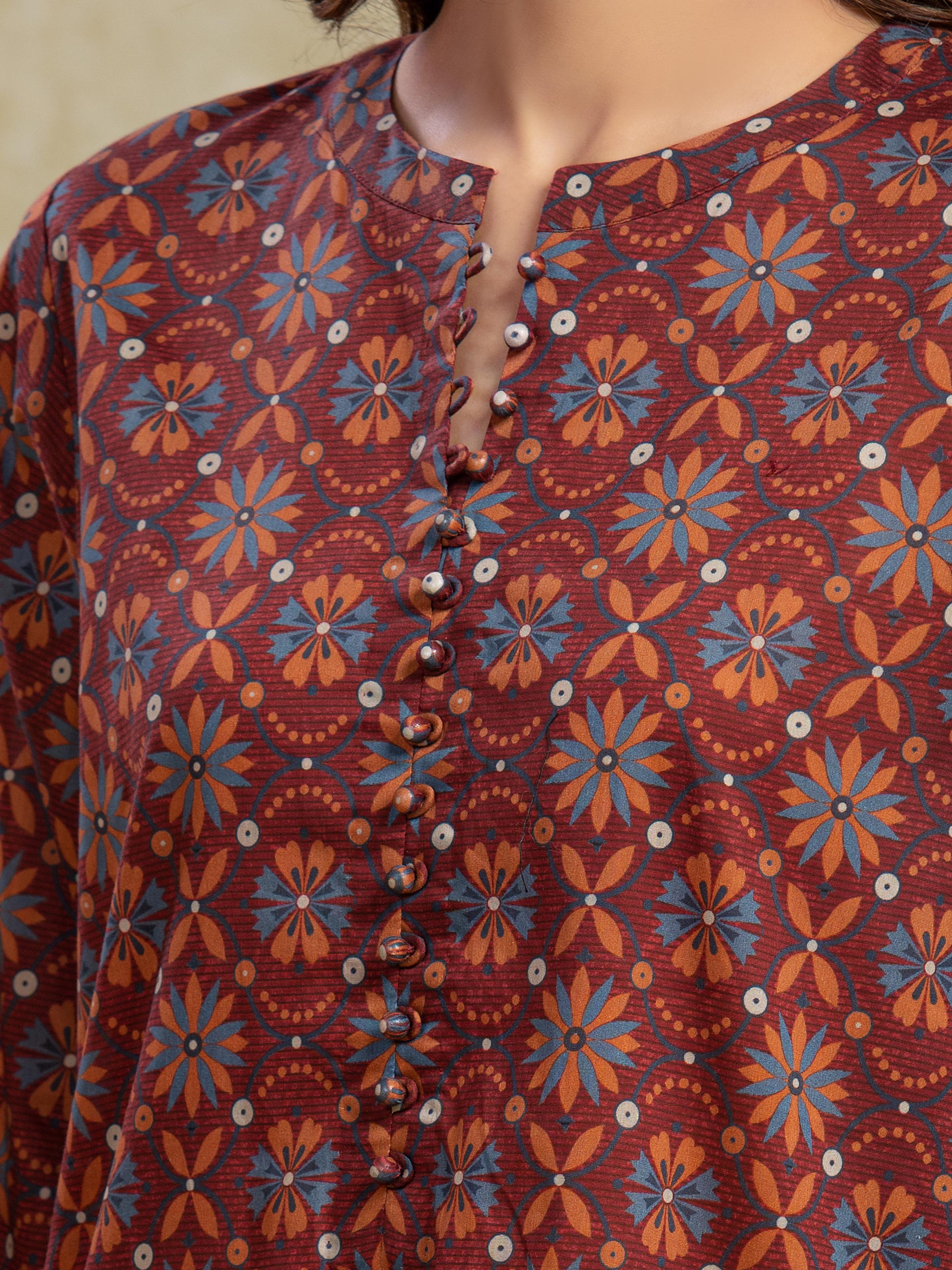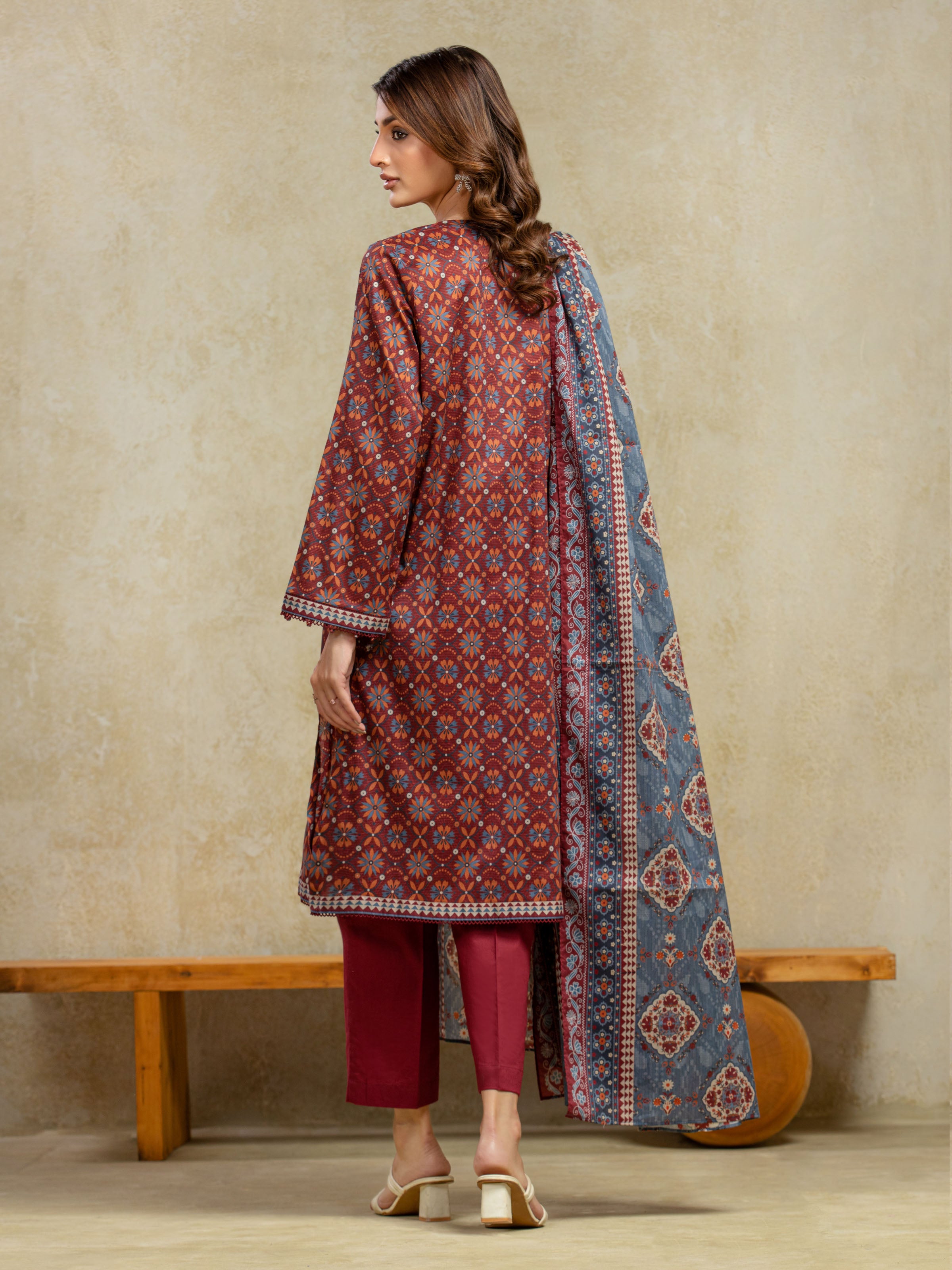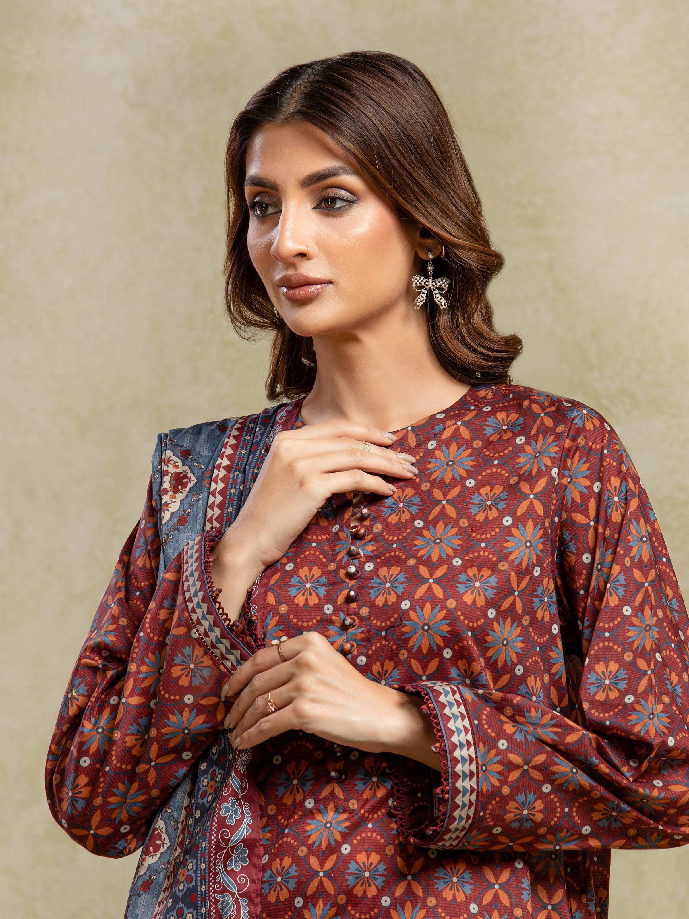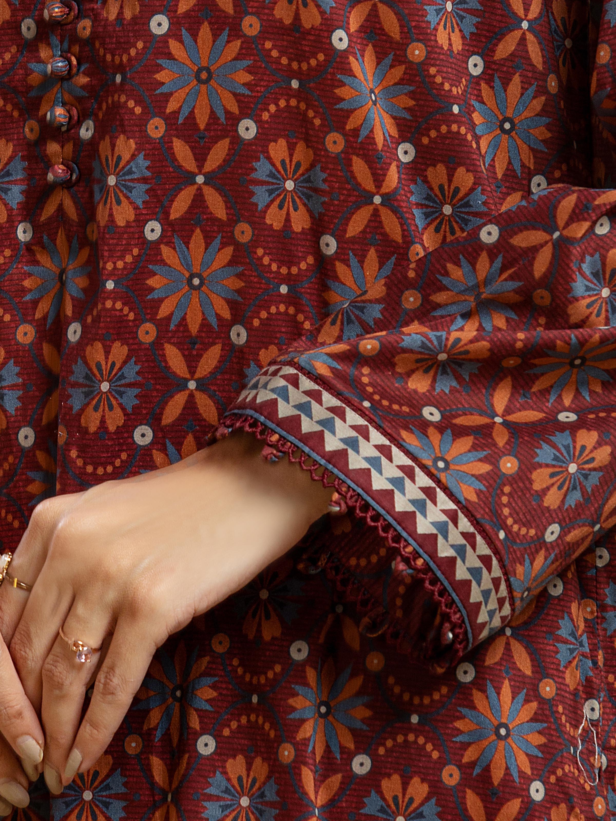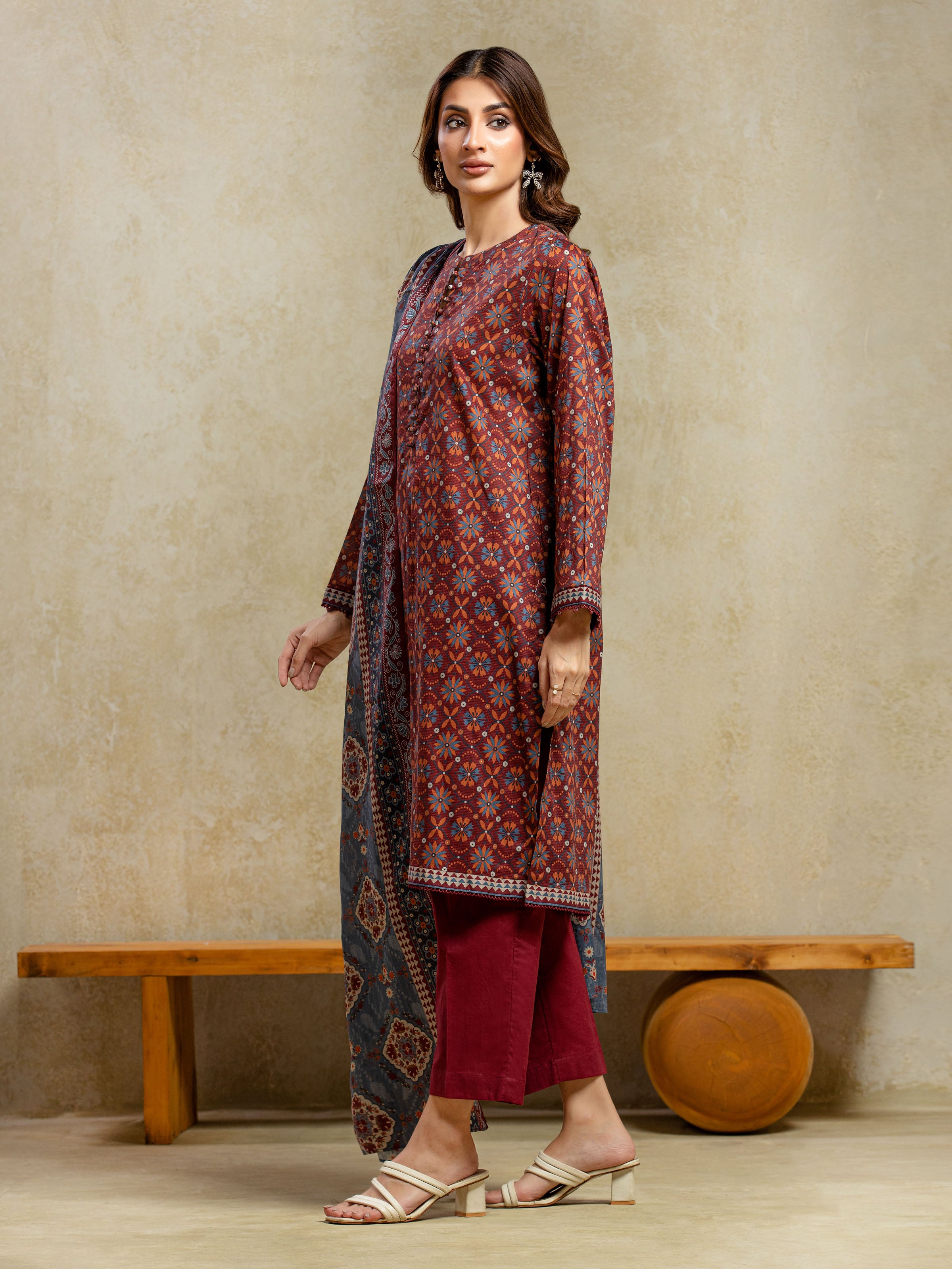 Unstitched Dark Maroon Printed Khaddar 3 Piece