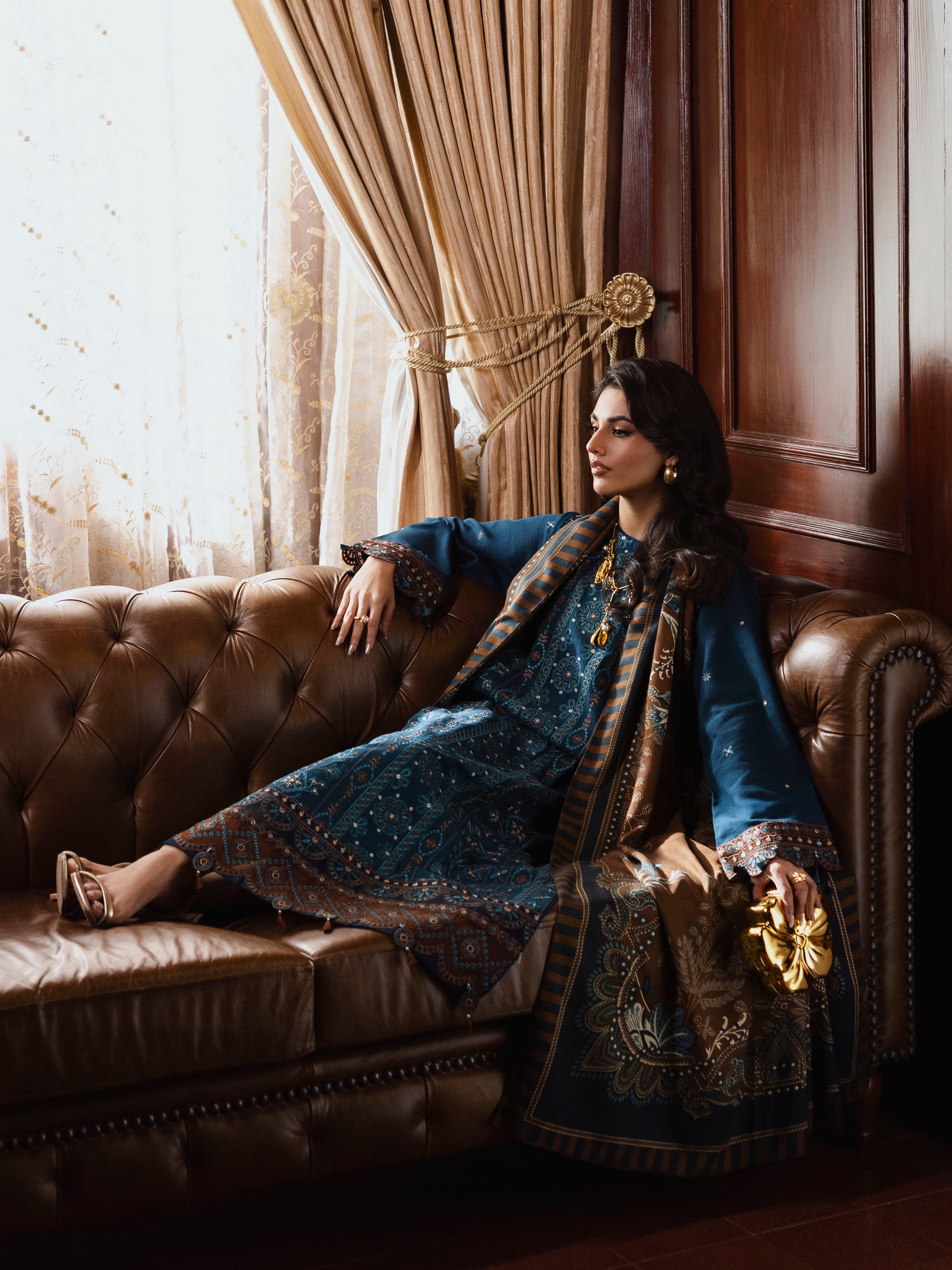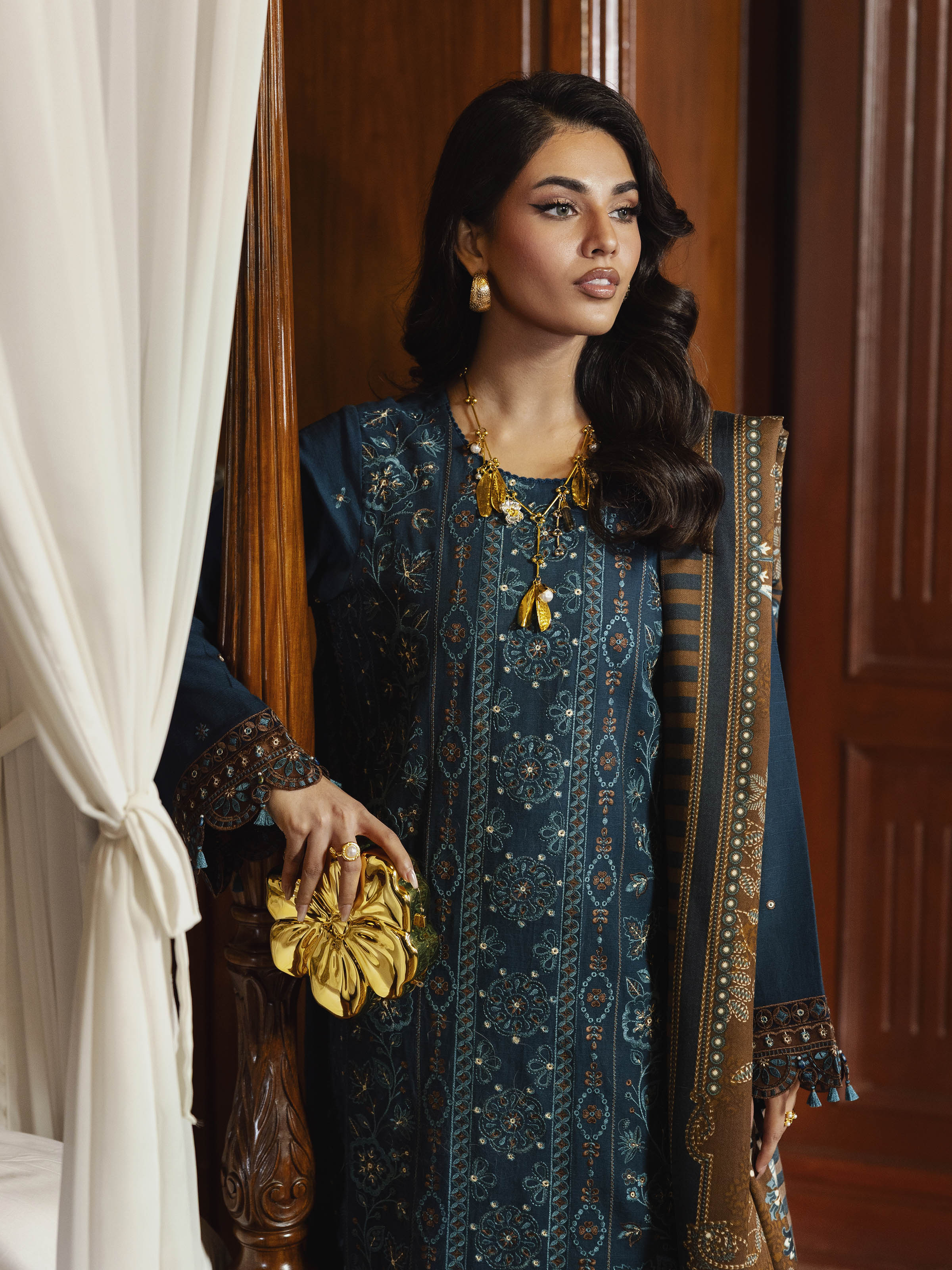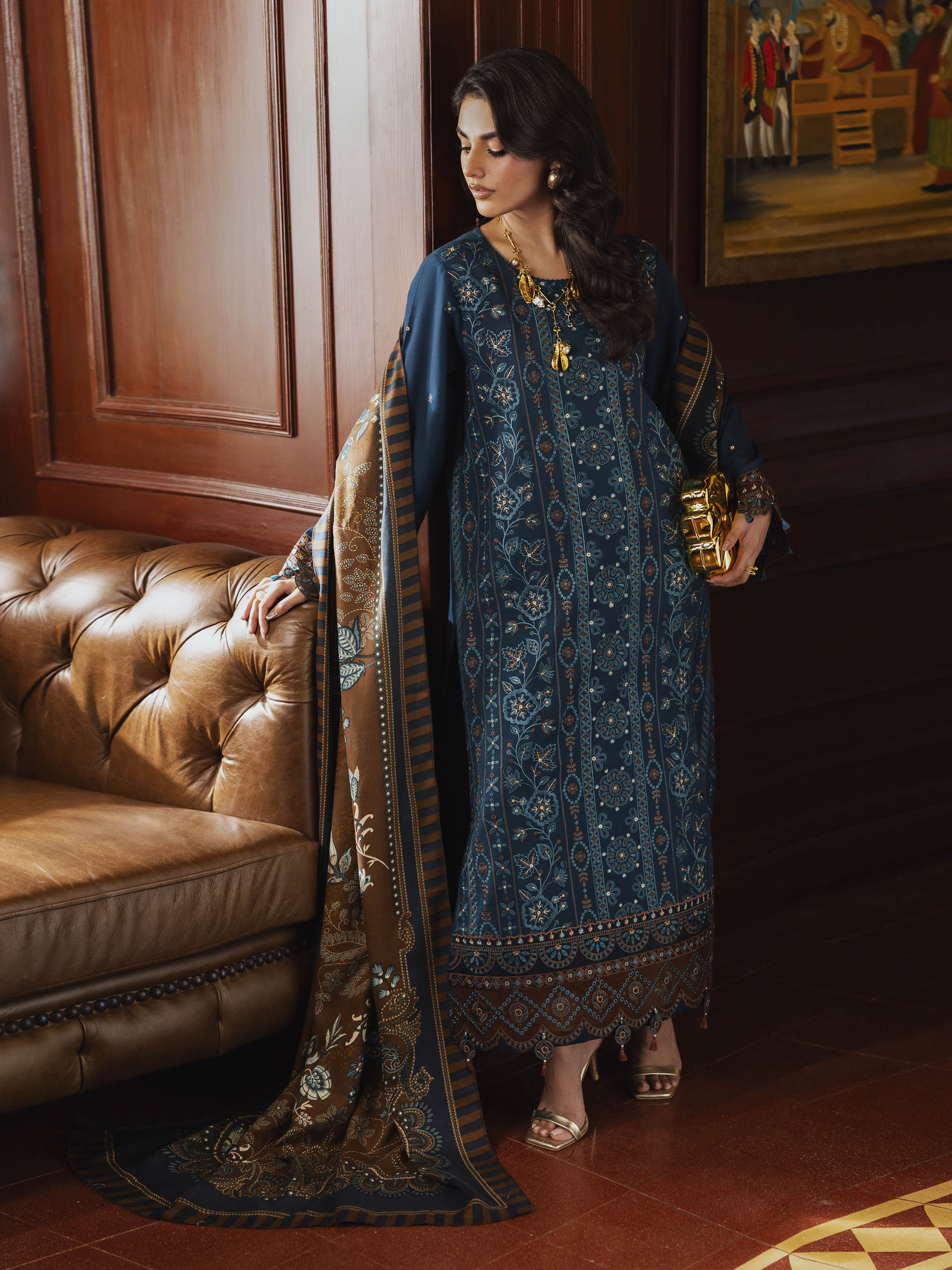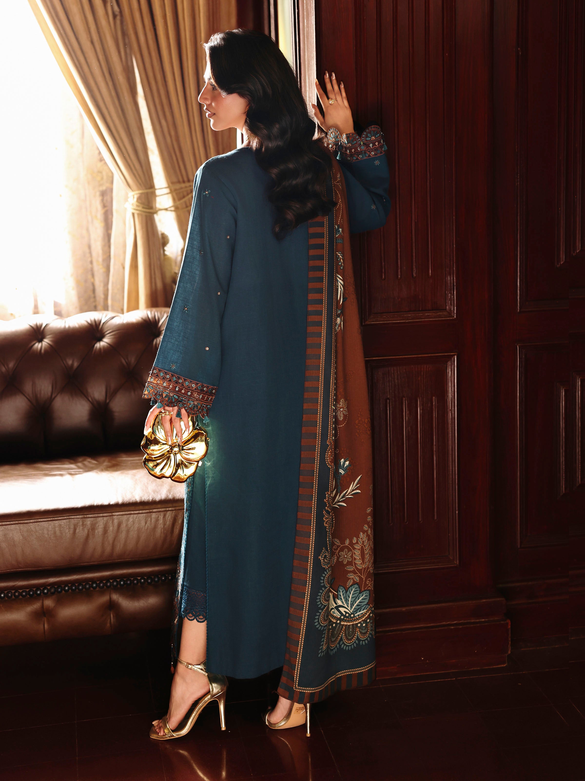 Unstitched Dark Teal Embroidered Khaddar 3 Piece
