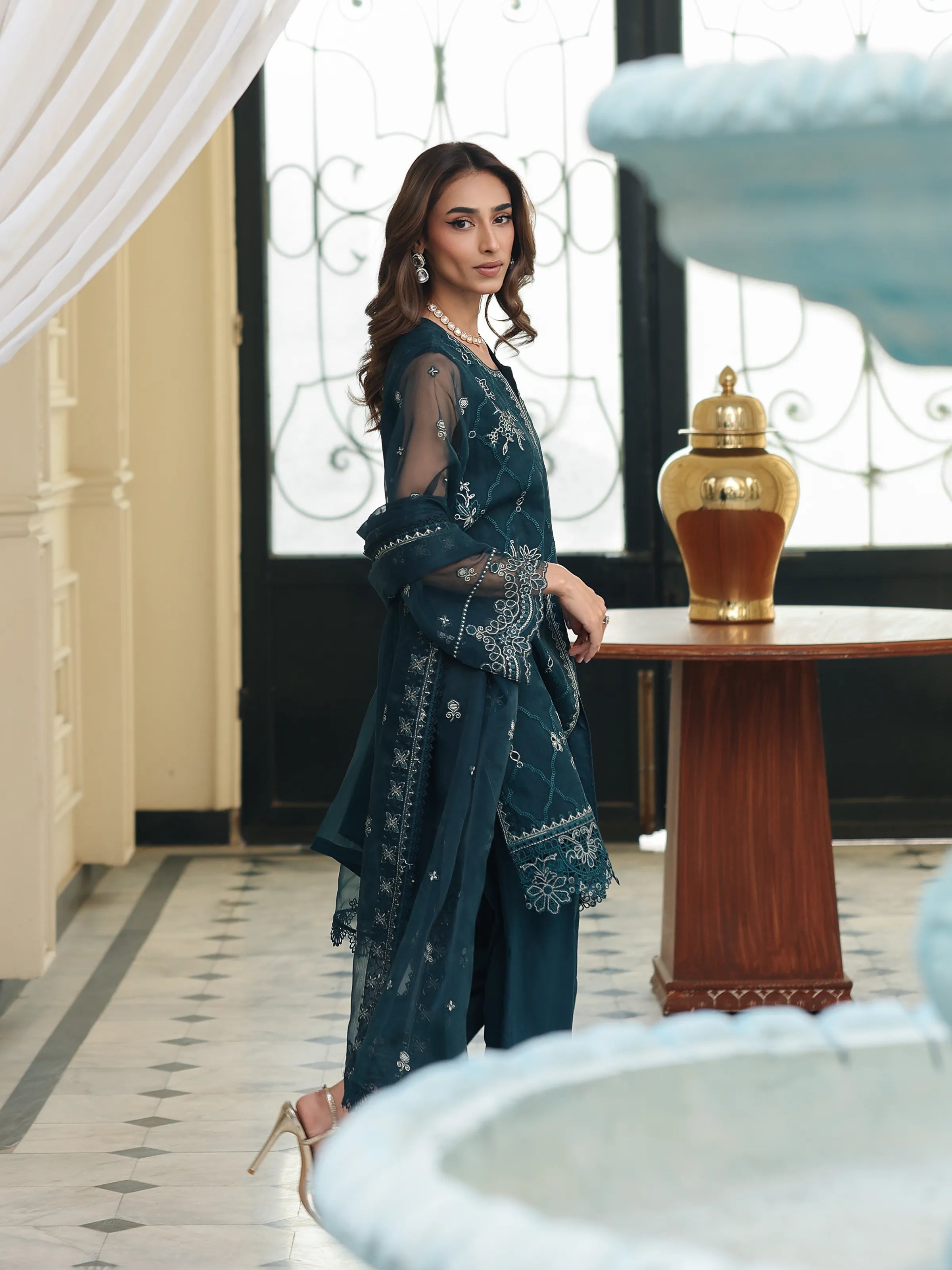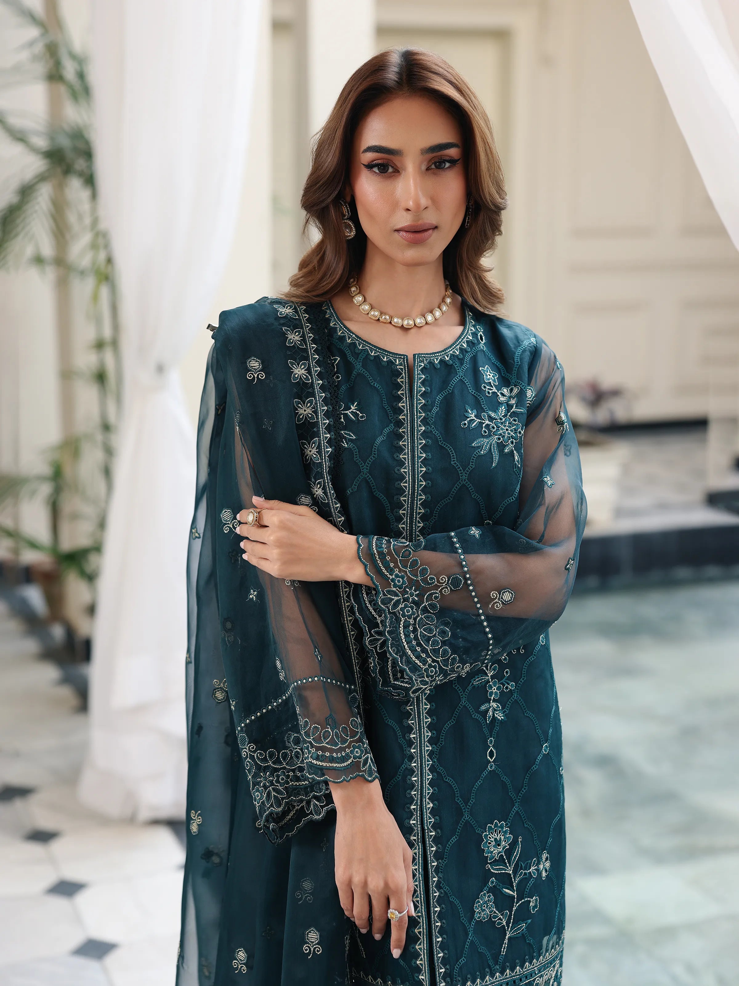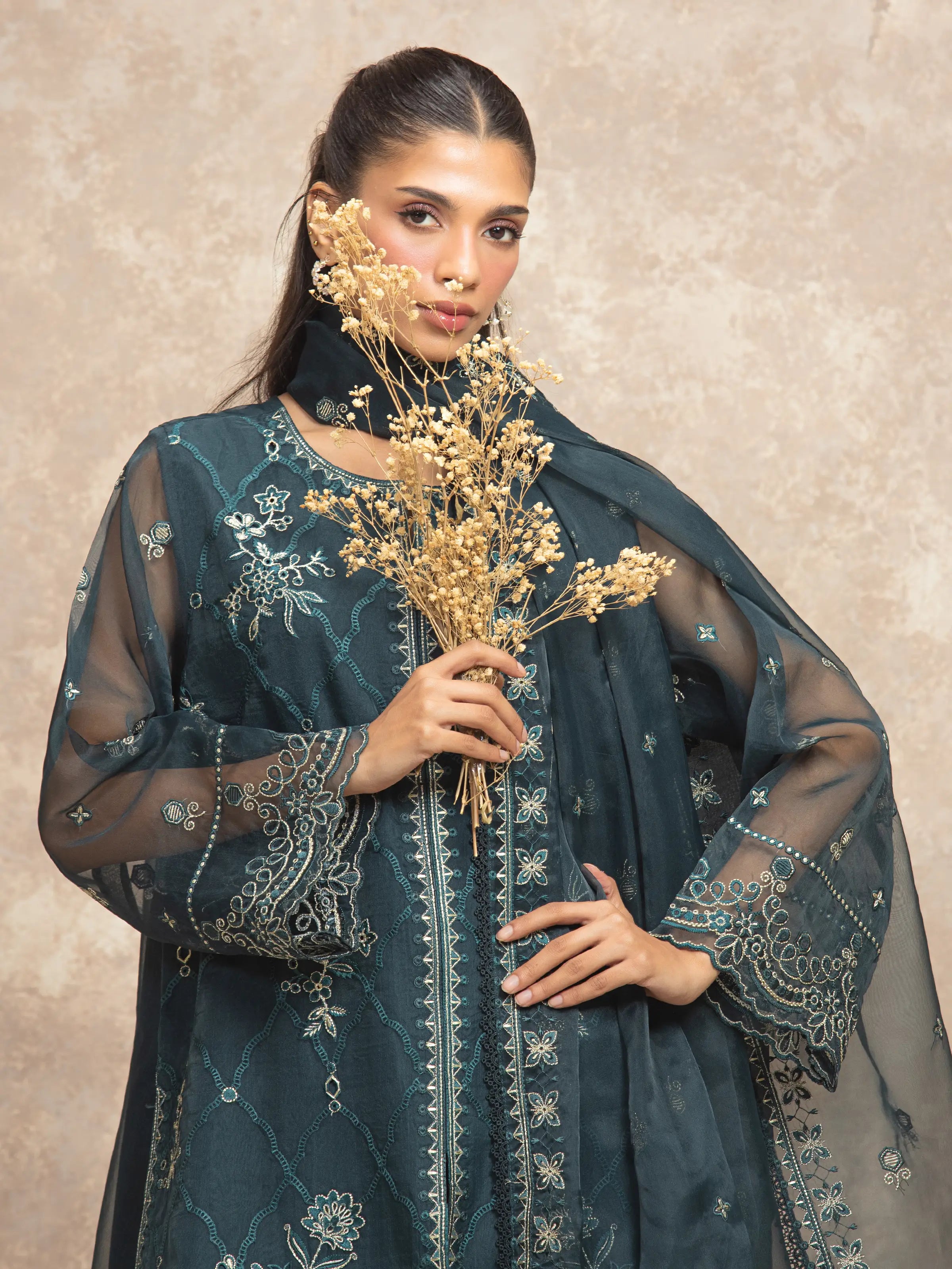 Unstitched Dark Teal Embroidered Organza 3 Piece