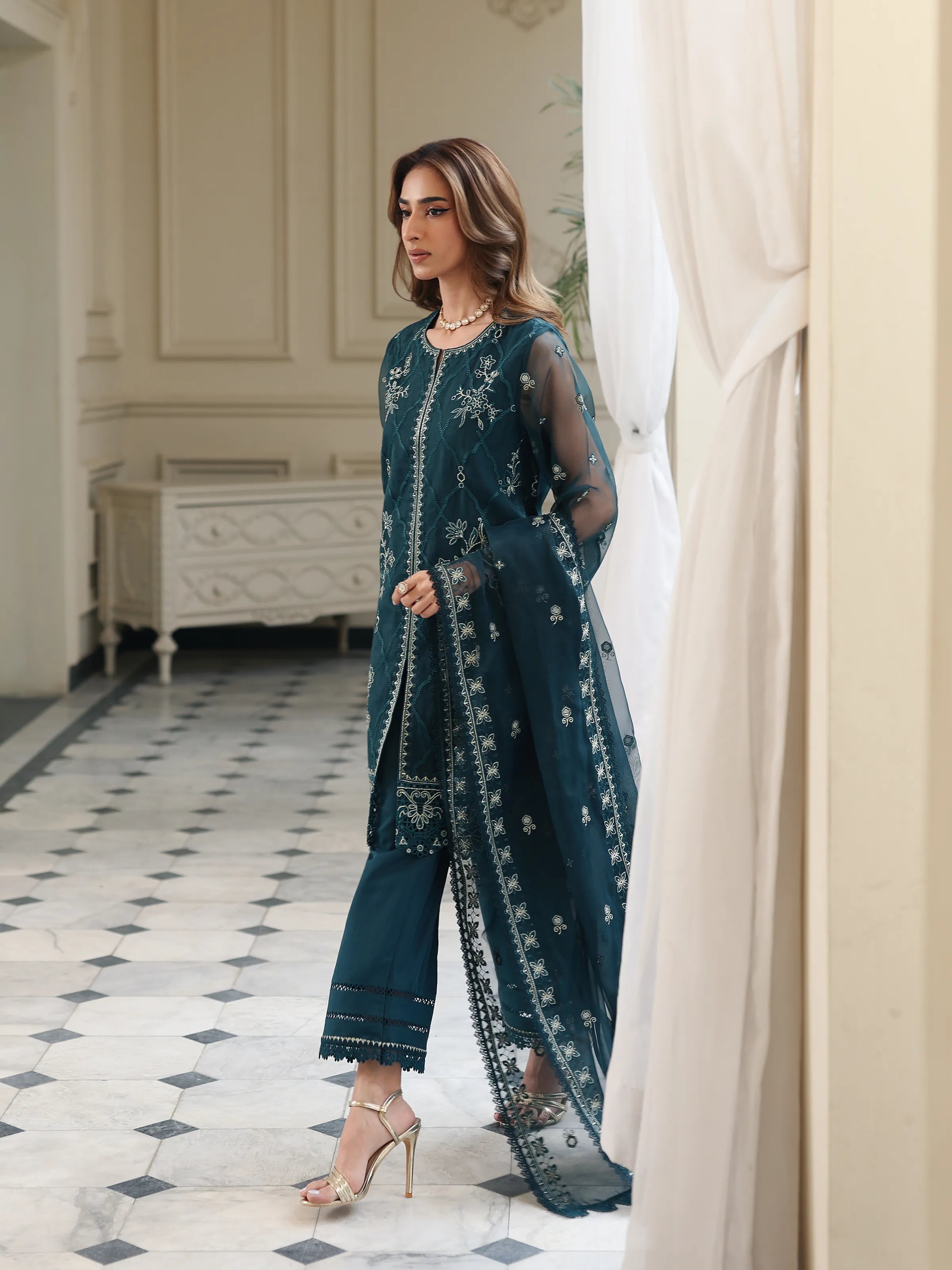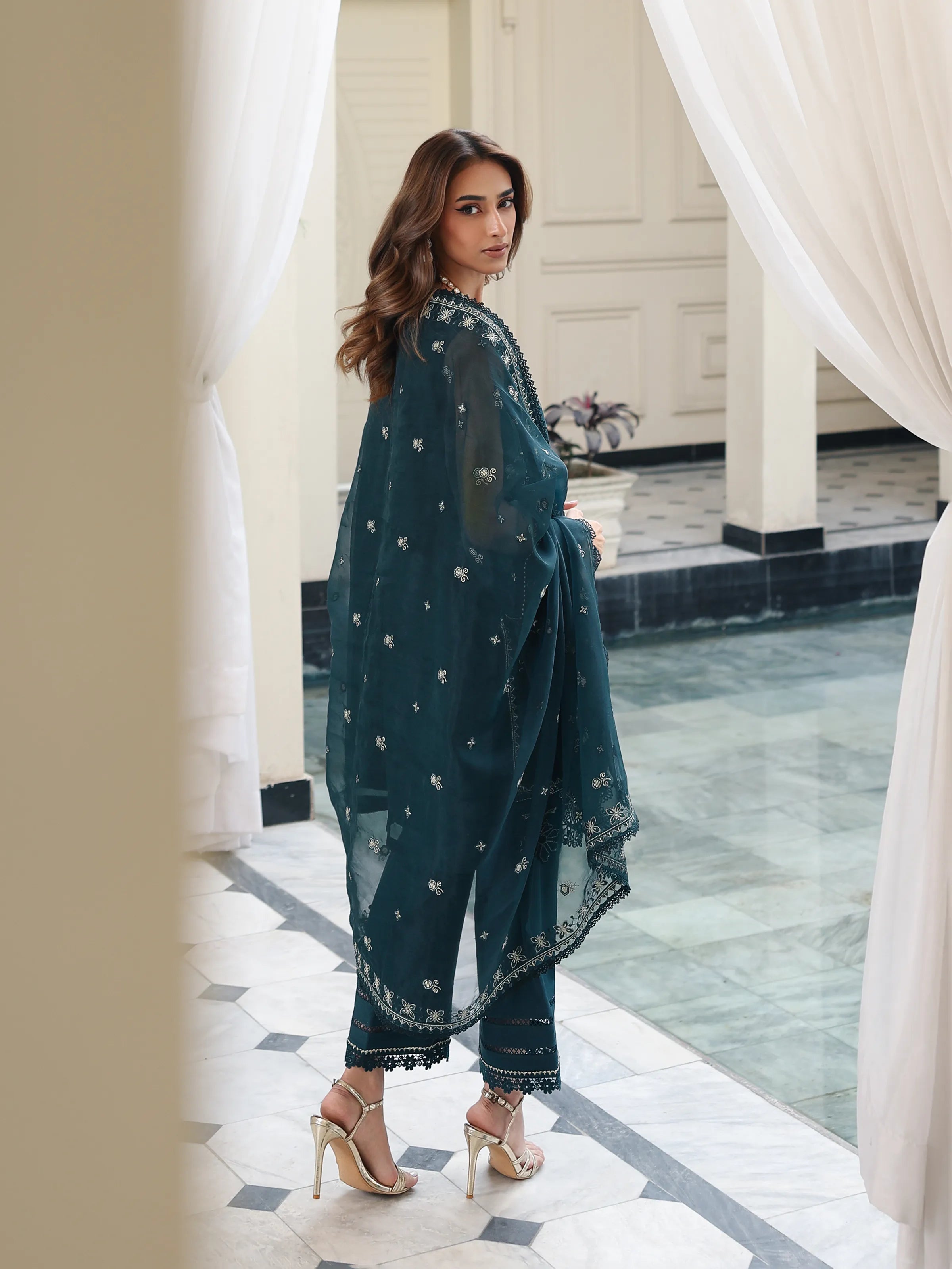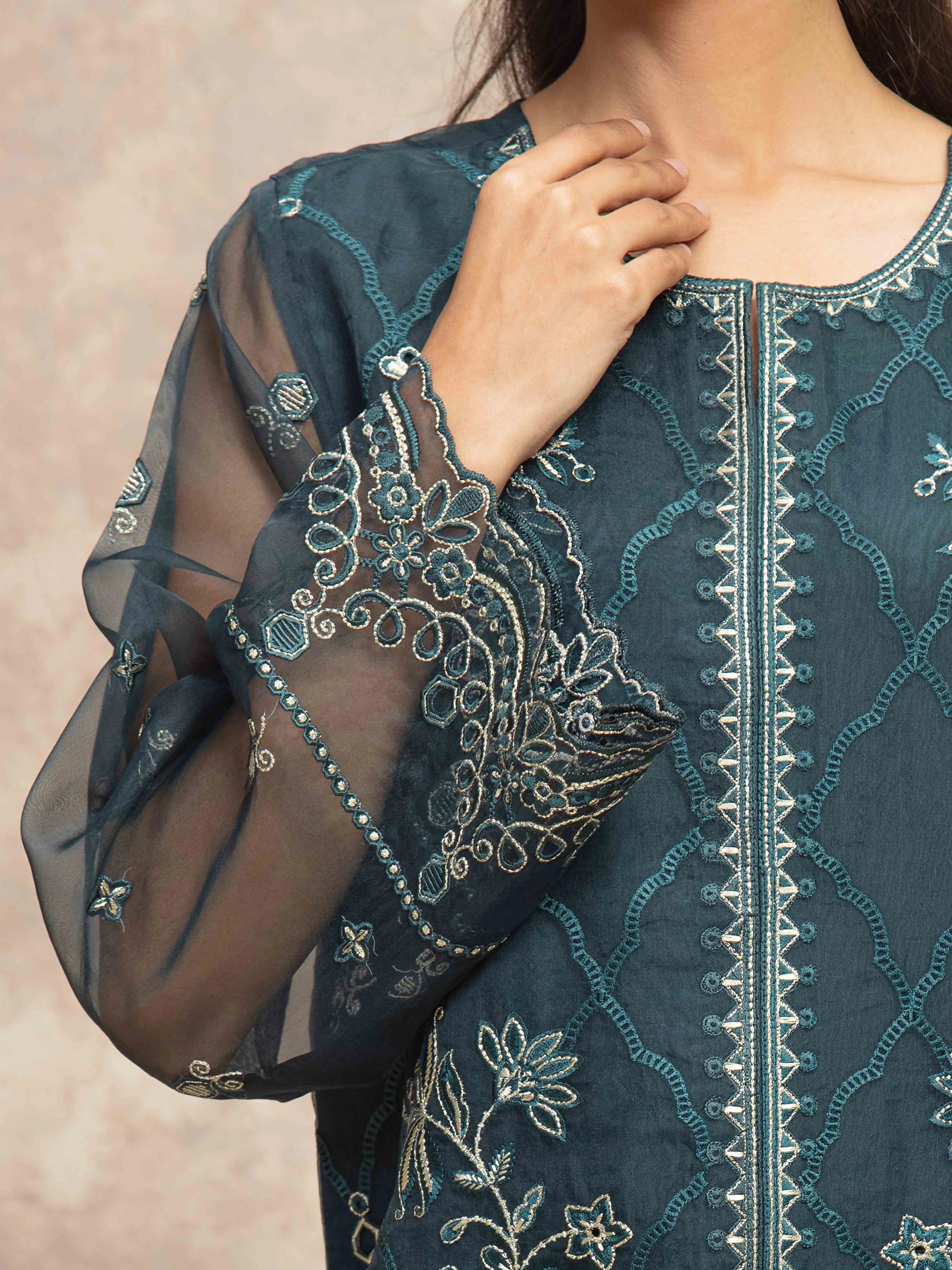 Unstitched Dark Teal Embroidered Organza 3 Piece