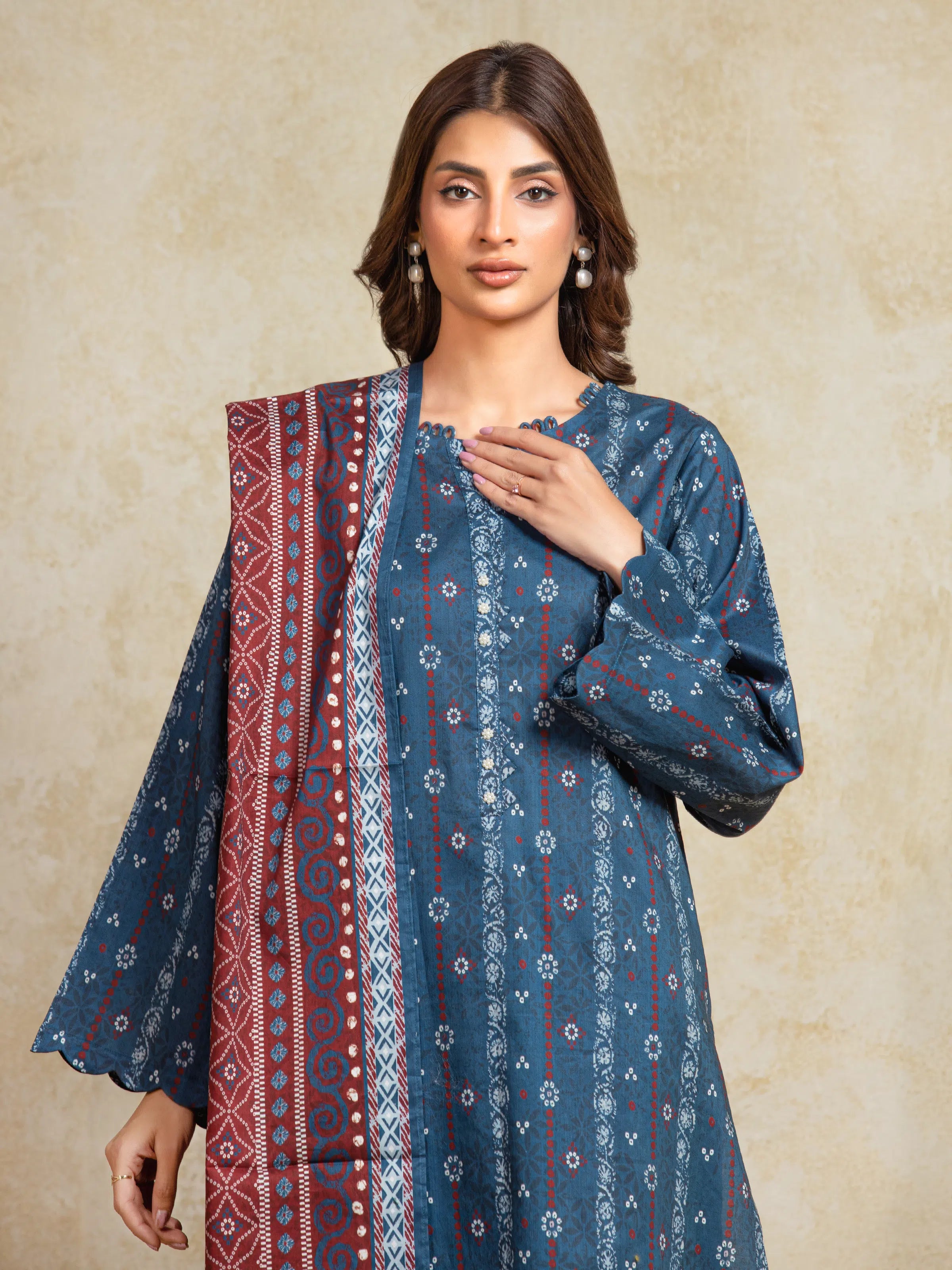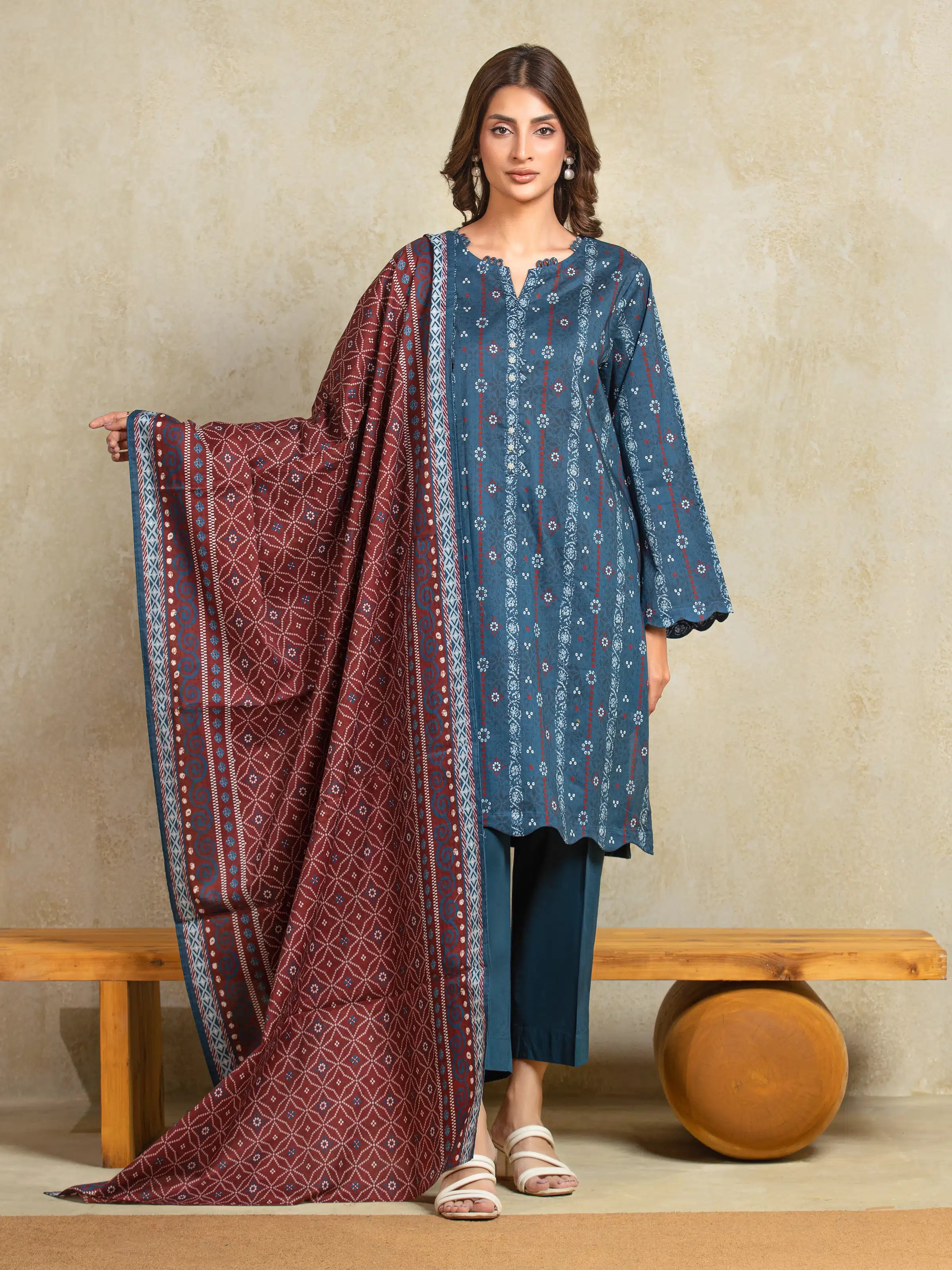 Unstitched Dark Teal Printed Khaddar 3 Piece