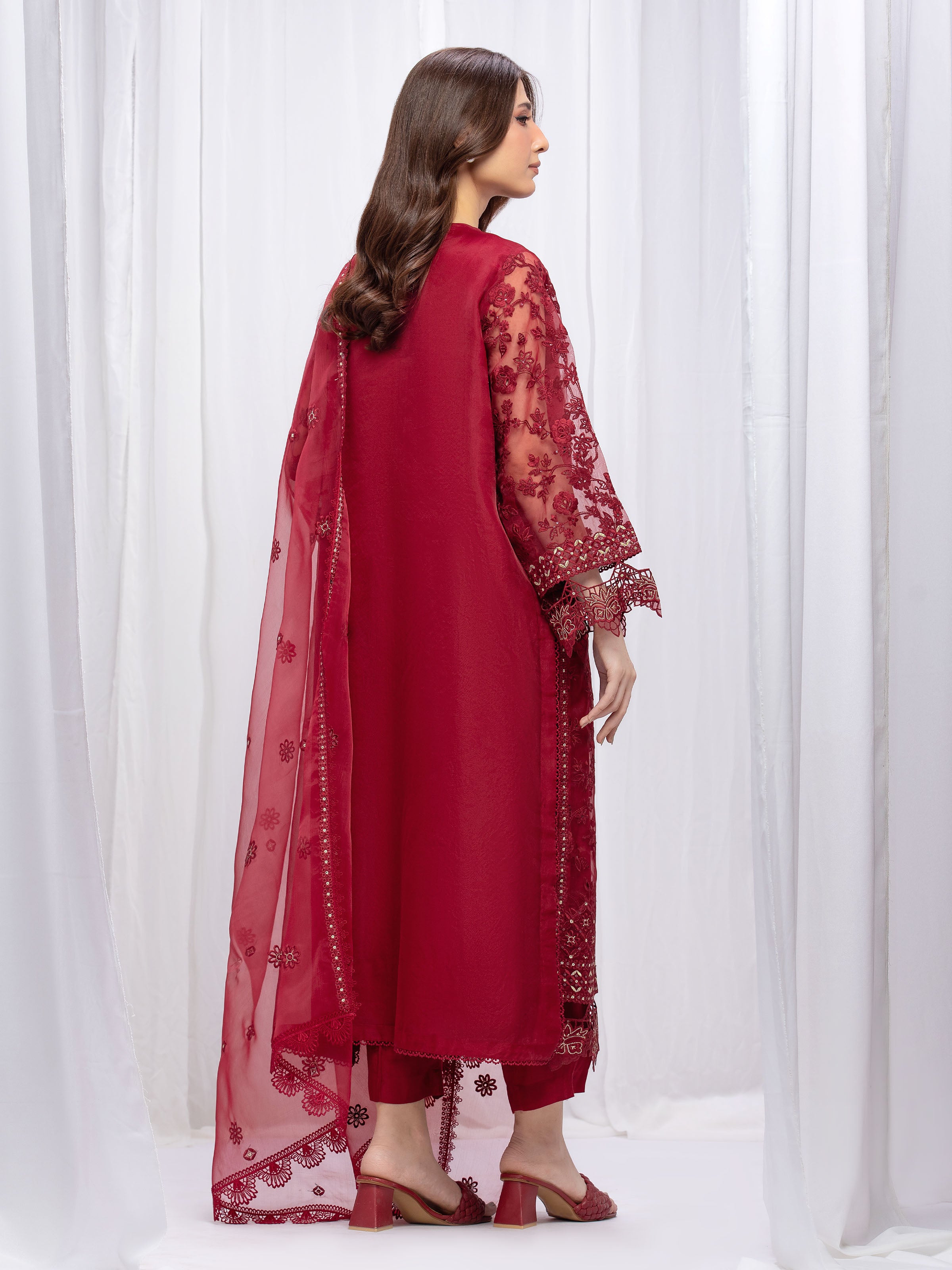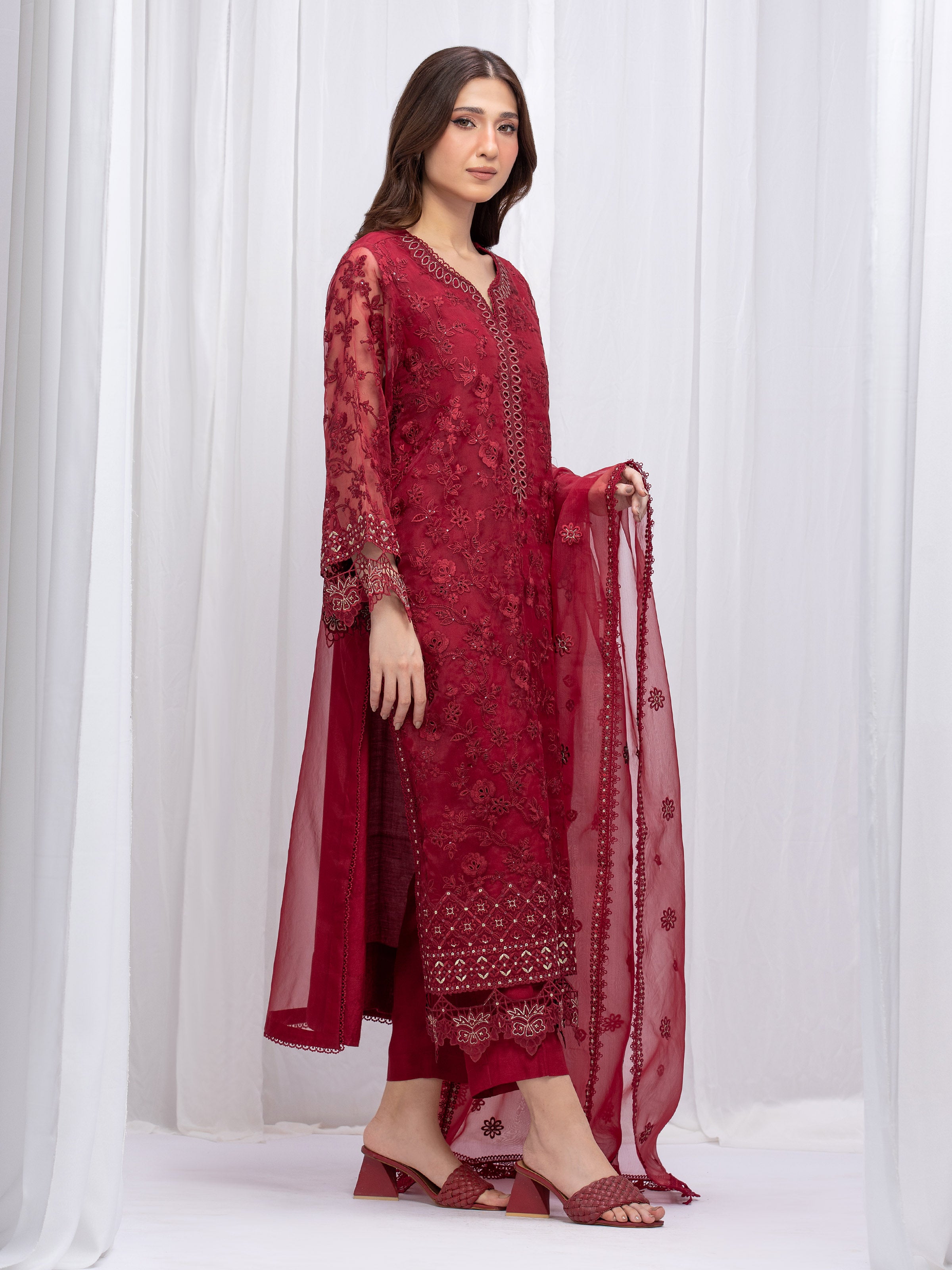 Unstitched Maroon Embroidered Organza 3 Piece