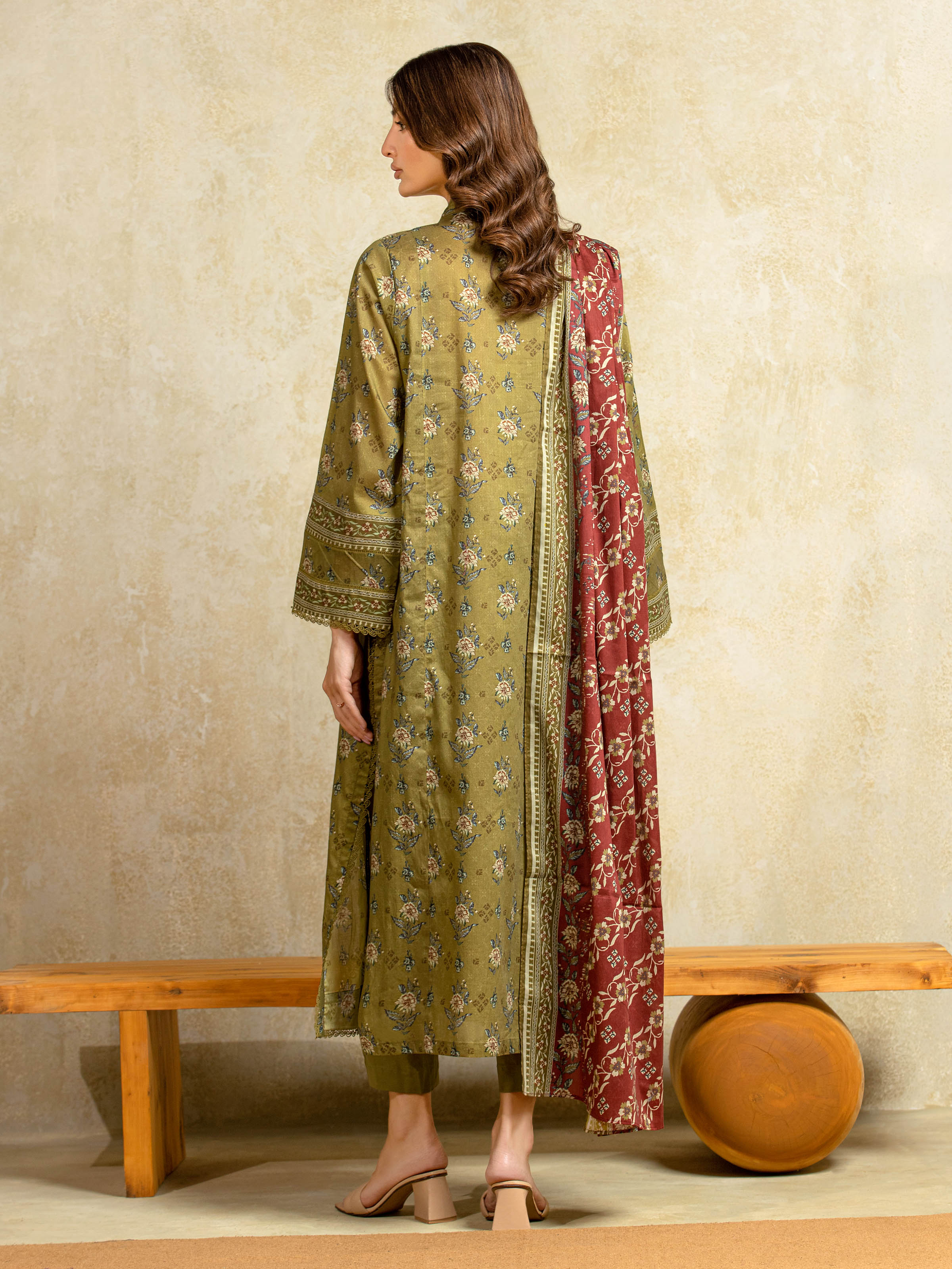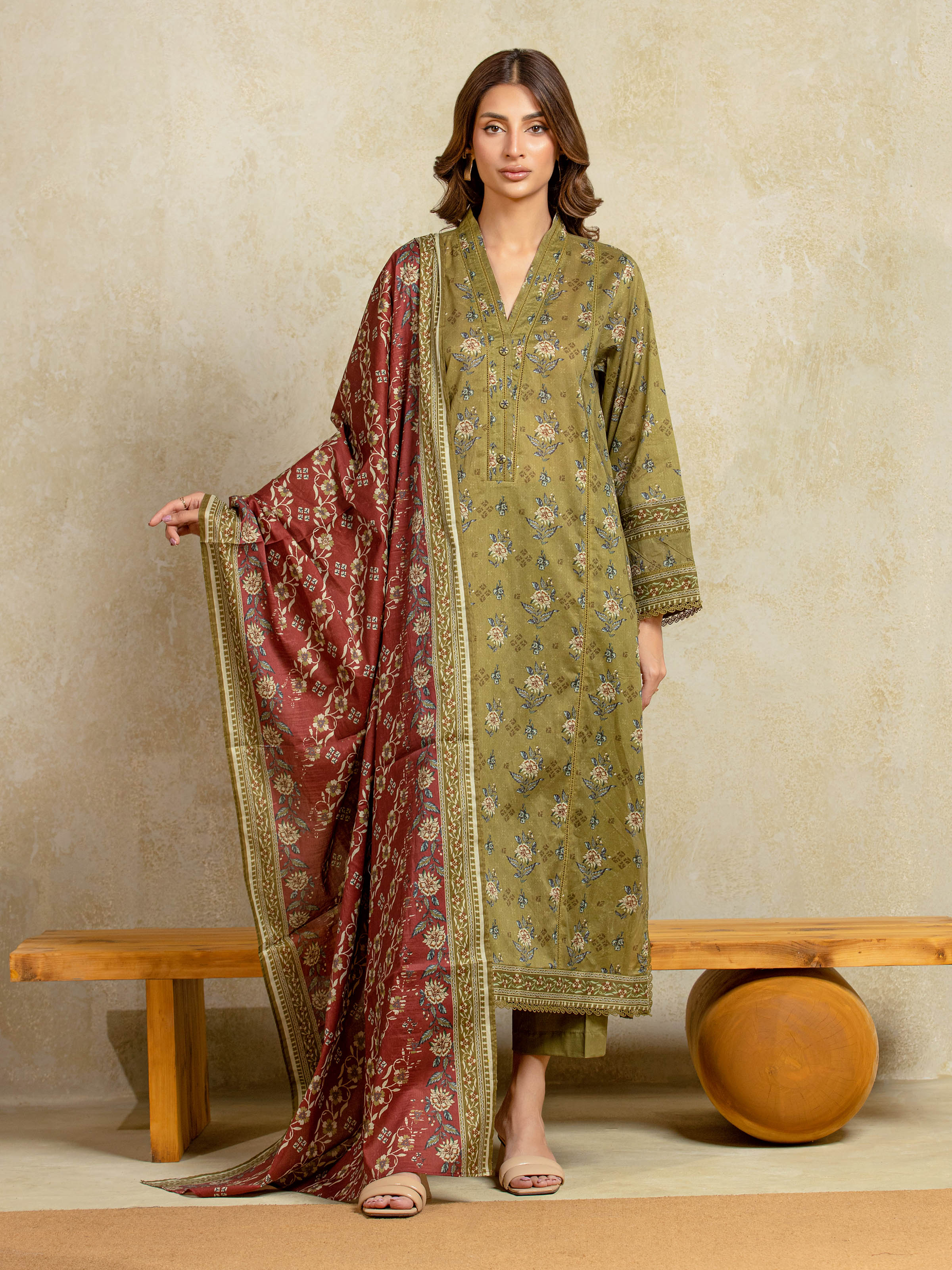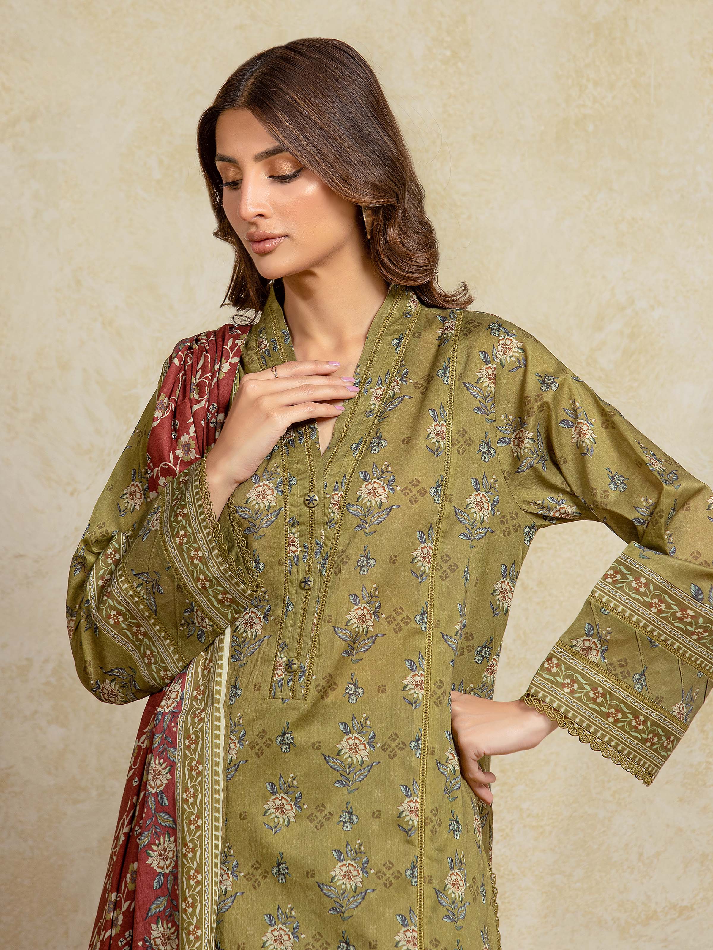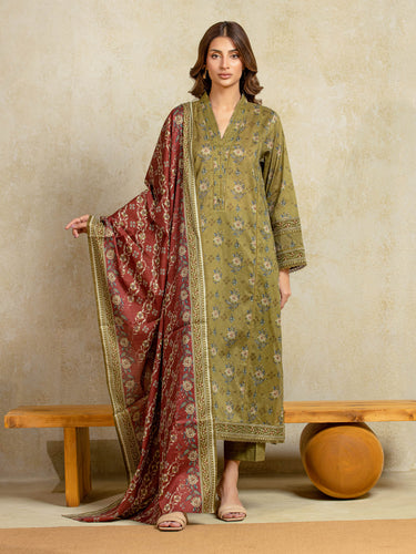 Unstitched Olive Printed Khaddar 3 Piece