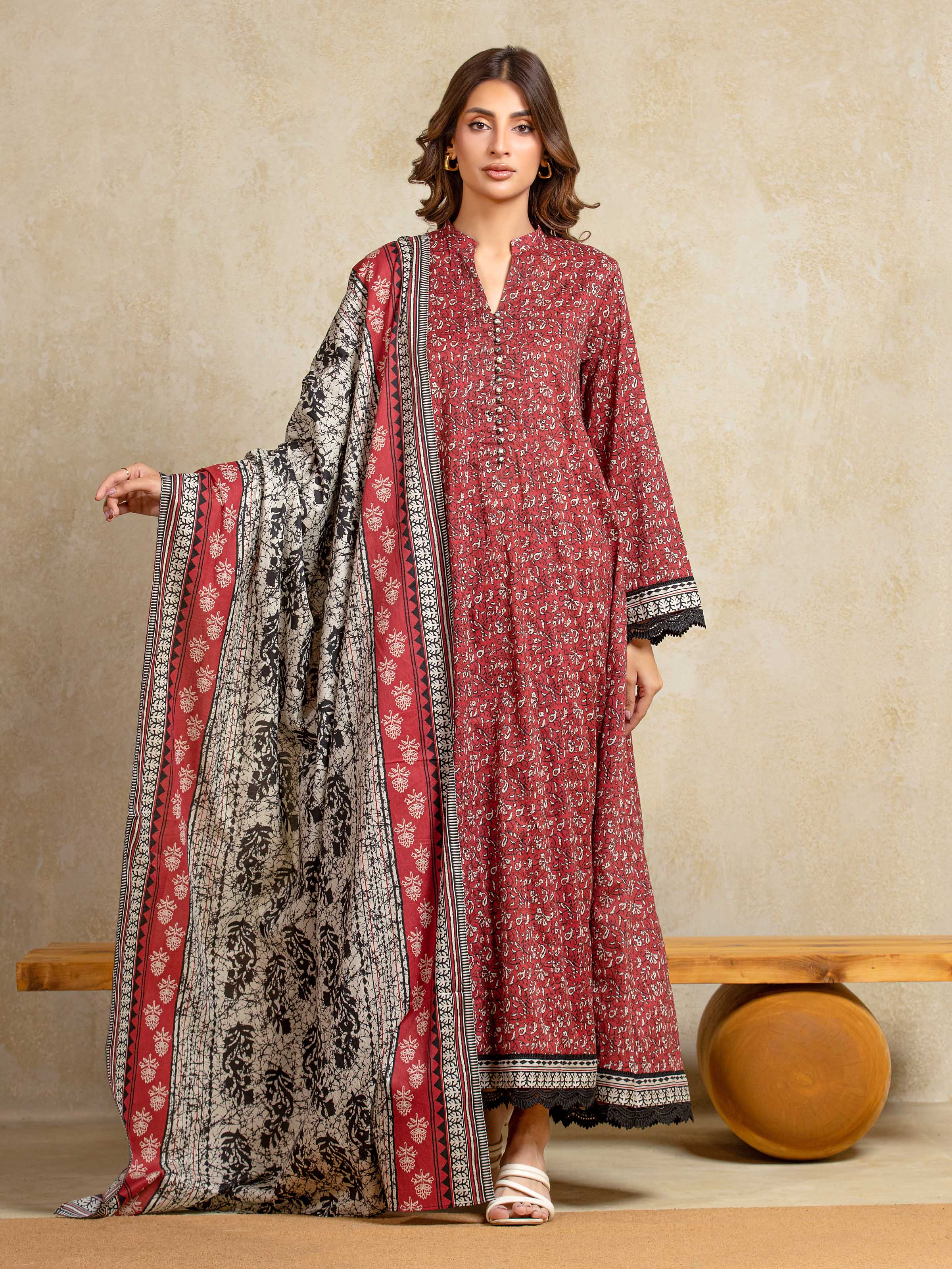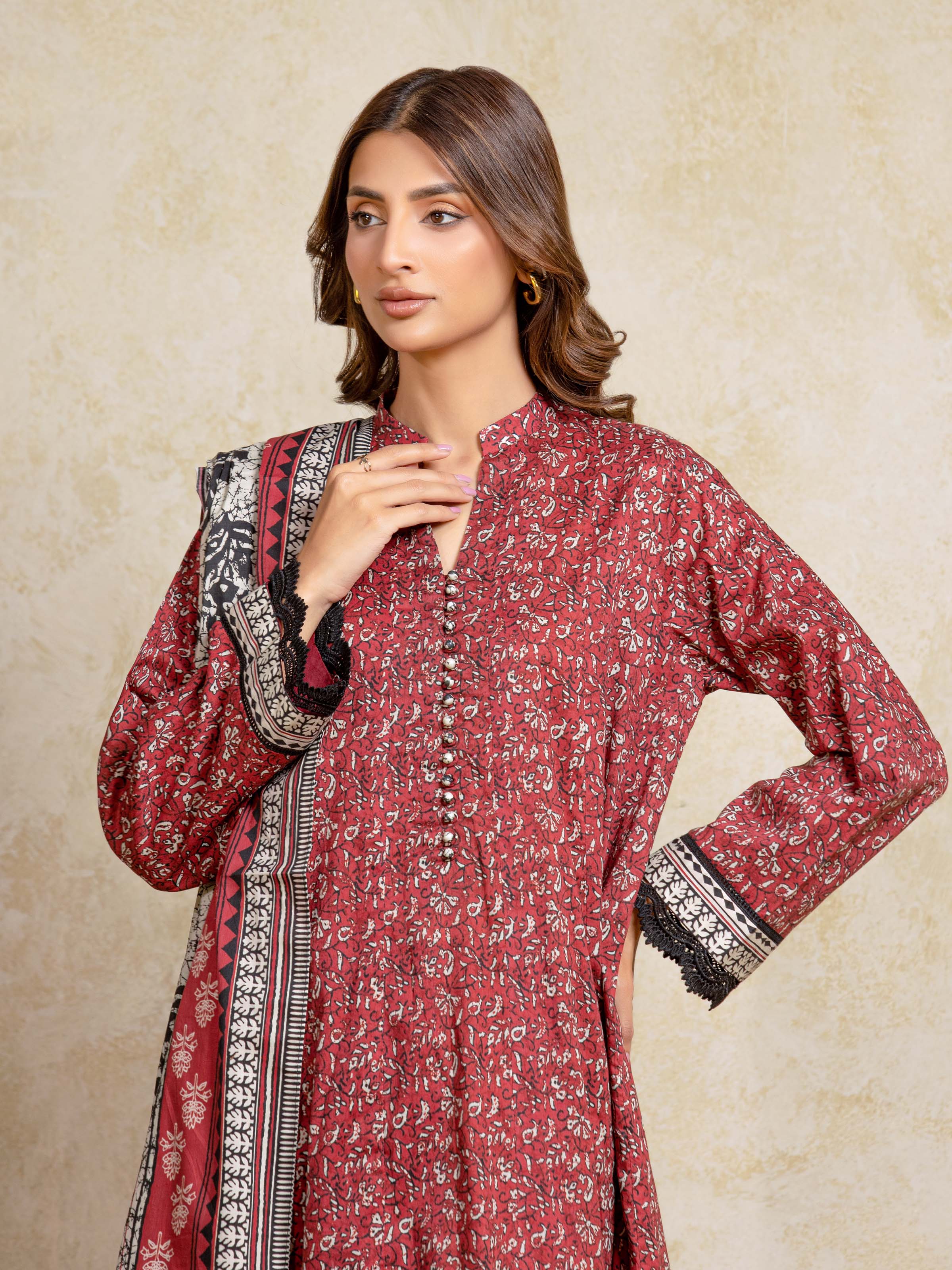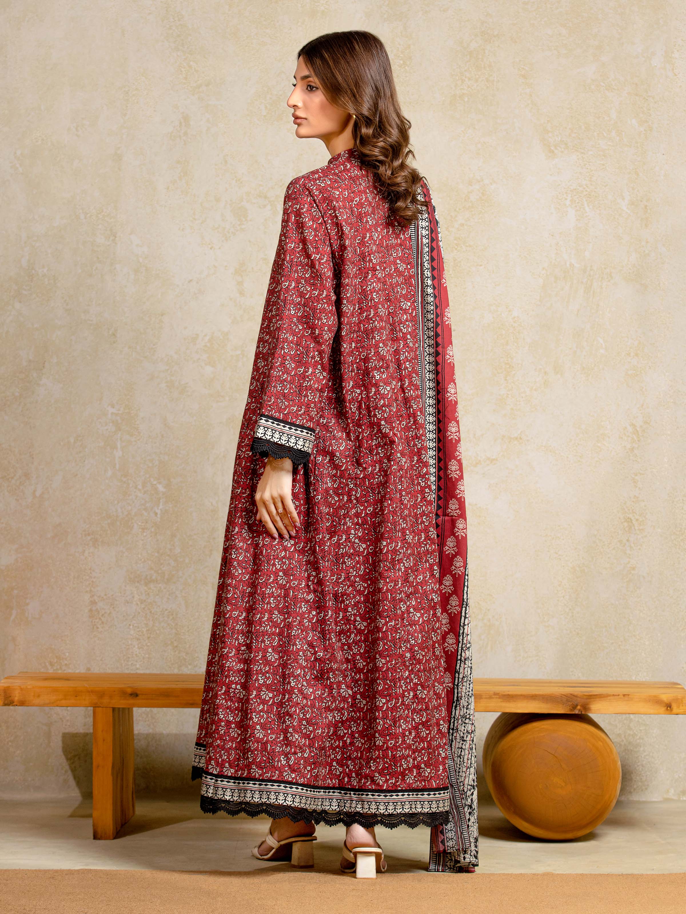 Unstitched Red Printed Khaddar 3 Piece
